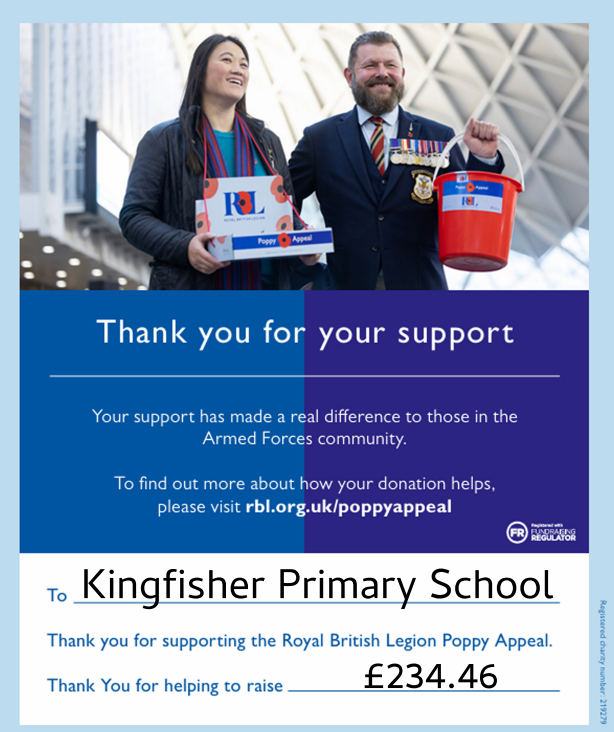 Once again this year we sold poppies and other items to raise money for the Royal British Legion. The total amount raised was £234.46.