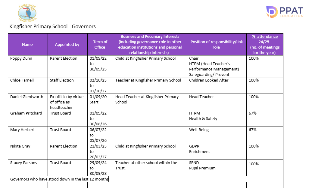 Please find below details of how our Governing body is structured, including the names, categories, responsibilities and terms of appointment for each Governor.