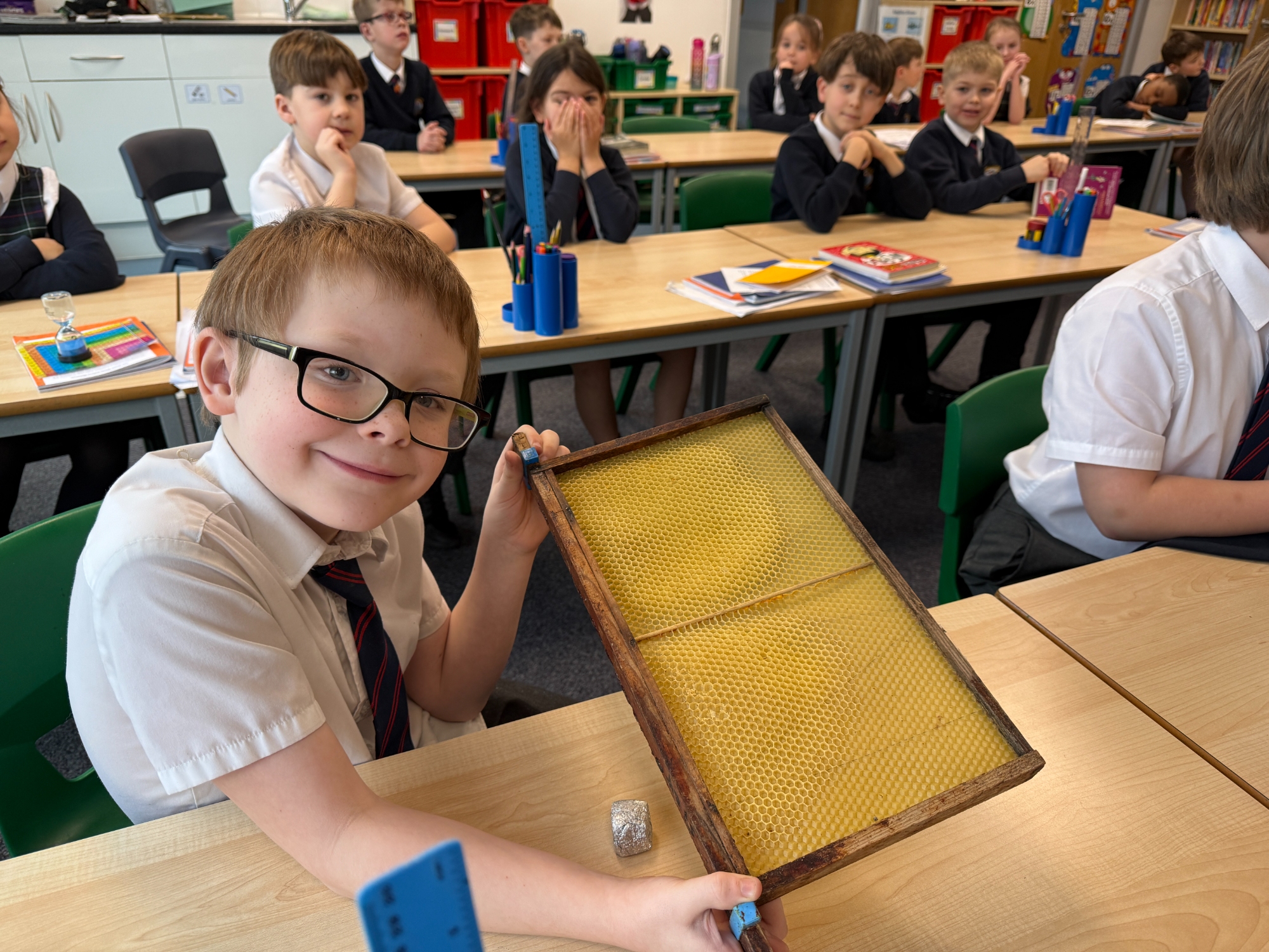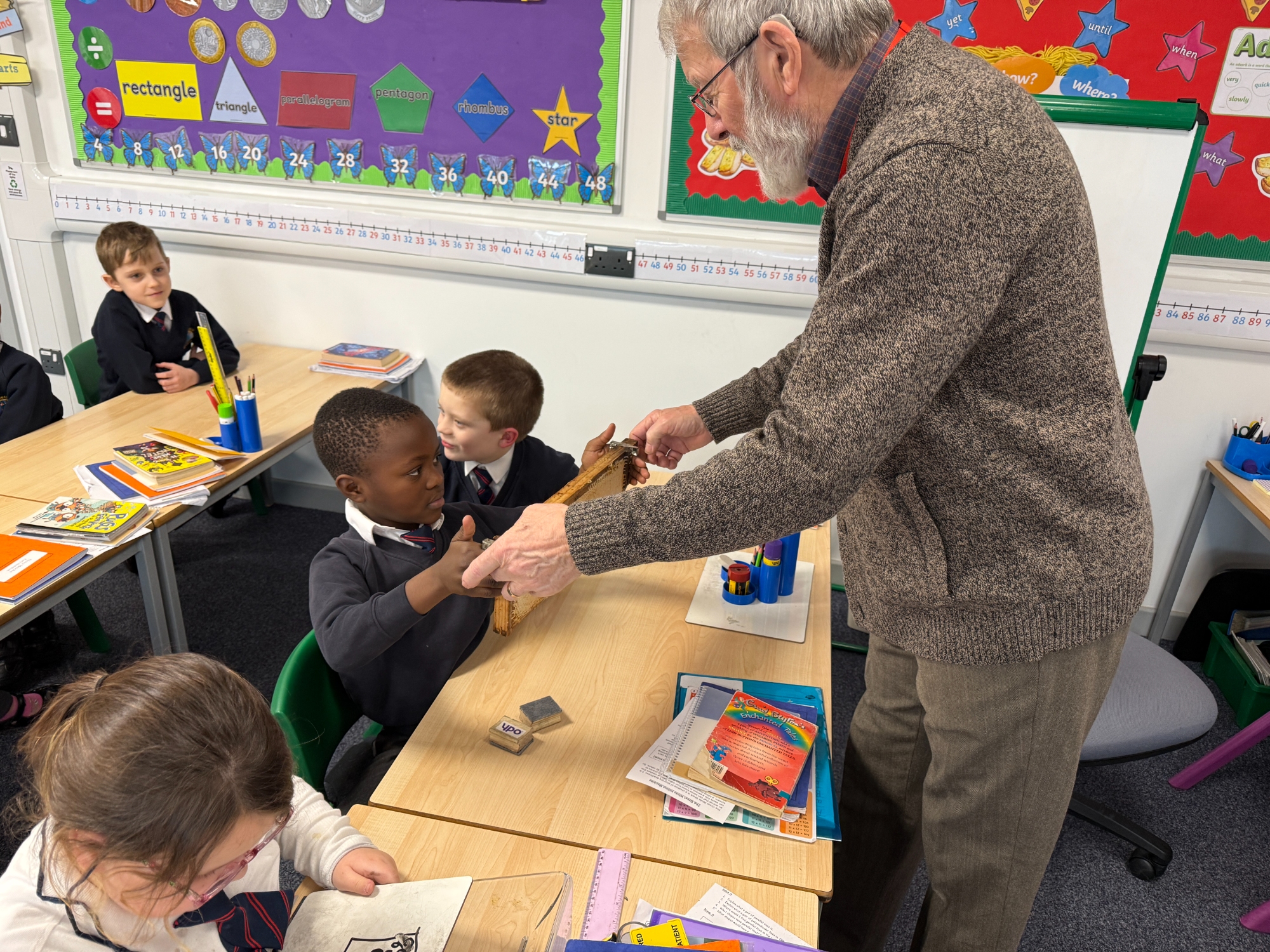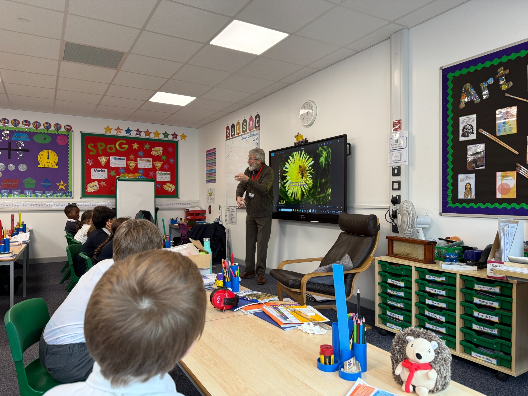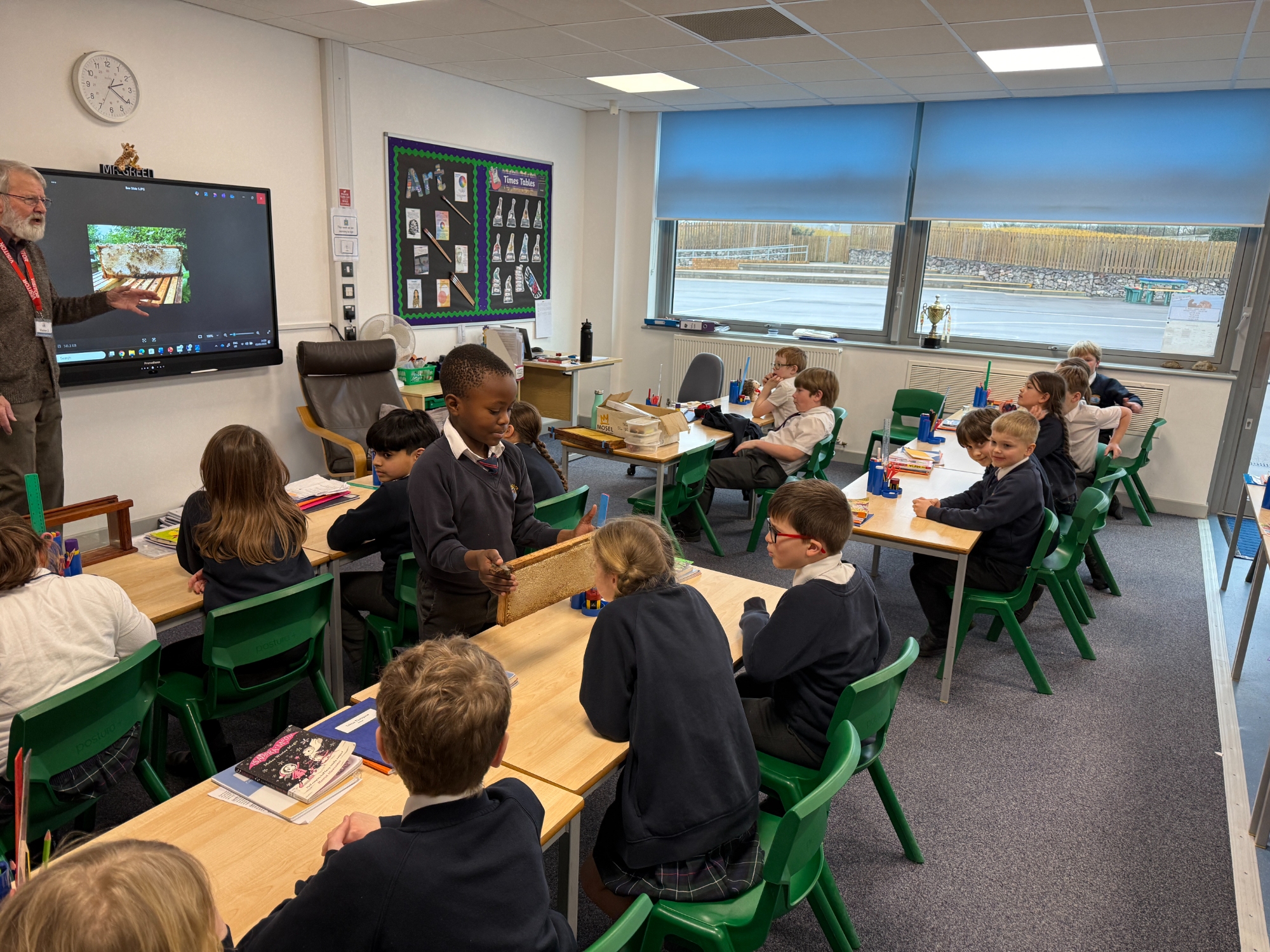 We were delighted to welcome Marvin into school today for a fascinating visit all about his bees. The children were full of excitement as they listened carefully and asked thoughtful questions about how bees live and work together in a hive. Marvin explained the dynamics of the hive, including the roles of the queen, workers and drones, helping pupils understand how living things depend on one another.