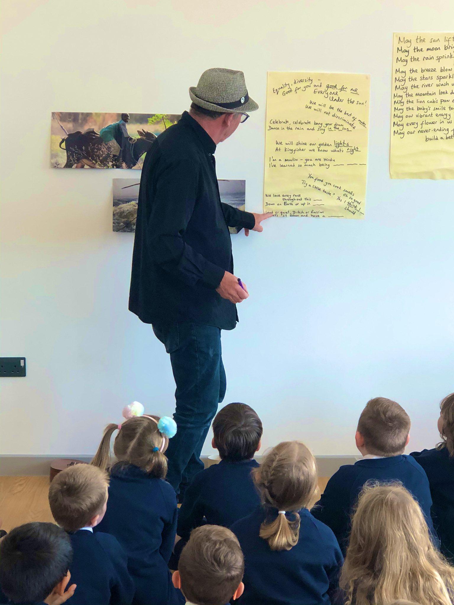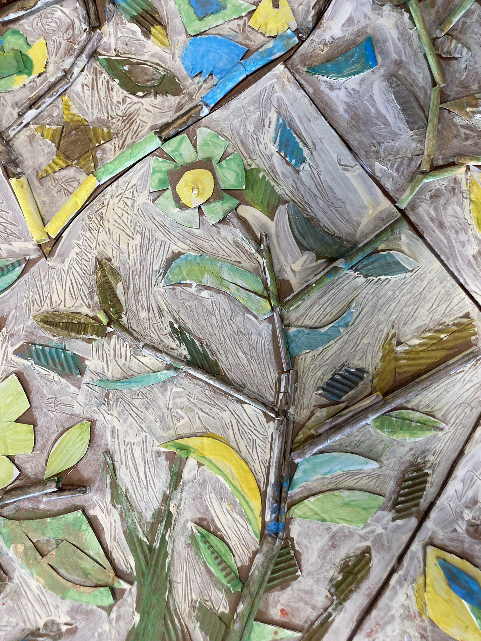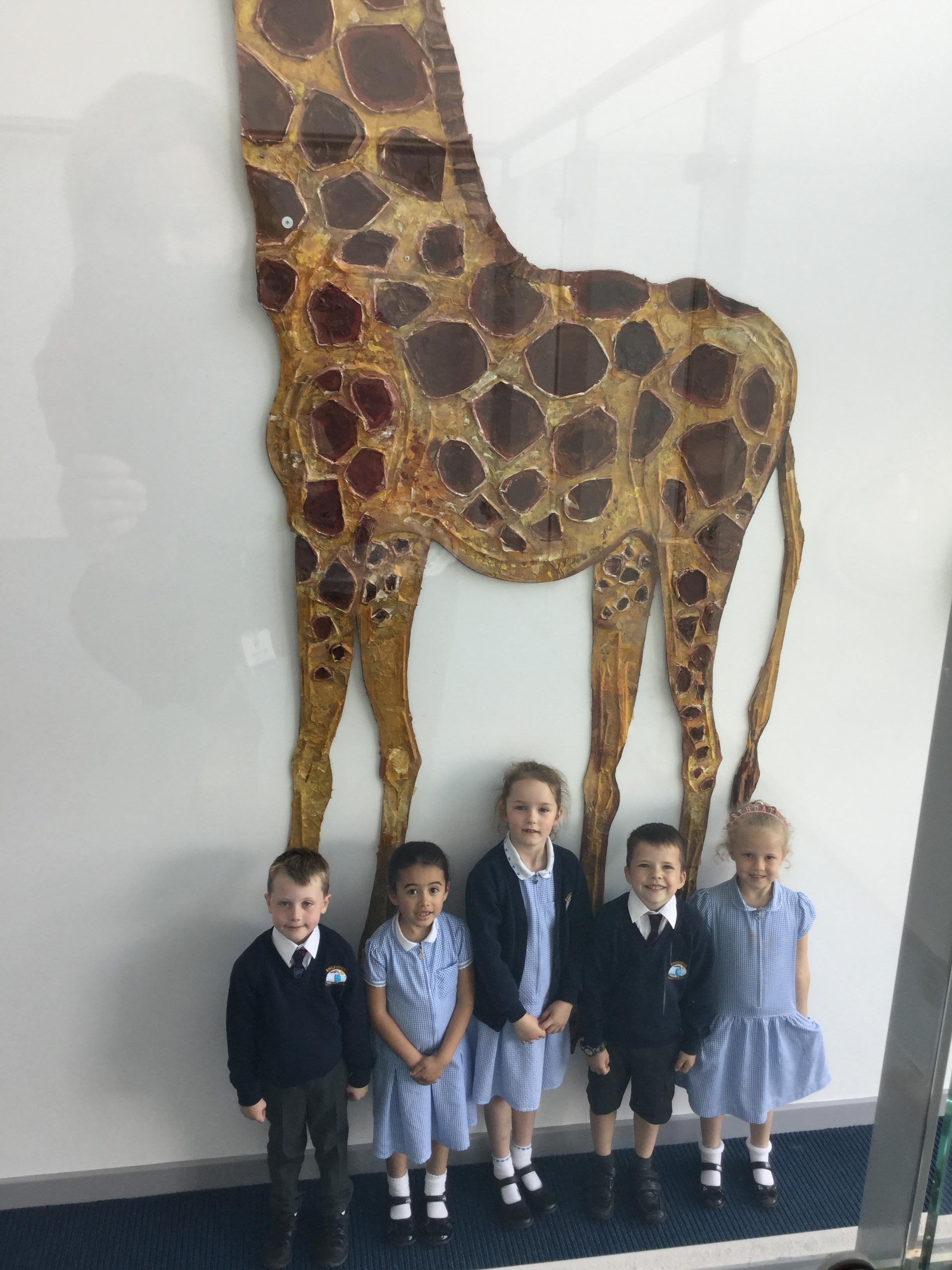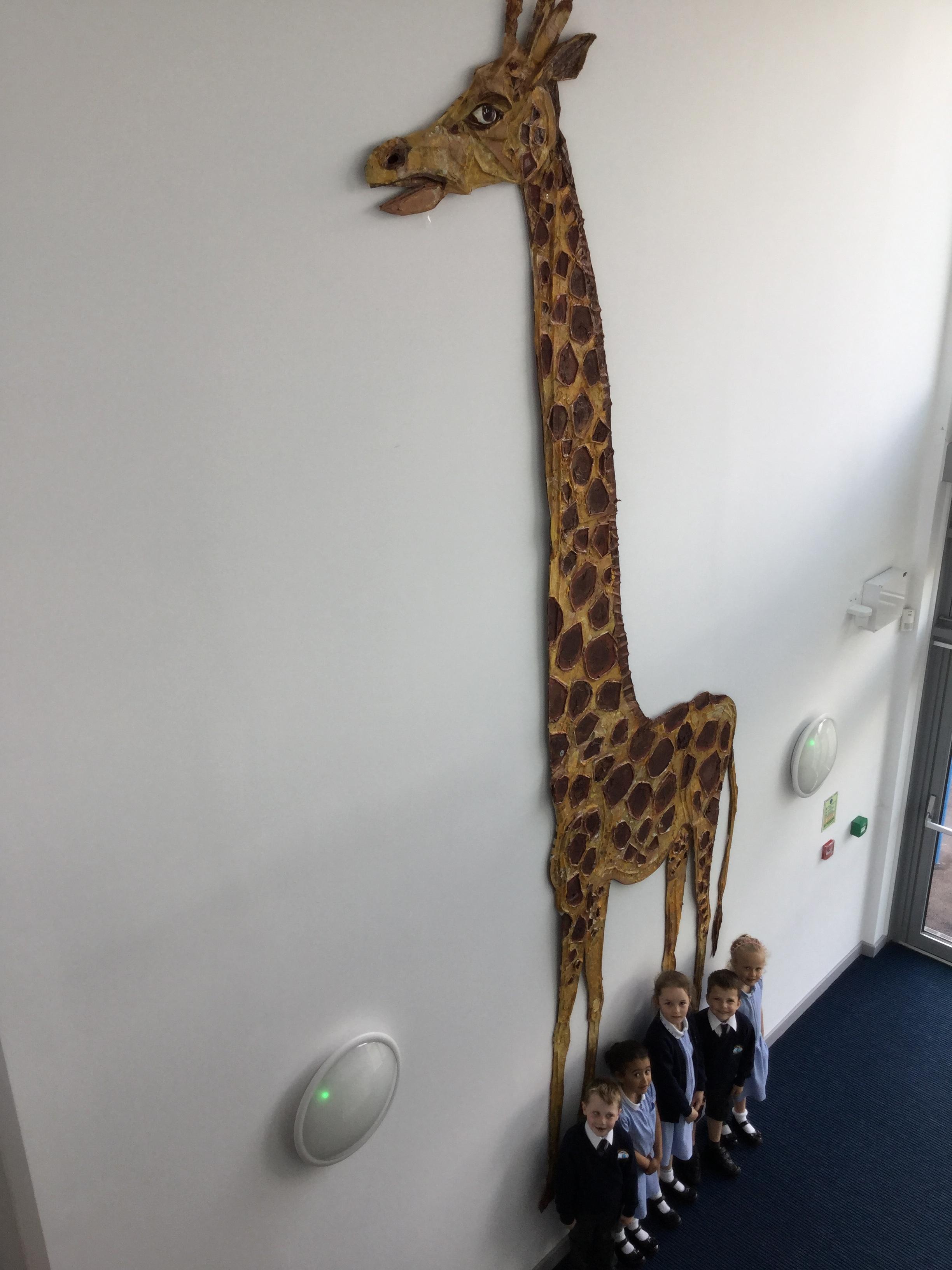 We are thrilled to see Harold the Giraffe up in the stairwell. It is amazing to see how big giraffes are compared to ourselves! We can also feel proud that we all helped to make this amazing piece of artwork with Daryl.