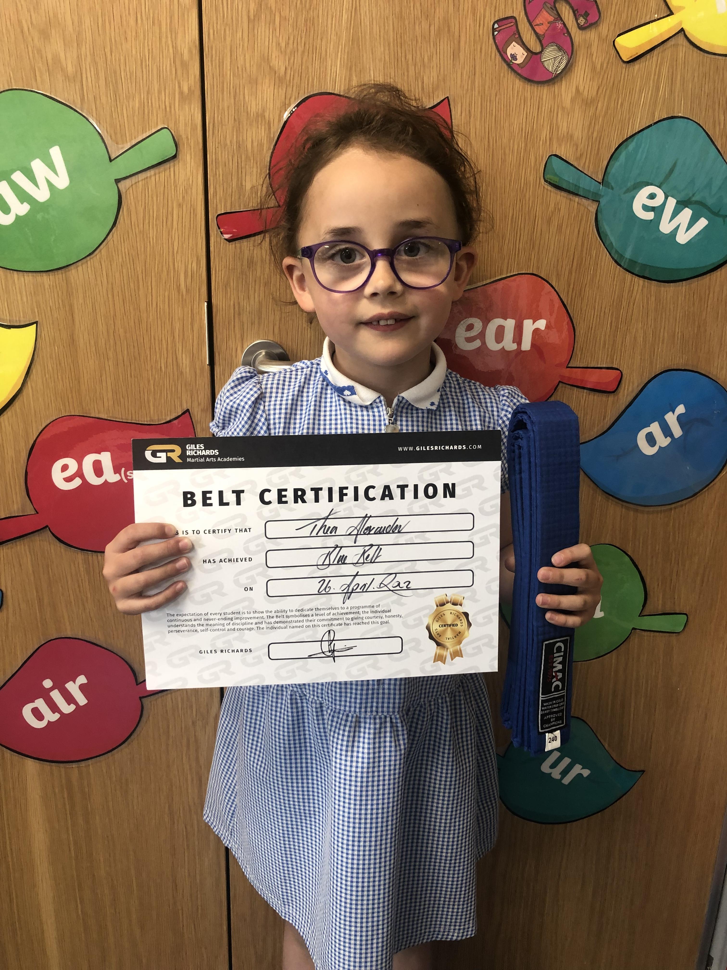 Congratulations to our lovely Year 1 pupil who has successfully obtained her blue belt in Martial Arts. What a great achievement- well done!