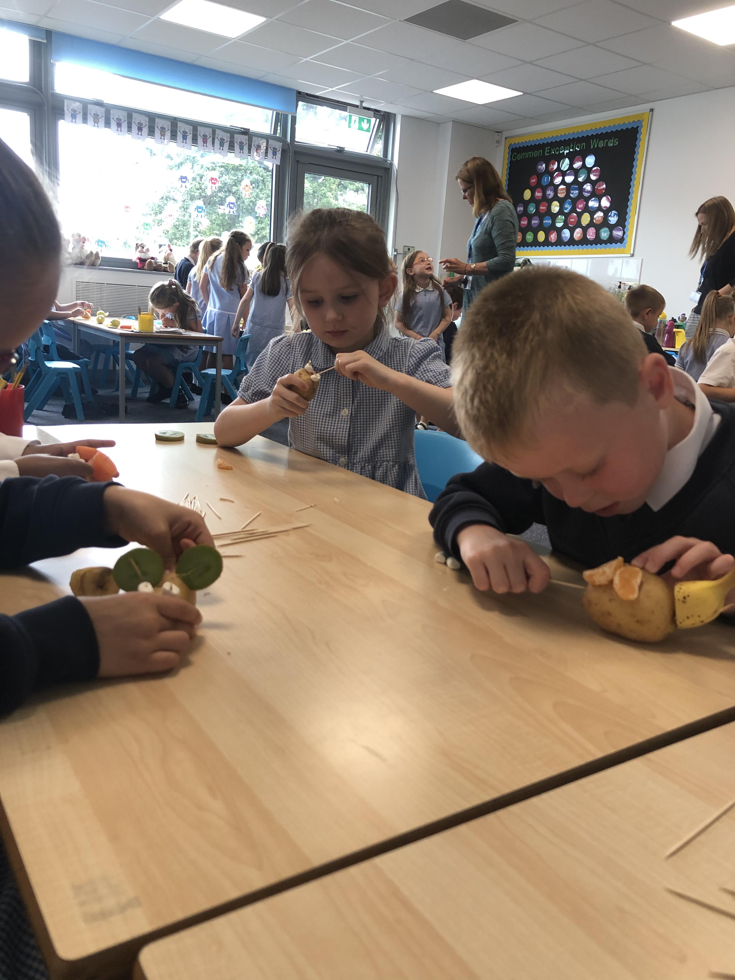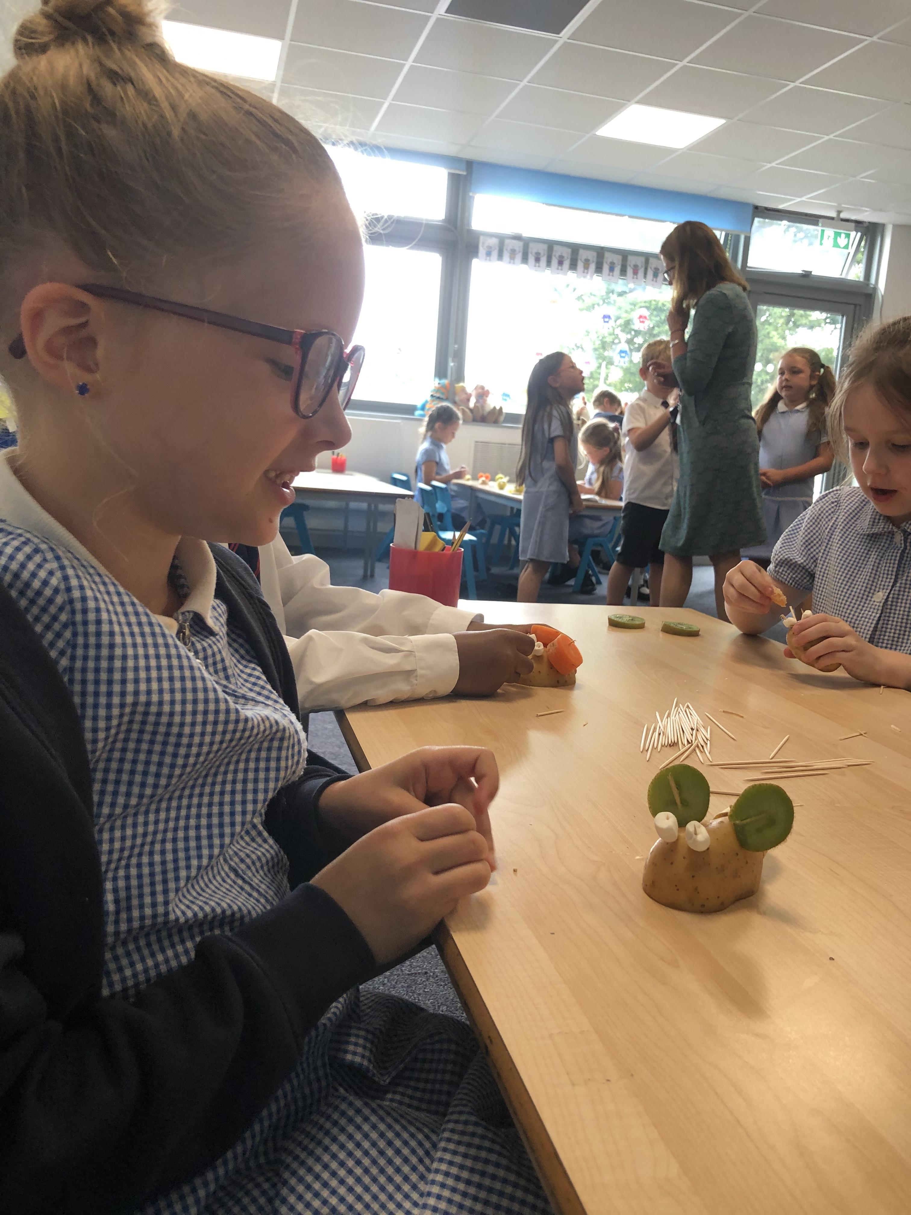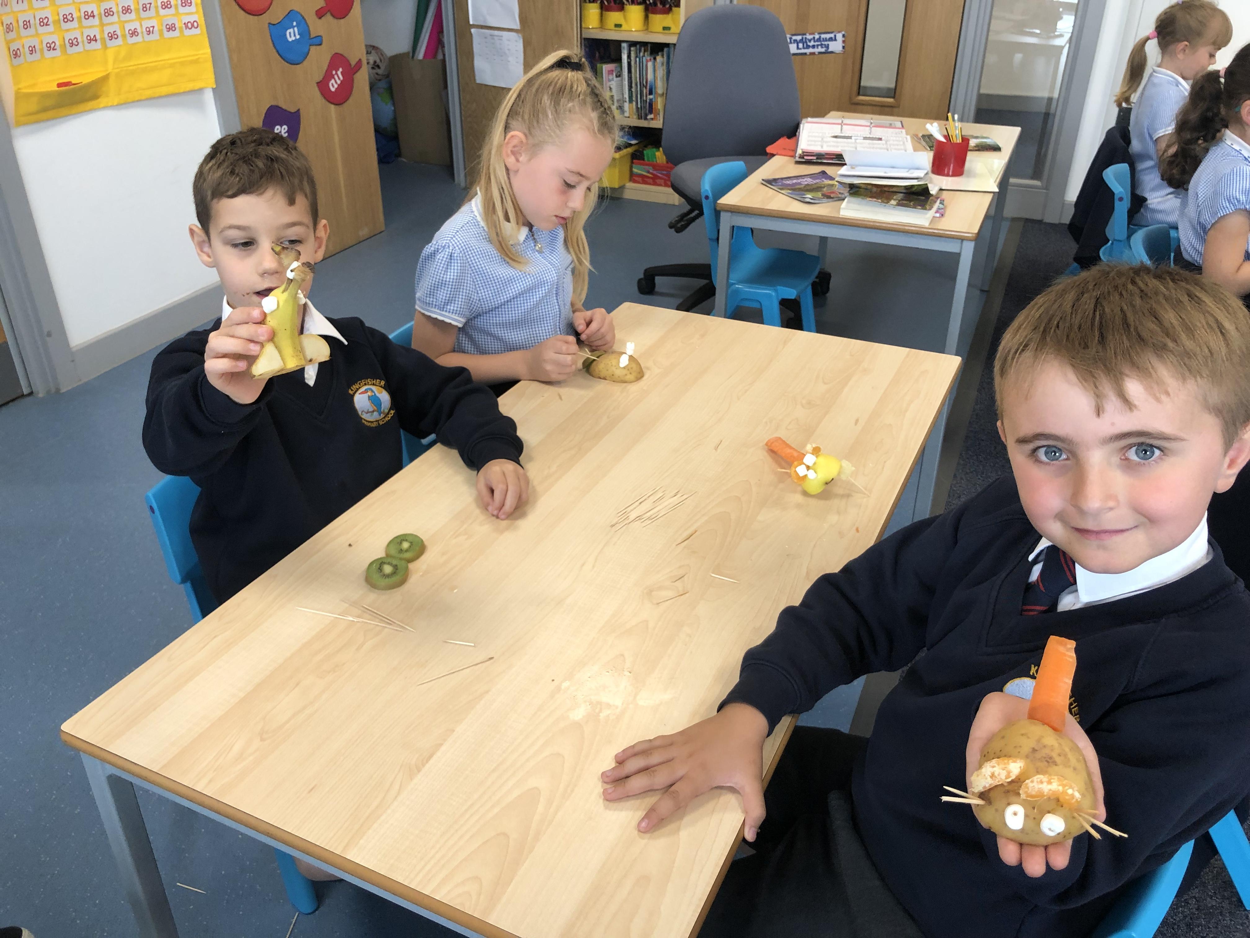 In DT this afternoon, the children throughly enjoyed making their own animal sculptures using fruit and vegetables.