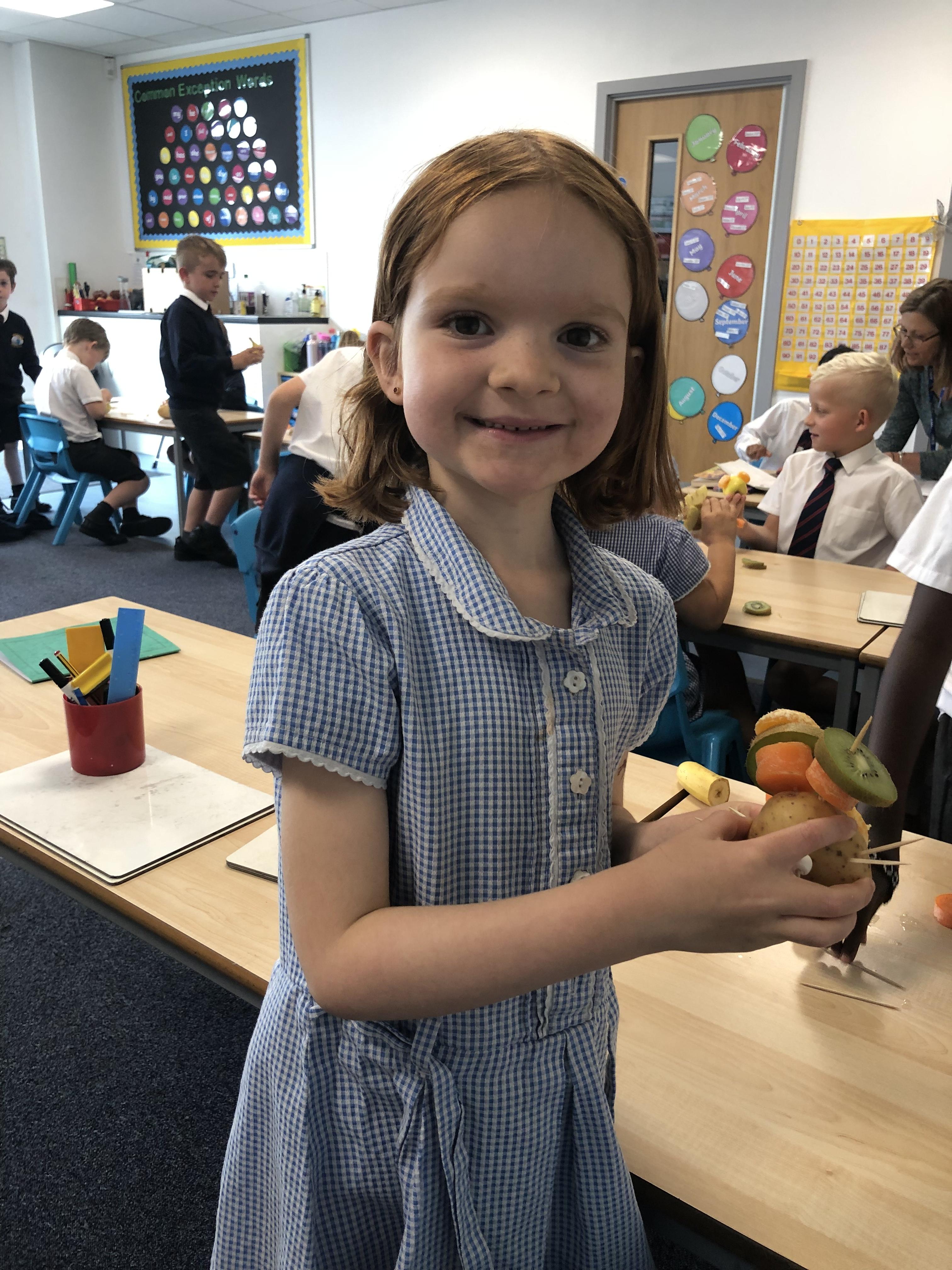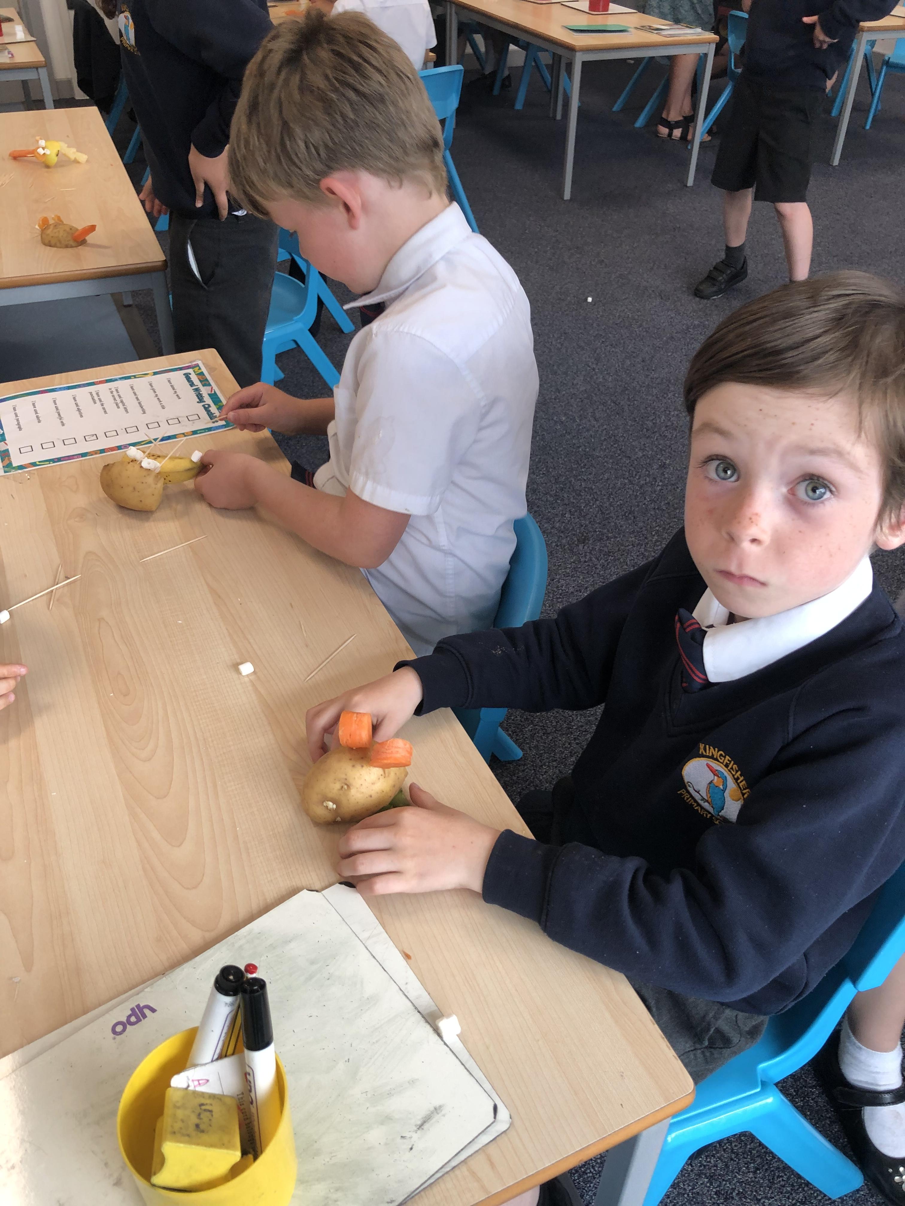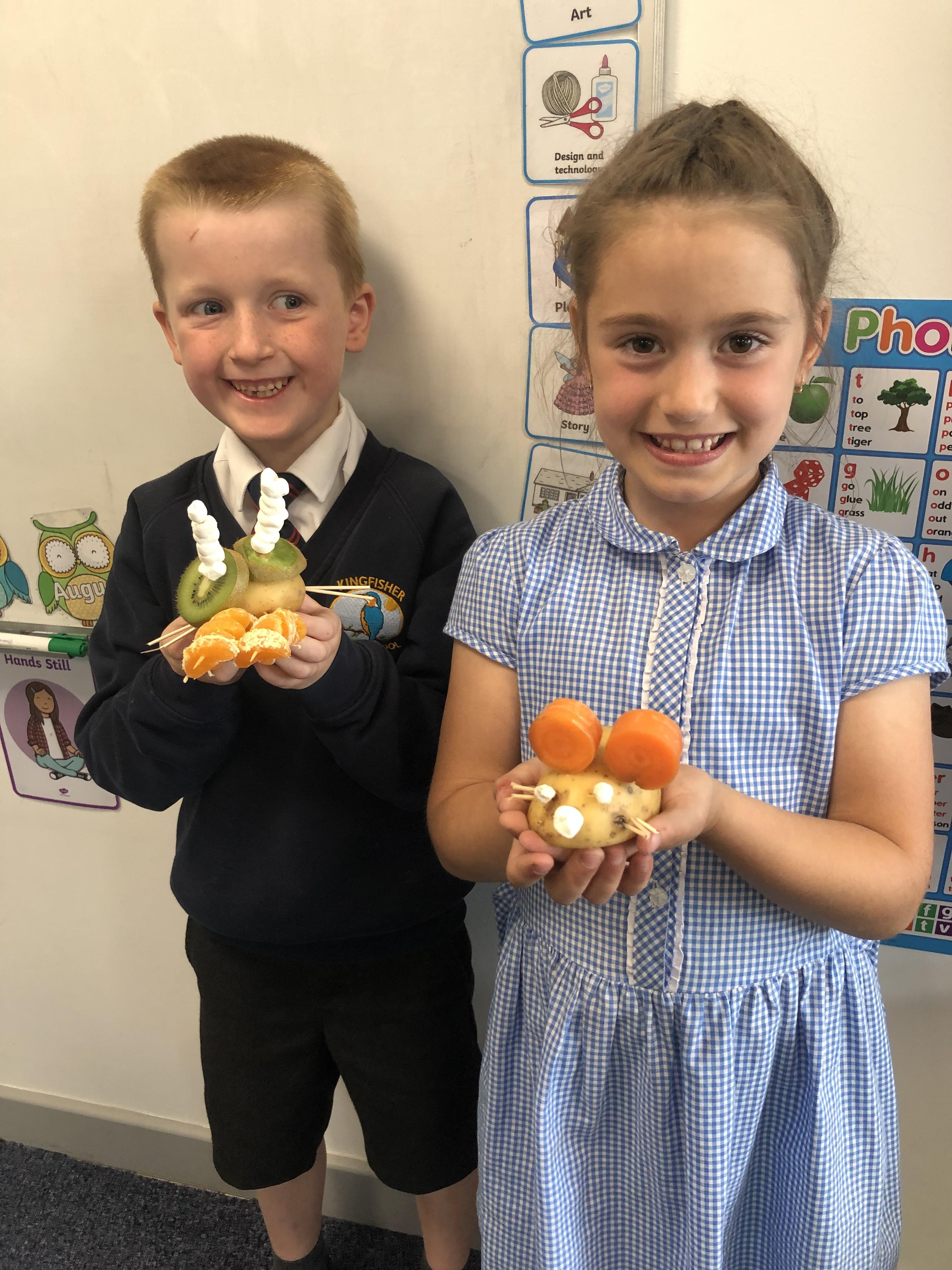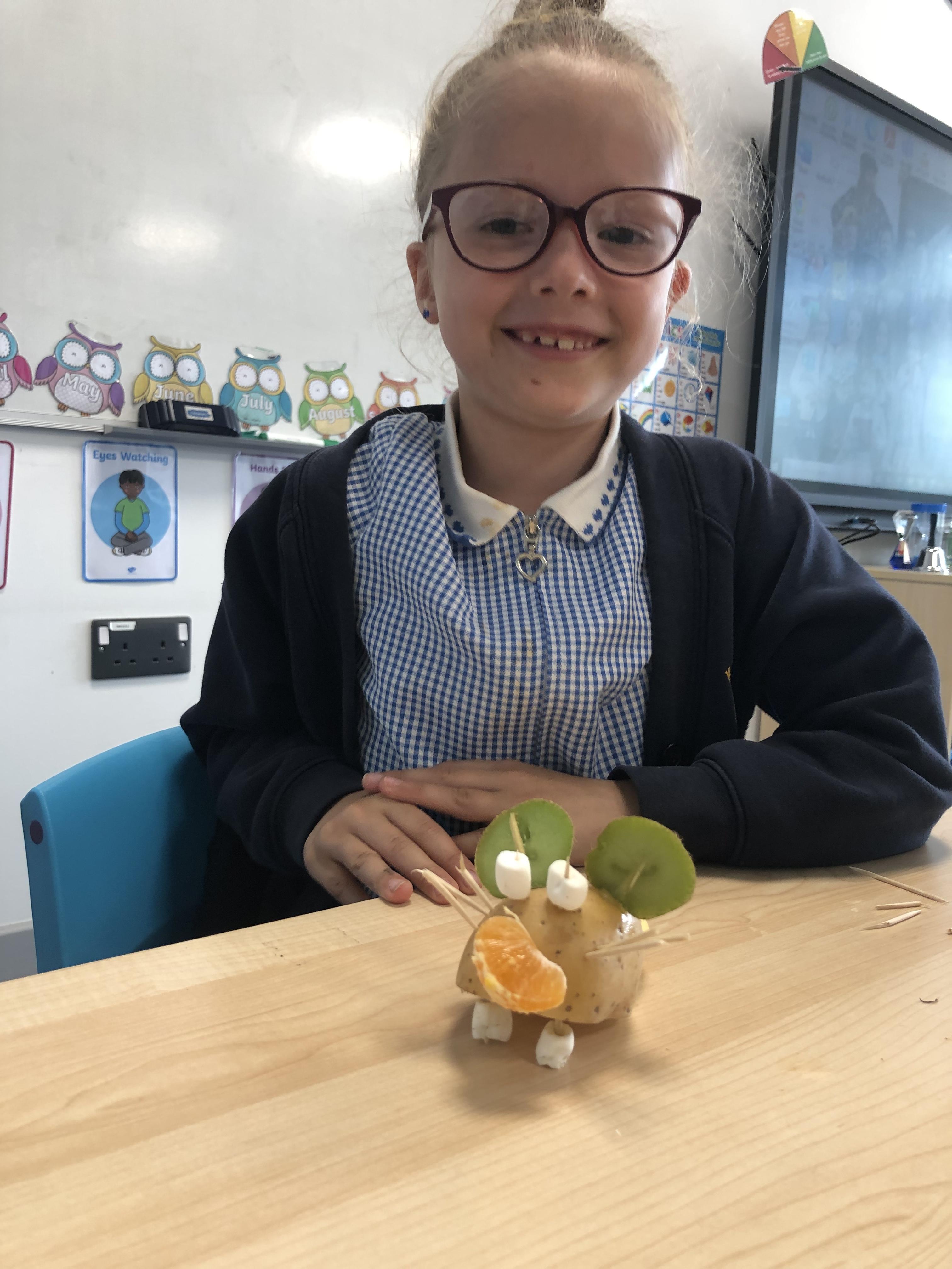 In DT this afternoon, the children throughly enjoyed making their own animal sculptures using fruit and vegetables.
