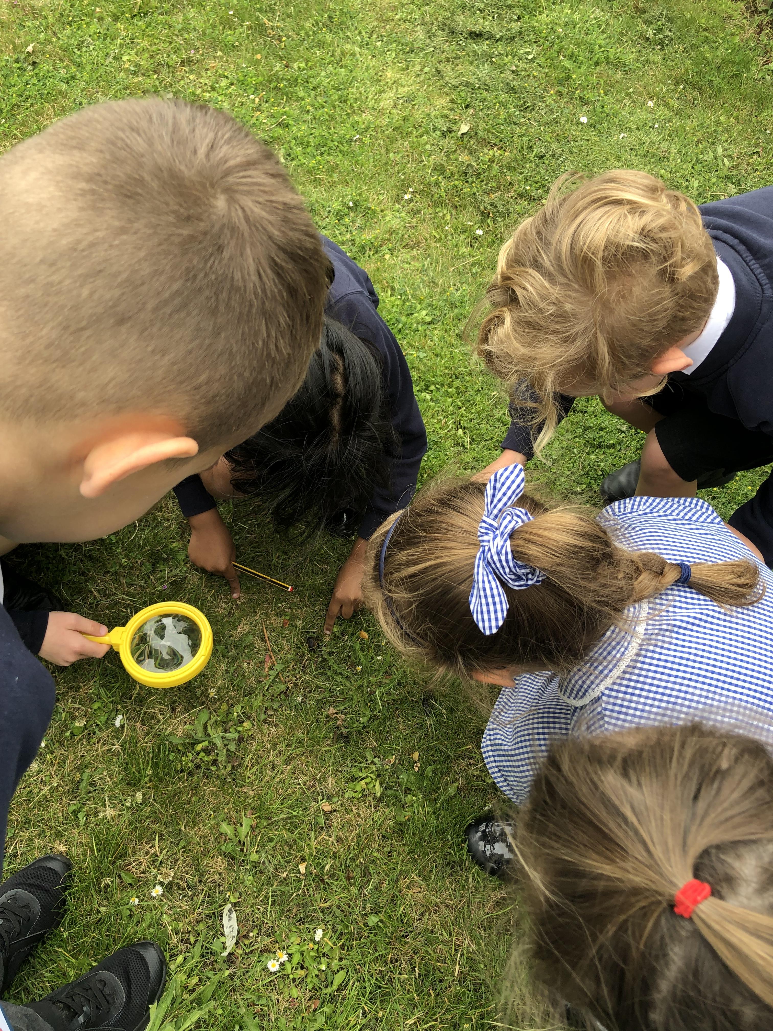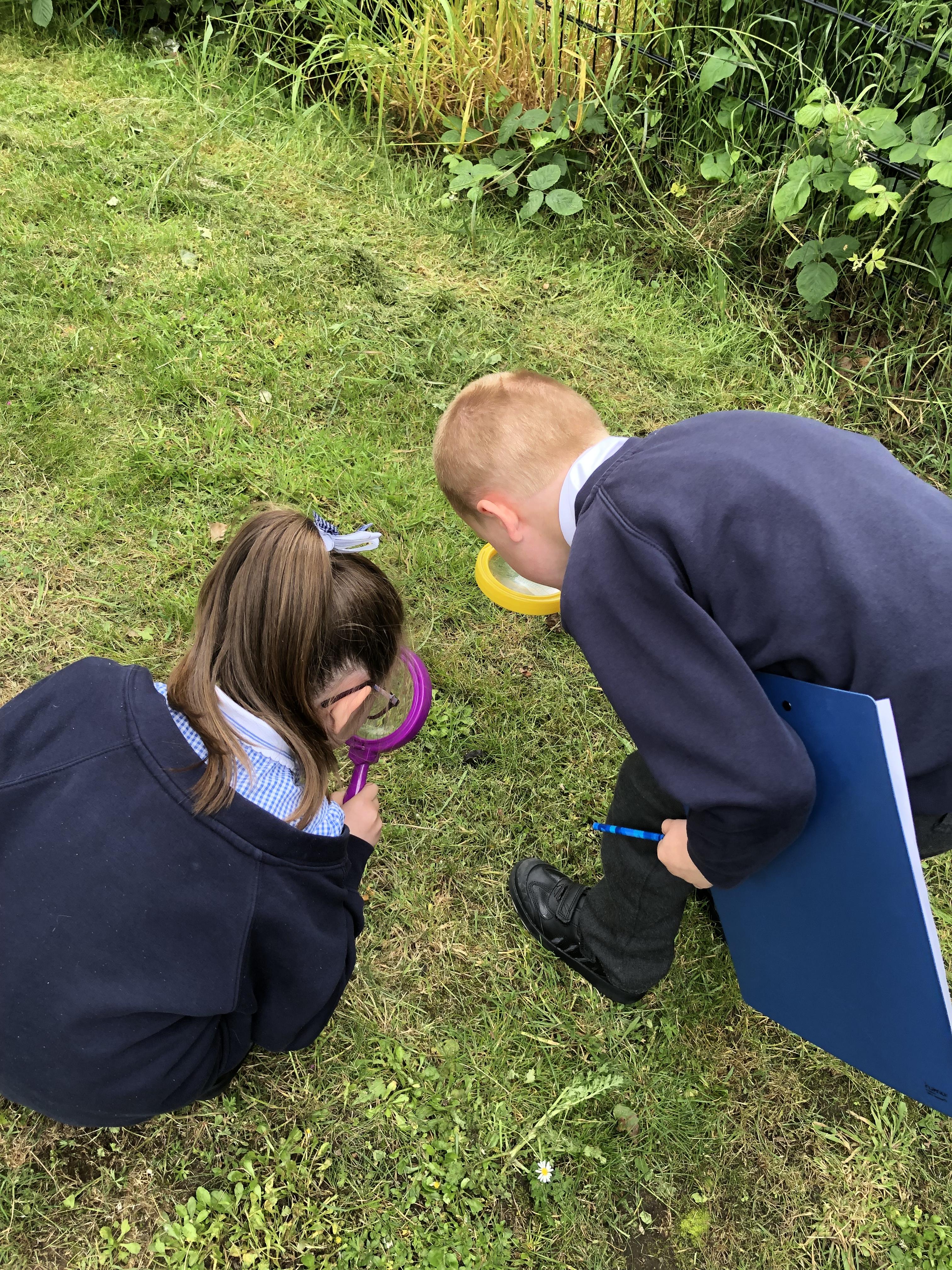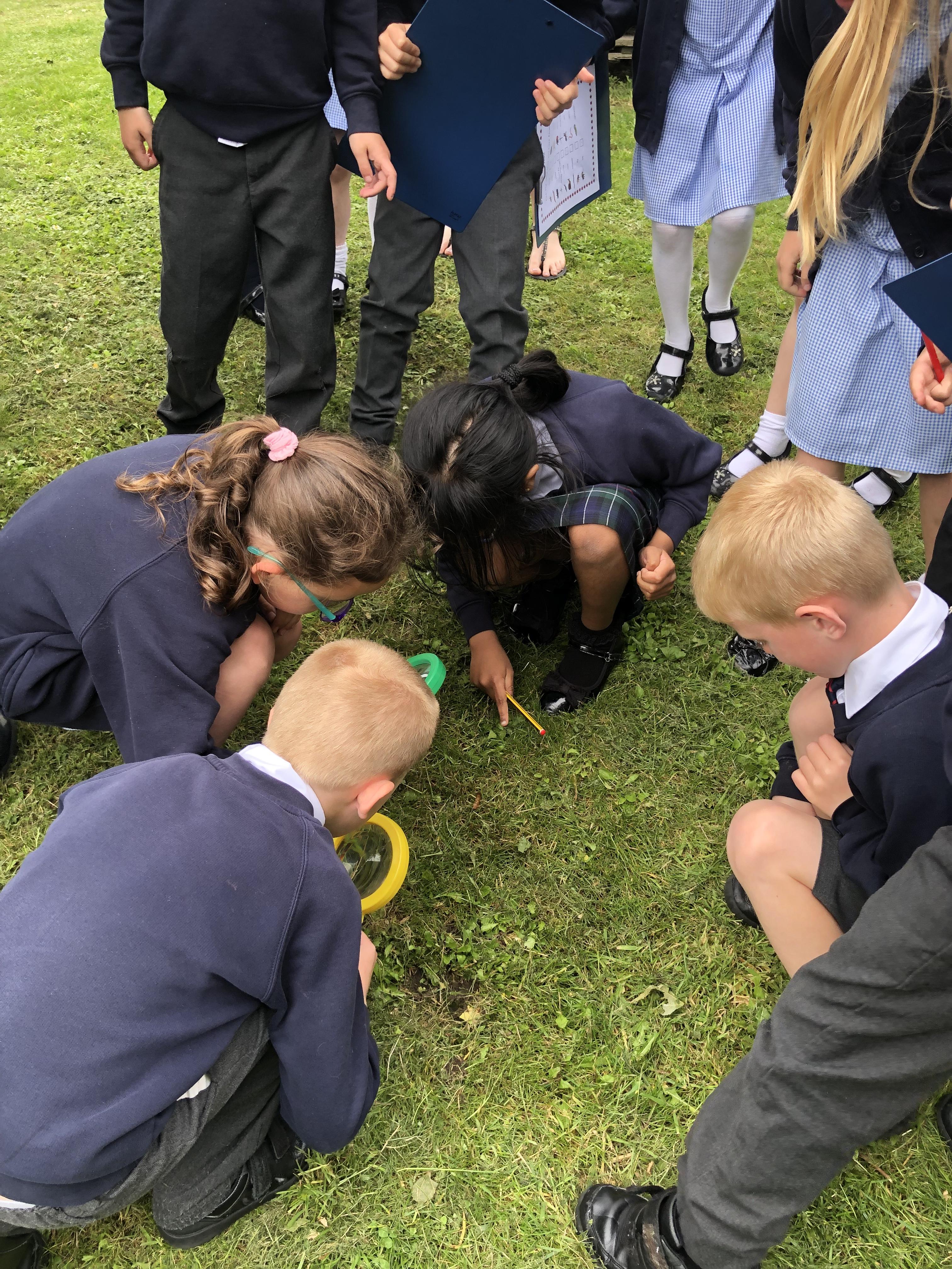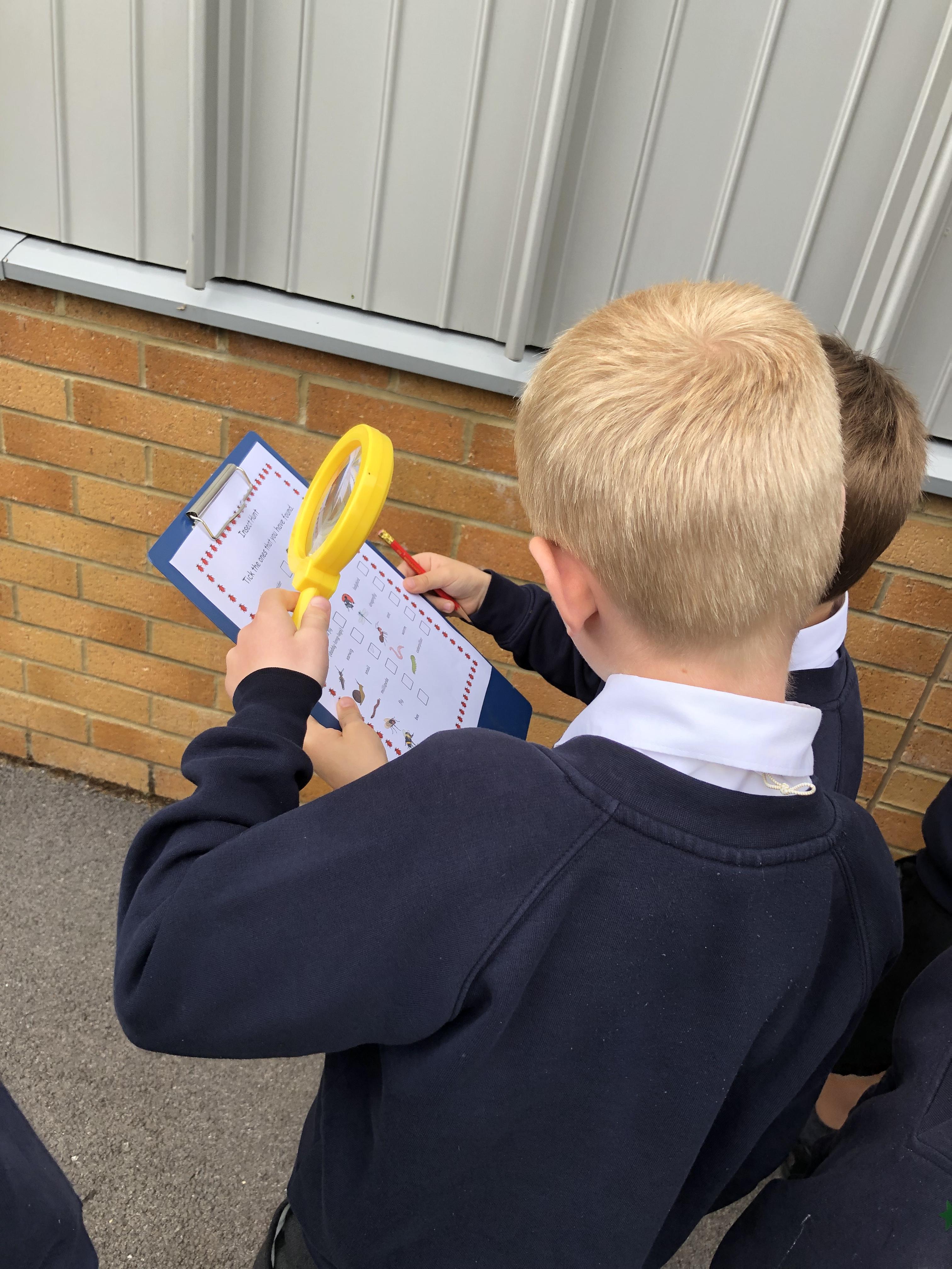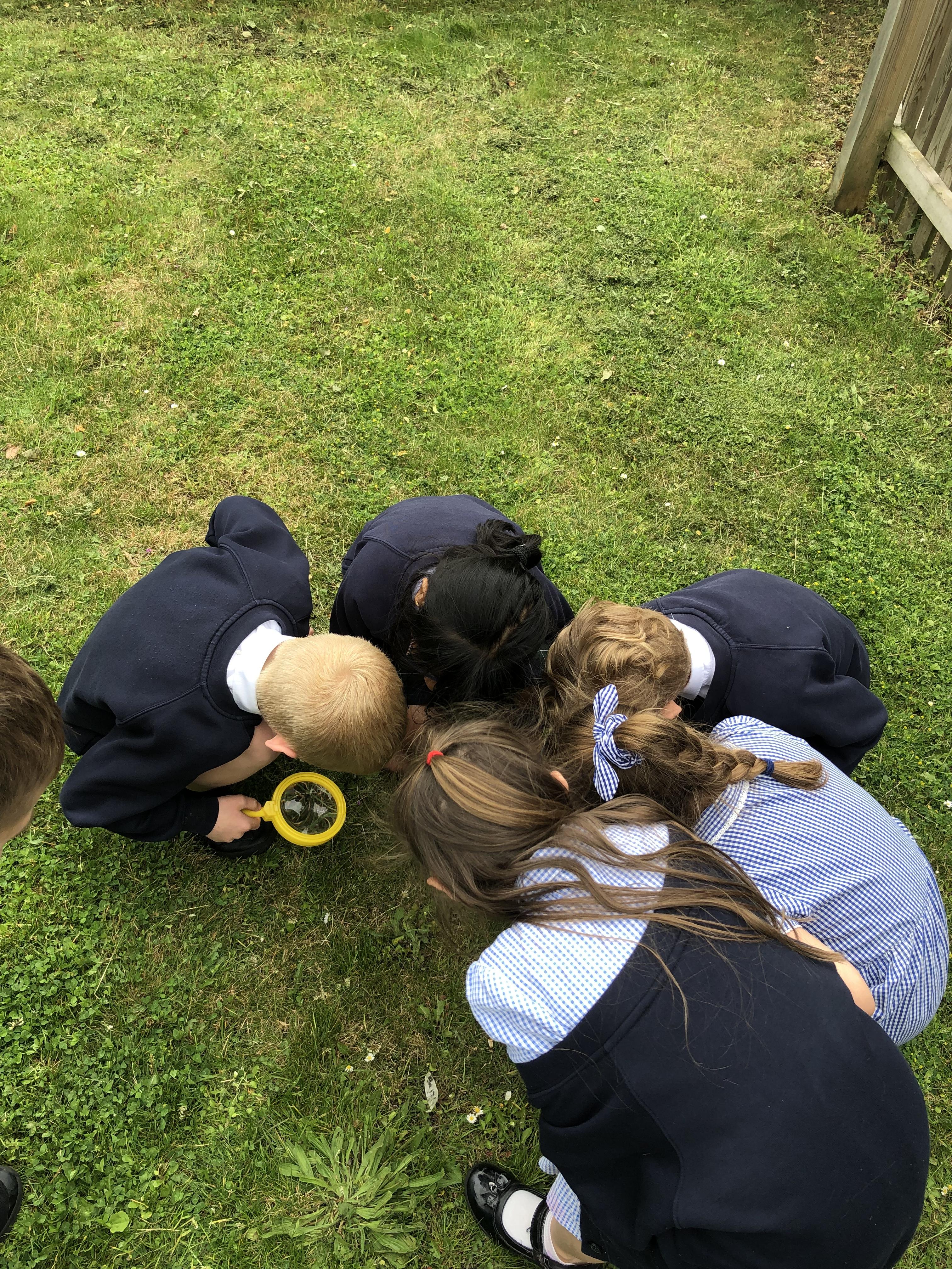 In Science today, the children were learning all about insects. It was only fitting therefore, to go on a class bug hunt and see what mini beasts we could find on campus. The children had so much fun using the magnifying glasses and recording their findings.