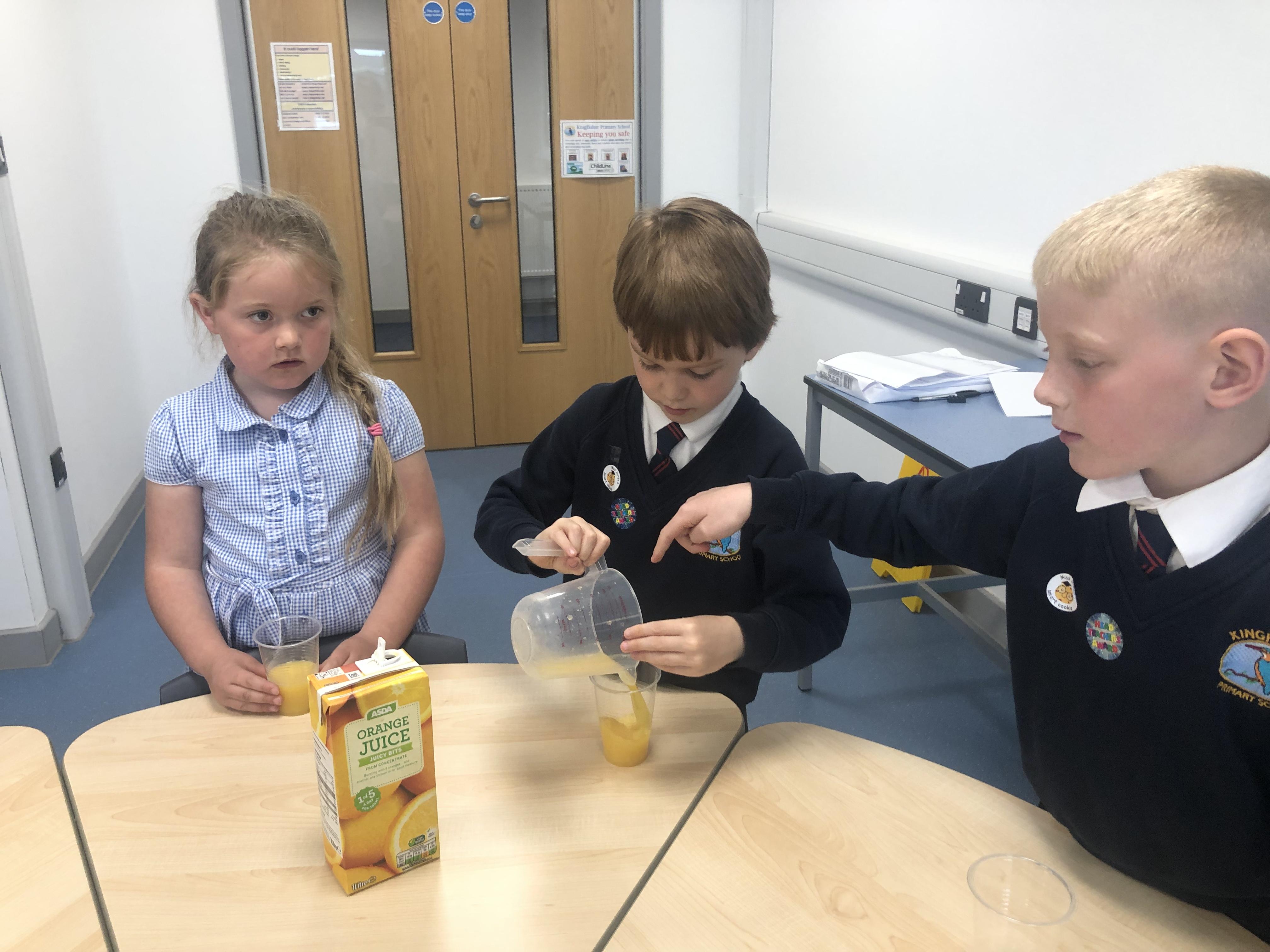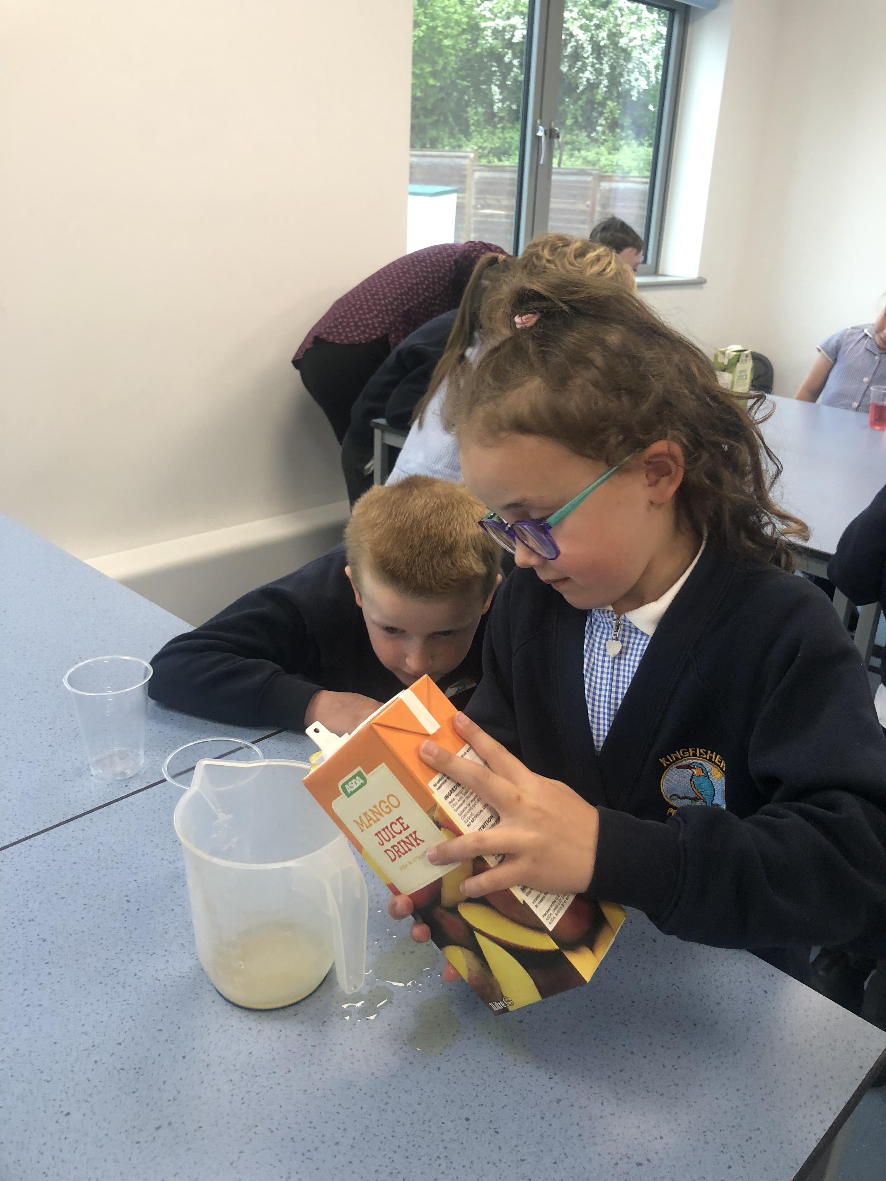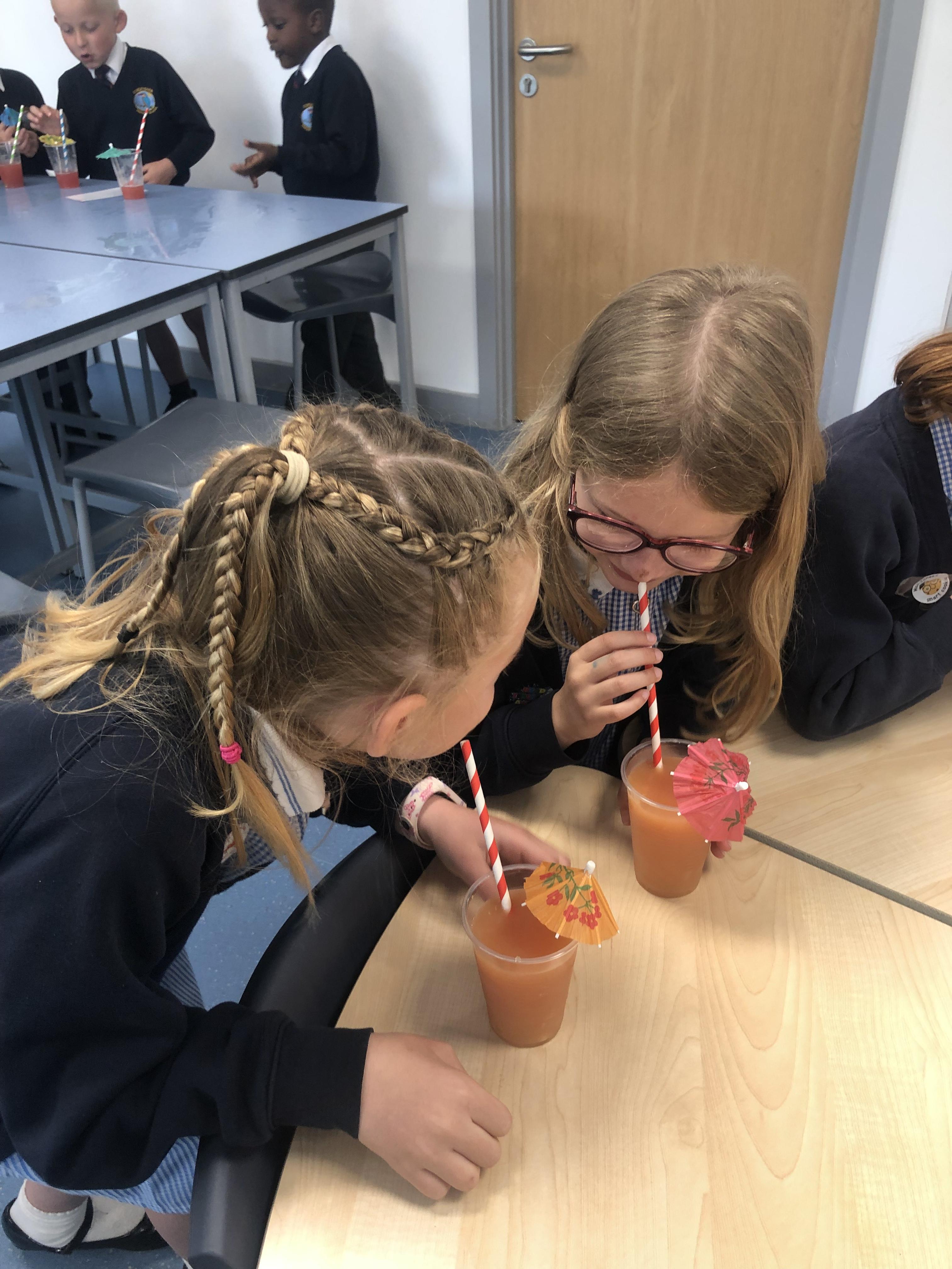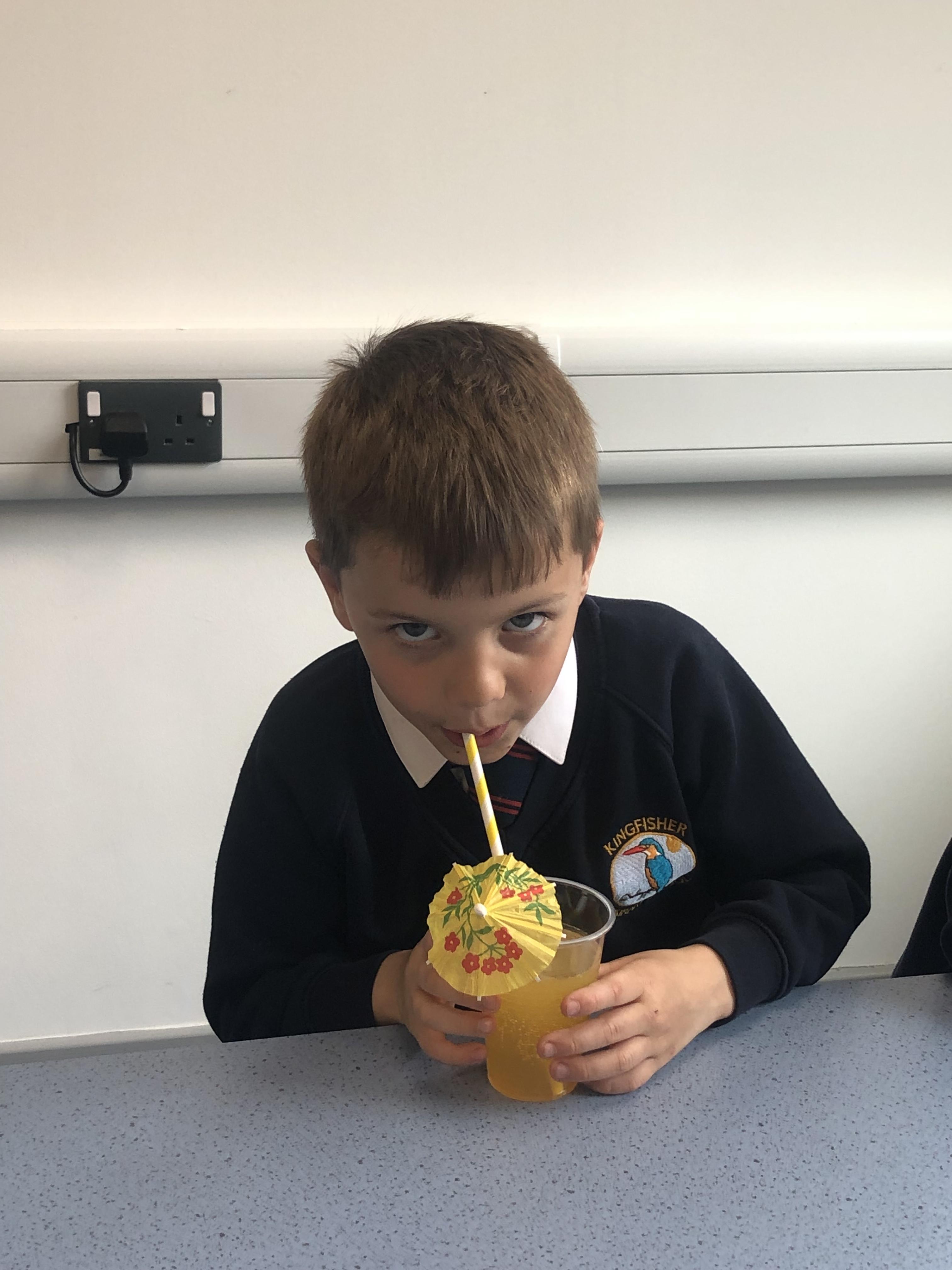 Over the last week the children have been learning all about capacity and volume. To practise measuring volume using standard units of measurement, the children followed a recipe to create their own ‘mocktails’. They all carefully measured the exact amount of each fruit juice they needed using measuring jugs and mixed them altogether to make their perfect concoction. The children topped off their mocktails with cocktail umbrellas before quickly gulping them down.