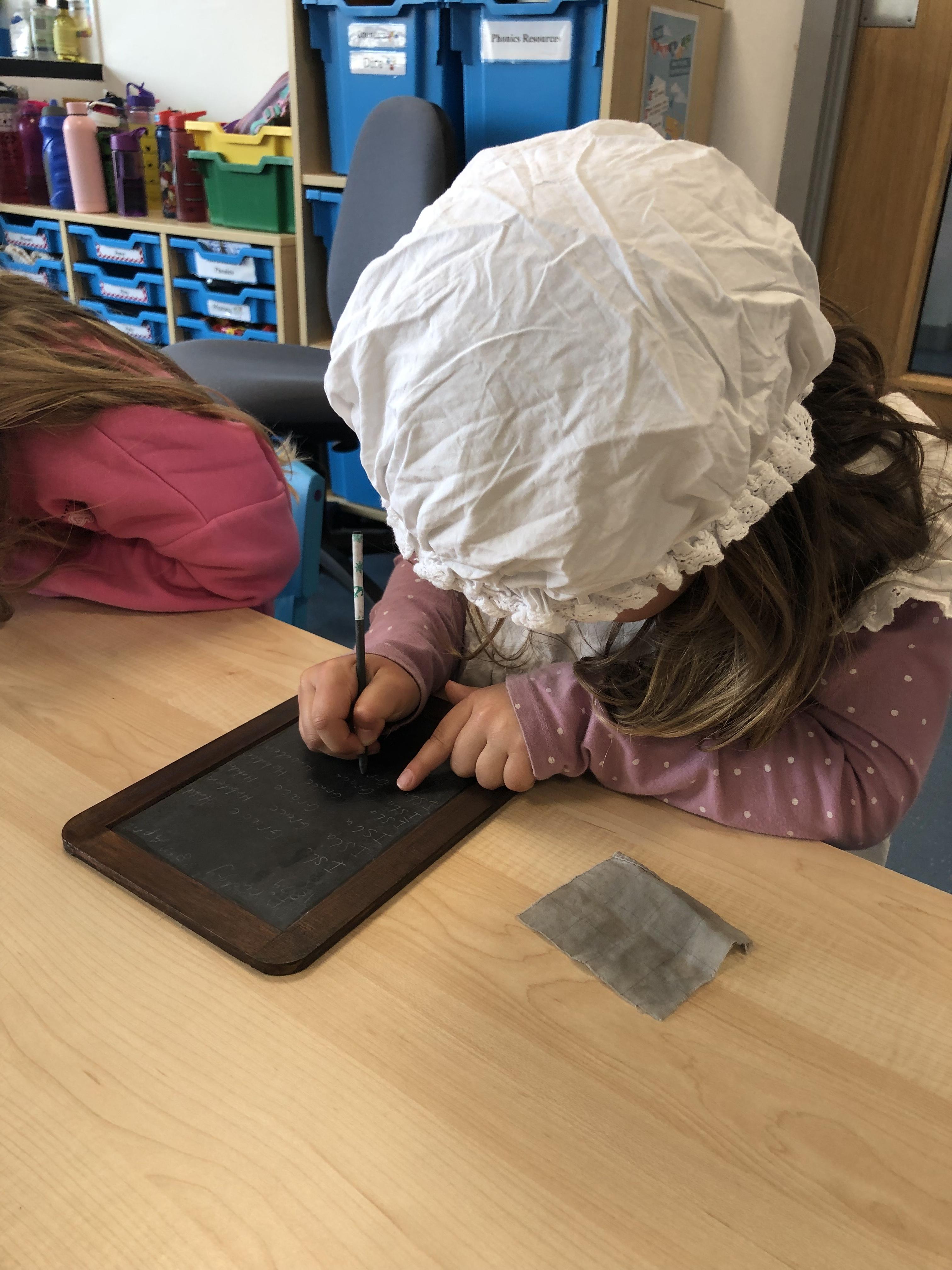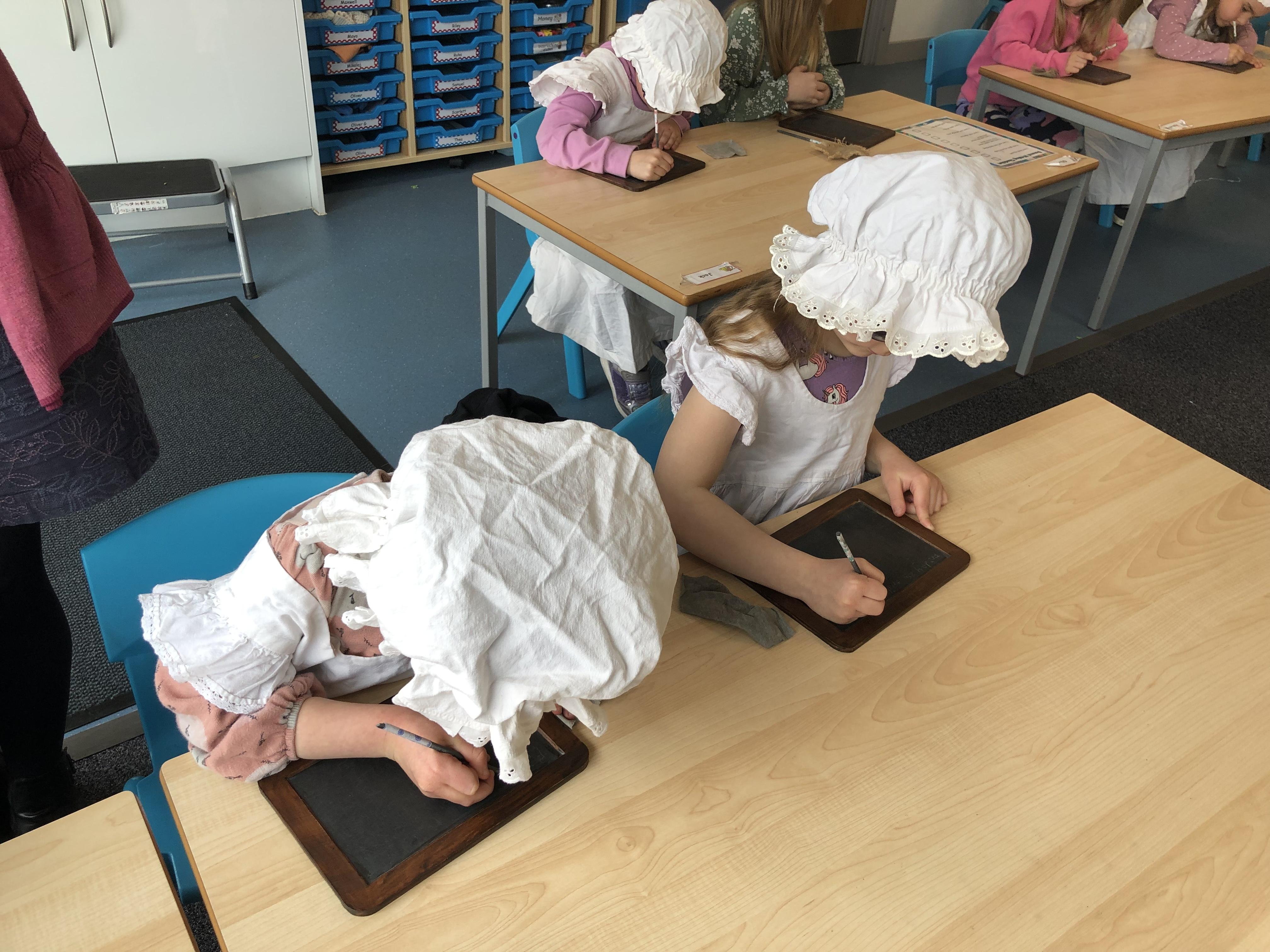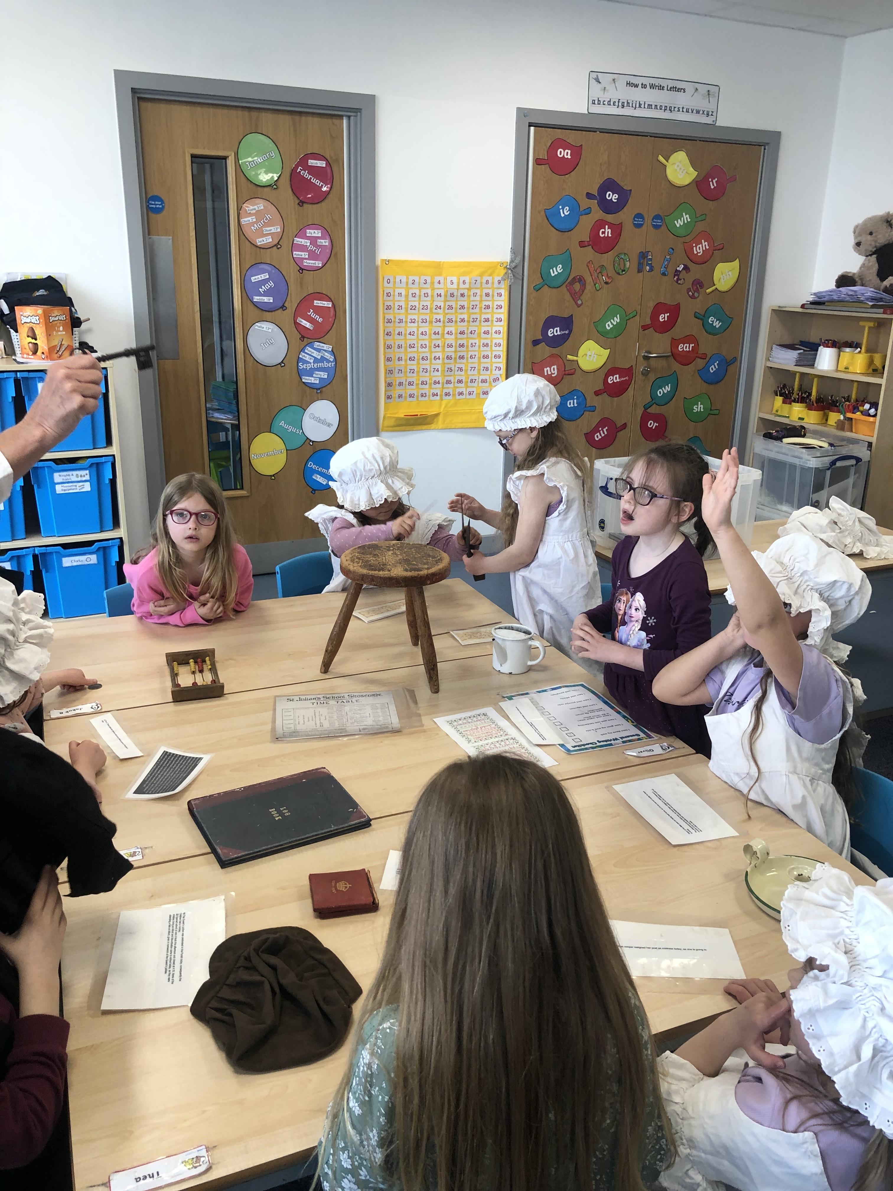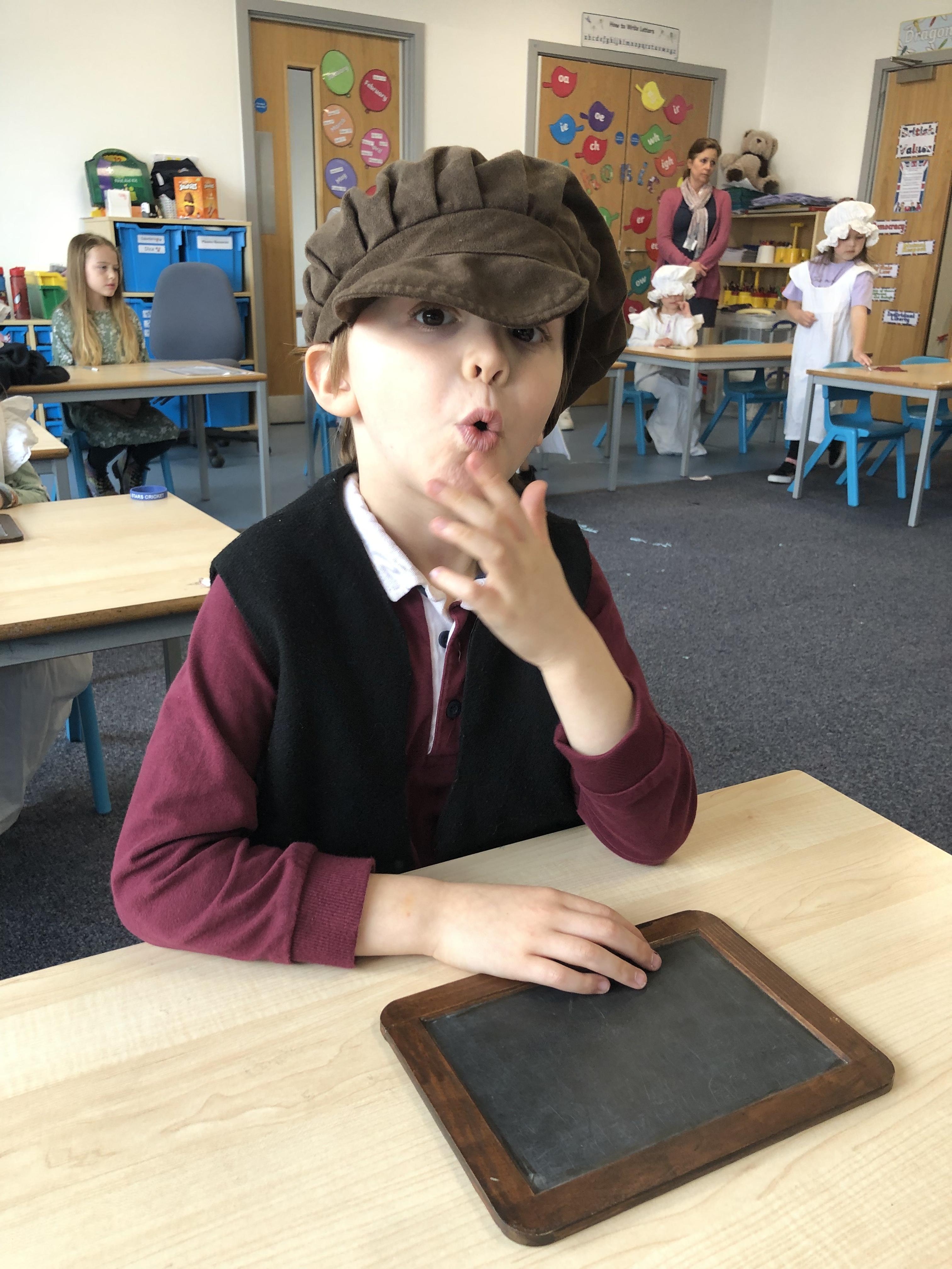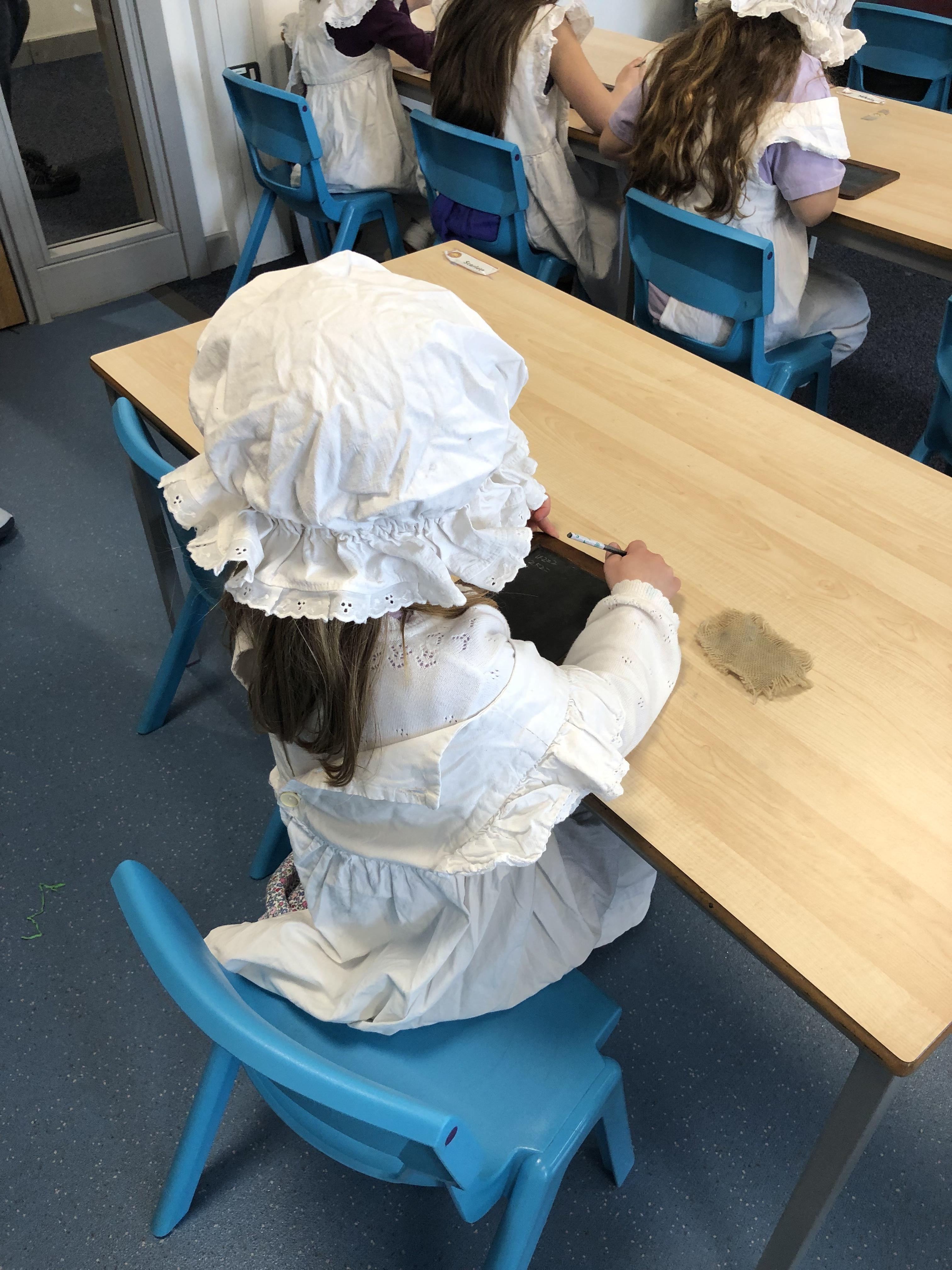 This afternoon, the children were very lucky to have a visit from Sharon from the South West Heritage Trust. She gave the children a glimpse of what school was like for Victorian children. All the children were given the opportunity to dress up as a Victorian school child; a waistcoat and cap for the boys and a dress and bonnet for the girls. The boys and girls were split up in class, just like what happened in Victorian schools and they were able to try out writing on slates. Everyone also had a go at sewing and practising handwriting. Sharon very kindly showed the children a range of Victorian artefacts. It was a really fun afternoon with the children super engaged throughout. It goes without saying that they are all very happy that school life has advanced since the Victorian times.