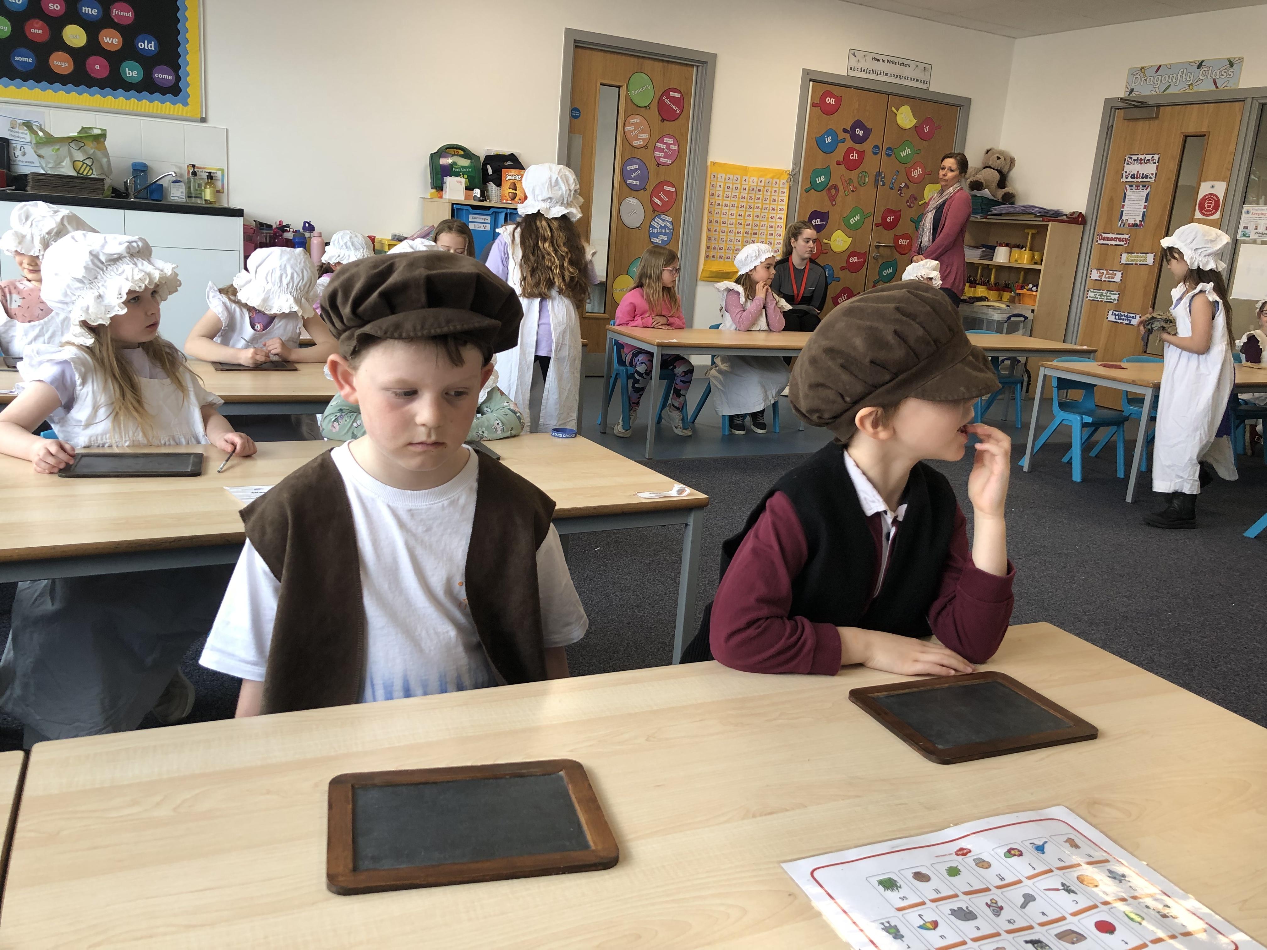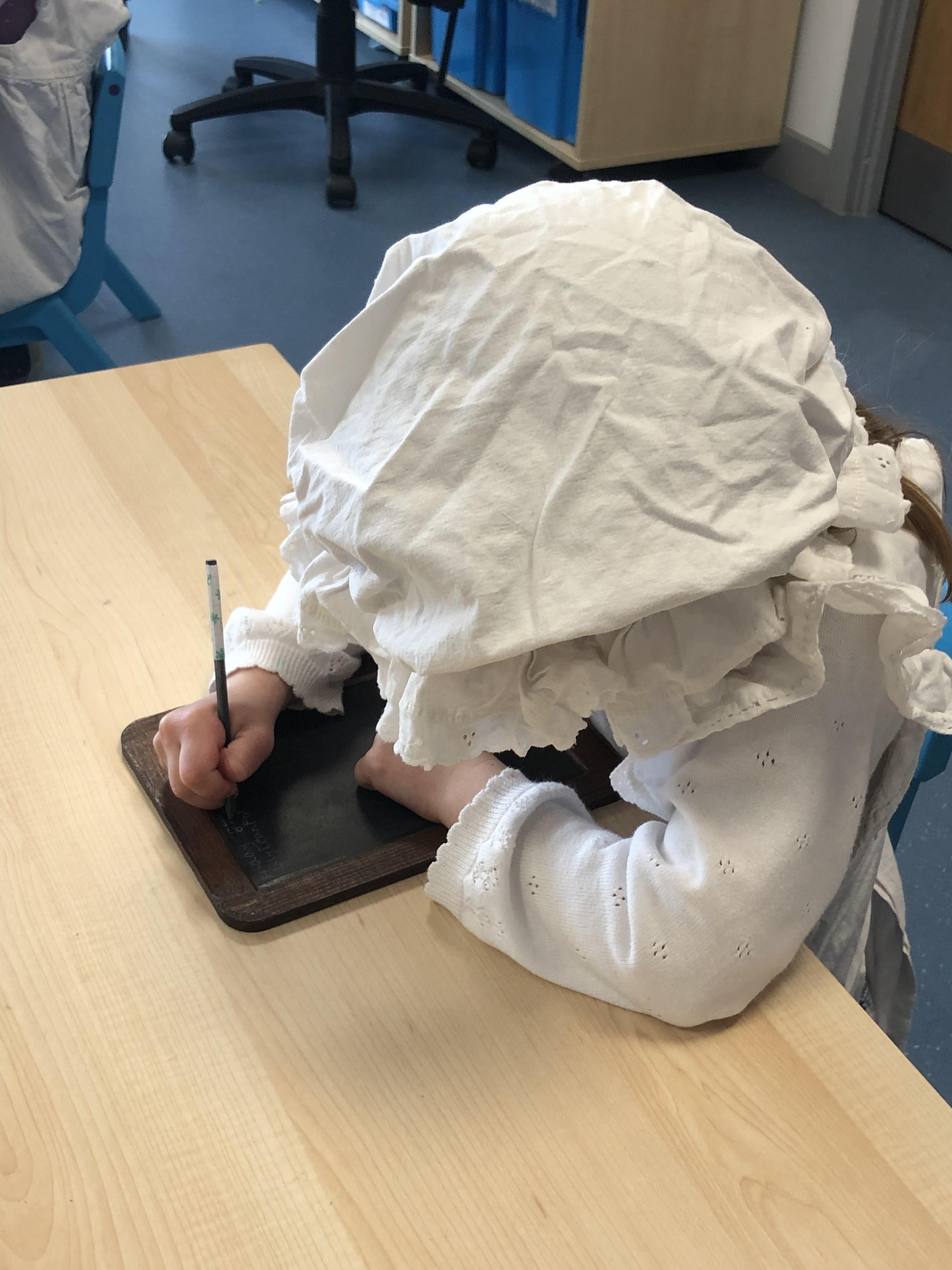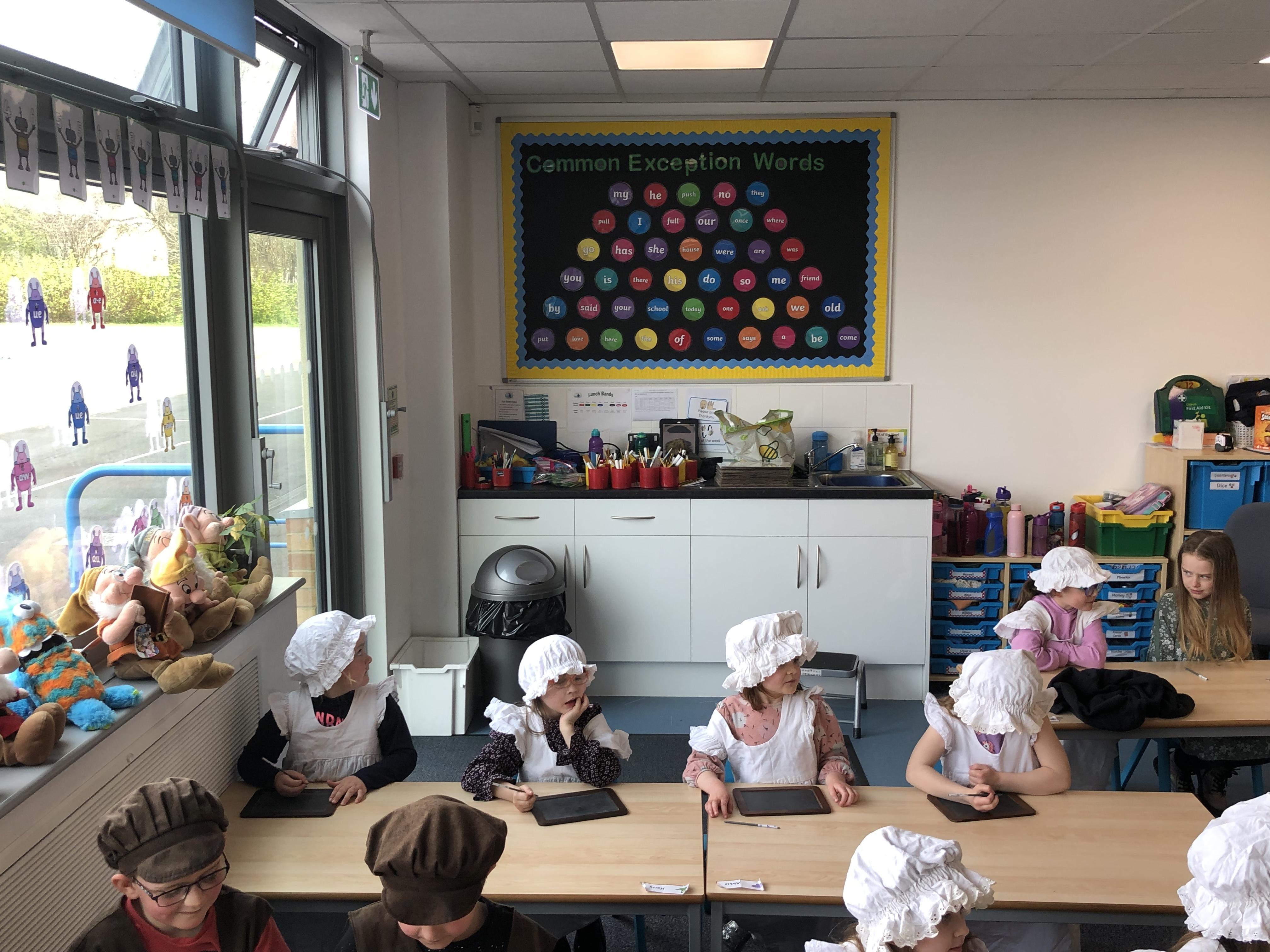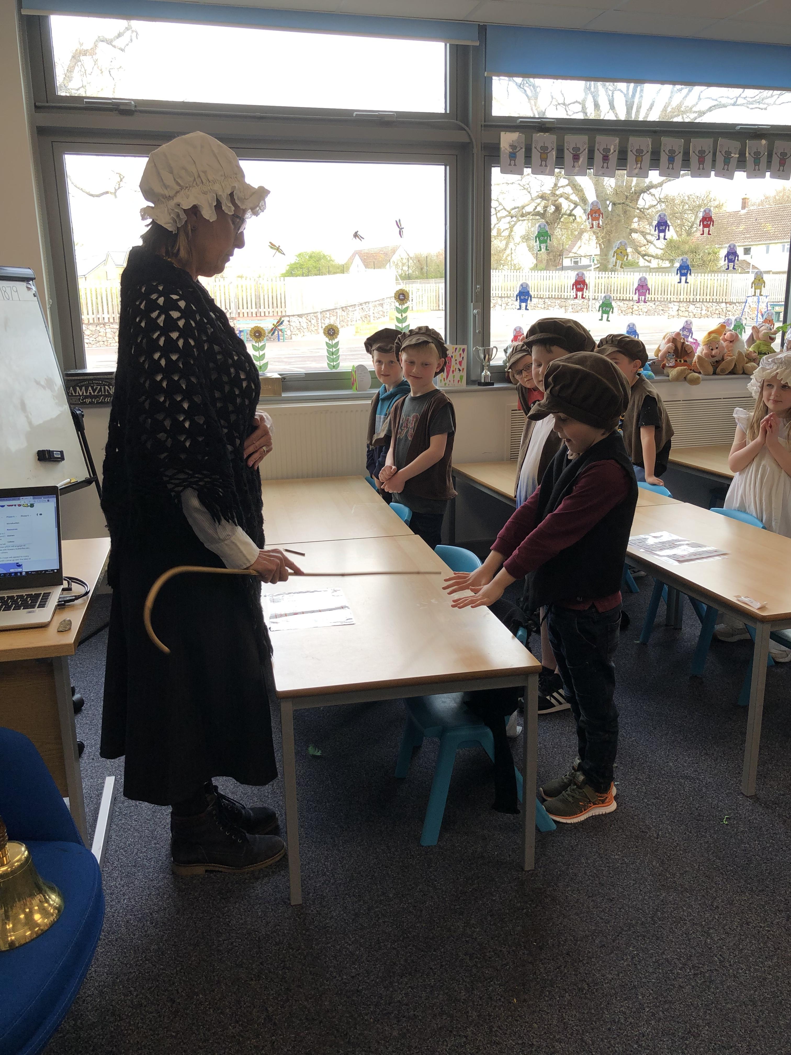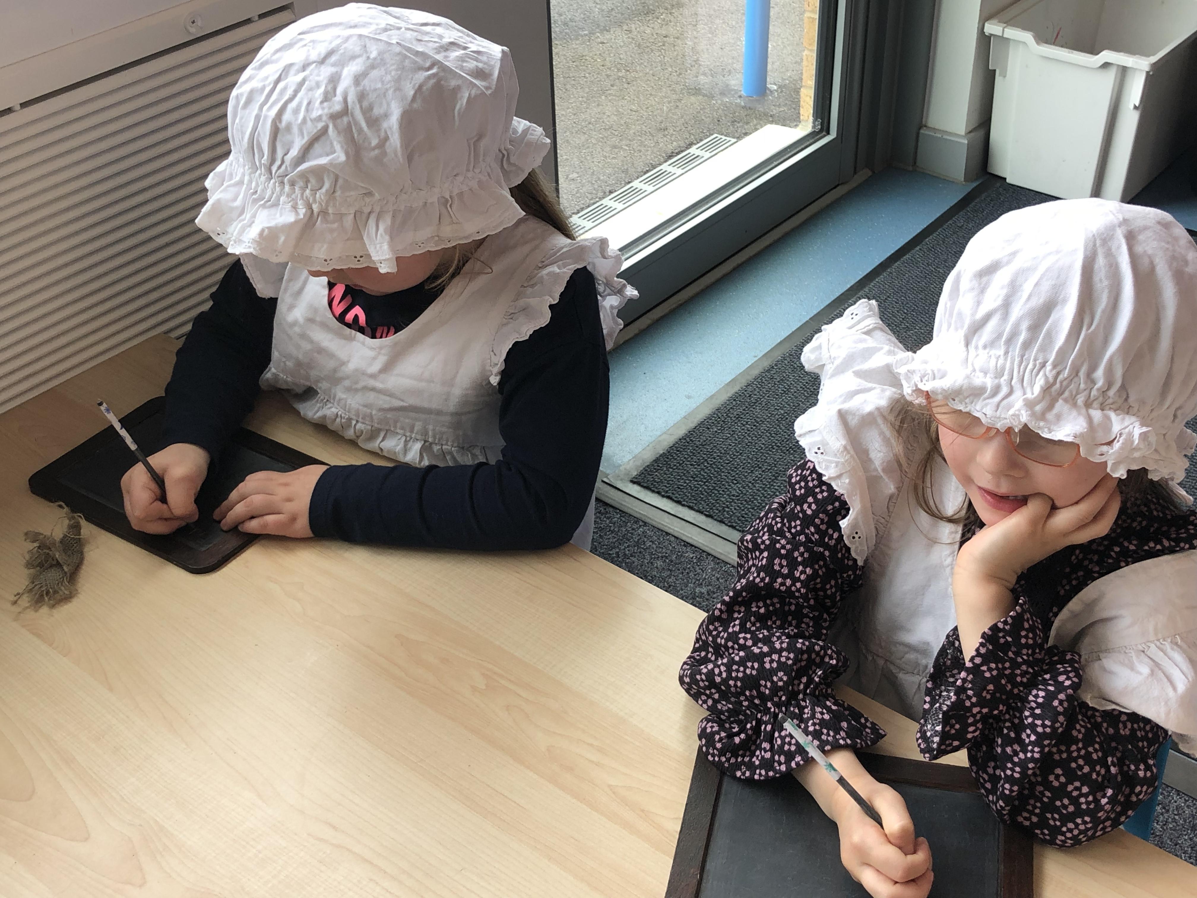 This afternoon, the children were very lucky to have a visit from Sharon from the South West Heritage Trust. She gave the children a glimpse of what school was like for Victorian children. All the children were given the opportunity to dress up as a Victorian school child; a waistcoat and cap for the boys and a dress and bonnet for the girls. The boys and girls were split up in class, just like what happened in Victorian schools and they were able to try out writing on slates. Everyone also had a go at sewing and practising handwriting. Sharon very kindly showed the children a range of Victorian artefacts. It was a really fun afternoon with the children super engaged throughout. It goes without saying that they are all very happy that school life has advanced since the Victorian times.