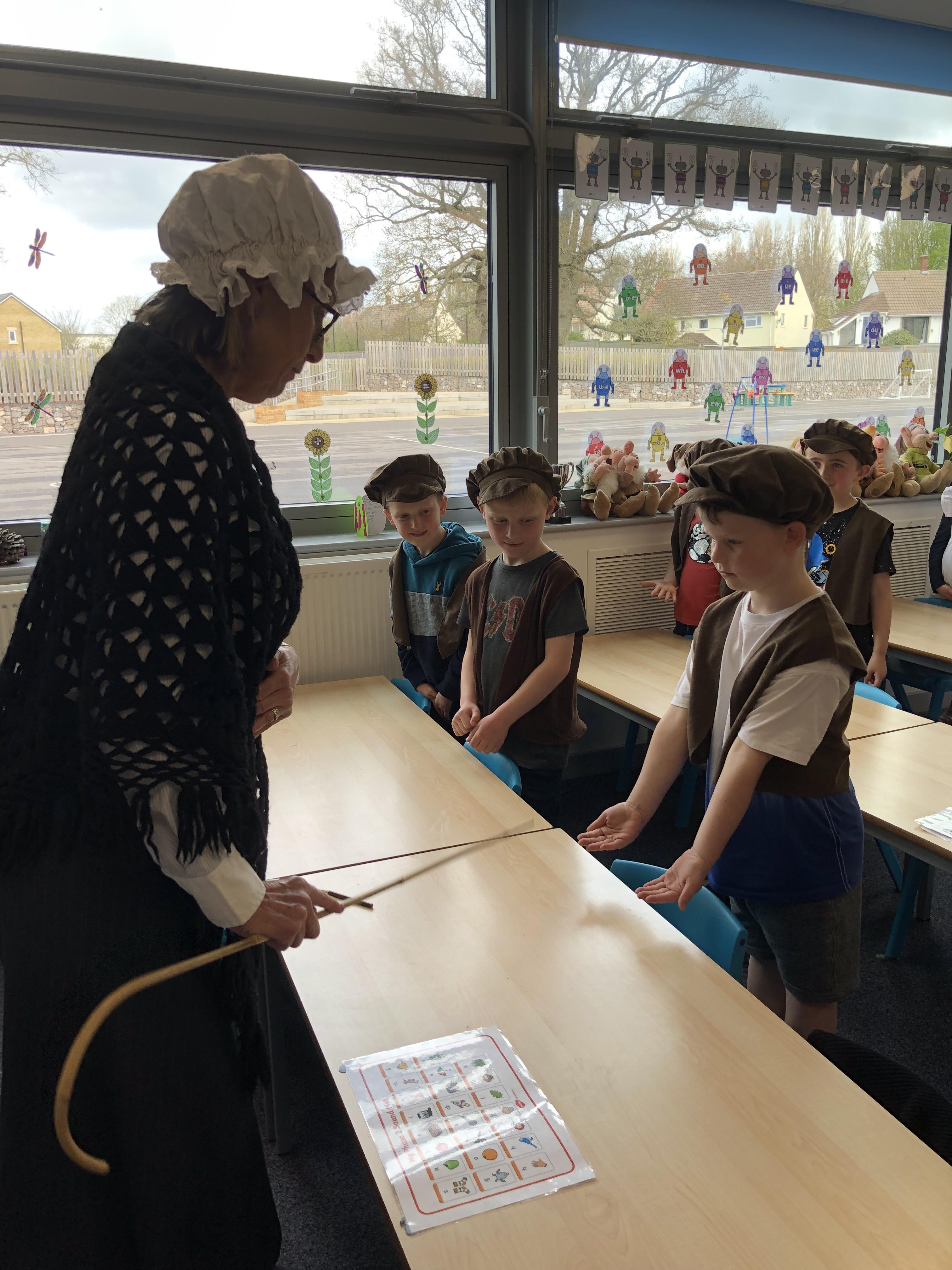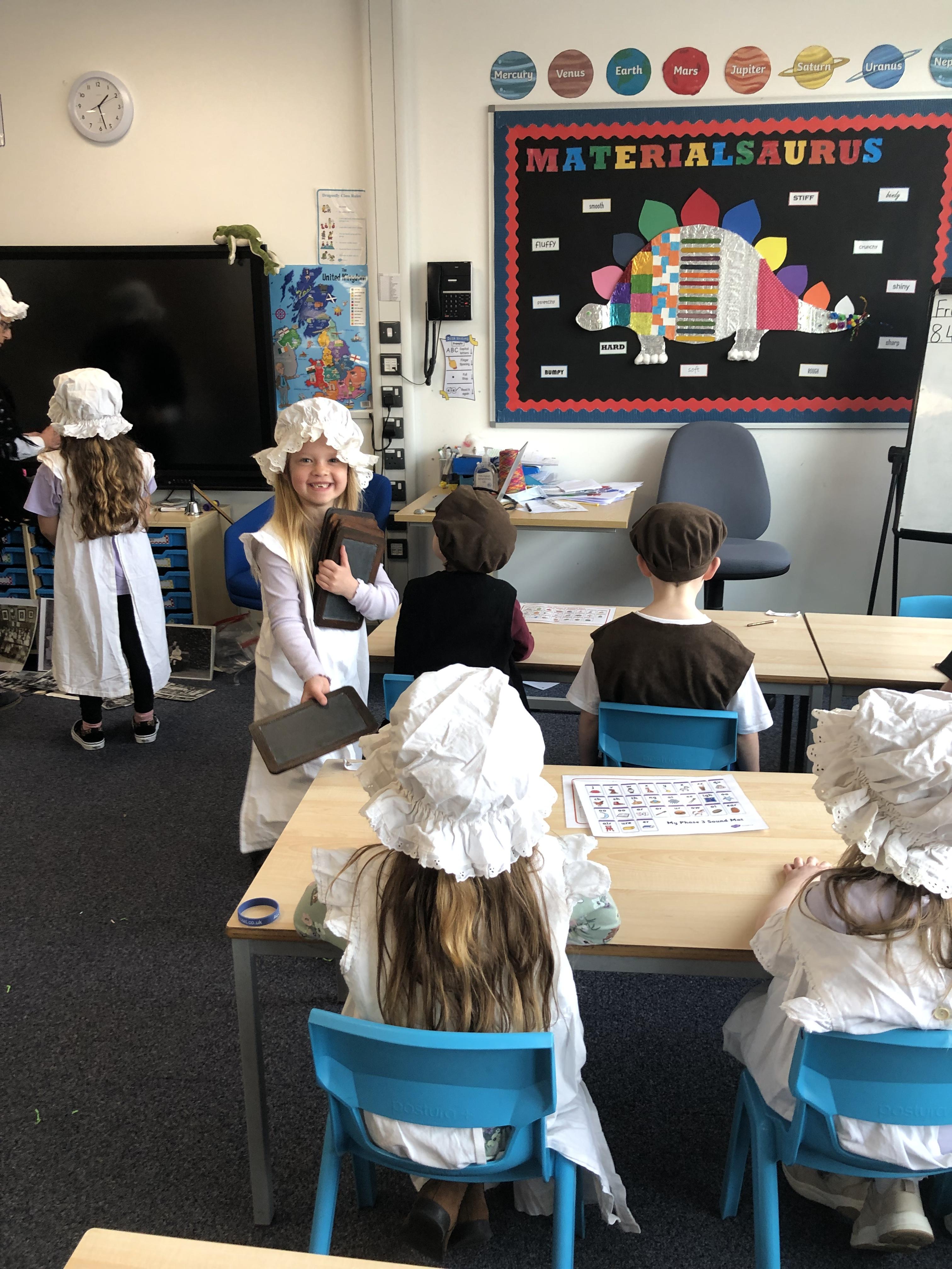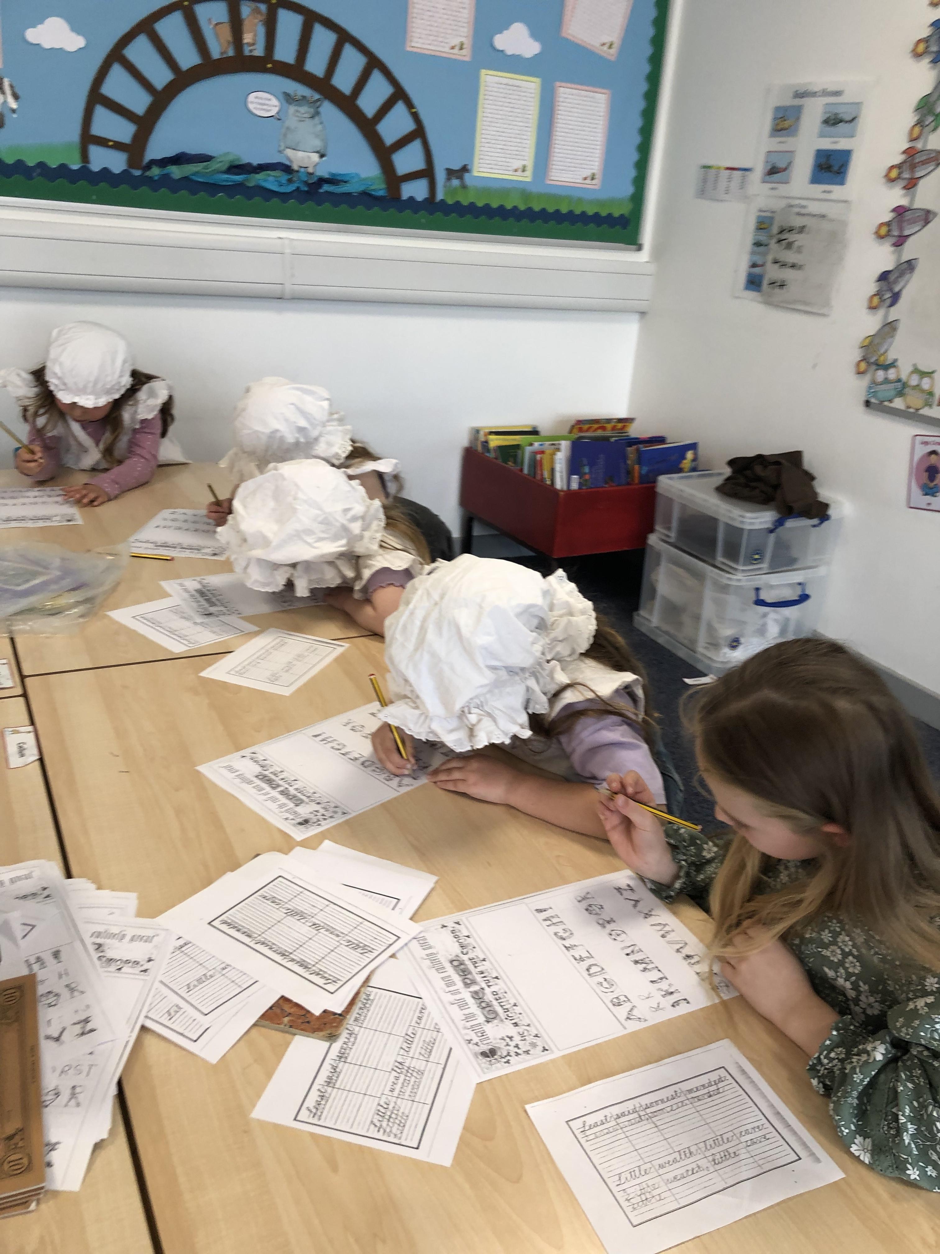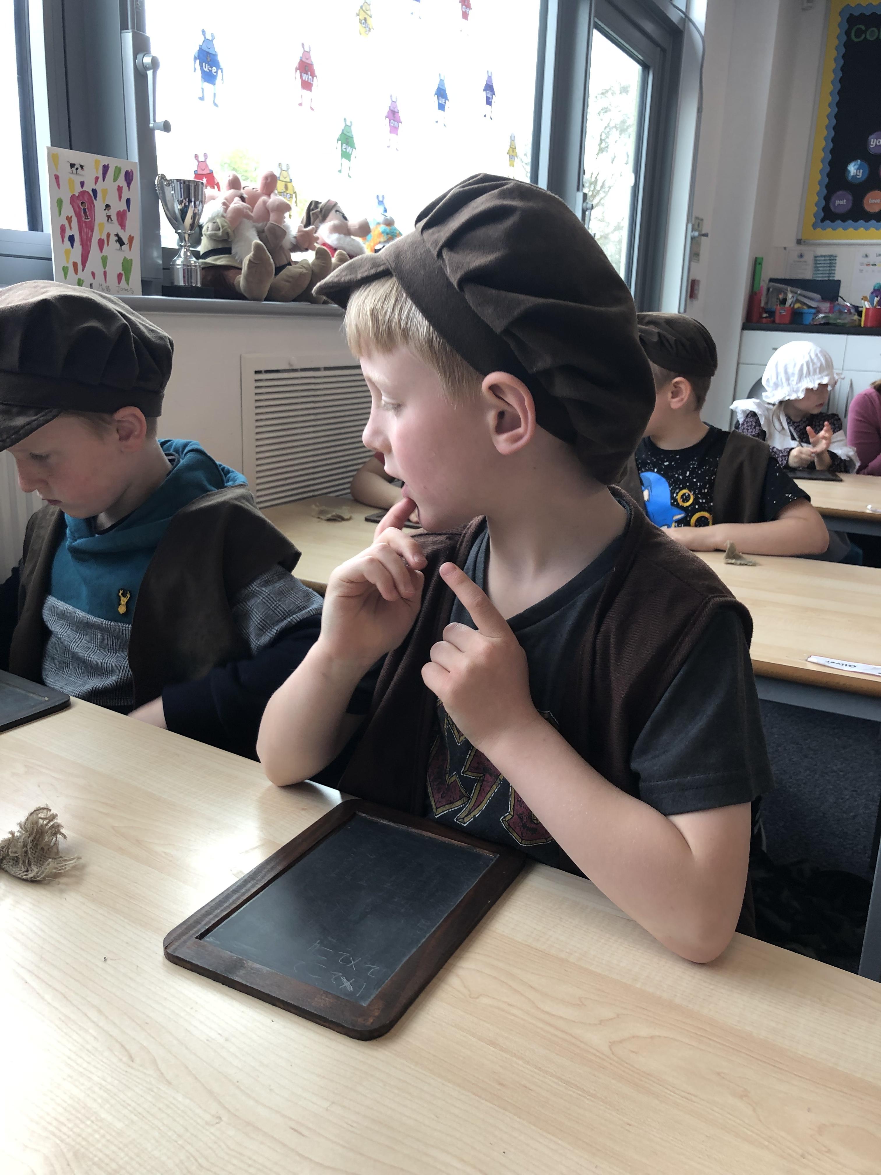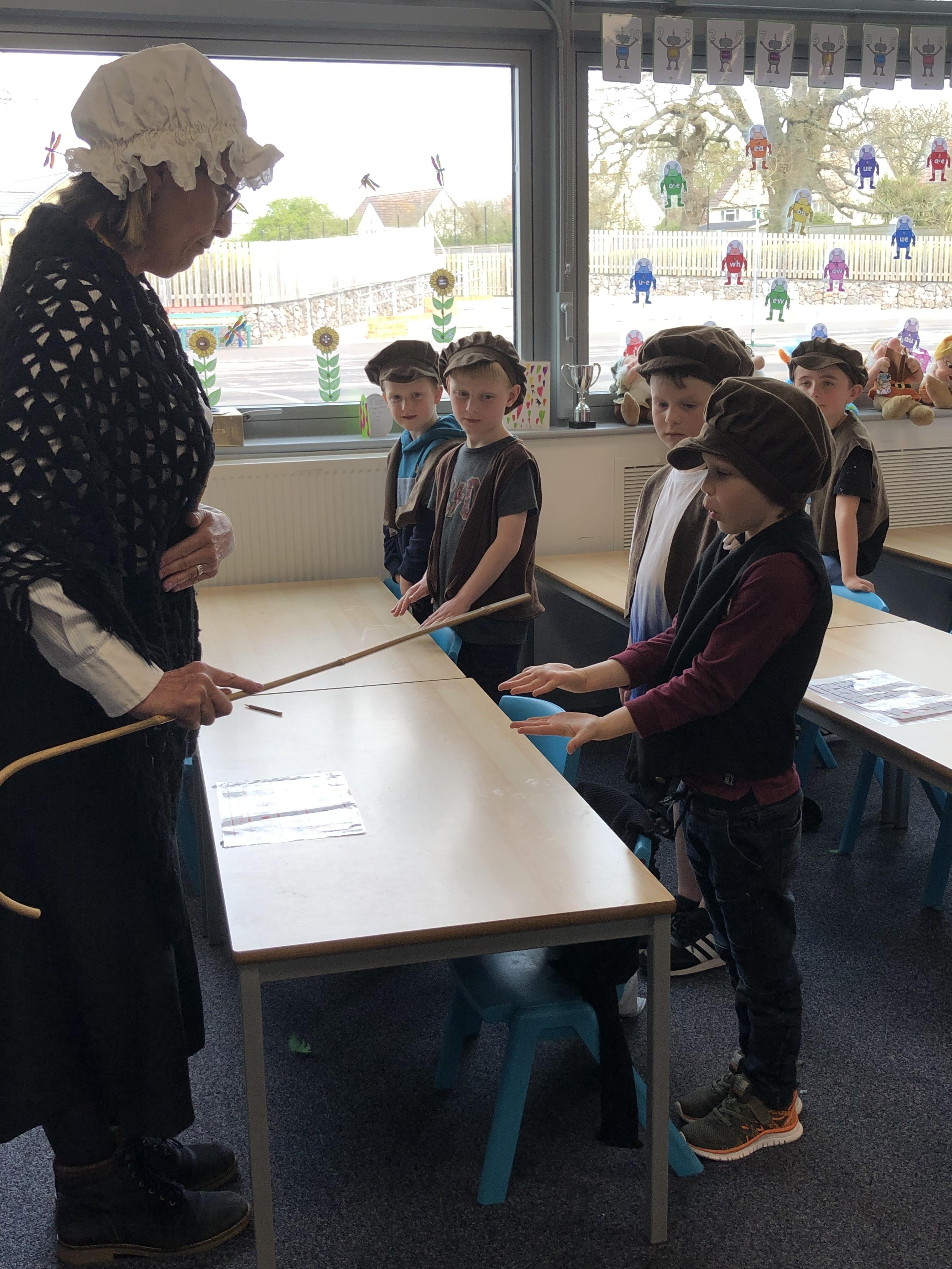This afternoon, the children were very lucky to have a visit from Sharon from the South West Heritage Trust. She gave the children a glimpse of what school was like for Victorian children. All the children were given the opportunity to dress up as a Victorian school child; a waistcoat and cap for the boys and a dress and bonnet for the girls. The boys and girls were split up in class, just like what happened in Victorian schools and they were able to try out writing on slates. Everyone also had a go at sewing and practising handwriting. Sharon very kindly showed the children a range of Victorian artefacts. It was a really fun afternoon with the children super engaged throughout. It goes without saying that they are all very happy that school life has advanced since the Victorian times.