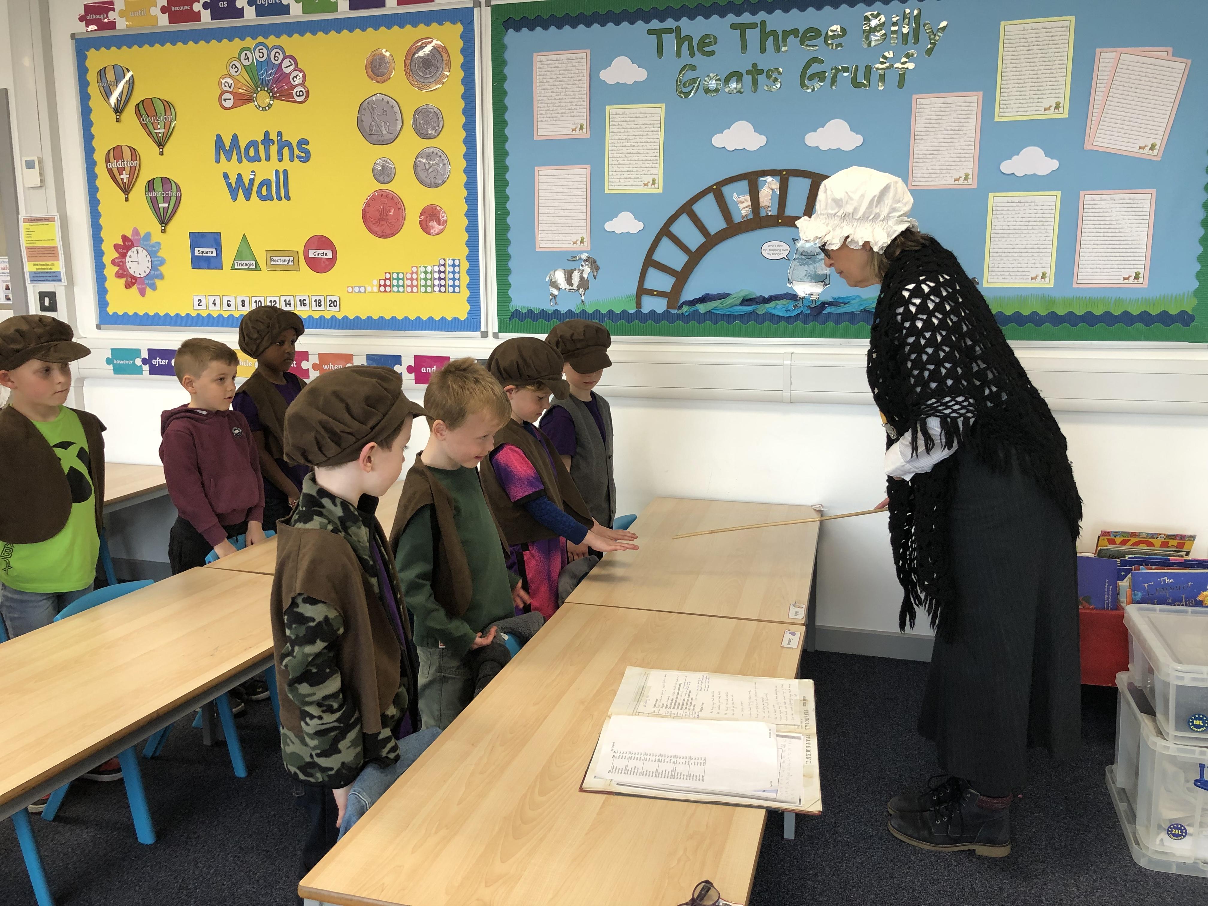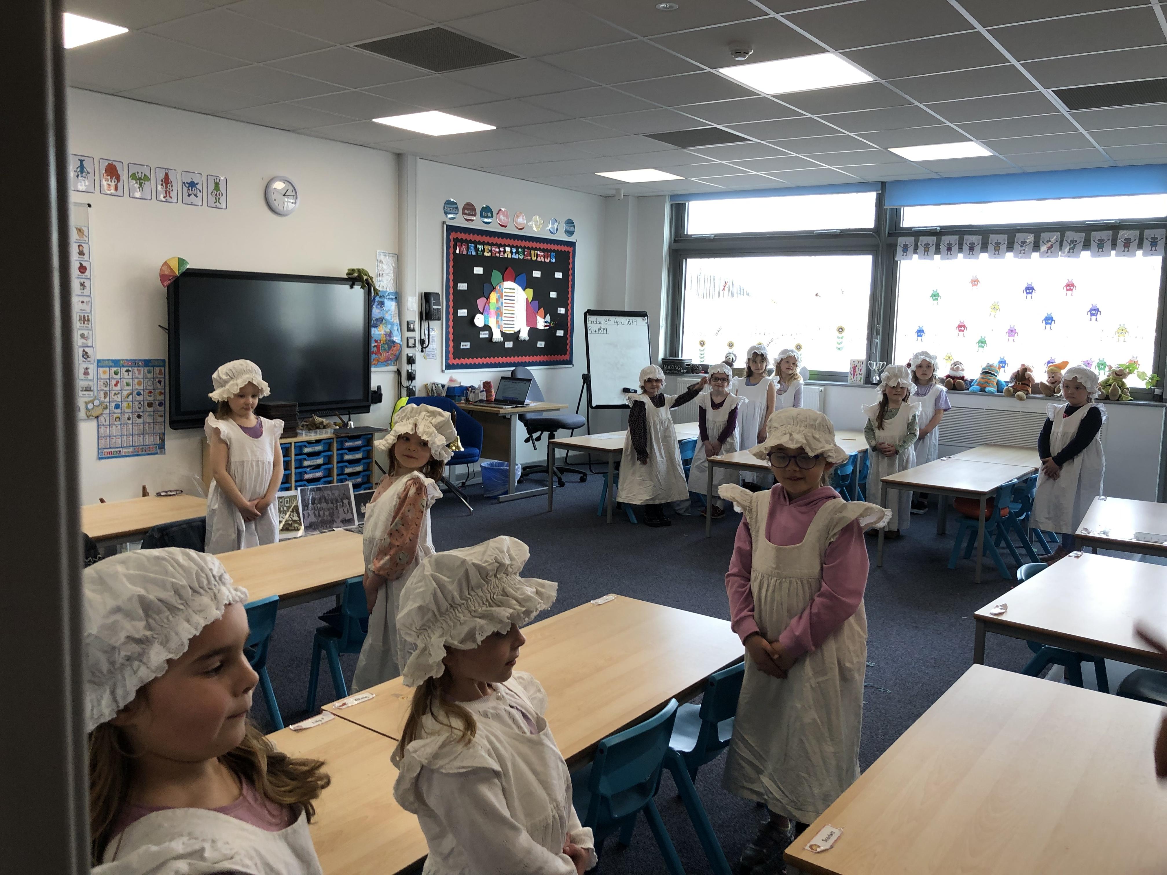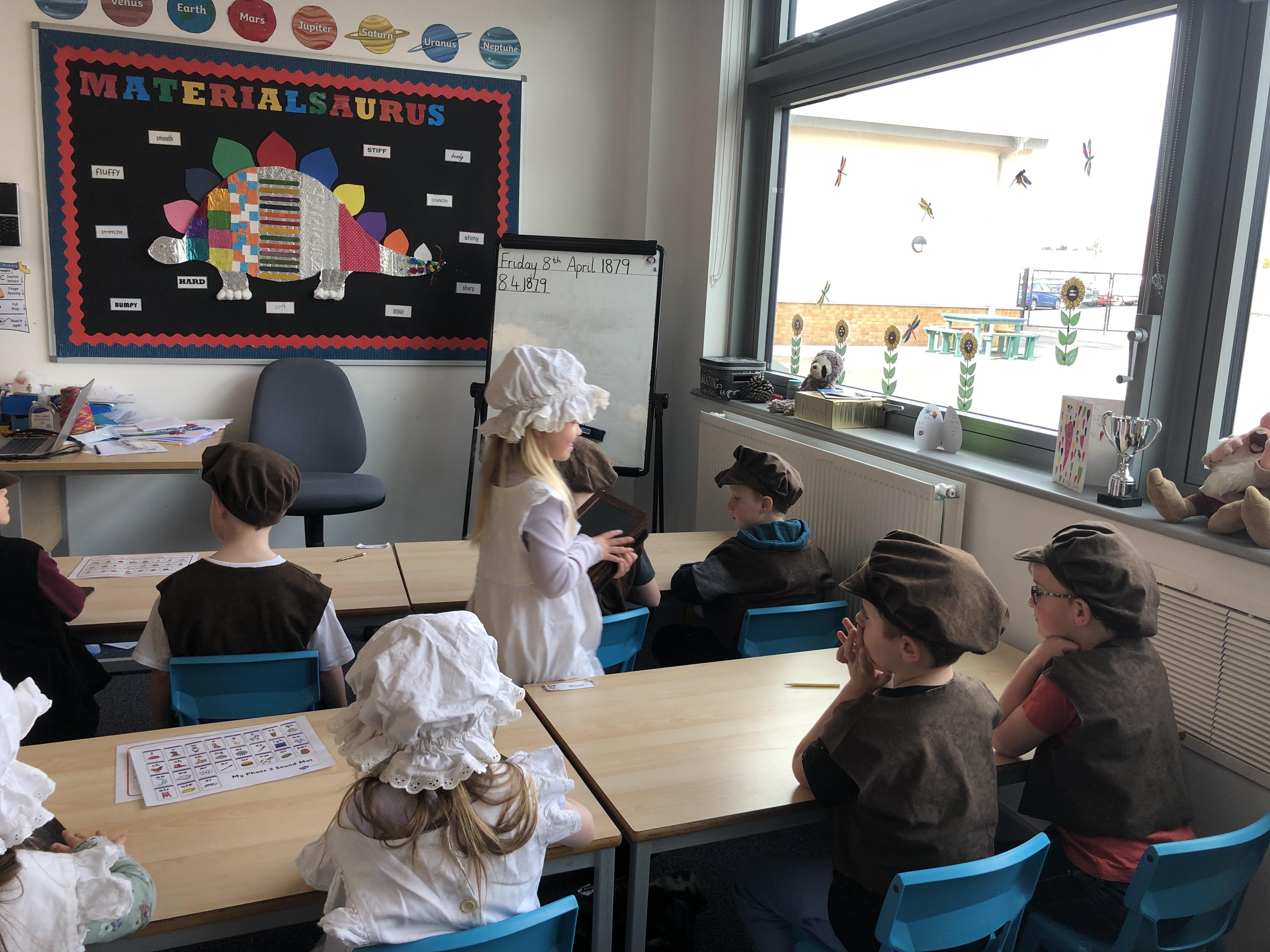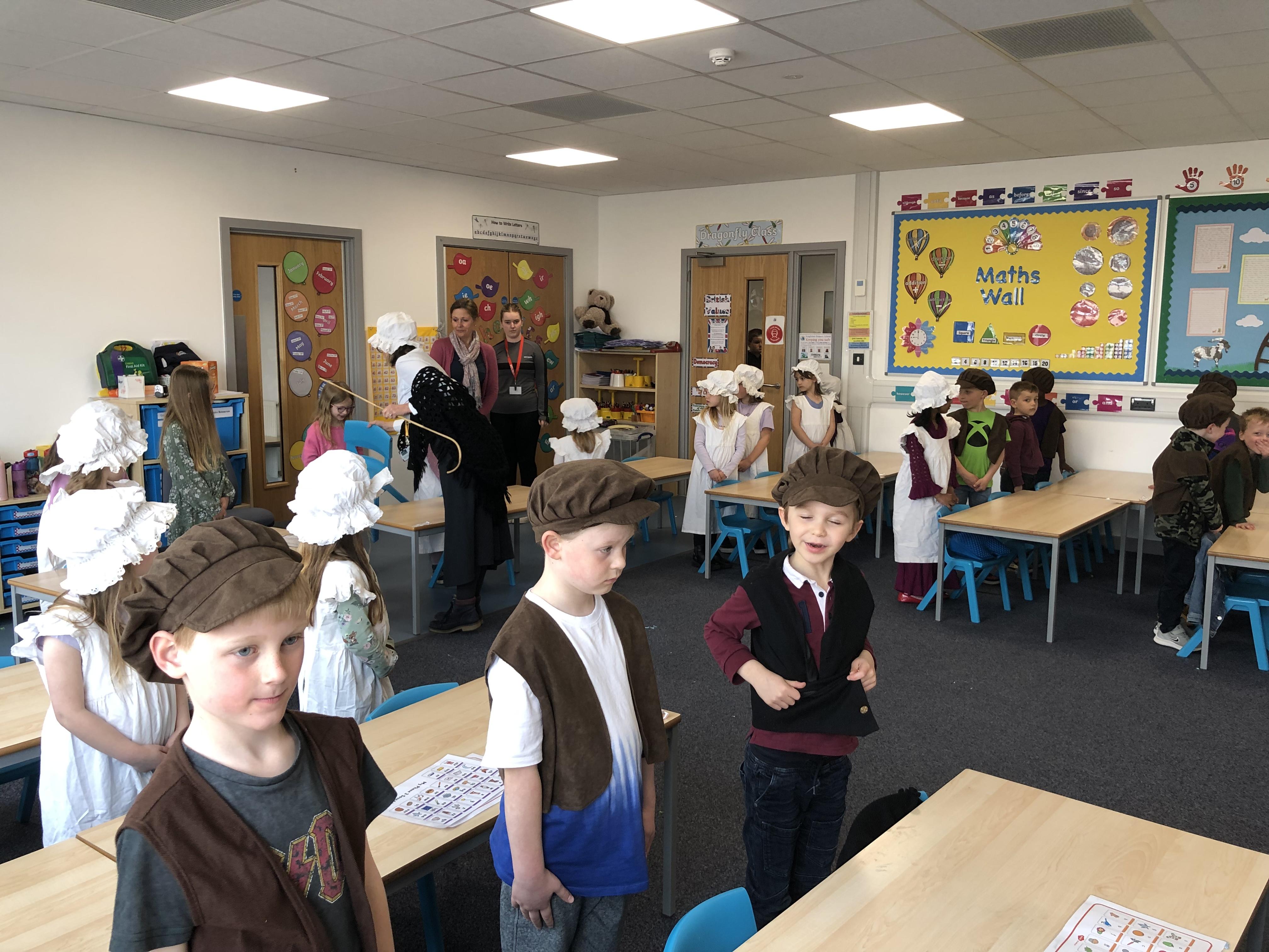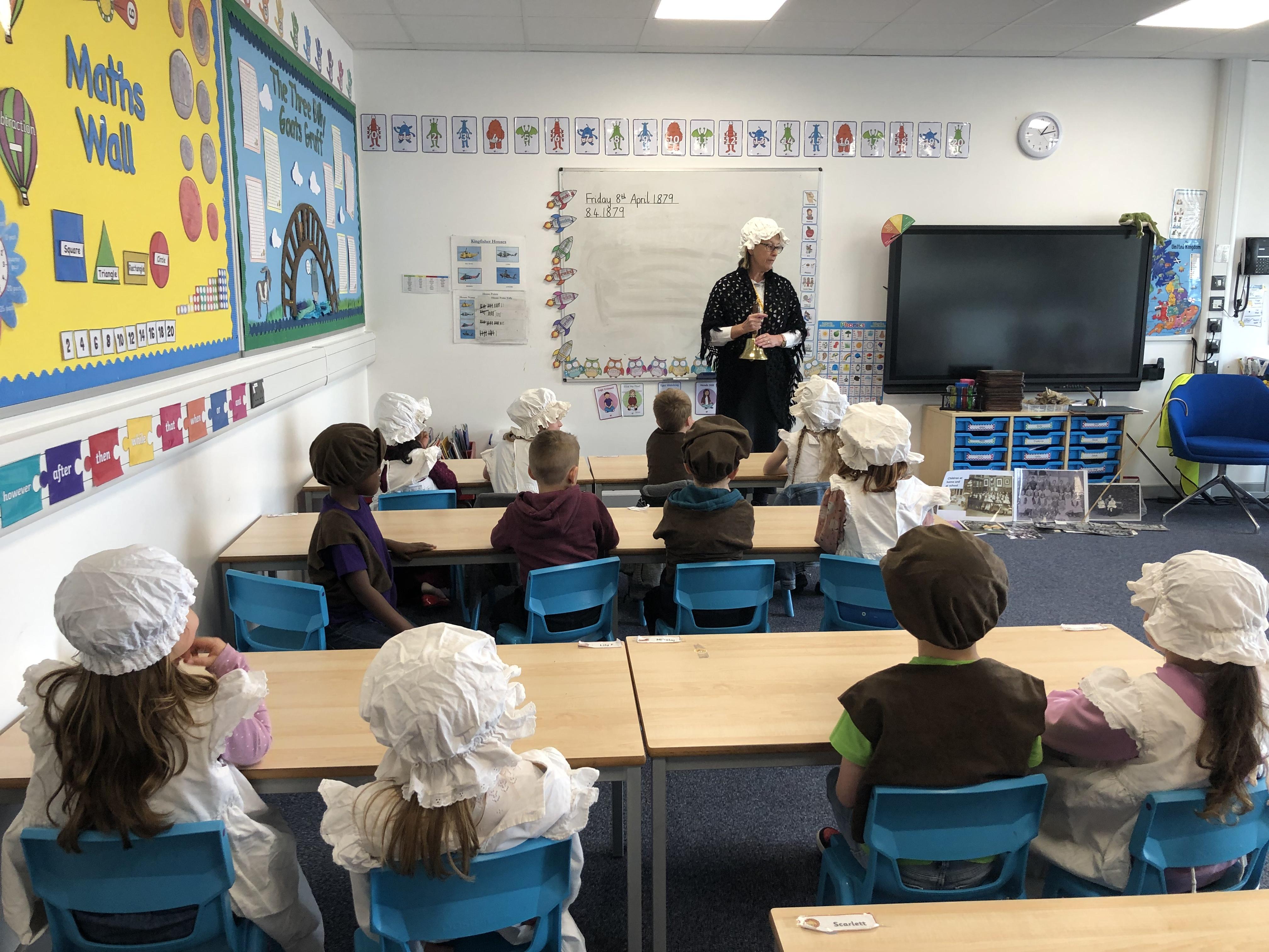This afternoon, the children were very lucky to have a visit from Sharon from the South West Heritage Trust. She gave the children a glimpse of what school was like for Victorian children. All the children were given the opportunity to dress up as a Victorian school child; a waistcoat and cap for the boys and a dress and bonnet for the girls. The boys and girls were split up in class, just like what happened in Victorian schools and they were able to try out writing on slates. Everyone also had a go at sewing and practising handwriting. Sharon very kindly showed the children a range of Victorian artefacts. It was a really fun afternoon with the children super engaged throughout. It goes without saying that they are all very happy that school life has advanced since the Victorian times.