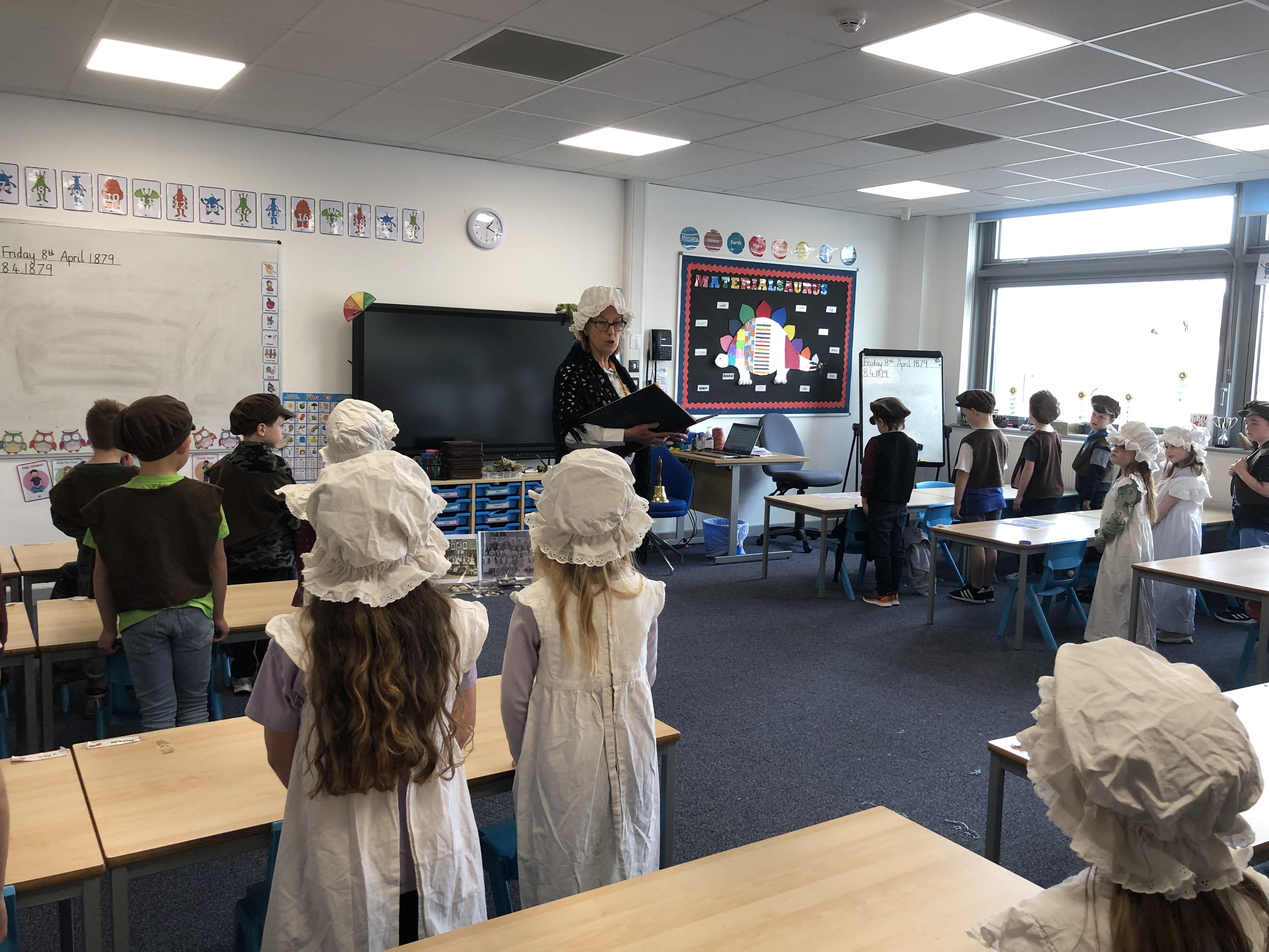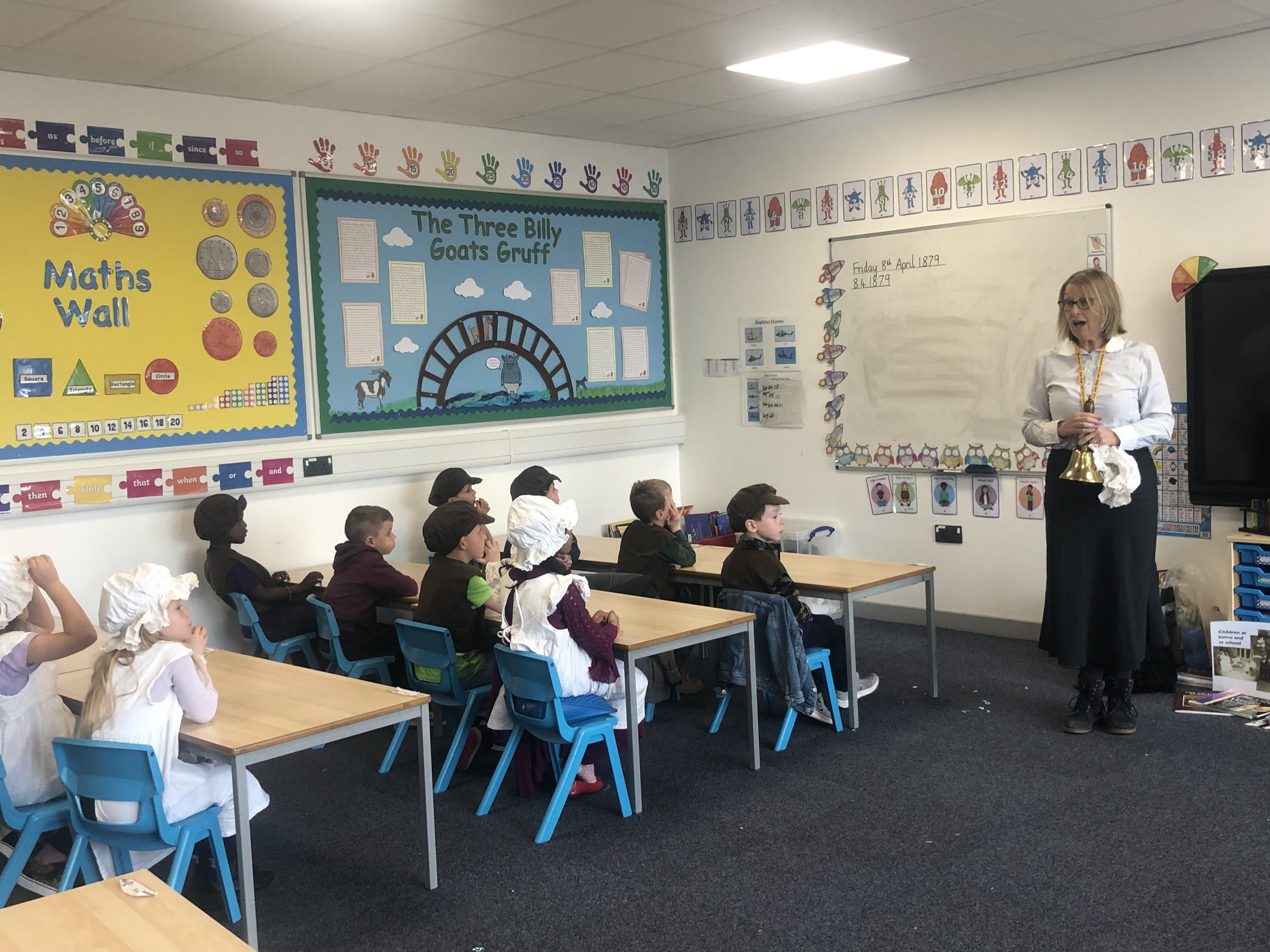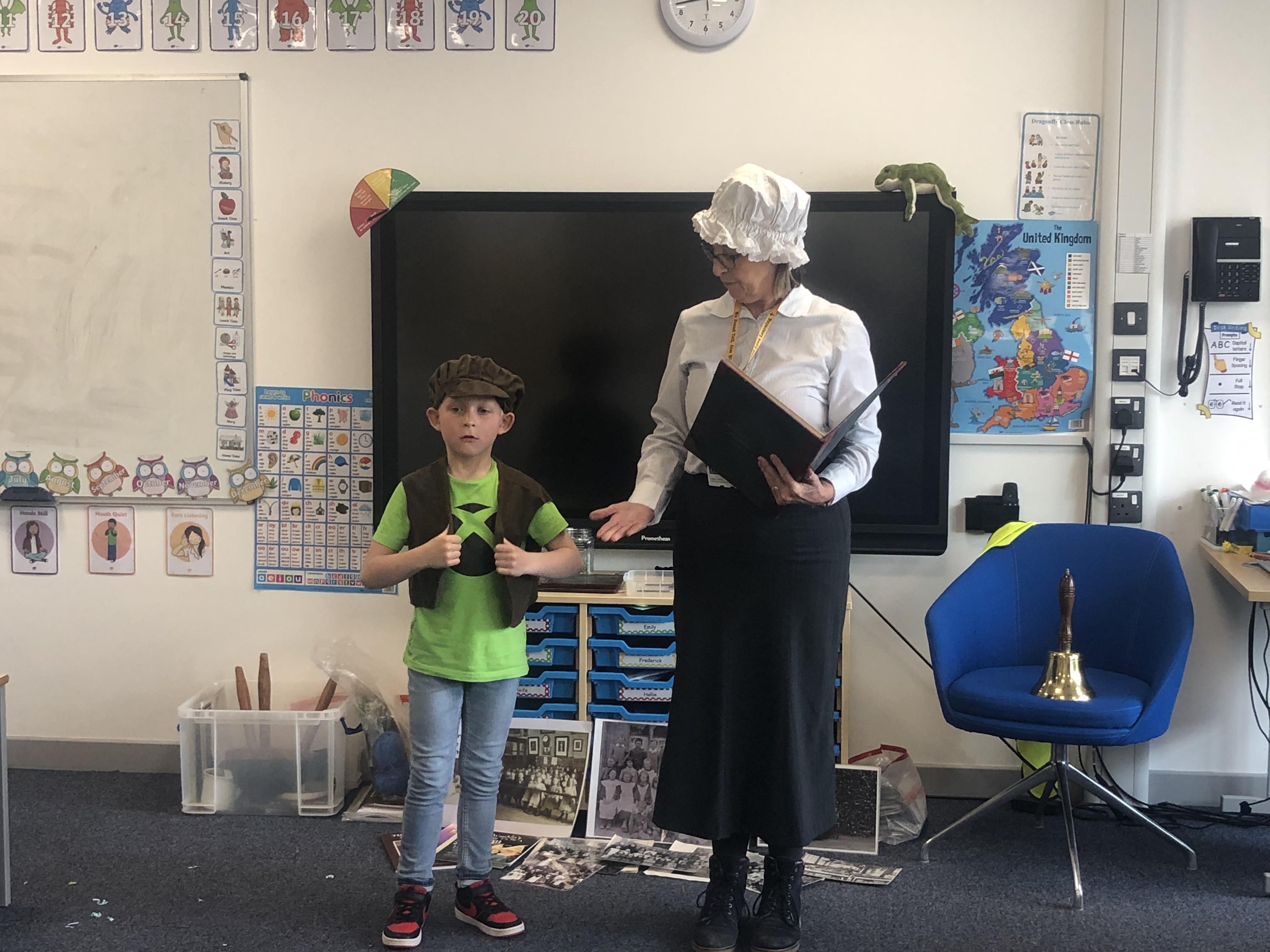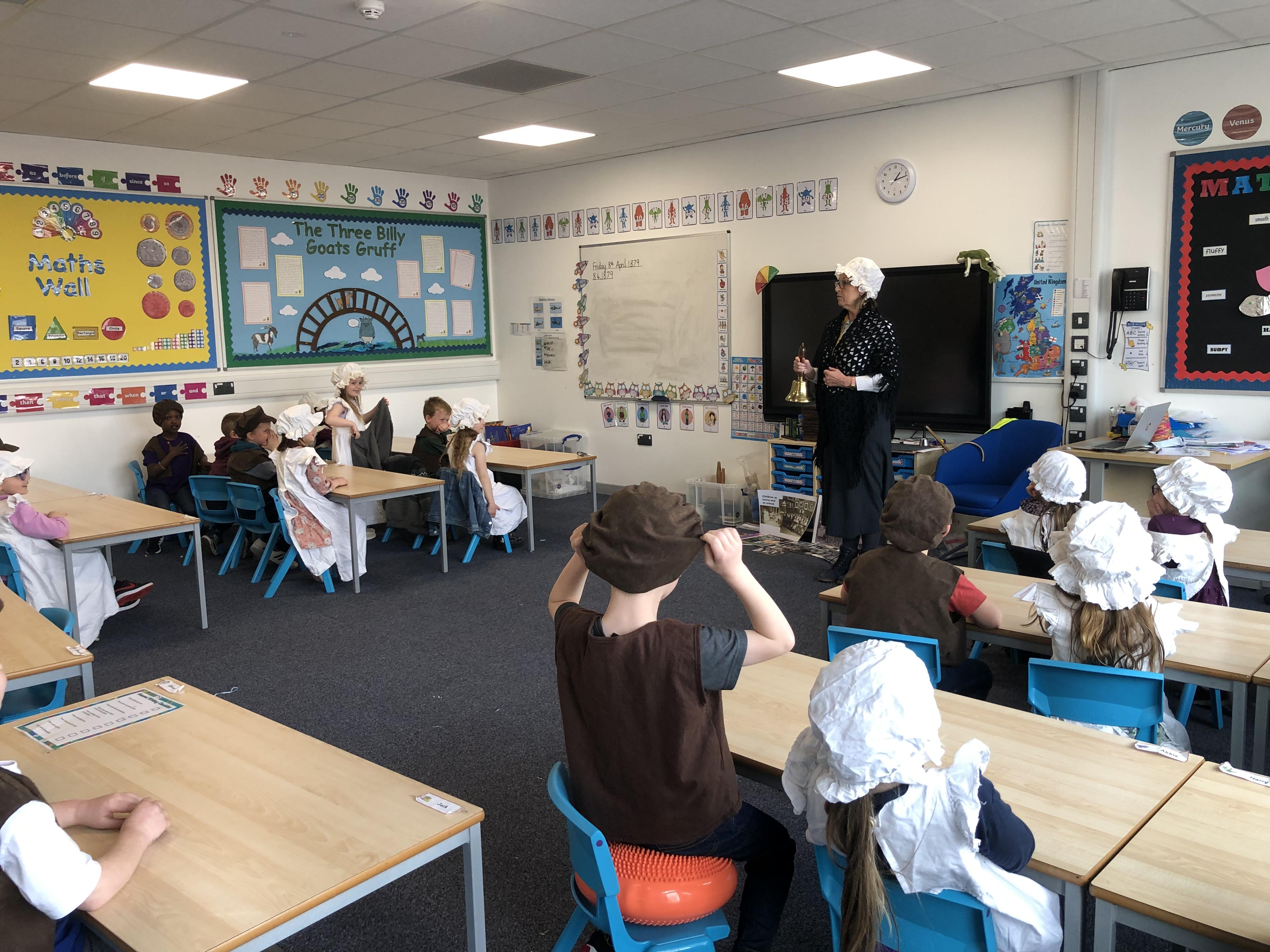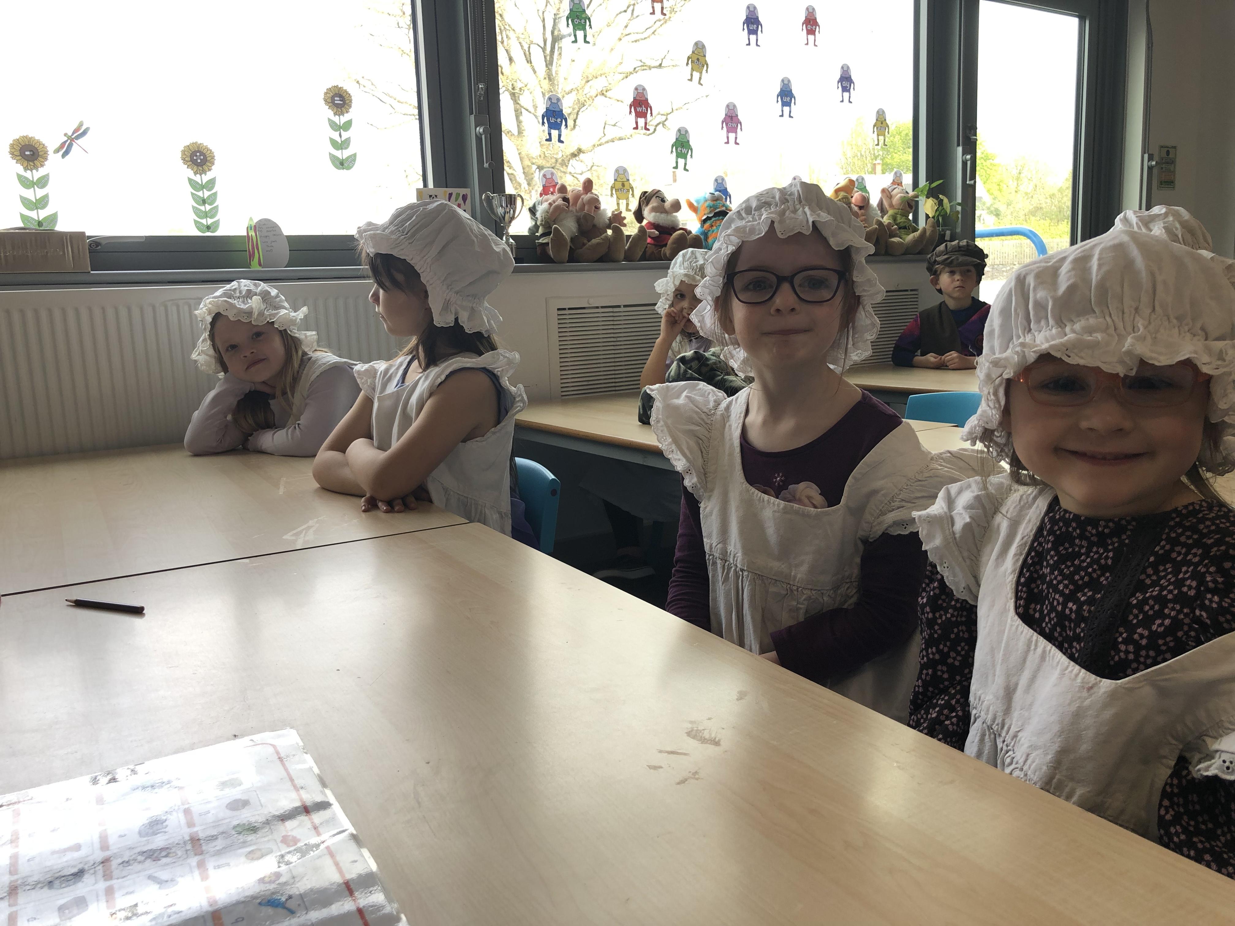 This afternoon, the children were very lucky to have a visit from Sharon from the South West Heritage Trust. She gave the children a glimpse of what school was like for Victorian children. All the children were given the opportunity to dress up as a Victorian school child; a waistcoat and cap for the boys and a dress and bonnet for the girls. The boys and girls were split up in class, just like what happened in Victorian schools and they were able to try out writing on slates. Everyone also had a go at sewing and practising handwriting. Sharon very kindly showed the children a range of Victorian artefacts. It was a really fun afternoon with the children super engaged throughout. It goes without saying that they are all very happy that school life has advanced since the Victorian times.