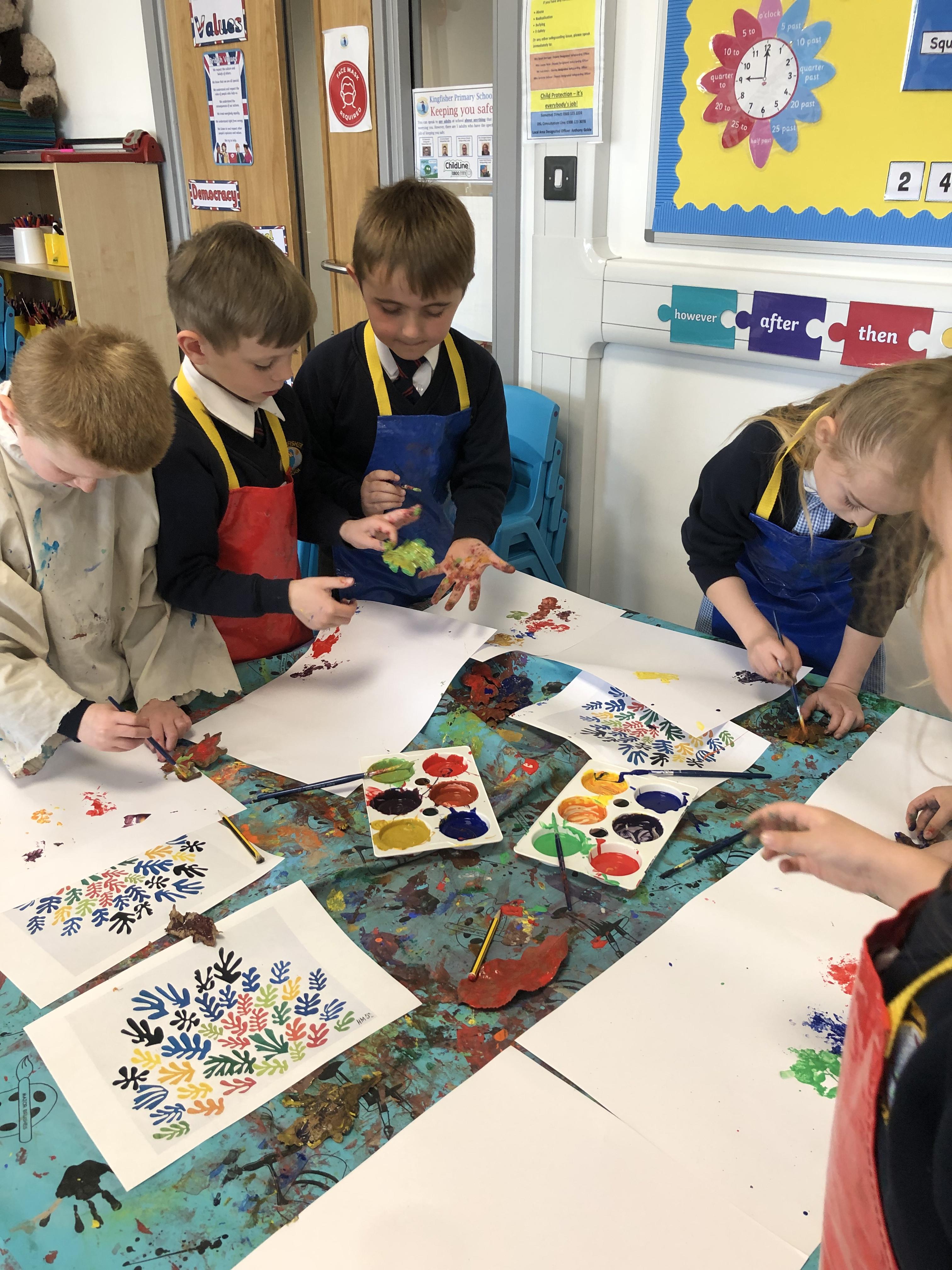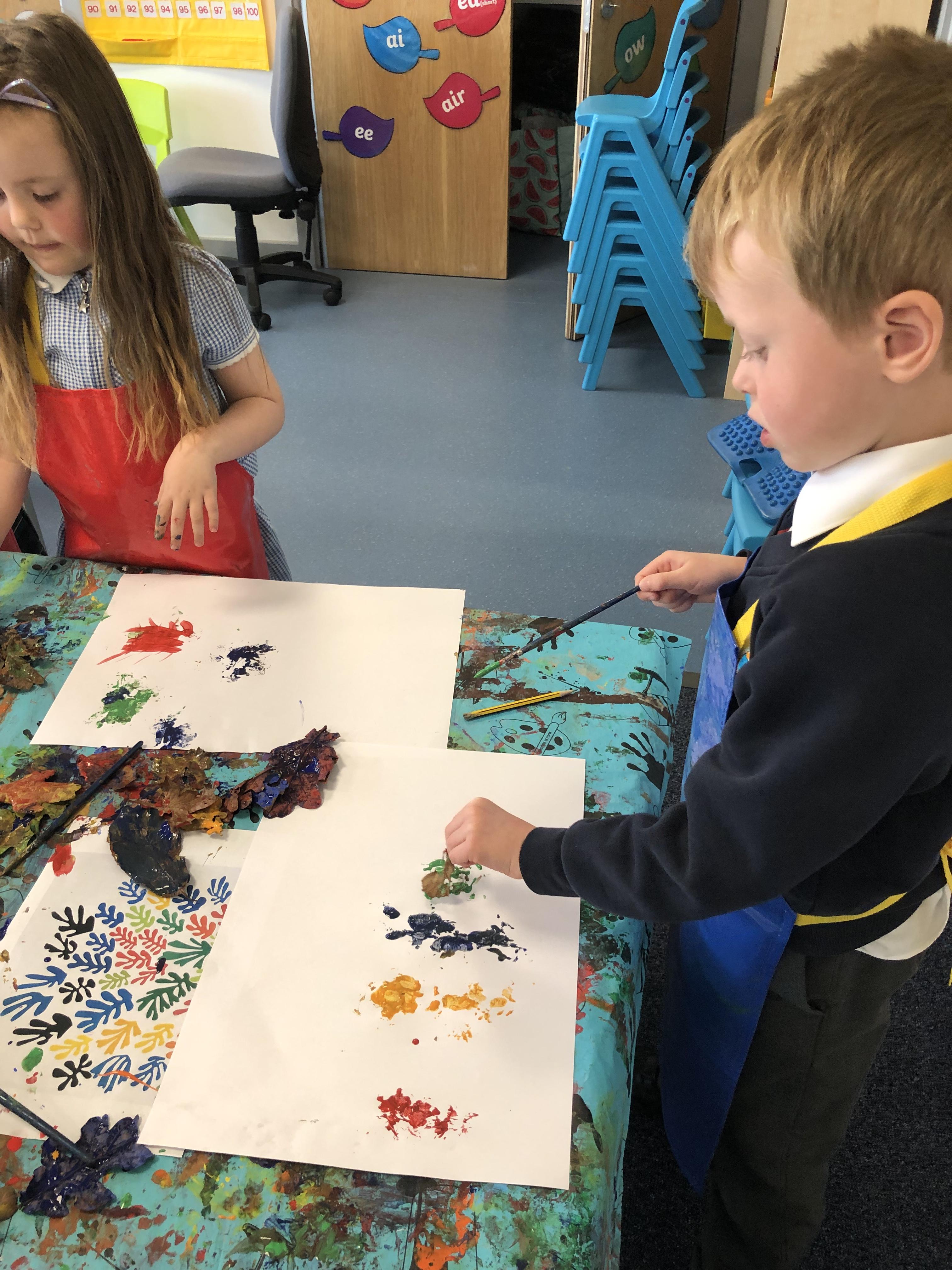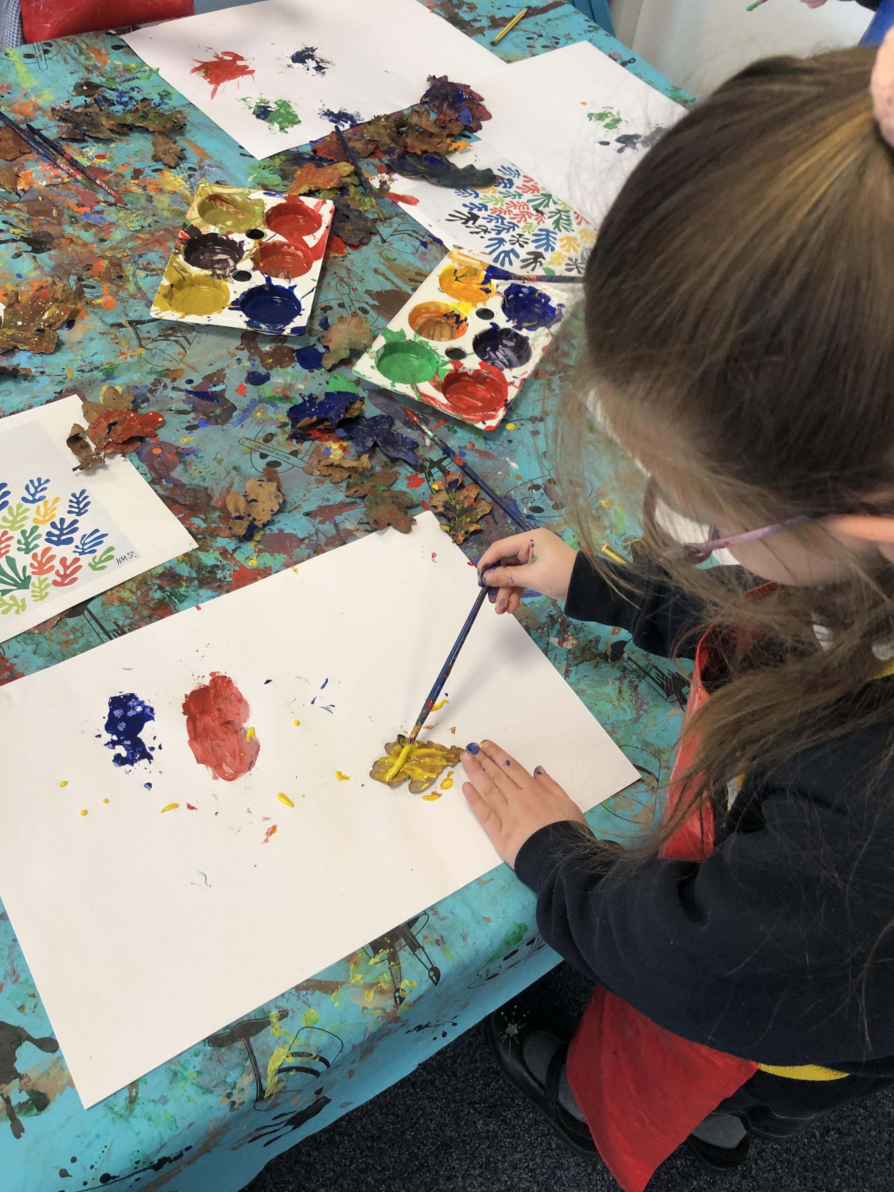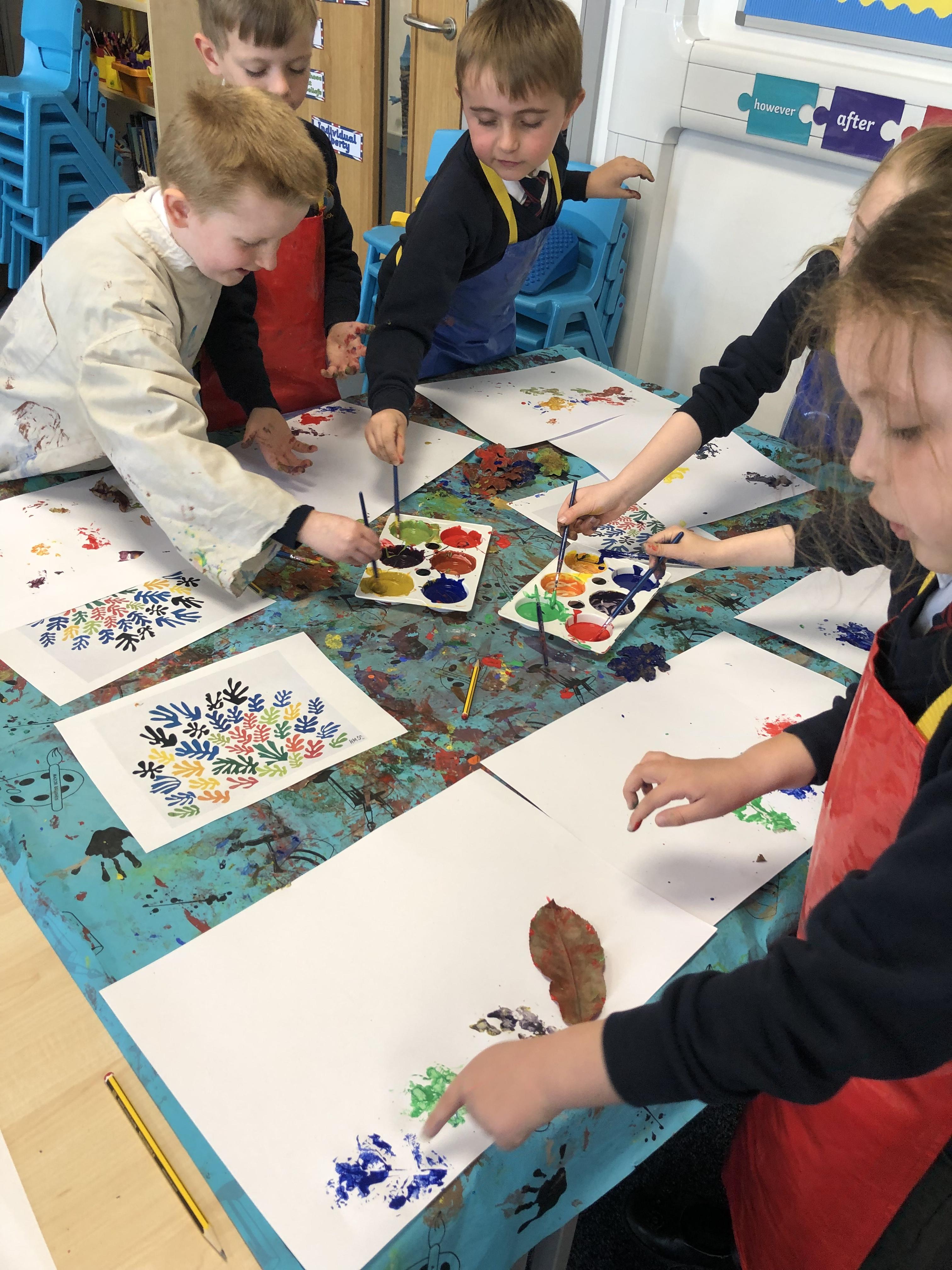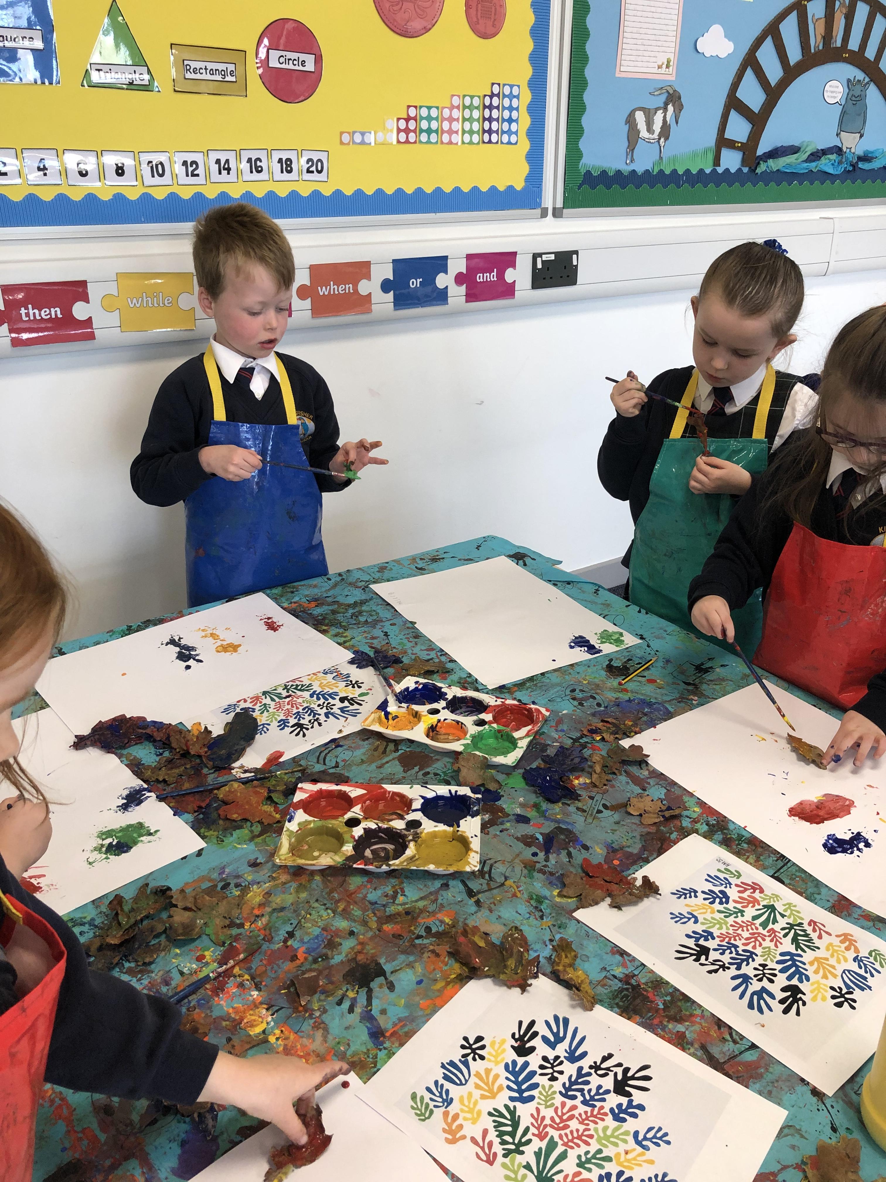 In Art this term we have been exploring printing and mark making. For our final piece, the children used Matisse’s ‘La Gerbe’ creation as inspiration to make their own picture. They applied their printing skills using leaves found on campus and various different colours of paint. It was great to see the children so focussed and enjoying being creative.
