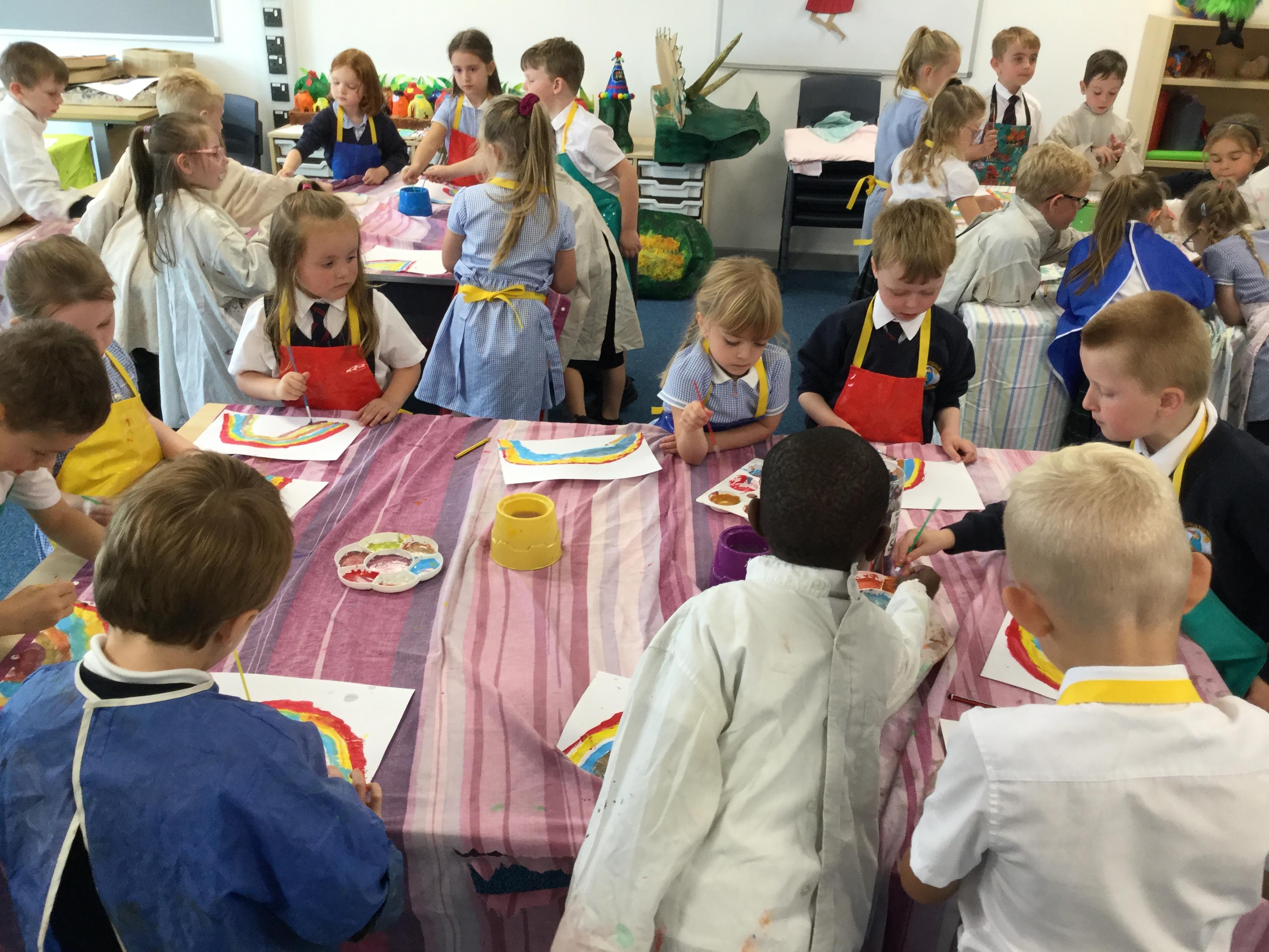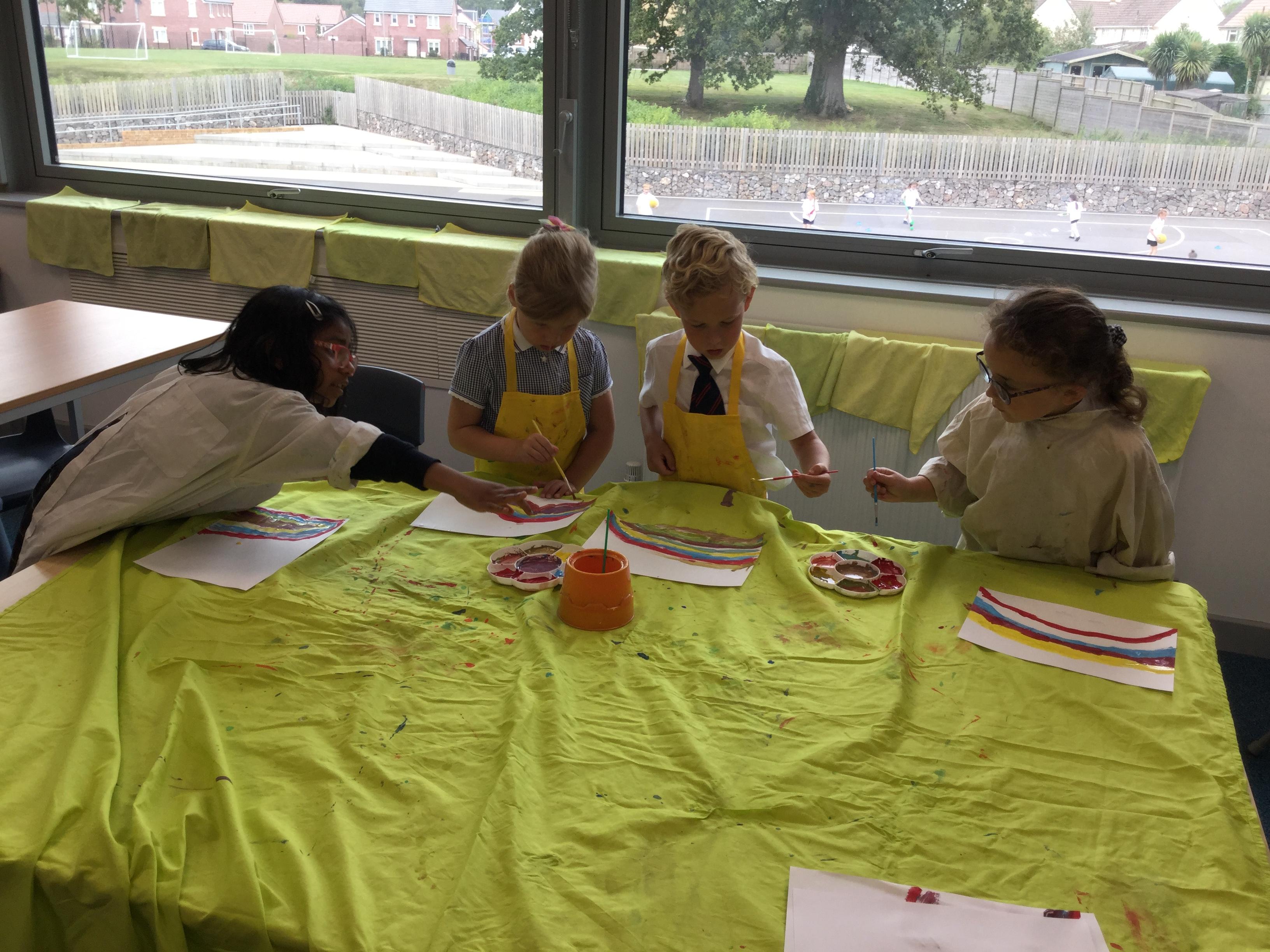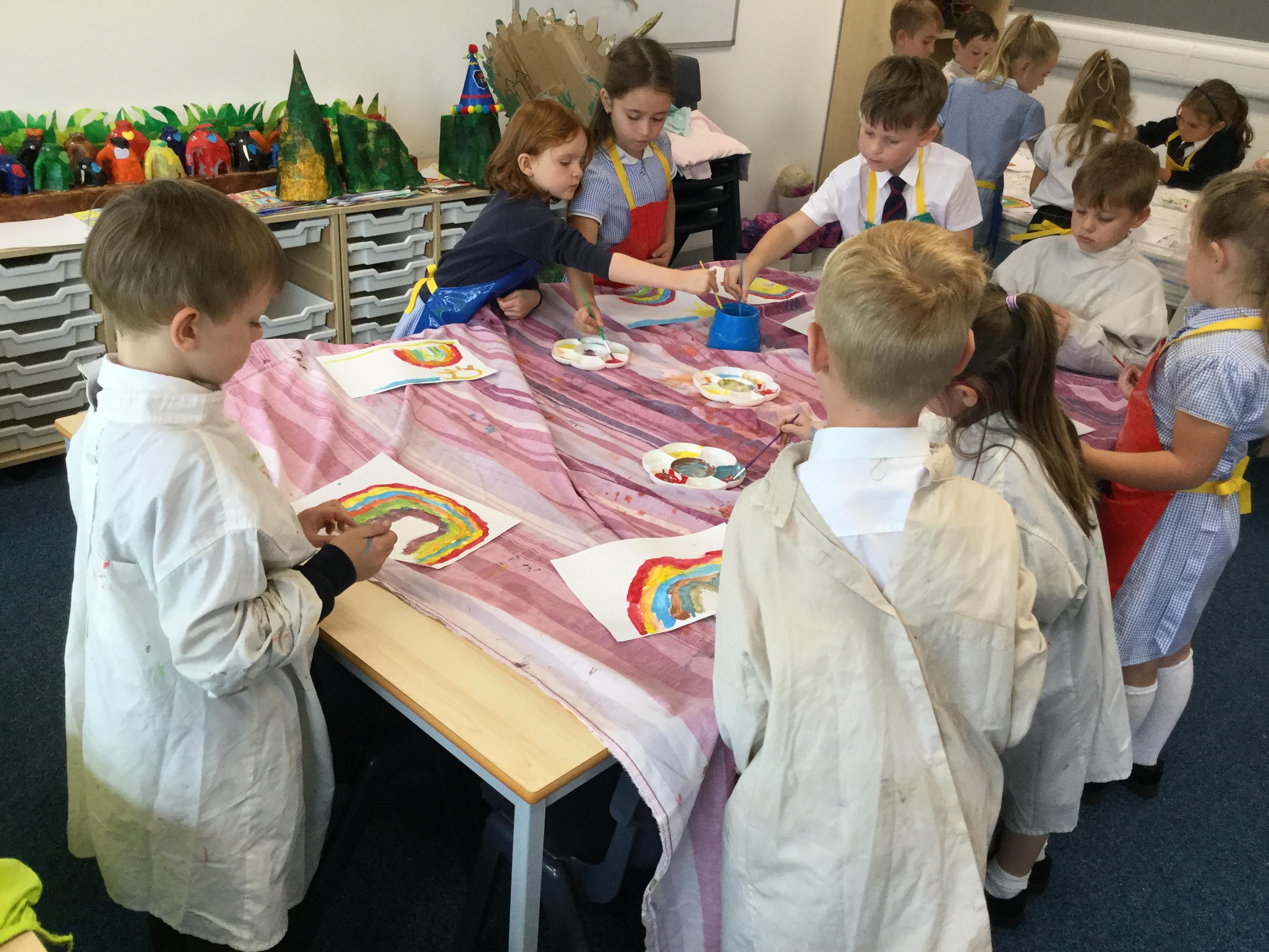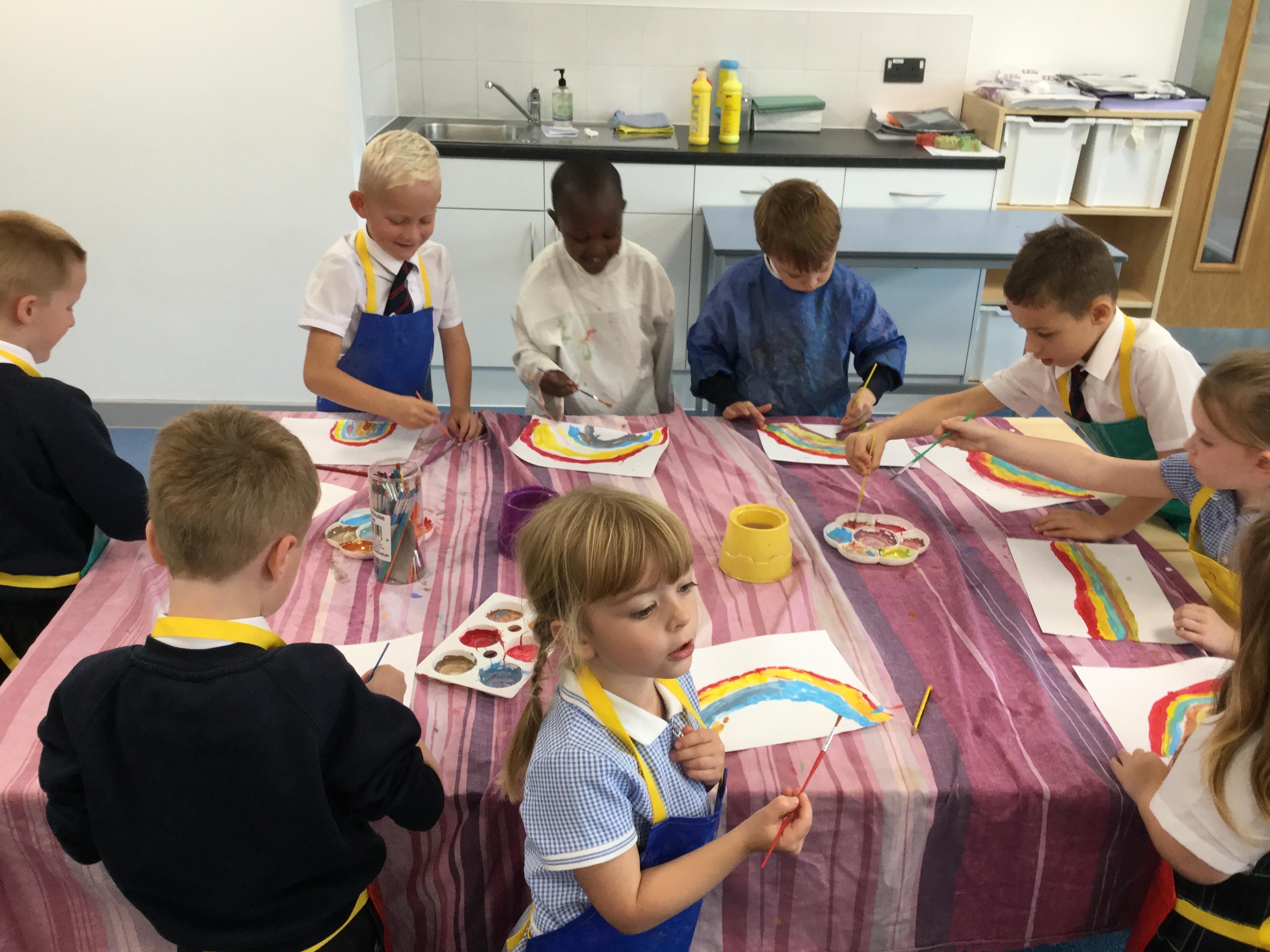 In Art today the children were exploring colour. They were all tasked with creating a rainbow with paint, only using the three primary colours. It is safe to say they all had a lot of fun mixing the different colours and I am sure you will agree, the end results were beautiful.