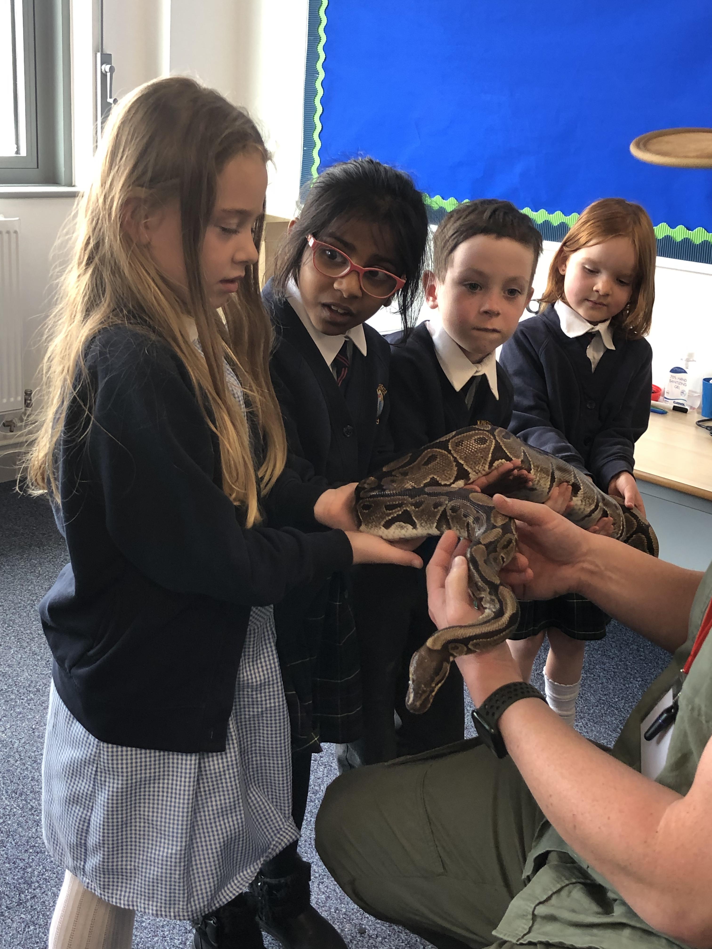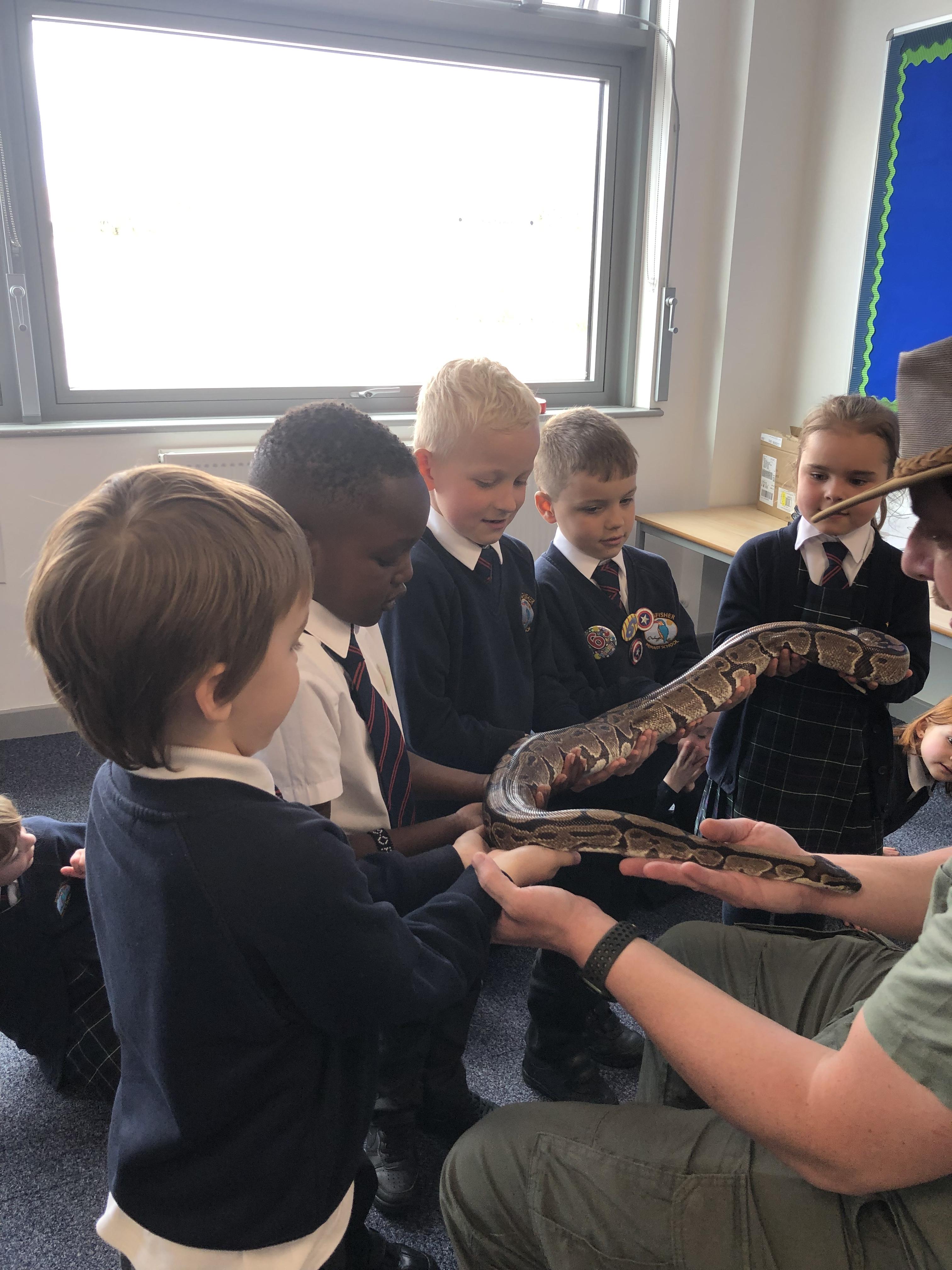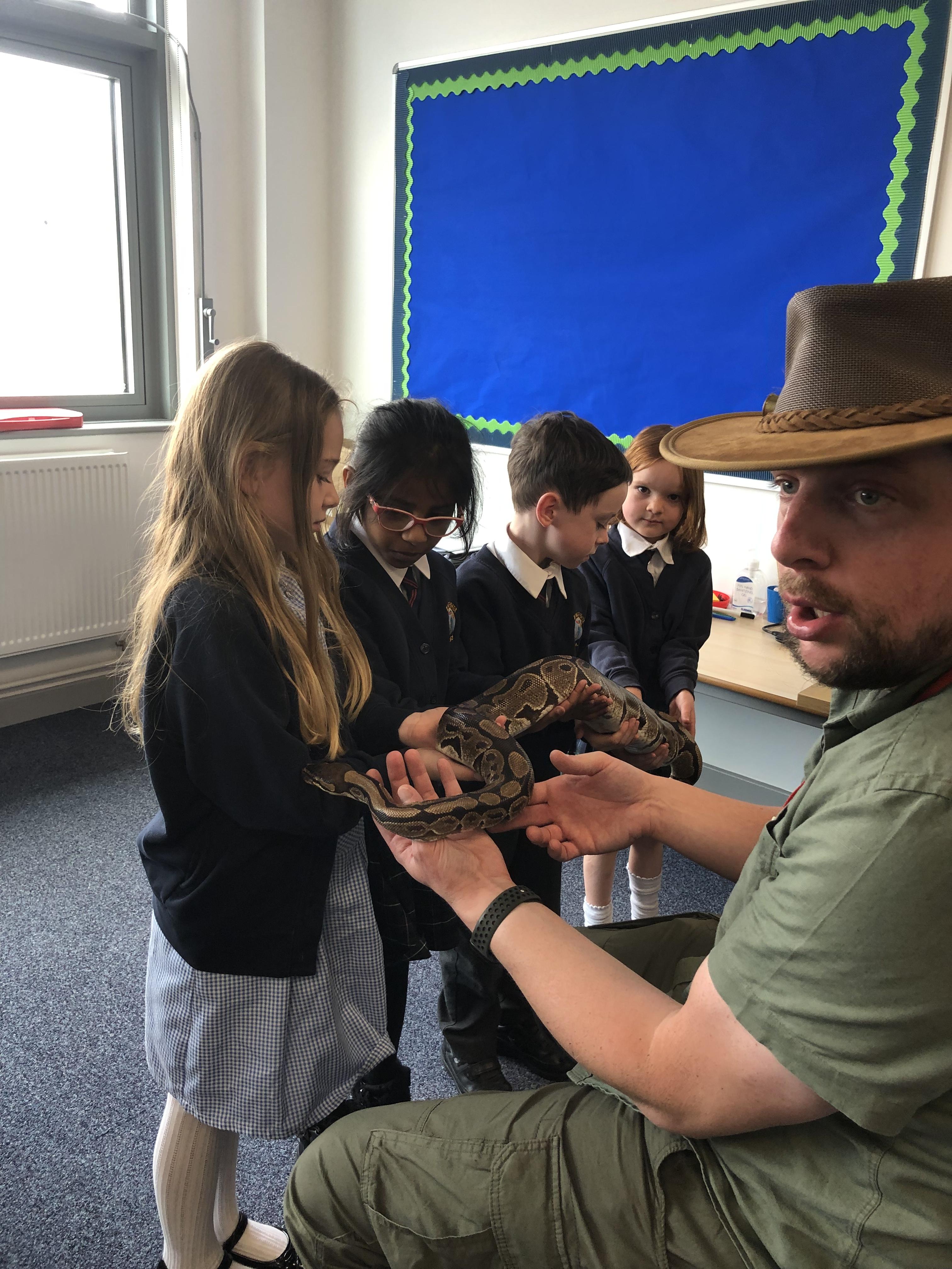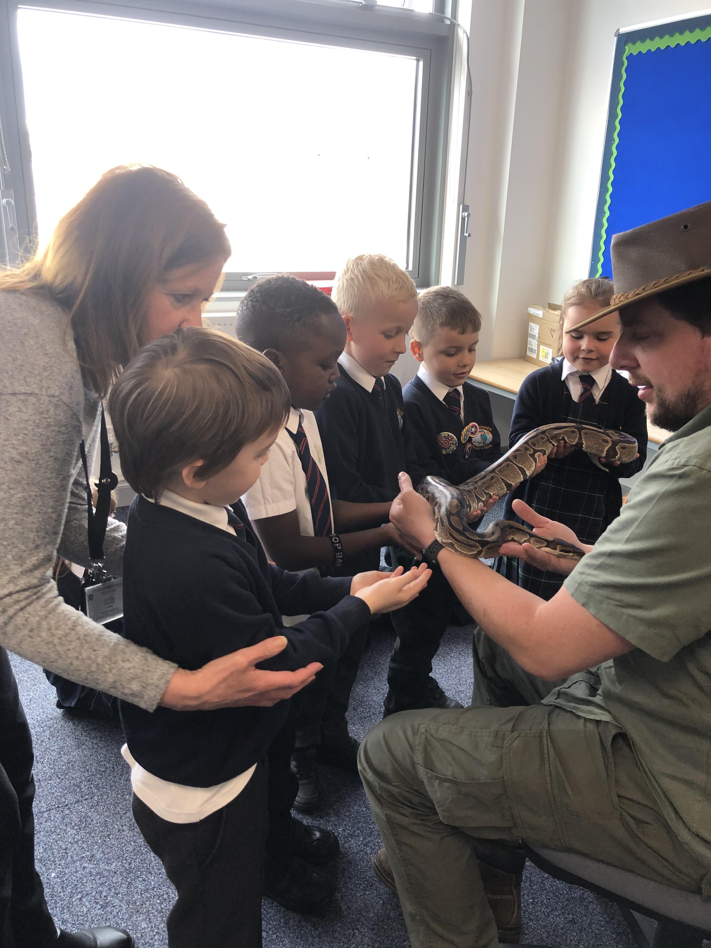 Today, we were super lucky to have a visit from the ‘Animal Man’ and his lovely animal friends. The children were so excited to be able to learn lots of interesting things about the animals and get up close and personal with them. I was amazed by how many children wanted to hold the snake and how brave they were when doing so!