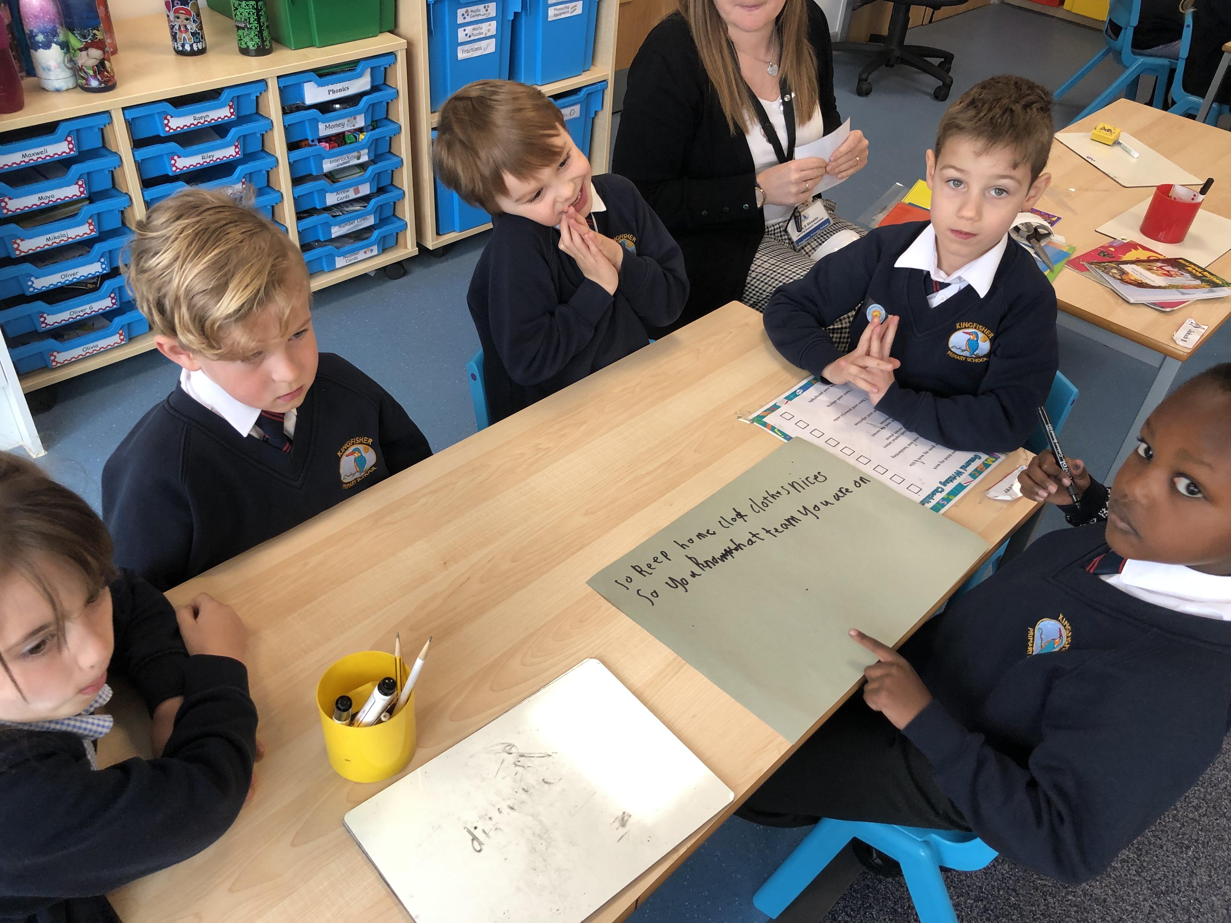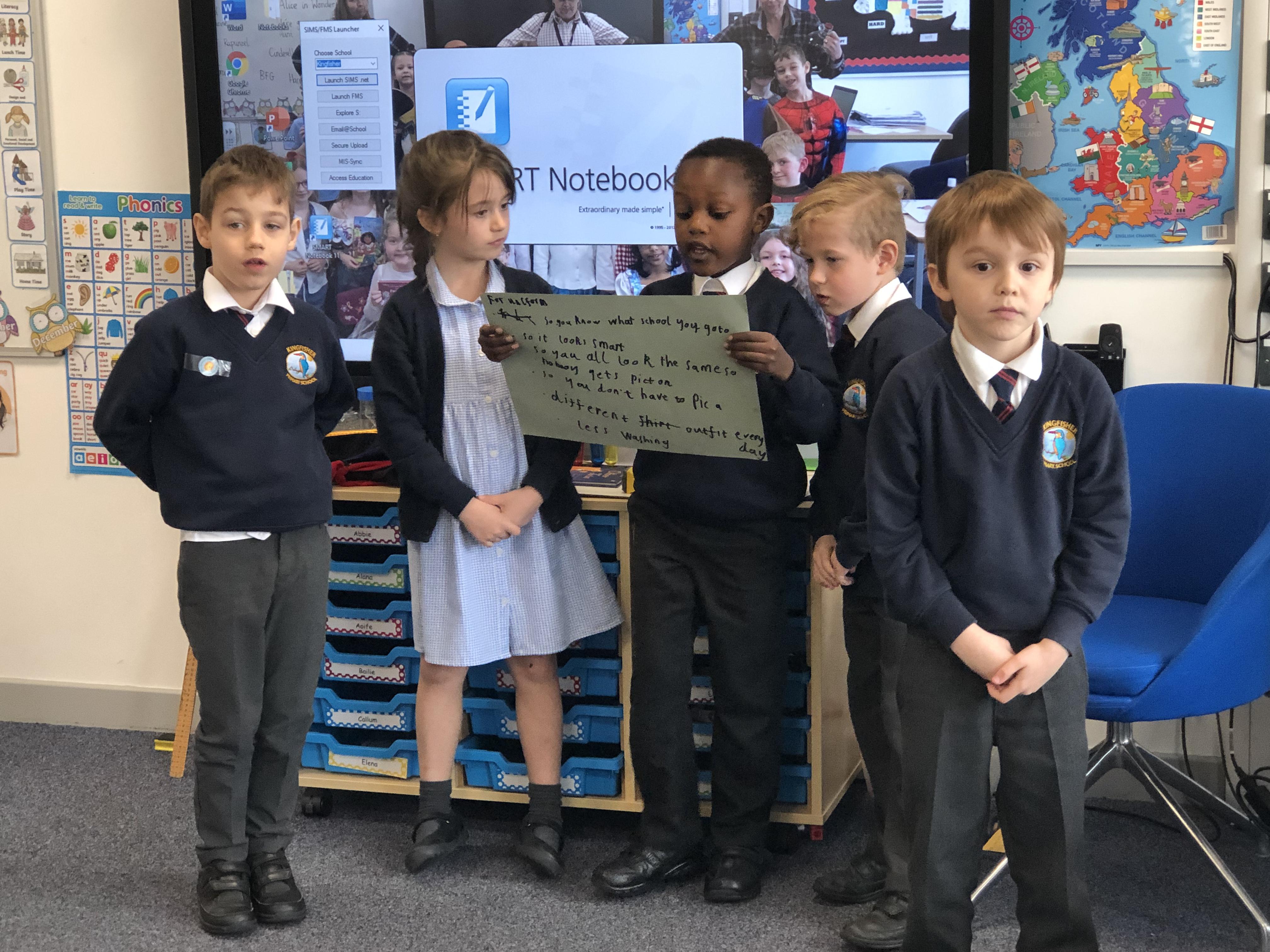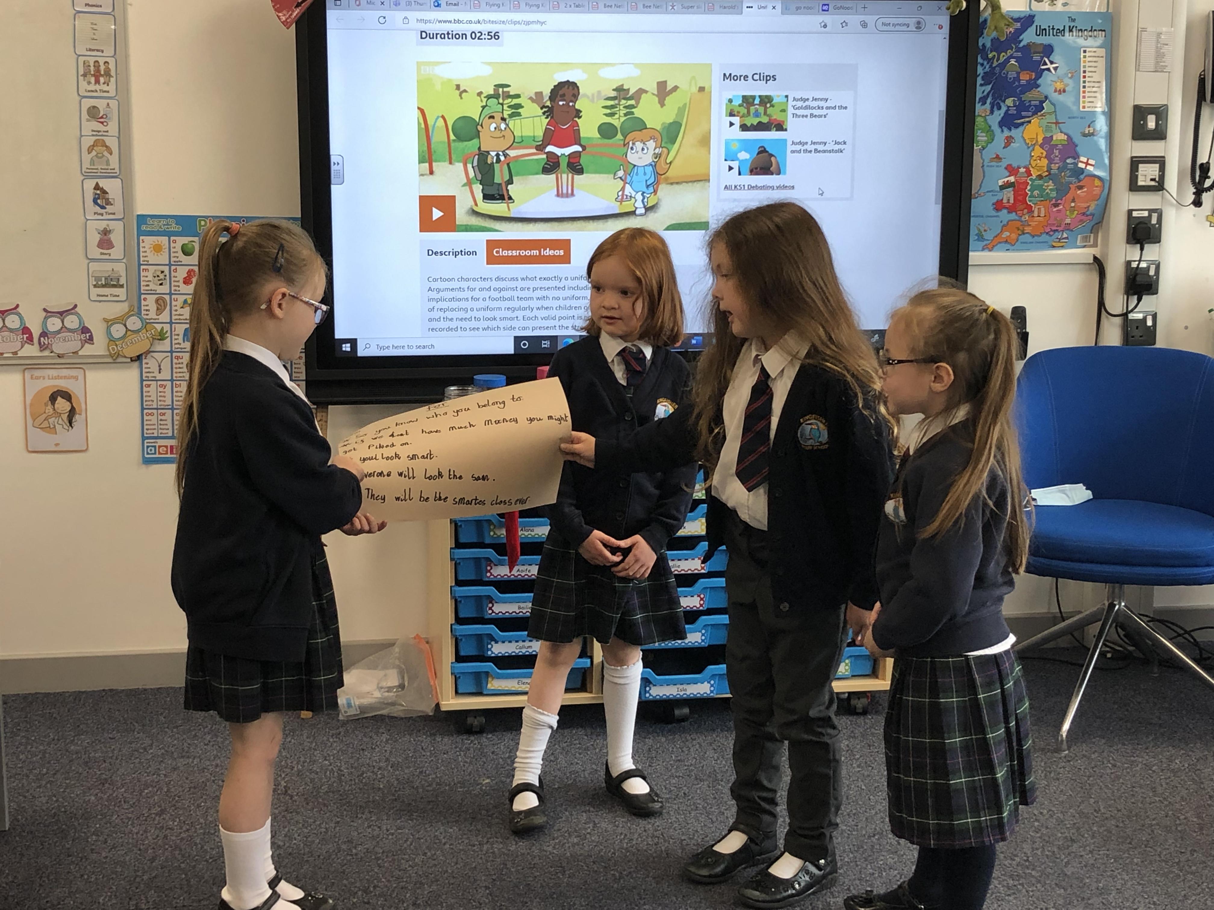 In English this week, the children have been working on their debating skills. Today, the children worked in groups to formulate arguments as to whether children should or should not have to wear uniform to school. They all demonstrated fantastic team-work and collaboration and were very persuasive with their arguments when presenting their ideas to the rest of the class.