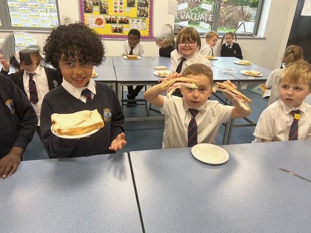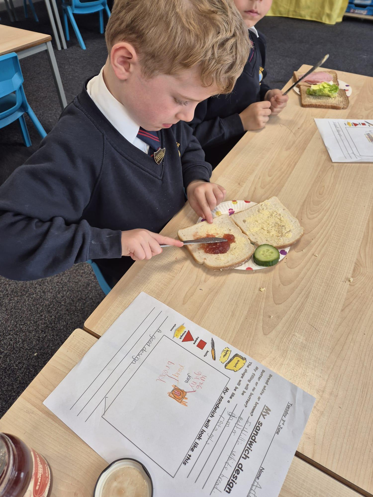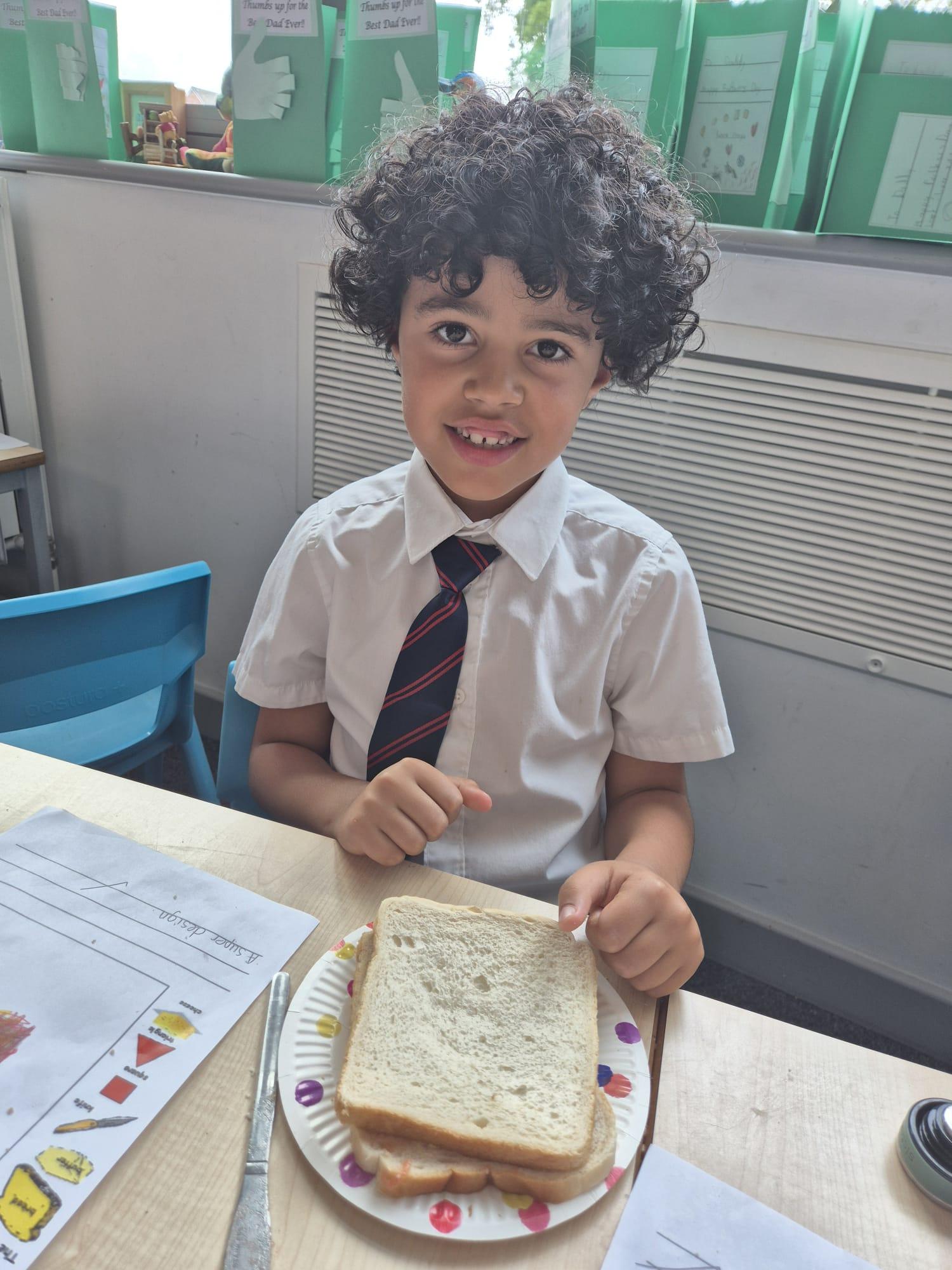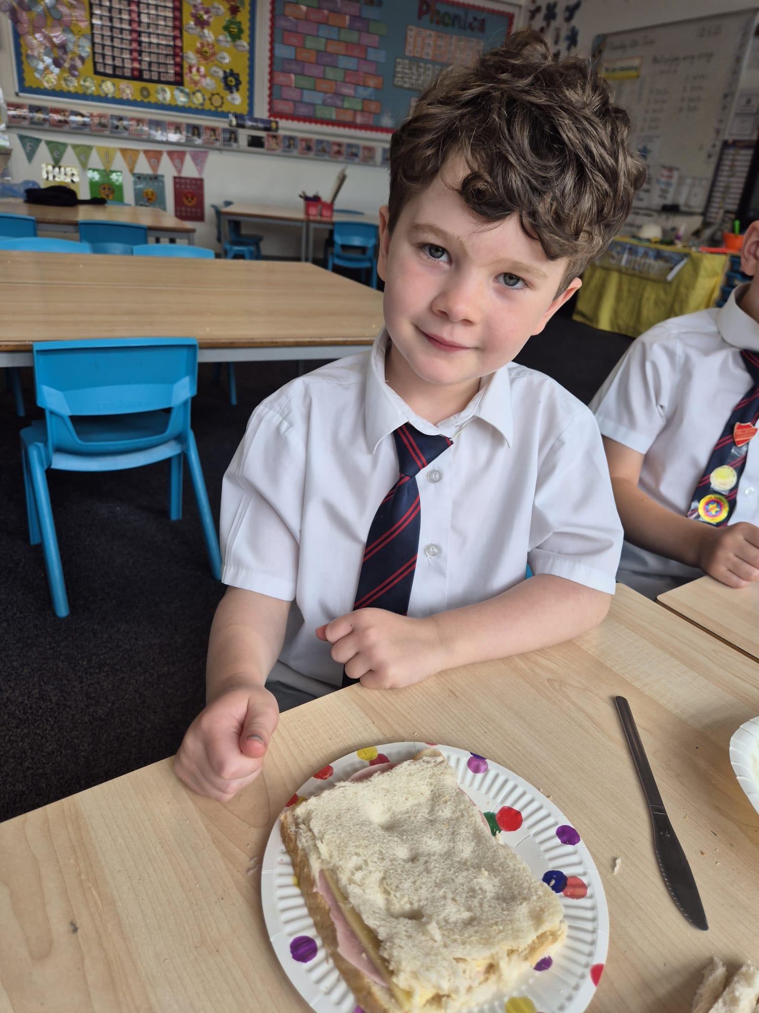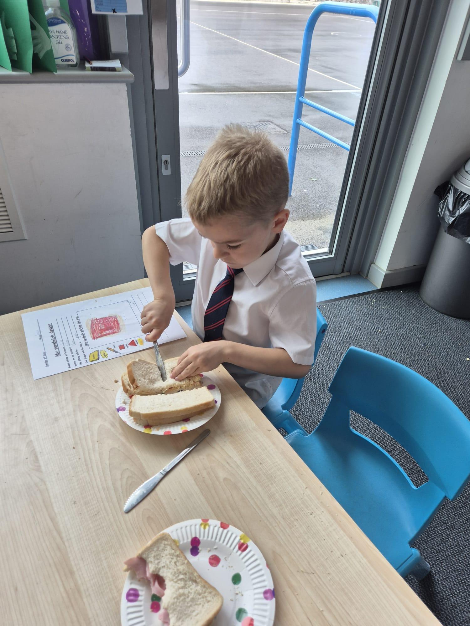 The class have been reading The Disgusting Sandwich this week, and have been completing various pieces of work about it. So, we thought it would be fun to make our own sandwiches but wthout the 'disgusting' fillings! The children could chose either jam, cheese or ham.