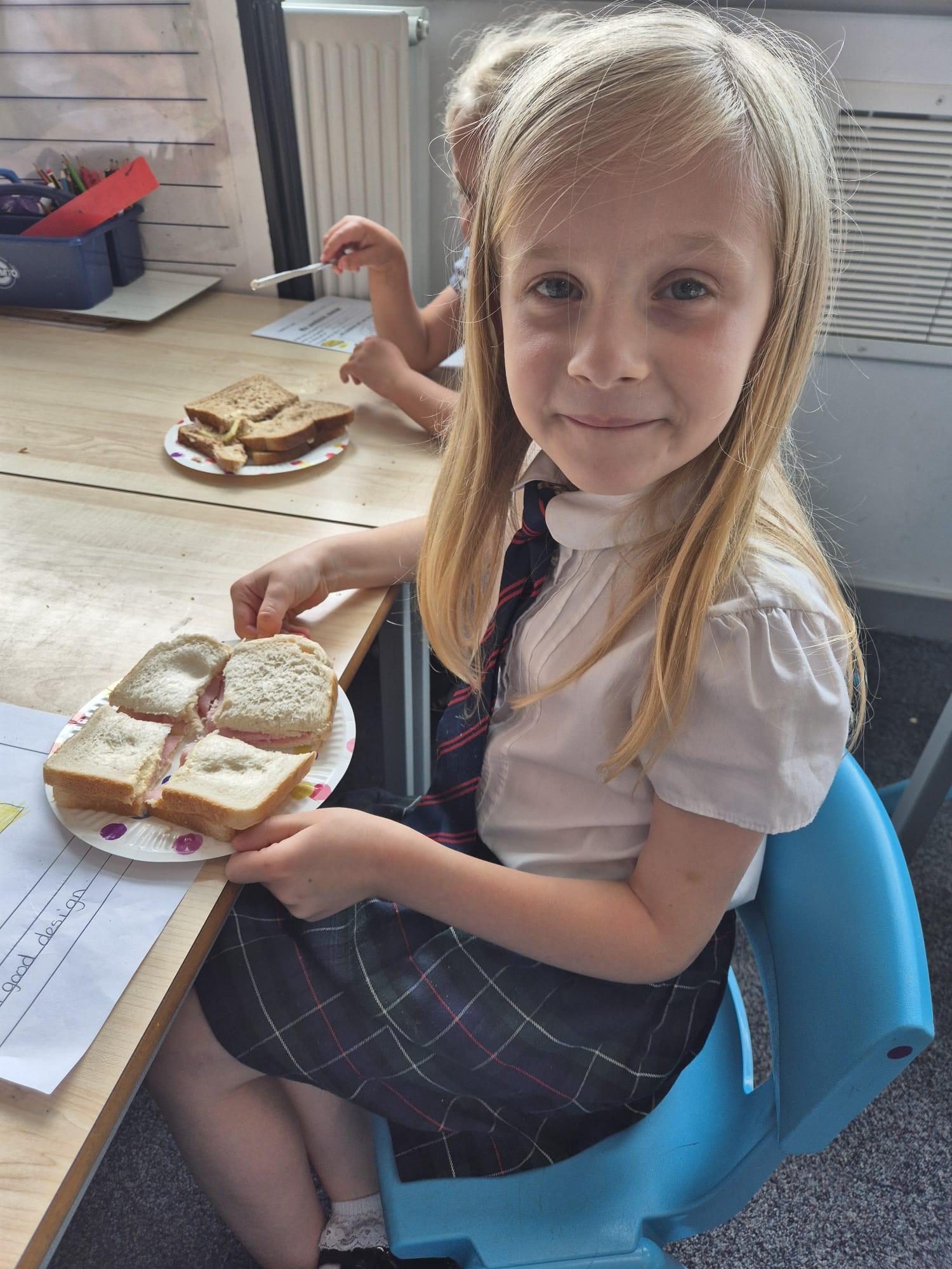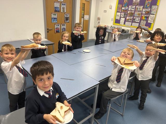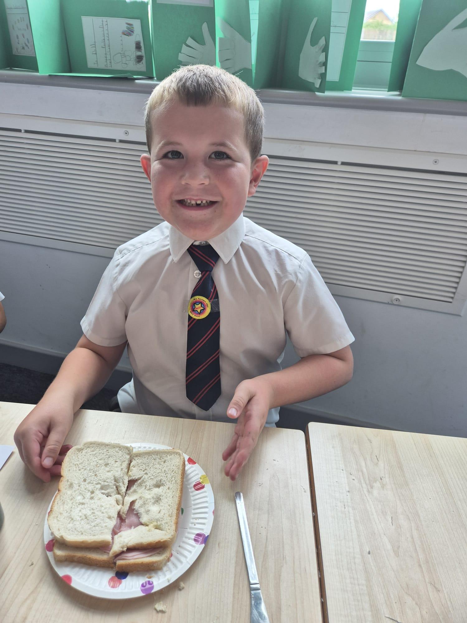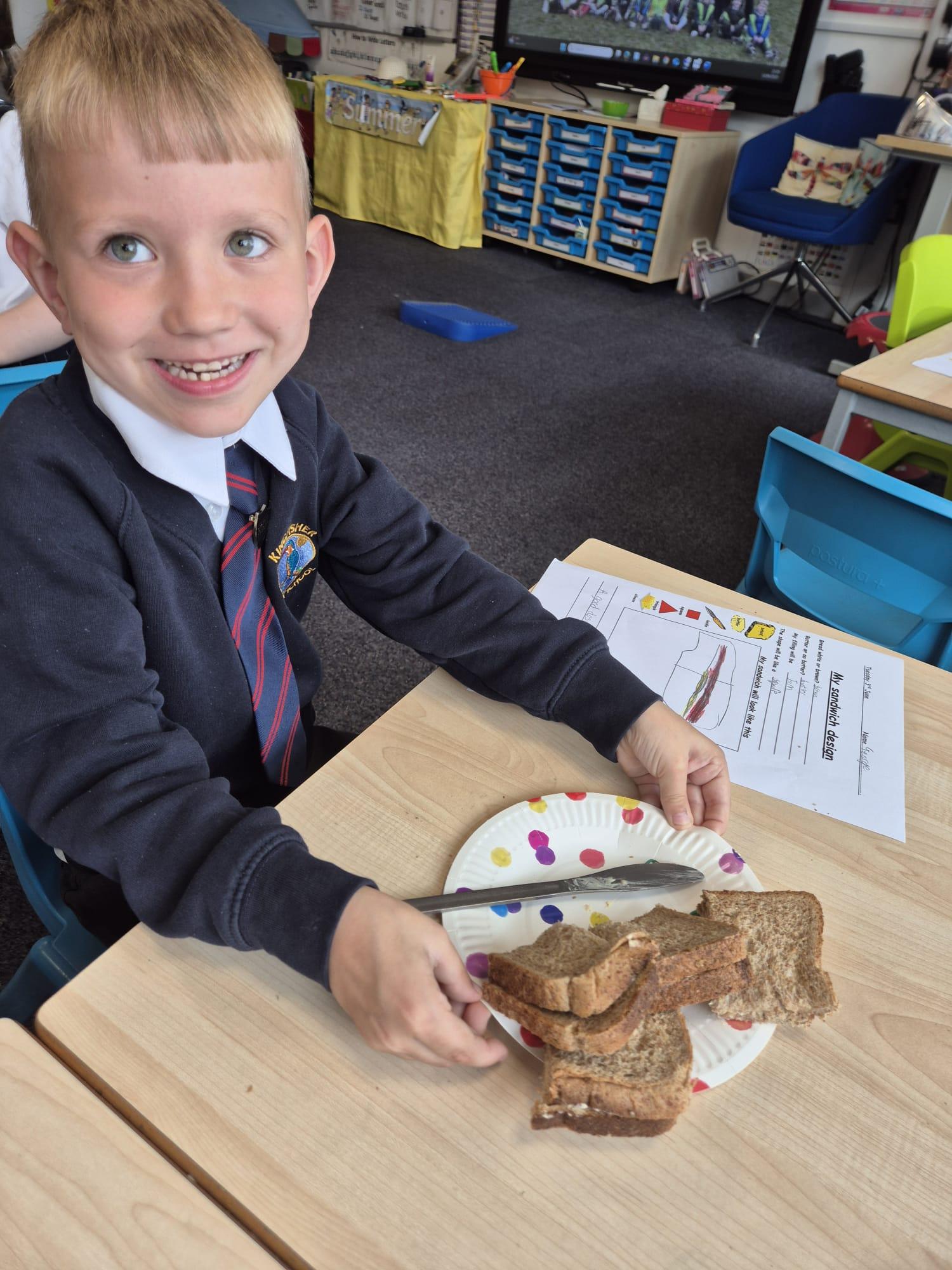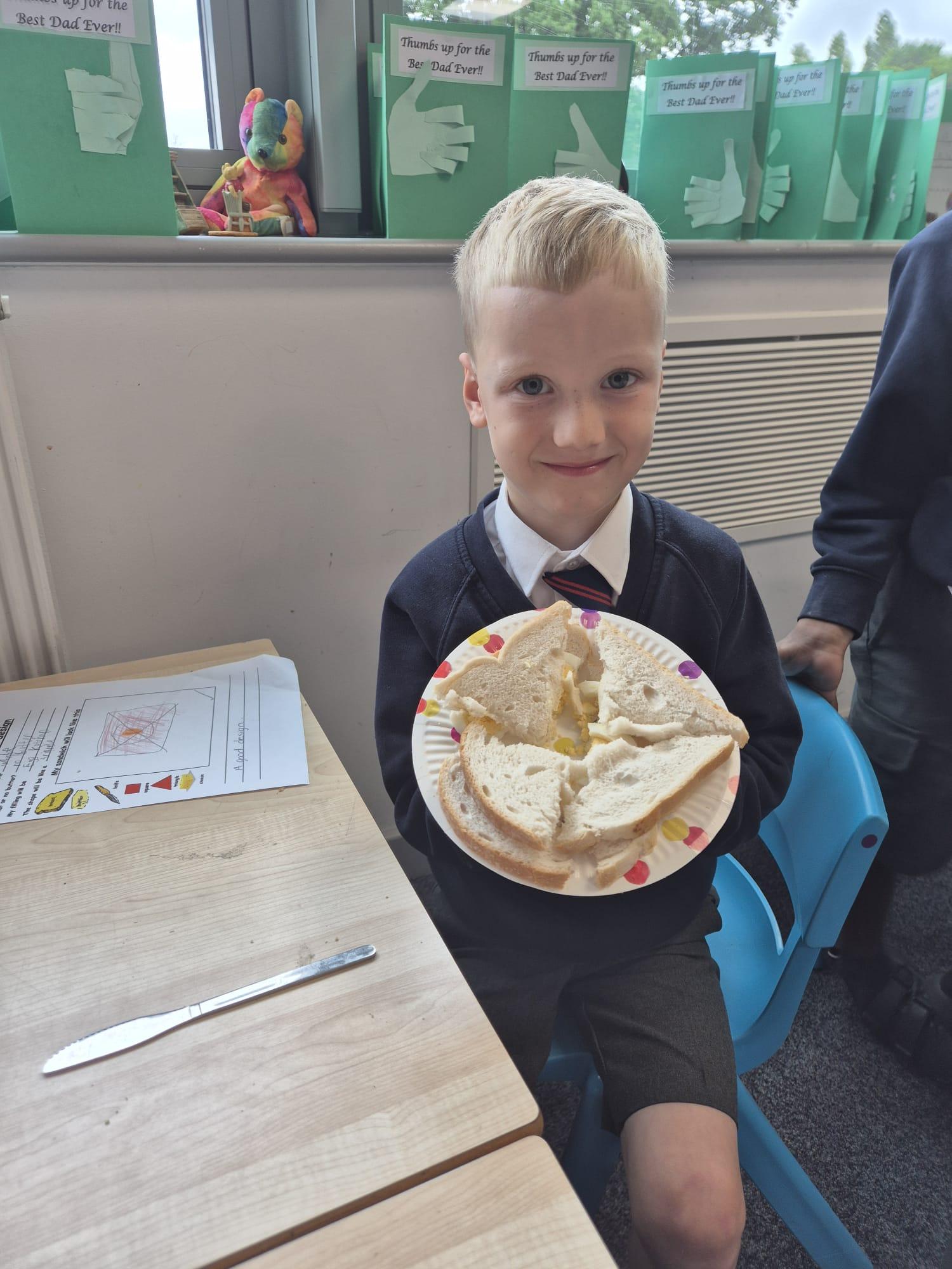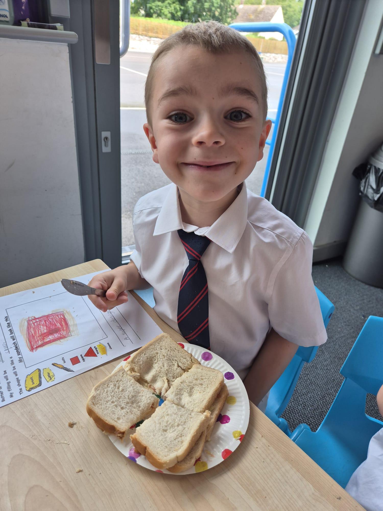 The class have been reading The Disgusting Sandwich this week, and have been completing various pieces of work about it. So, we thought it would be fun to make our own sandwiches but wthout the 'disgusting' fillings! The children could chose either jam, cheese or ham.