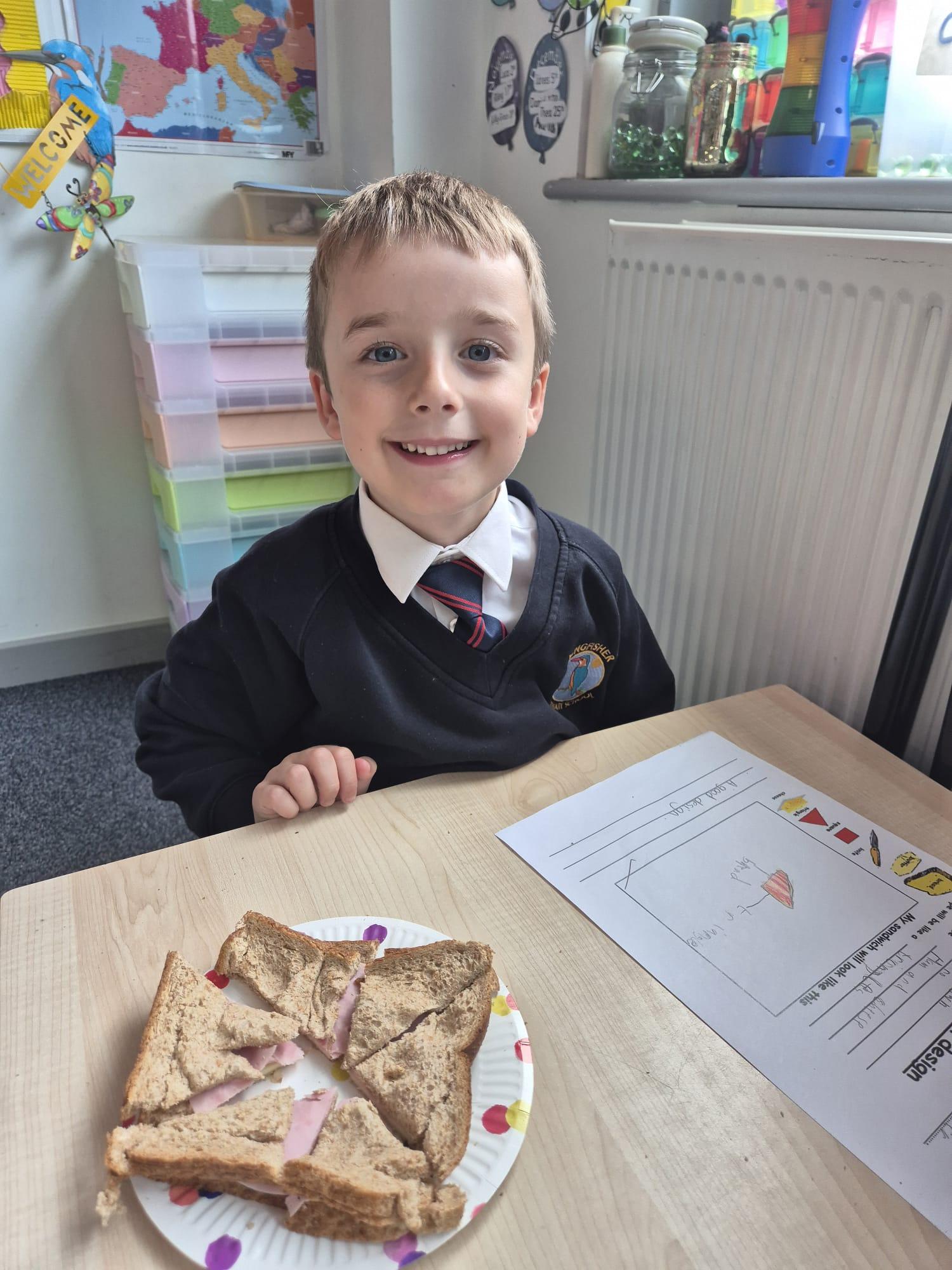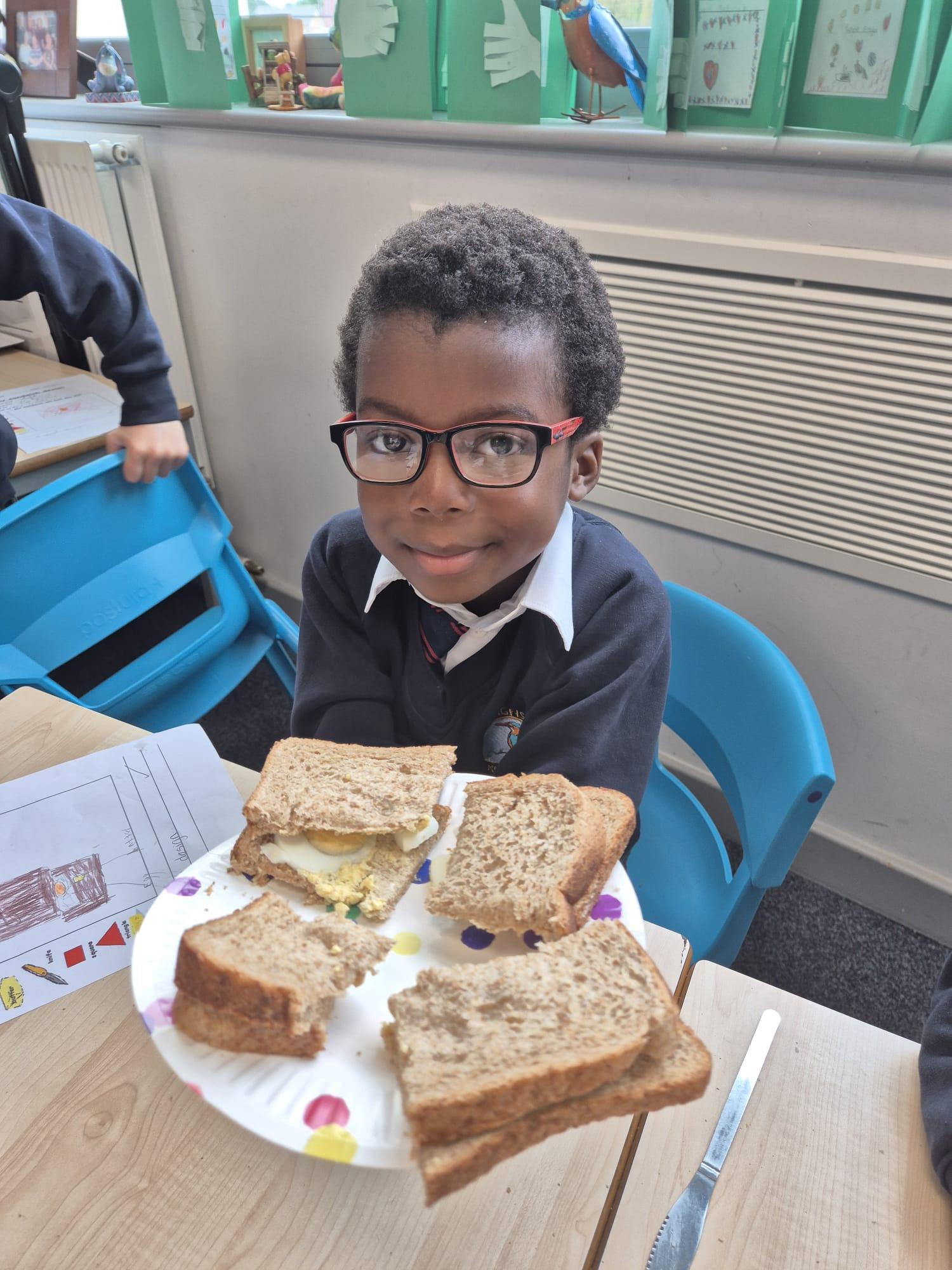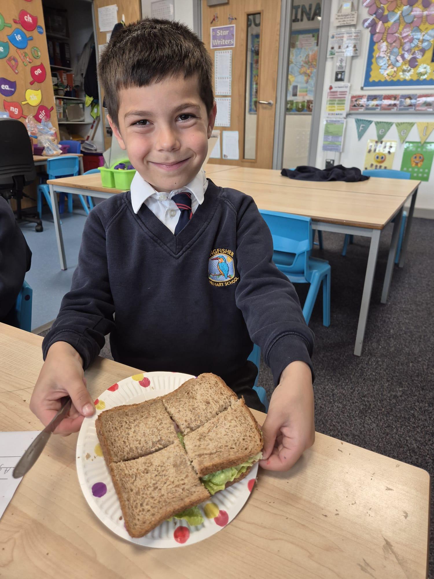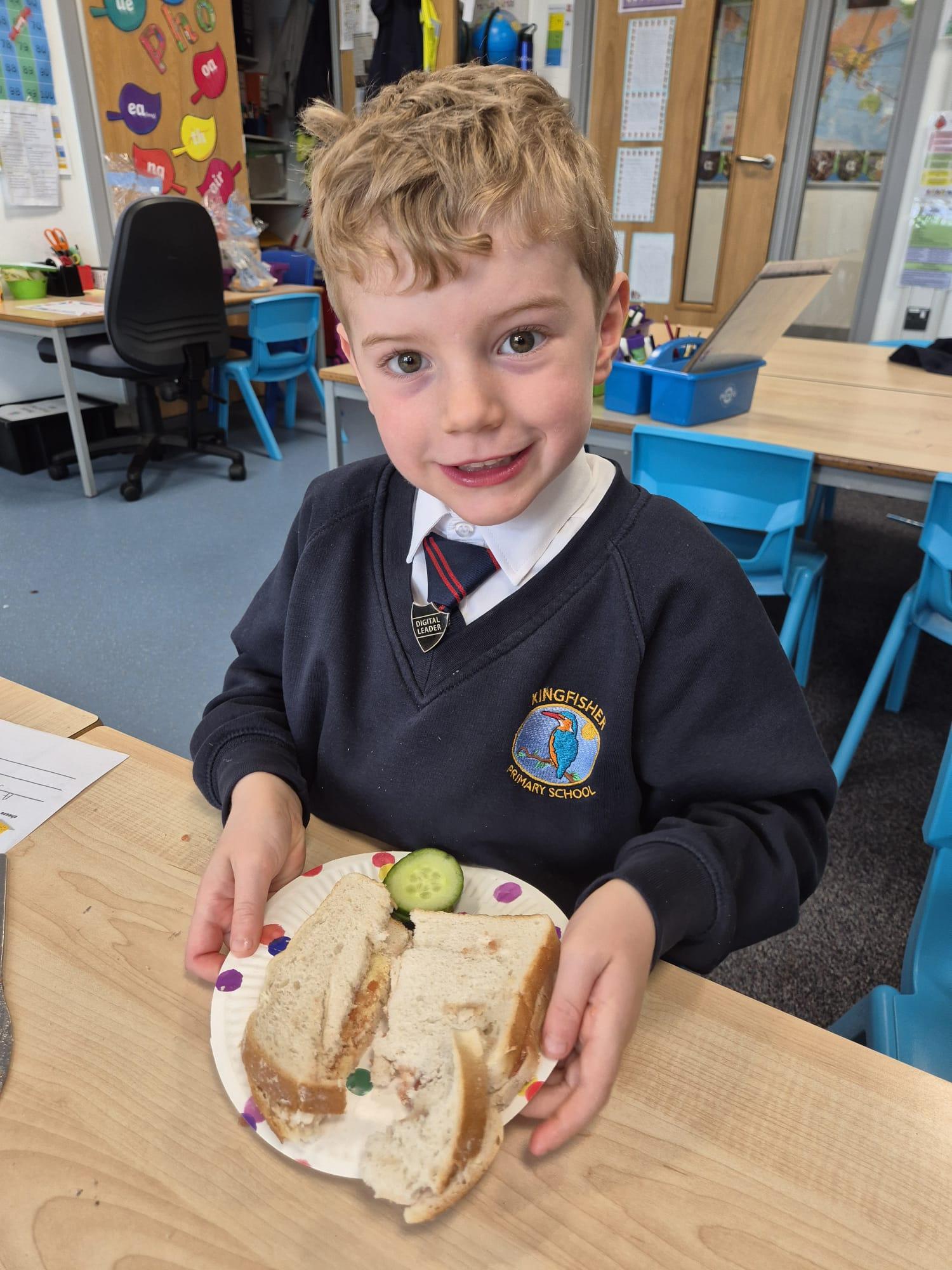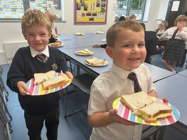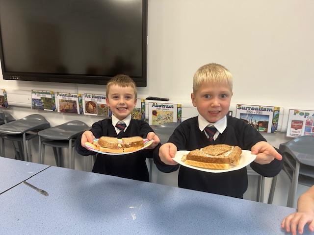 The class have been reading The Disgusting Sandwich this week, and have been completing various pieces of work about it. So, we thought it would be fun to make our own sandwiches but wthout the 'disgusting' fillings! The children could chose either jam, cheese or ham.