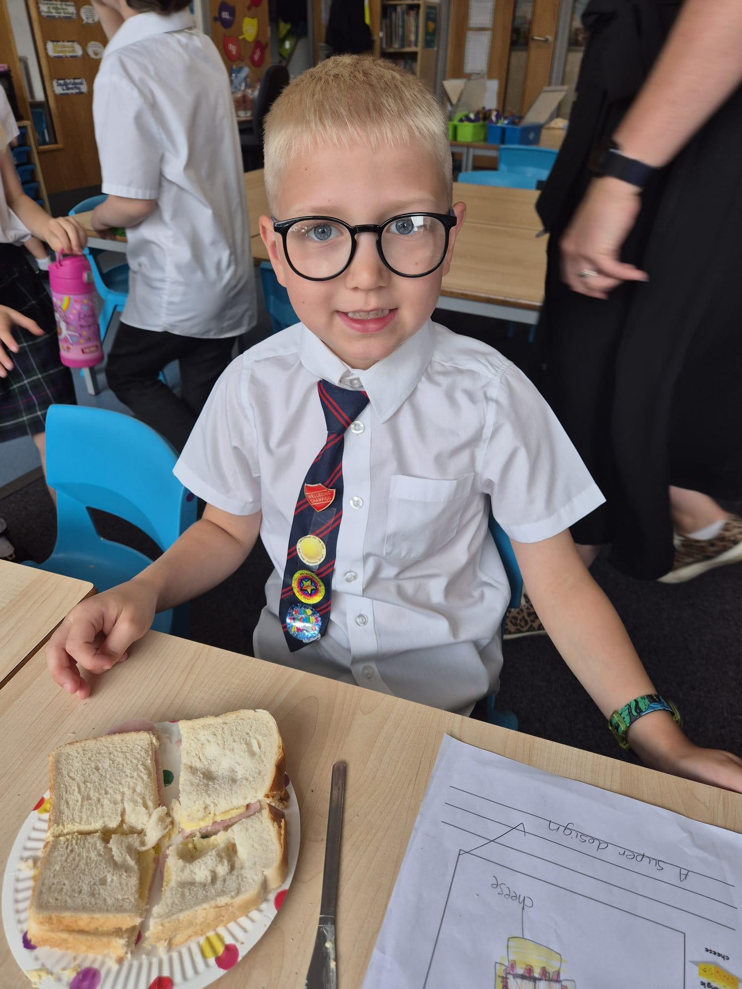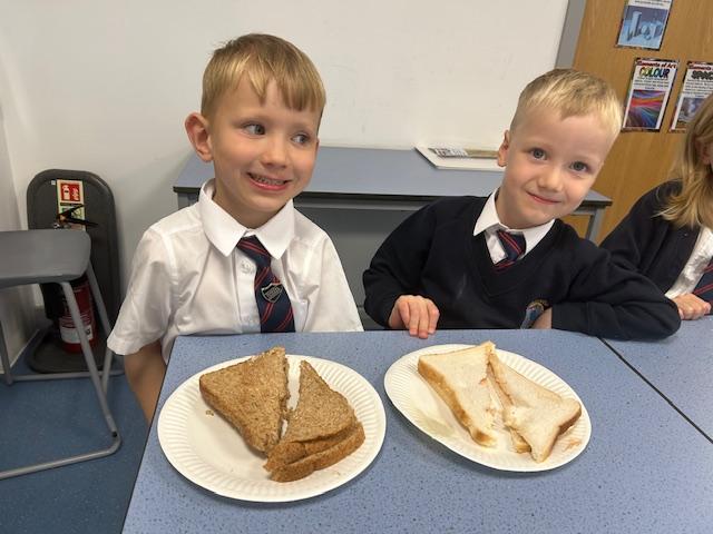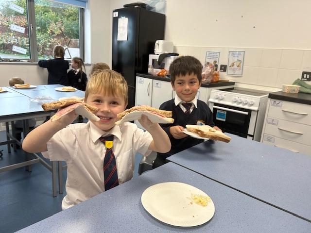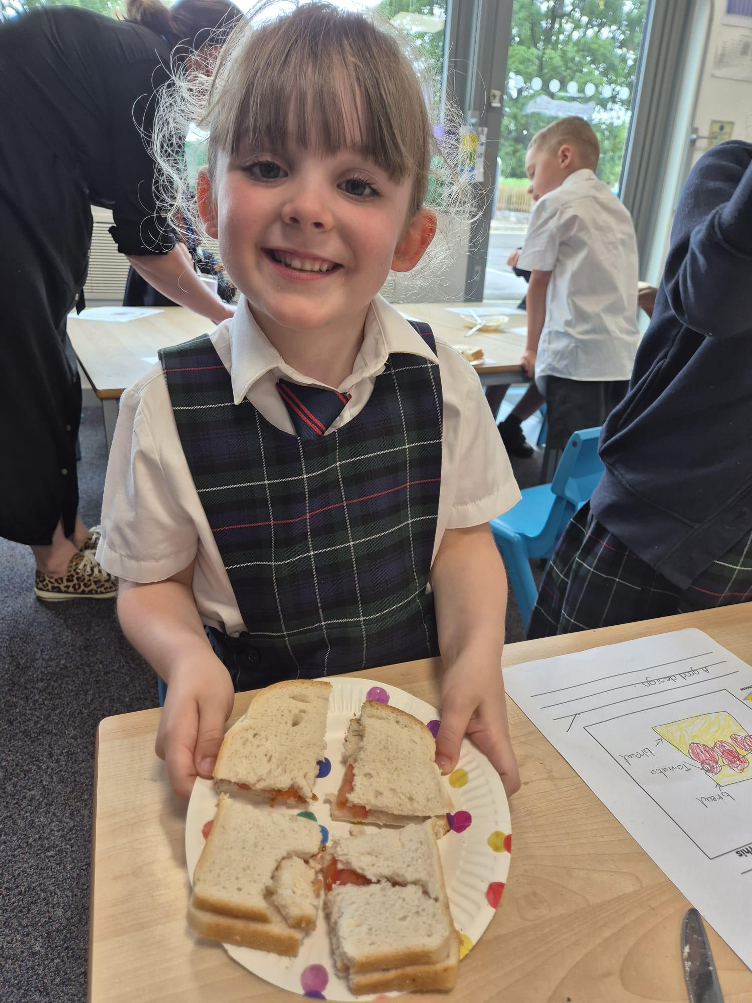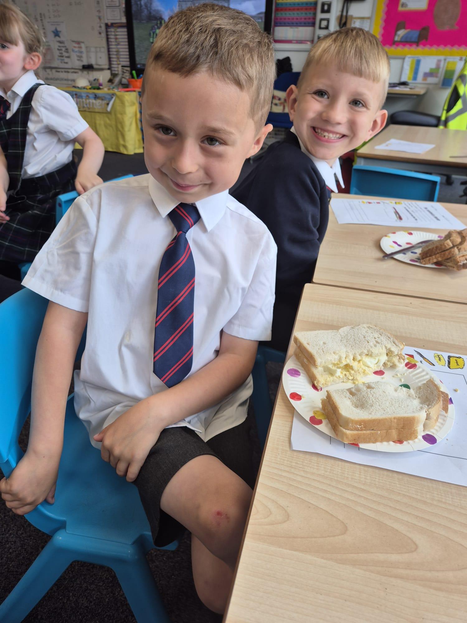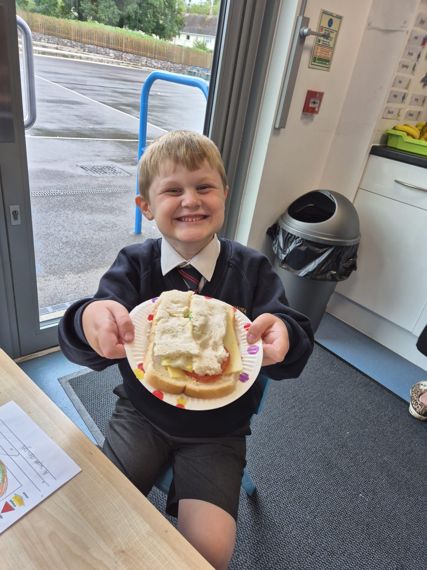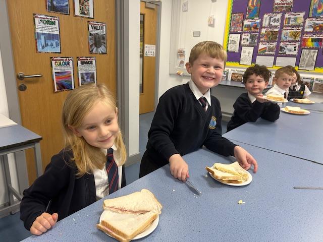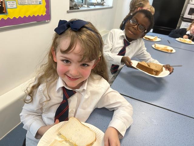 The class have been reading The Disgusting Sandwich this week, and have been completing various pieces of work about it. So, we thought it would be fun to make our own sandwiches but wthout the 'disgusting' fillings! The children could chose either jam, cheese or ham.