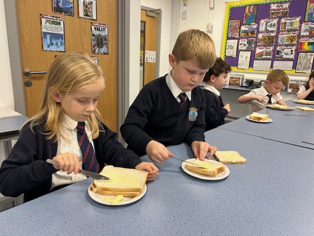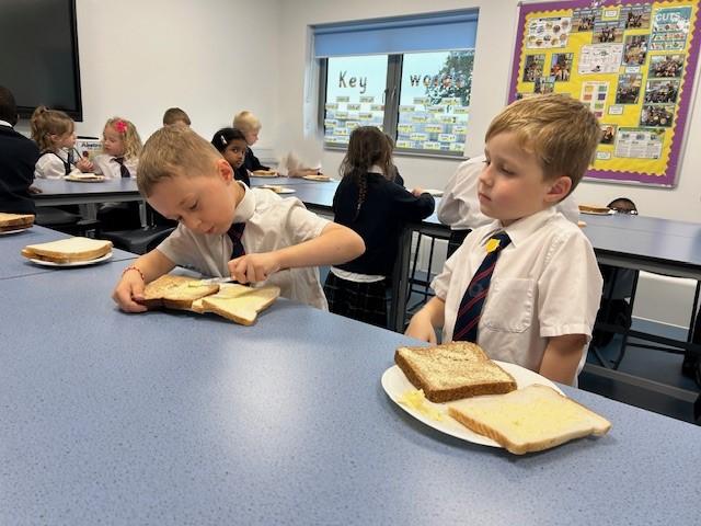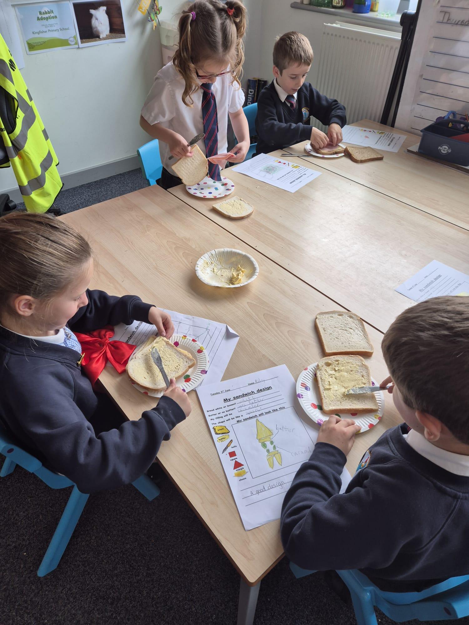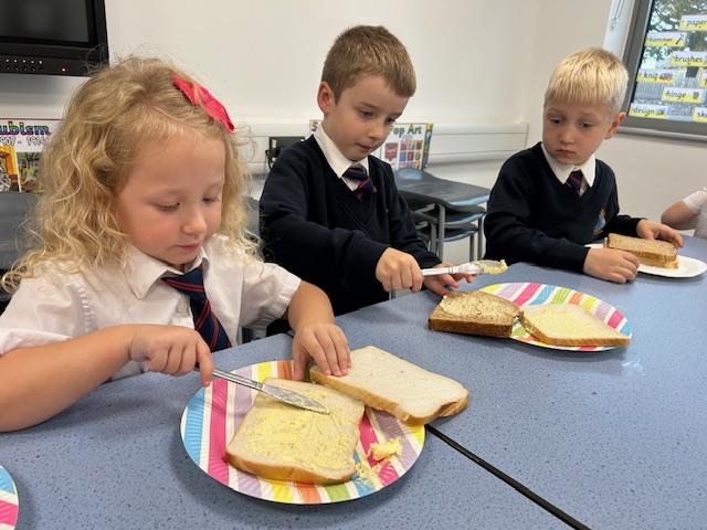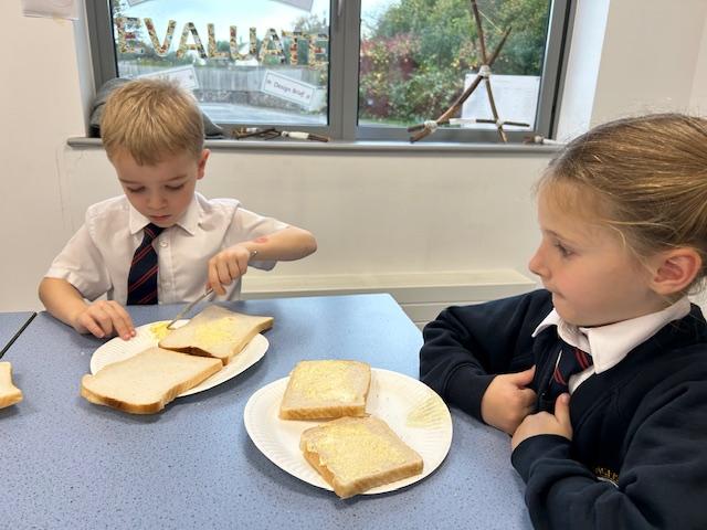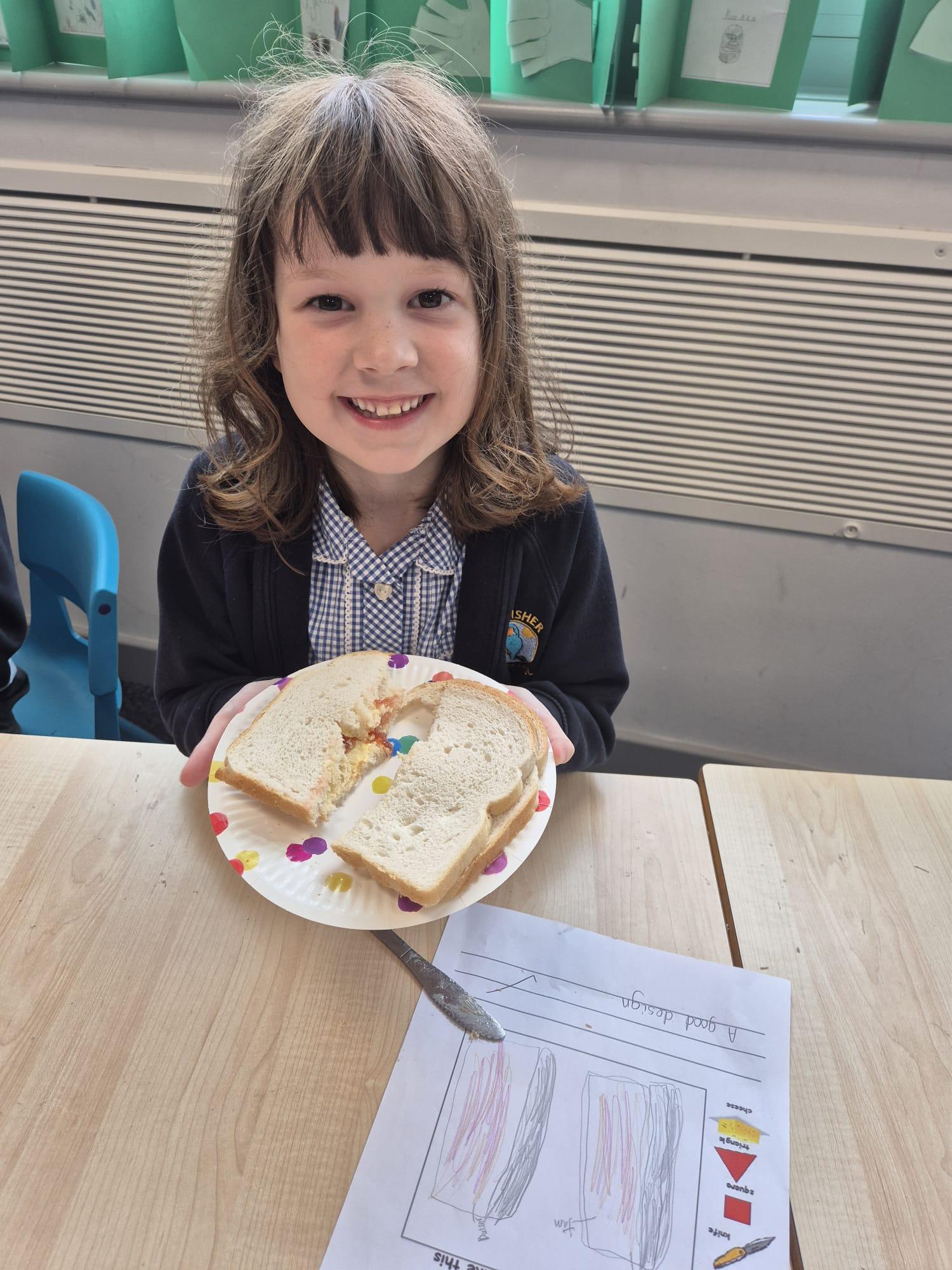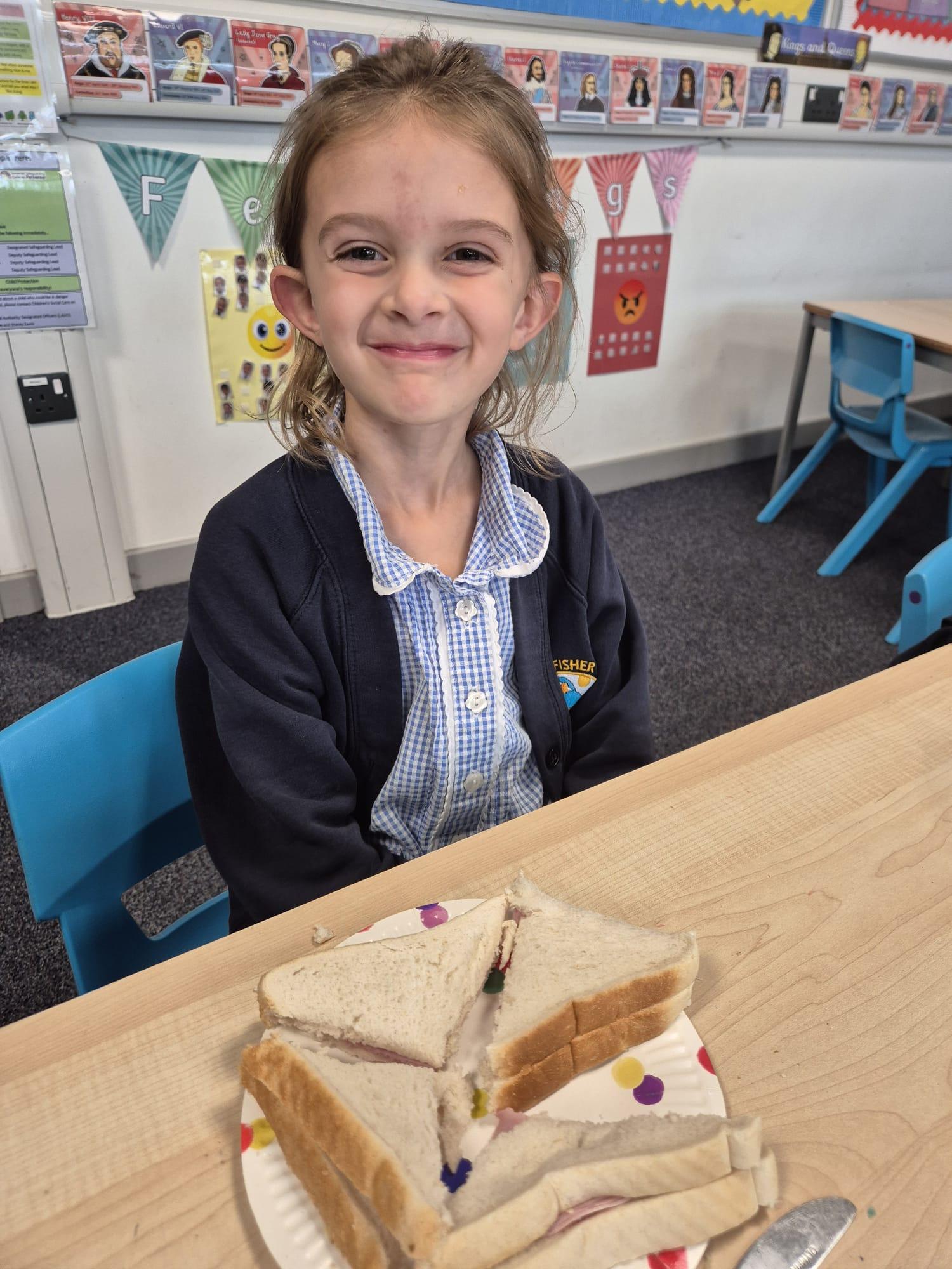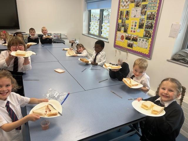 The class have been reading The Disgusting Sandwich this week, and have been completing various pieces of work about it. So, we thought it would be fun to make our own sandwiches but wthout the 'disgusting' fillings! The children could chose either jam, cheese or ham.