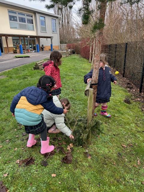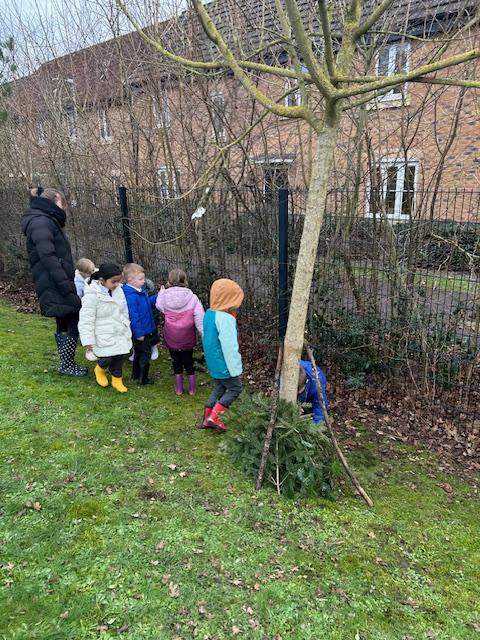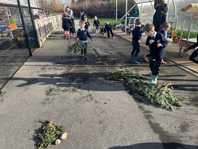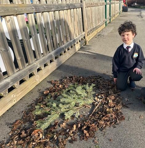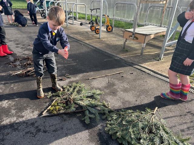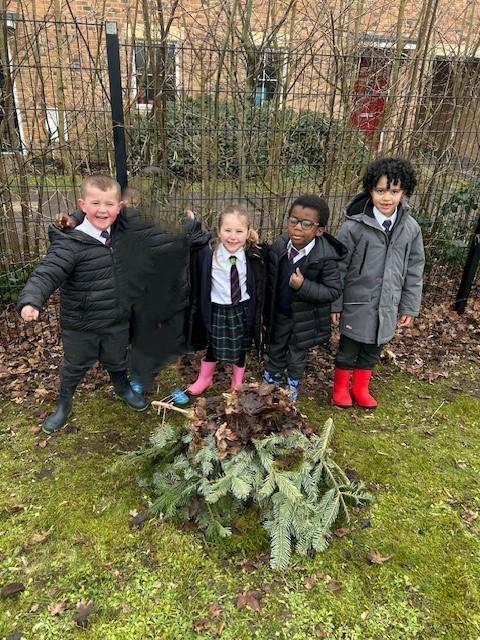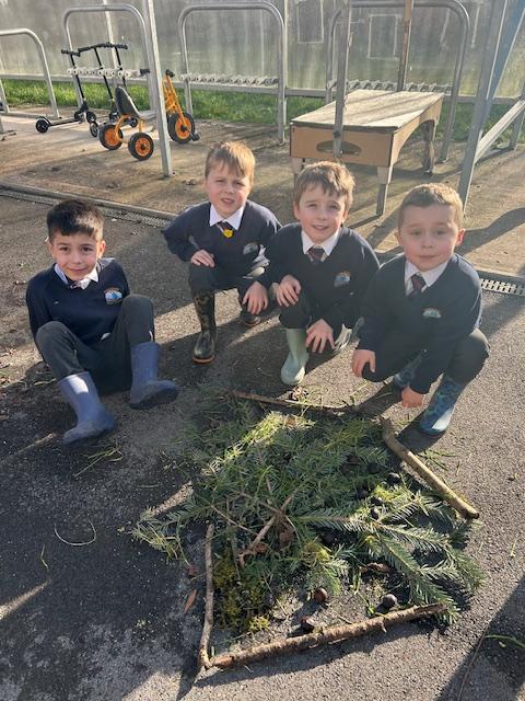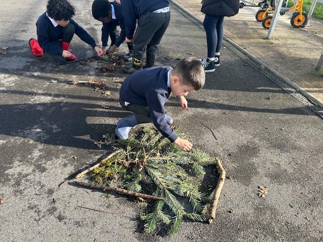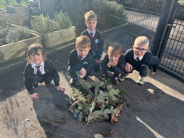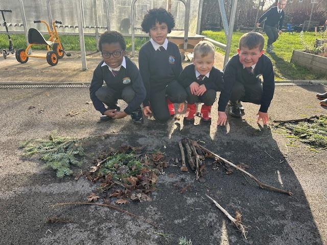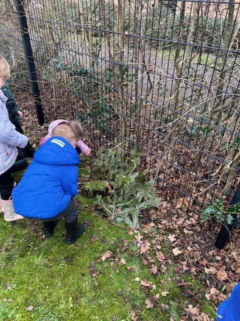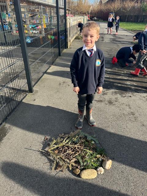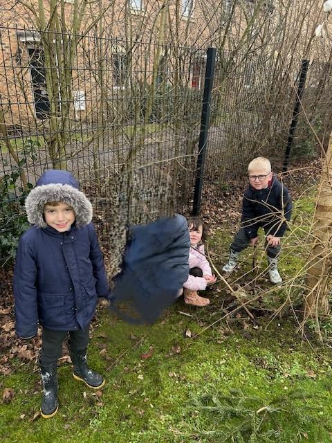 In Outdoor Leaning this week, the children enjoyed hearing the story 'One Snowy Night' by Nick Butterworth. They then went out into our Kingfisher garden to make some homes for some wild animals. They considered what would make a good shelter, including having a roof and an entrance, and also having a nice cosy base for them to sleep on. The children used fir tree branches, leaves, twigs and moss to create their homes and as you can see, they were very proud of them!