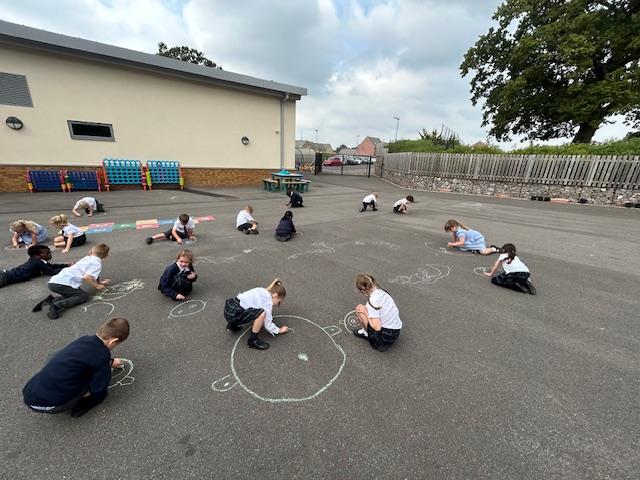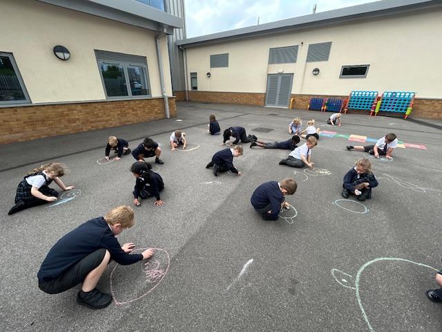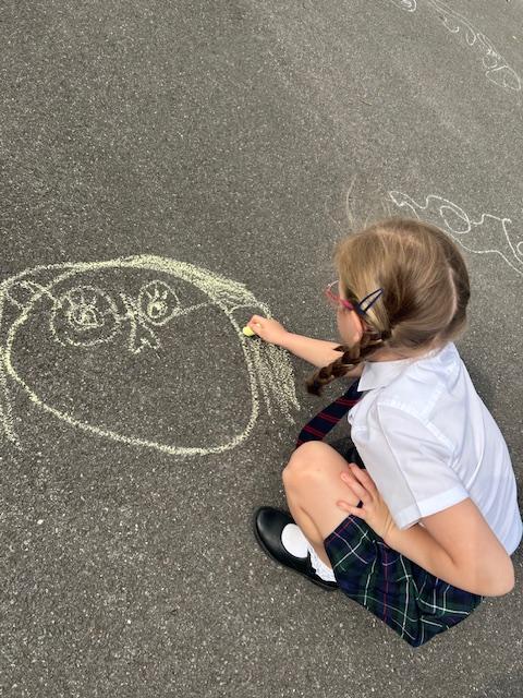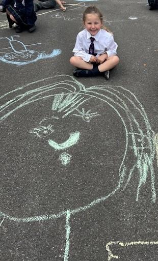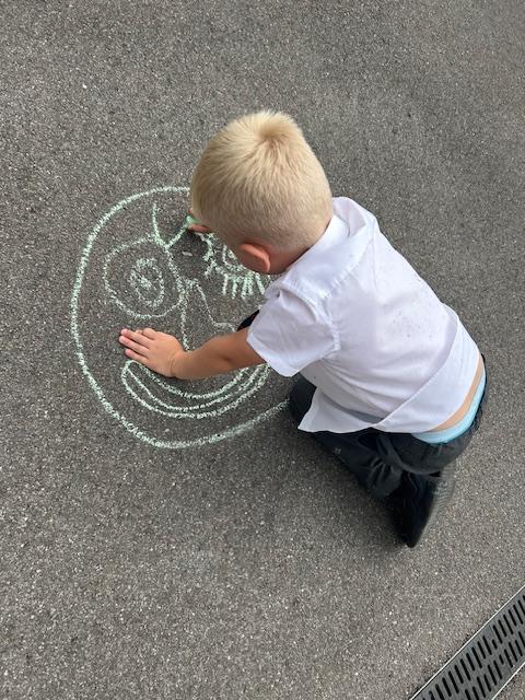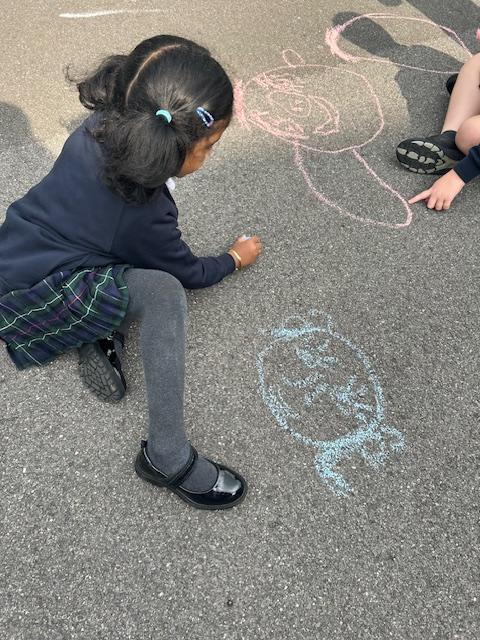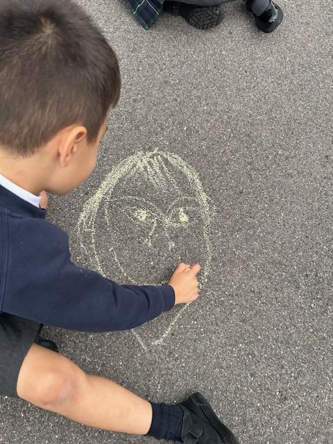 This week the class created their own portraits using chalk on the playground. They tried to include more details into the pictures, including eye lashes, eye brows and ears!