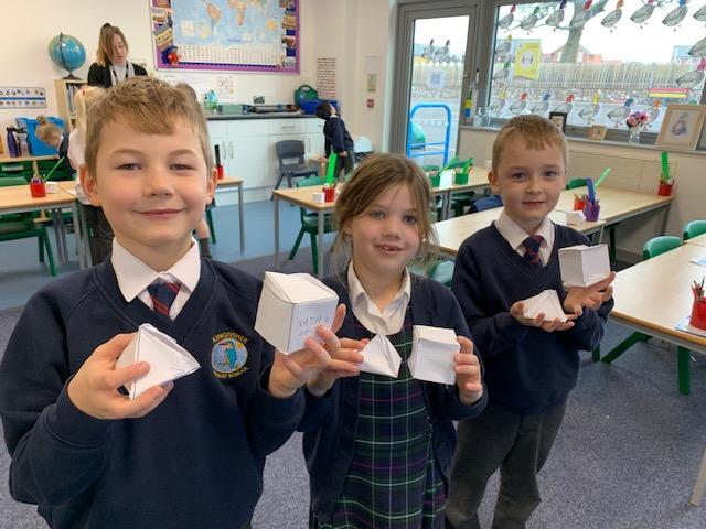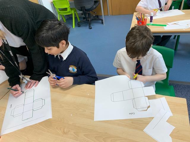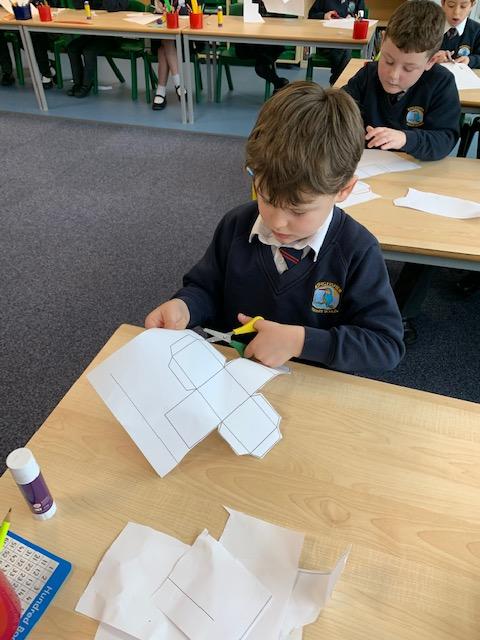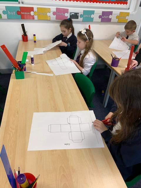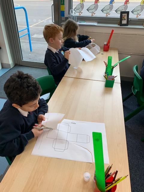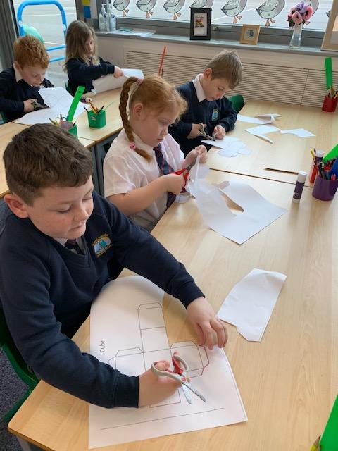 As part of our Maths topic on Shapes, the children created their own 3D shapes from Nets. The class enjoyed making their Cubes and Square Based Pyramids.