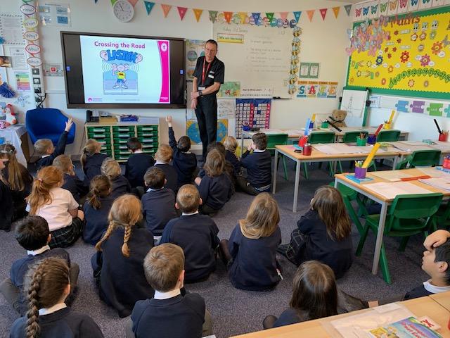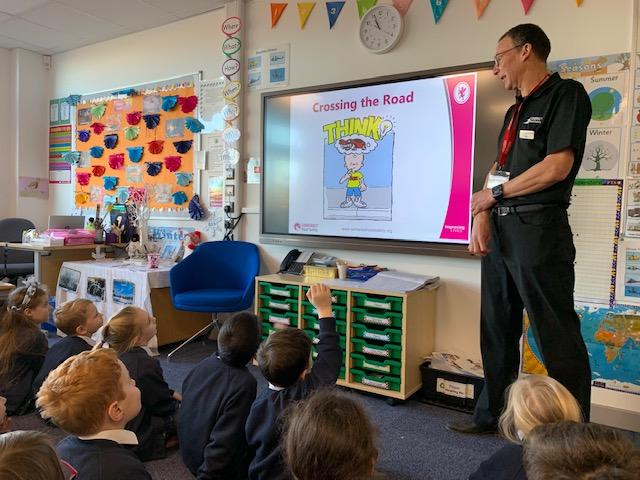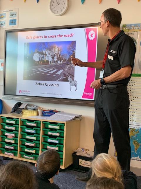 Today we had a visit from Paul who works for Somerset Road Safety. He spoke to us about how to stay safe on the roads and where and how we should cross roads safely. He spoke about the different crossings and also how important it is to be seen clearly when walking/riding near roads. The children learned four important words:
