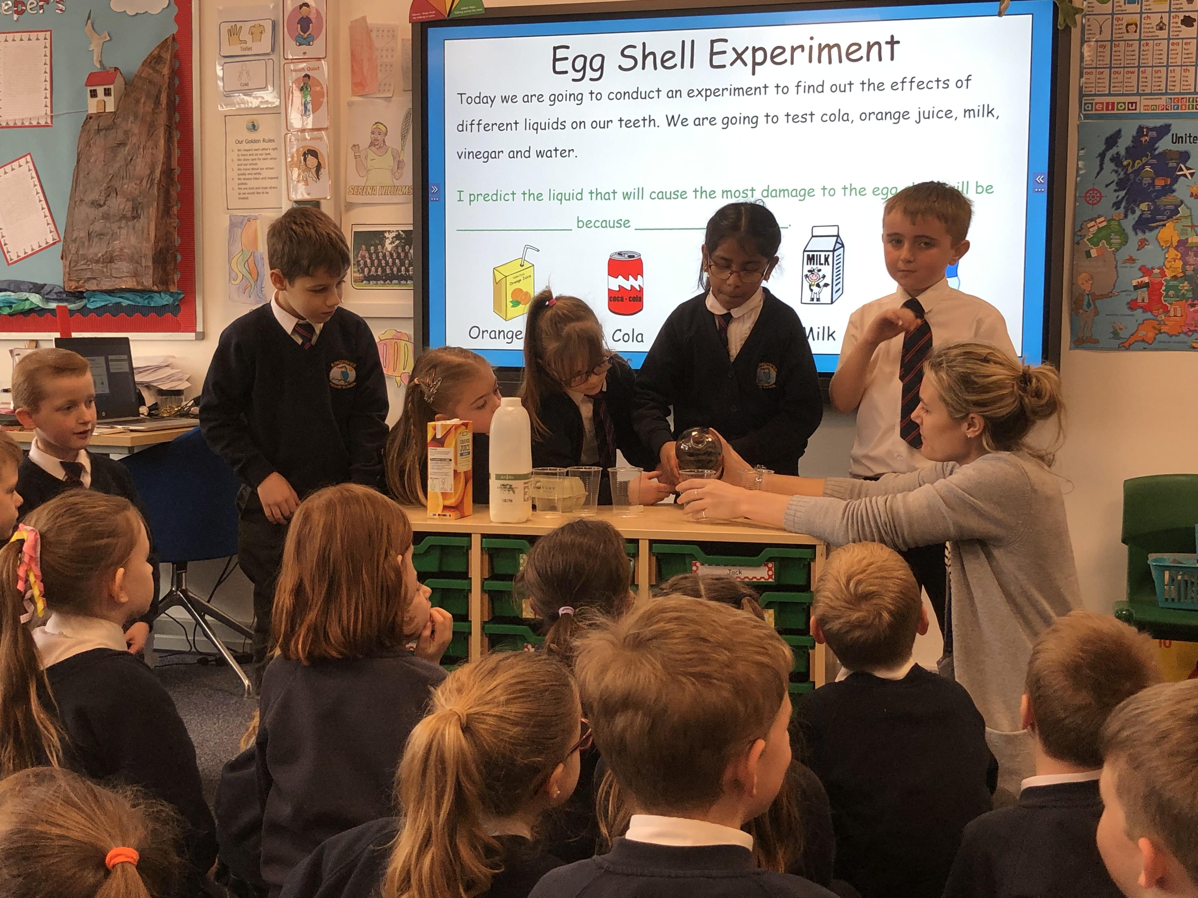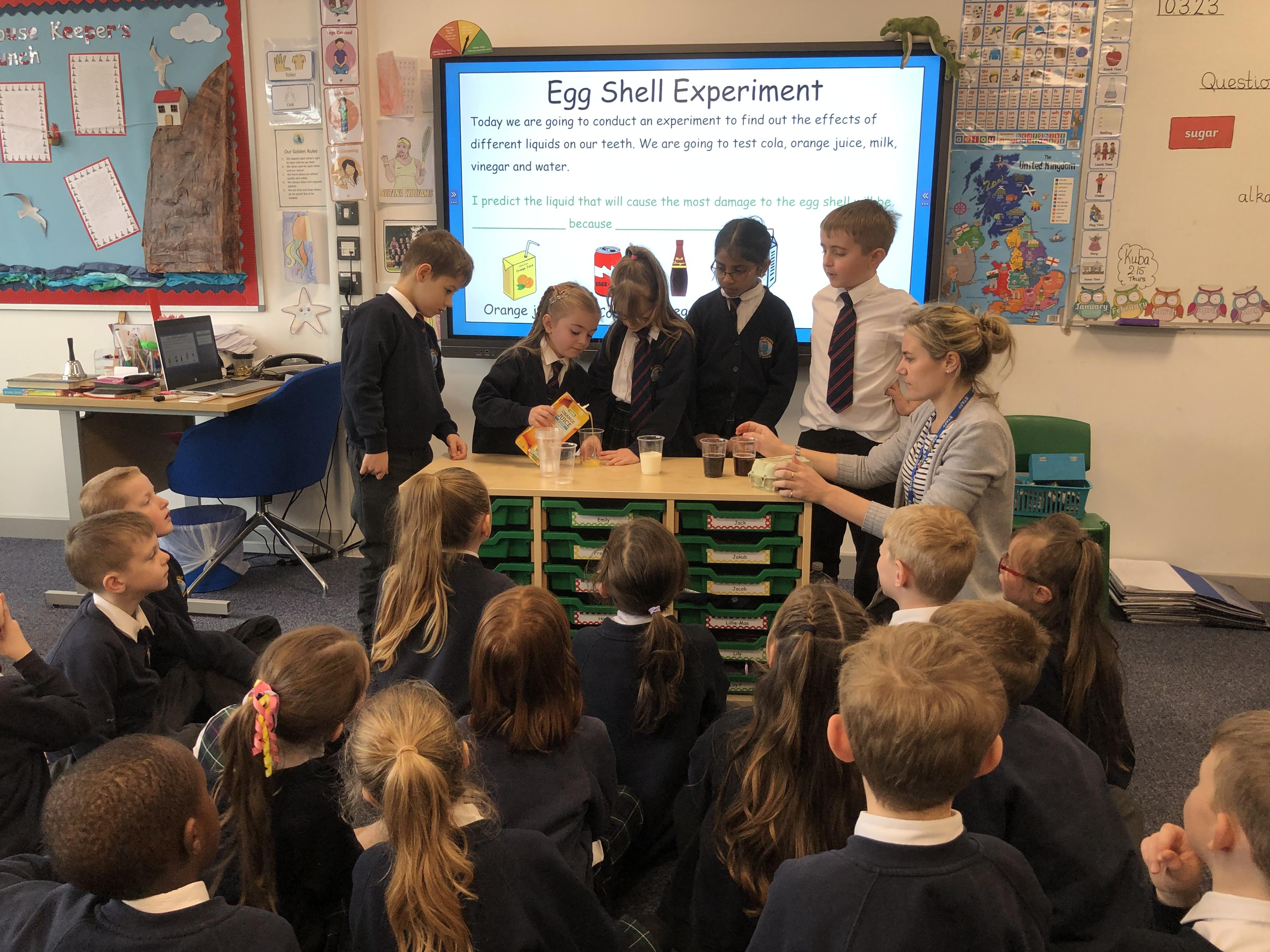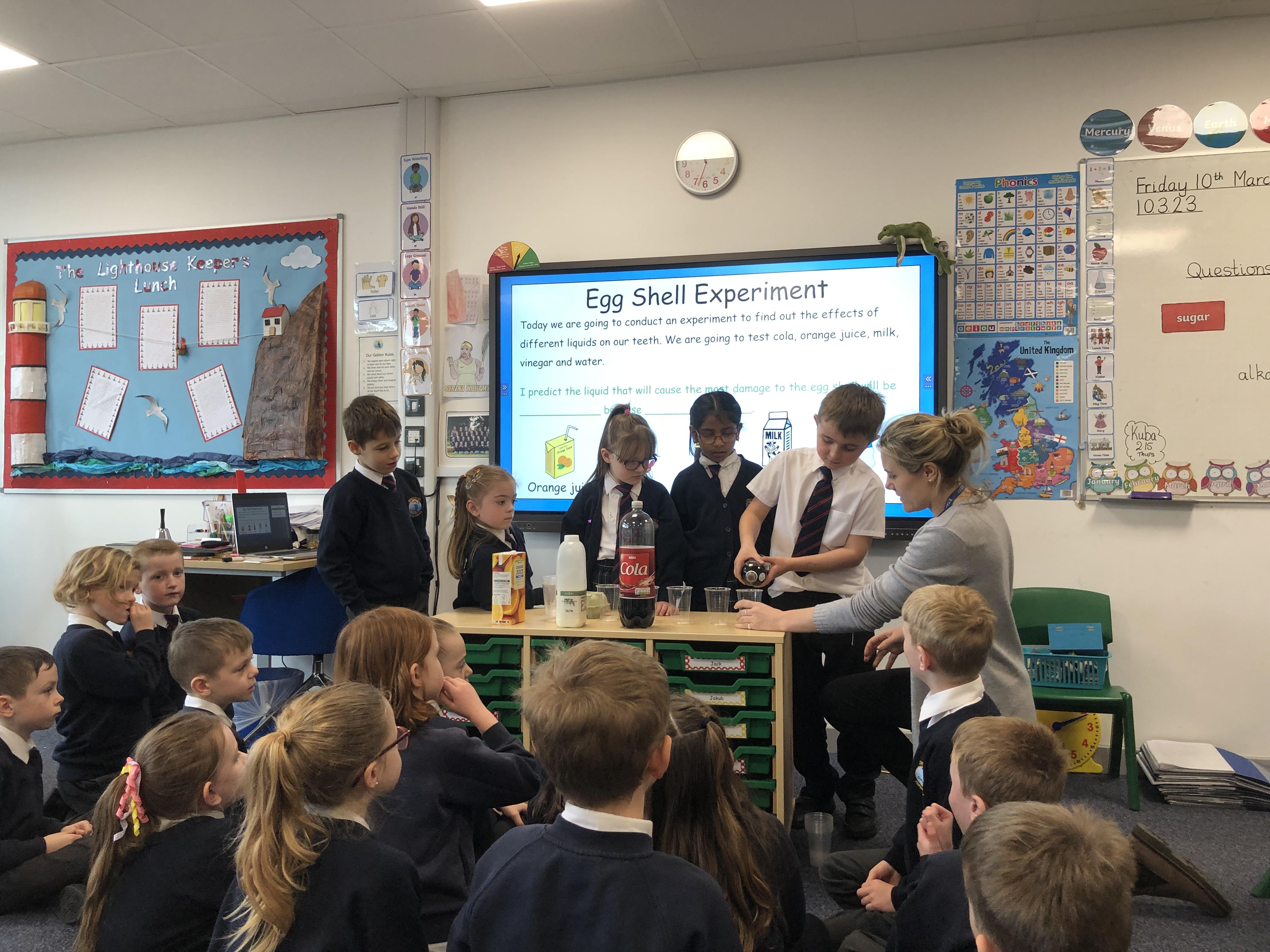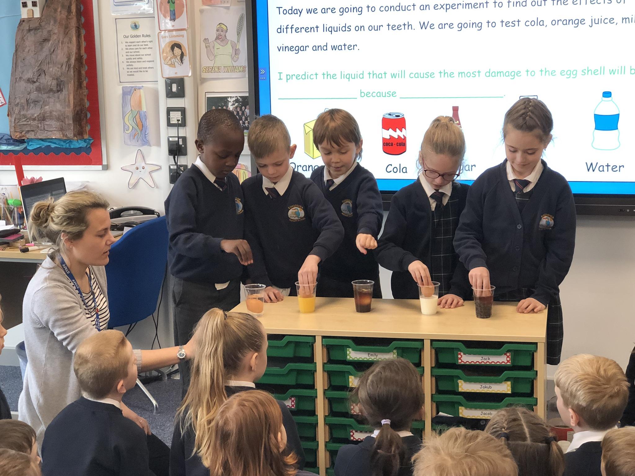 Over the last few weeks, the children have been learning all about the importance of good hygiene. This week, the children conducted an experiment to find out the impact of different liquids on our teeth. Of course, we couldn't use real teeth for this experiment, so we used eggs instead because the enamel on an egg shell is very similar to the enamel on our teeth. Today, the children made their predictions as to which liquid they think would cause the most damage on the egg shells. The liquids we are testing include water, orange juice, cola, vinegar and milk. We discussed the importance of a fair test and making sure that all but one variable stays the same. Then, it was time for us to pop the eggs into the different cups of liquid. We are going to leave the eggs in the liquids for 1 week and check on them daily to see if there are any changes! We can't wait to find out the results!