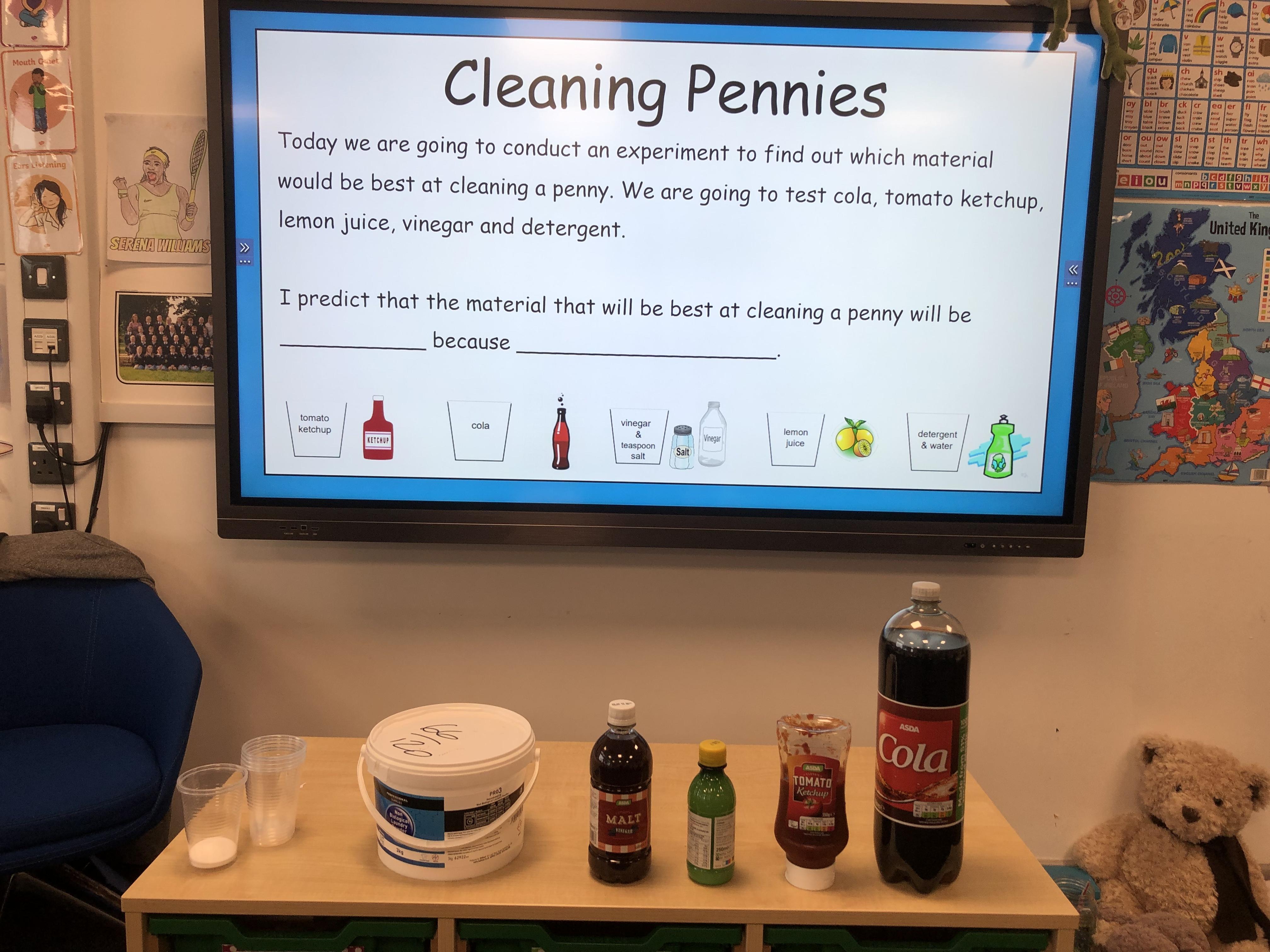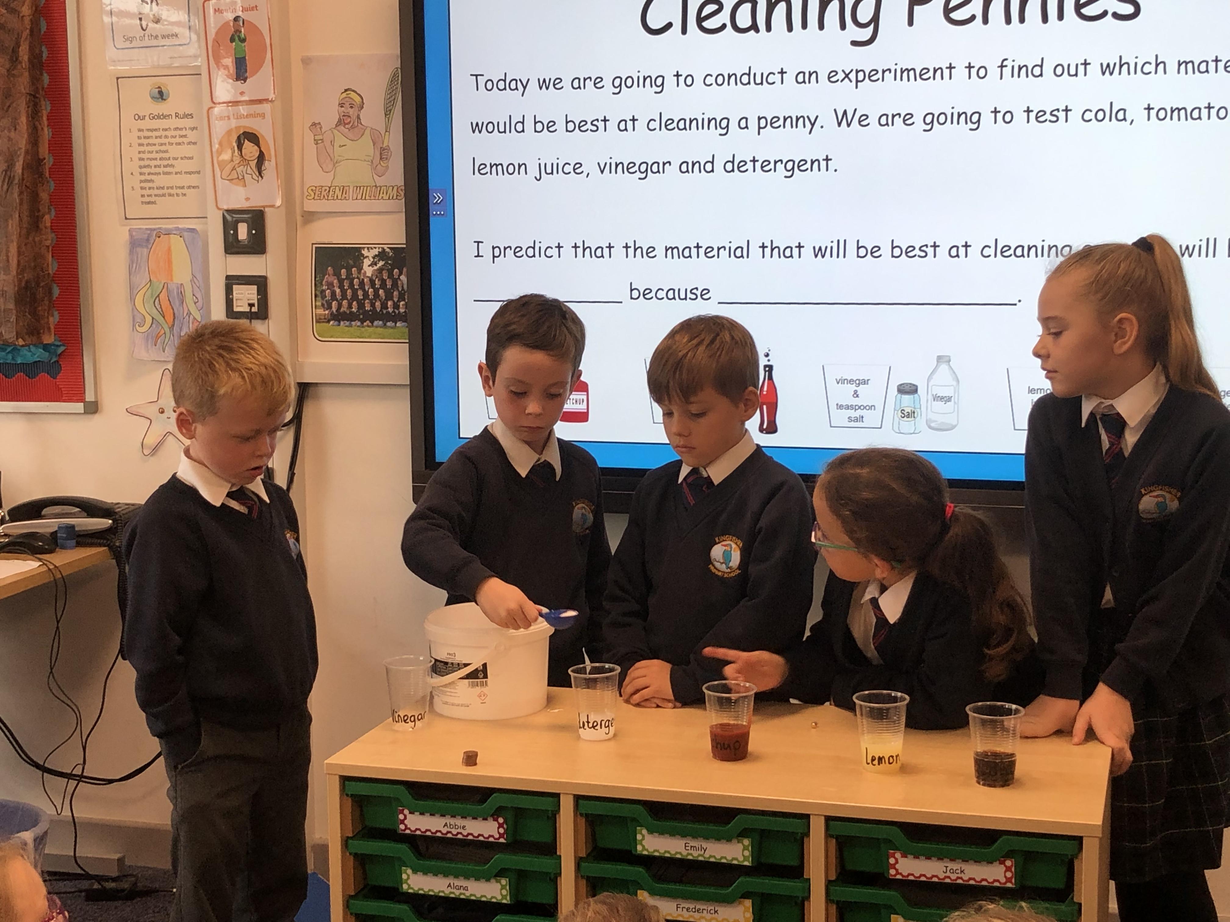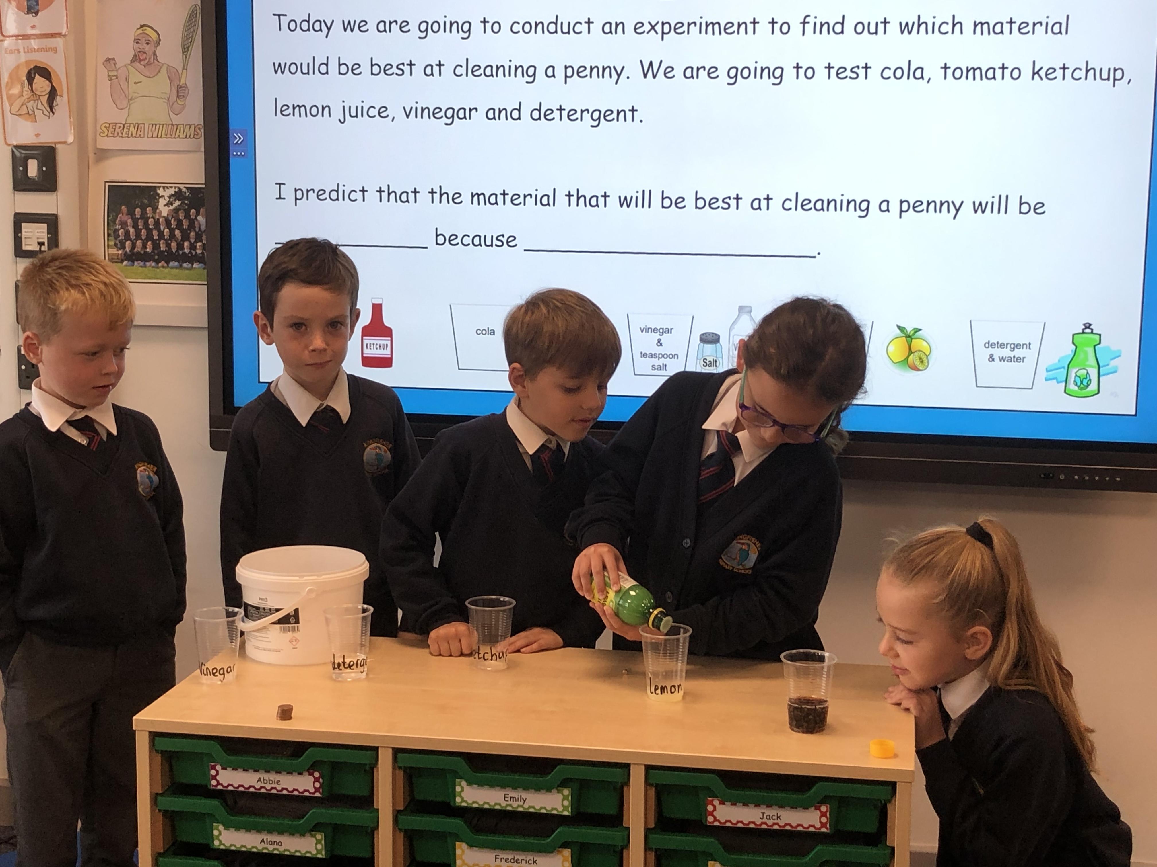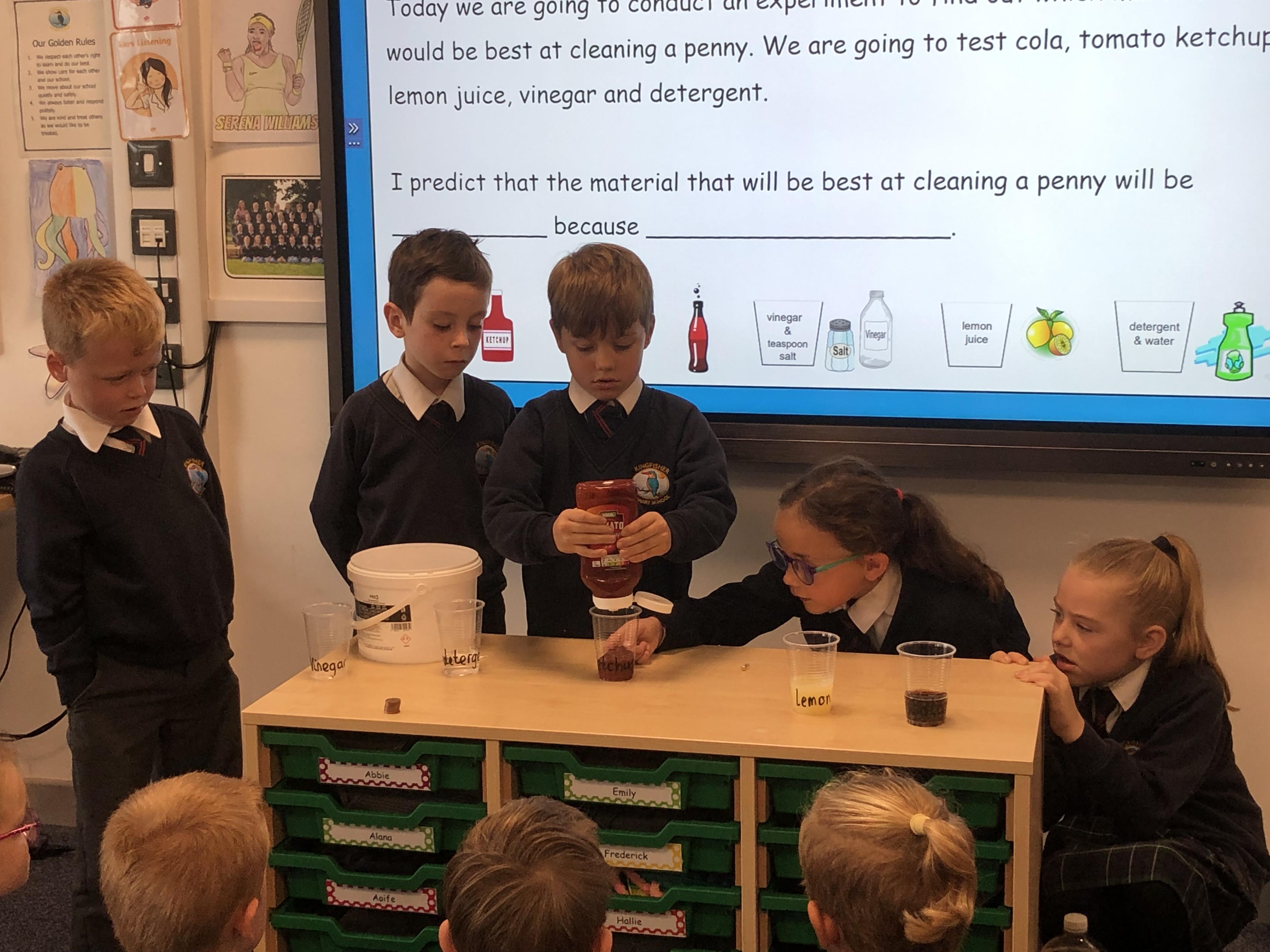 In Science today, the children conducted a test to find out which substance would be best for cleaning a penny. We tested vinegar with a pinch of salt, washing powder with water, lemon juice, cola and tomato ketchup. Before conducting the test the children made their predictions. To make sure it was a fair test, we distributed the different substances equally and left the pennies in each of the substances for the same amount of time. When we revealed the pennies, we were all very surprised by the results. The majority of the class felt that the washing powder would be the most effective at cleaning a penny because it is used for cleaning but the results showed that actually tomato ketchup was the best at cleaning a penny. We concluded that tomato ketchup was the best because of its acidity.
