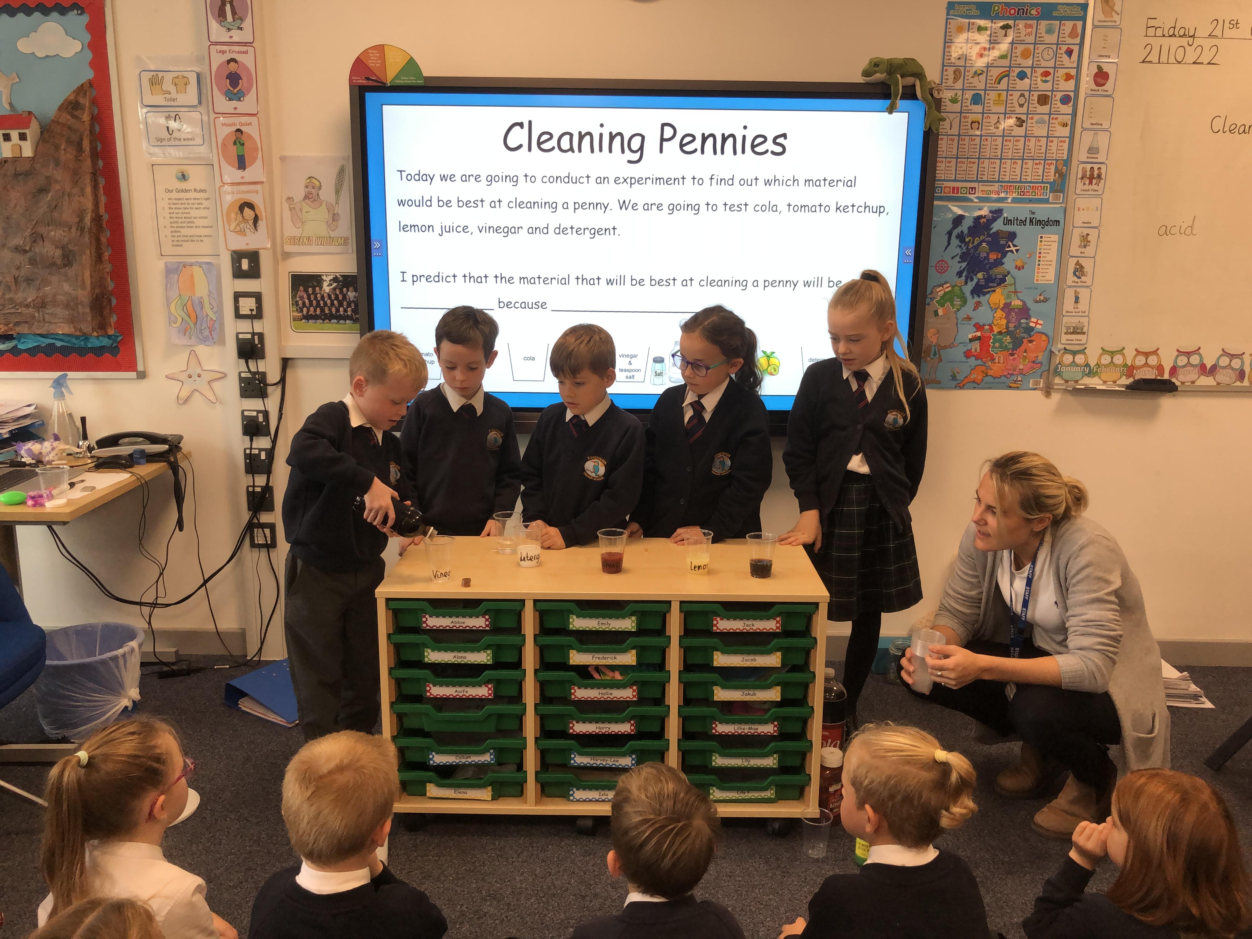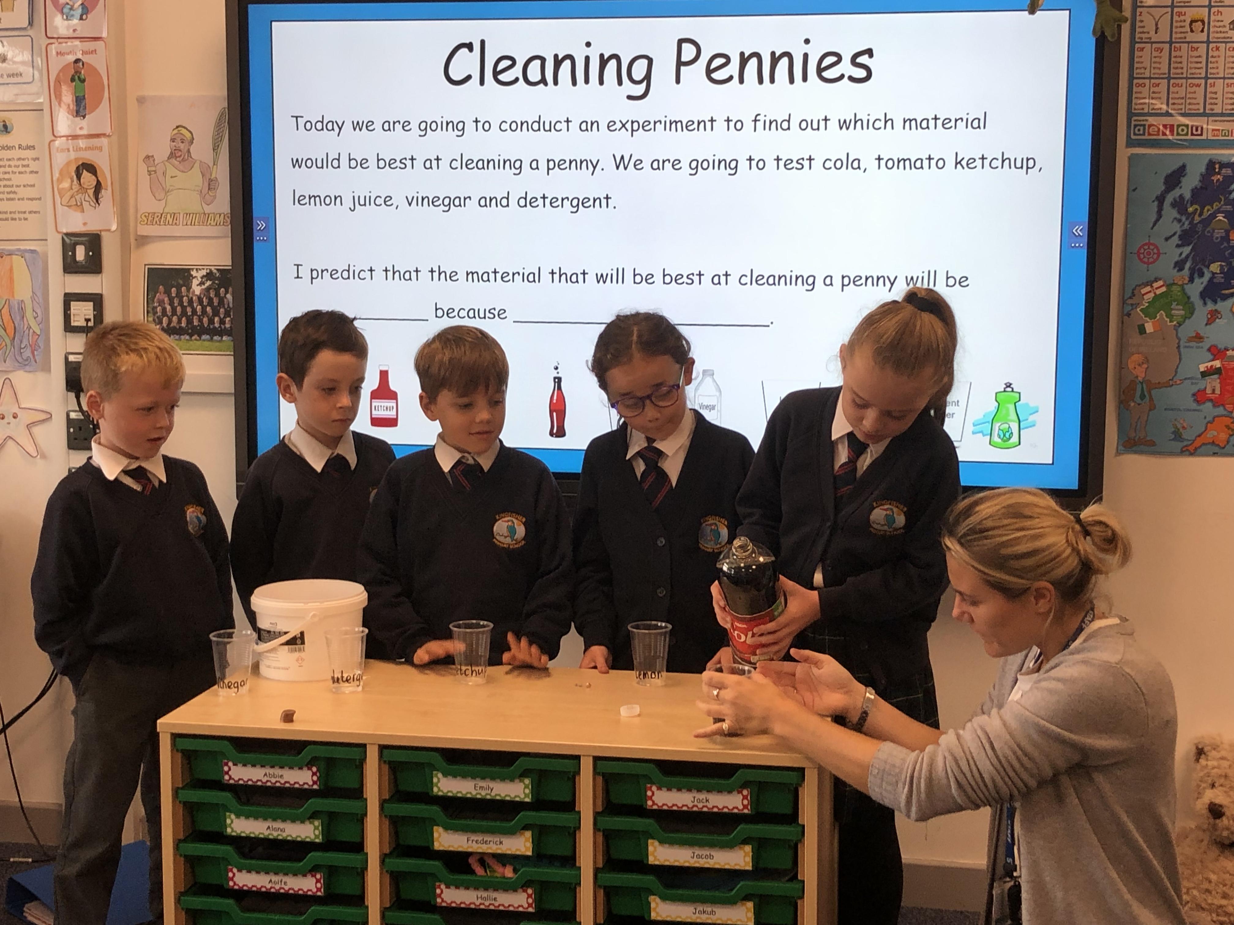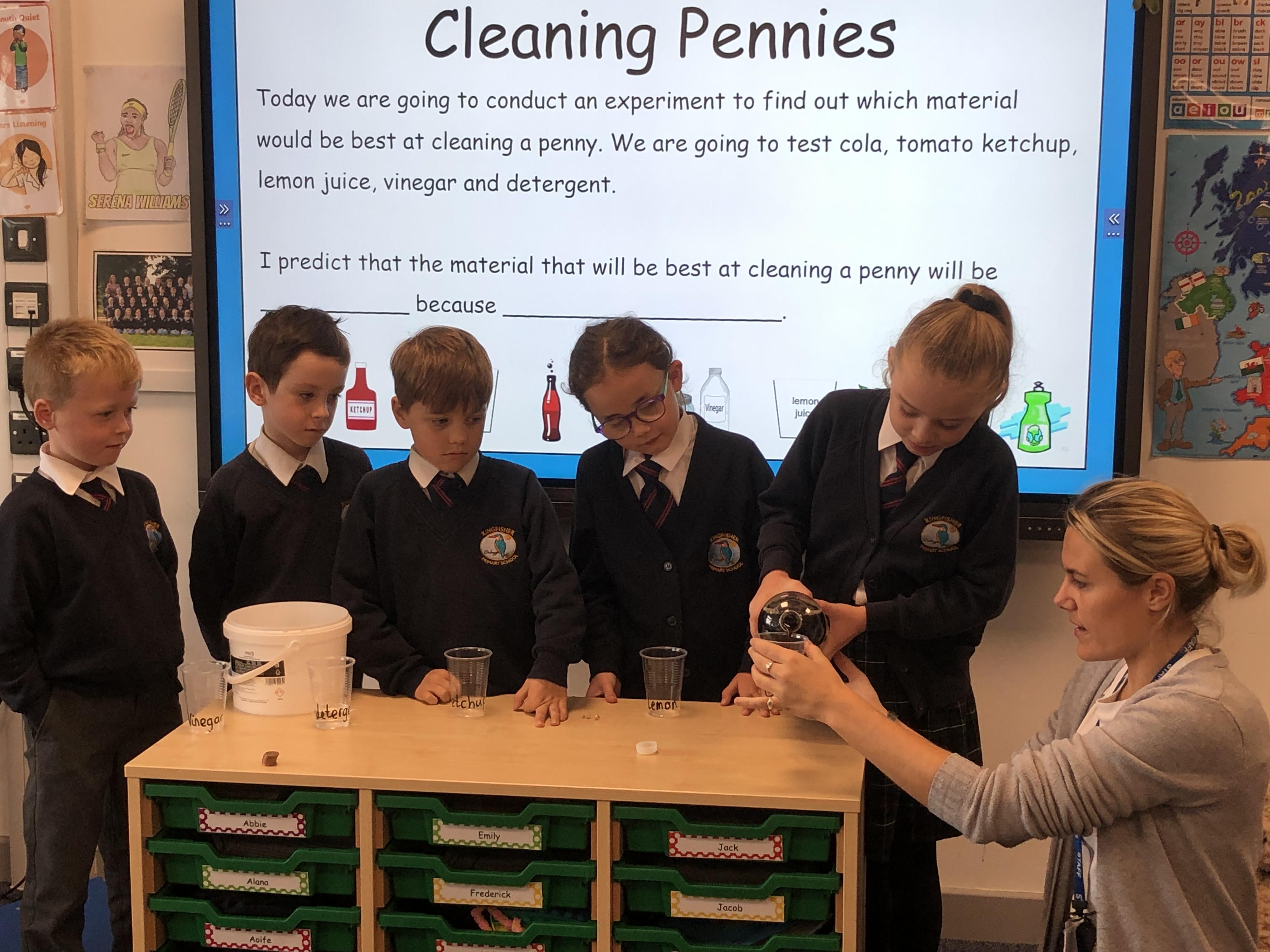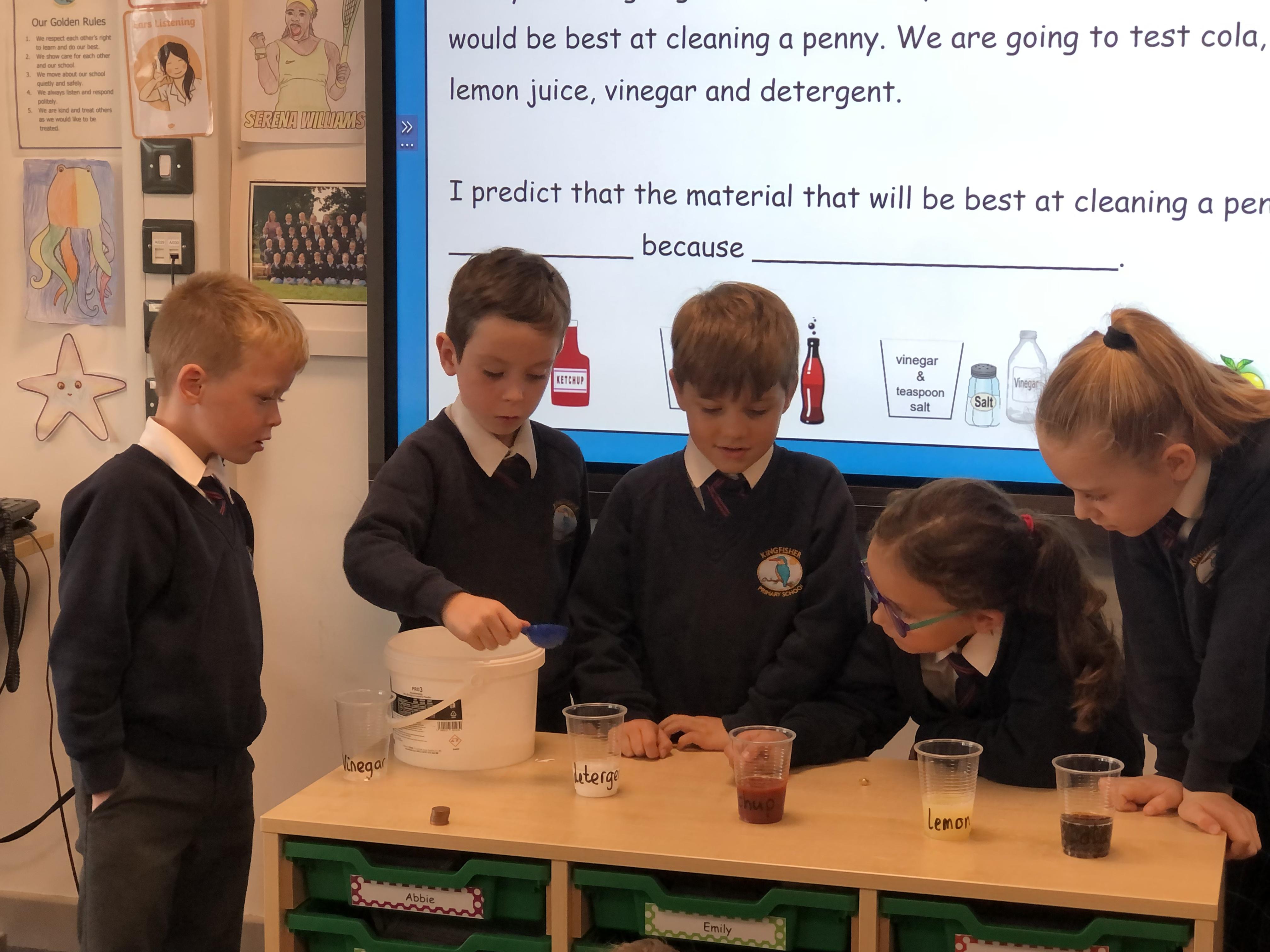 In Science today, the children conducted a test to find out which substance would be best for cleaning a penny. We tested vinegar with a pinch of salt, washing powder with water, lemon juice, cola and tomato ketchup. Before conducting the test the children made their predictions. To make sure it was a fair test, we distributed the different substances equally and left the pennies in each of the substances for the same amount of time. When we revealed the pennies, we were all very surprised by the results. The majority of the class felt that the washing powder would be the most effective at cleaning a penny because it is used for cleaning but the results showed that actually tomato ketchup was the best at cleaning a penny. We concluded that tomato ketchup was the best because of its acidity.
