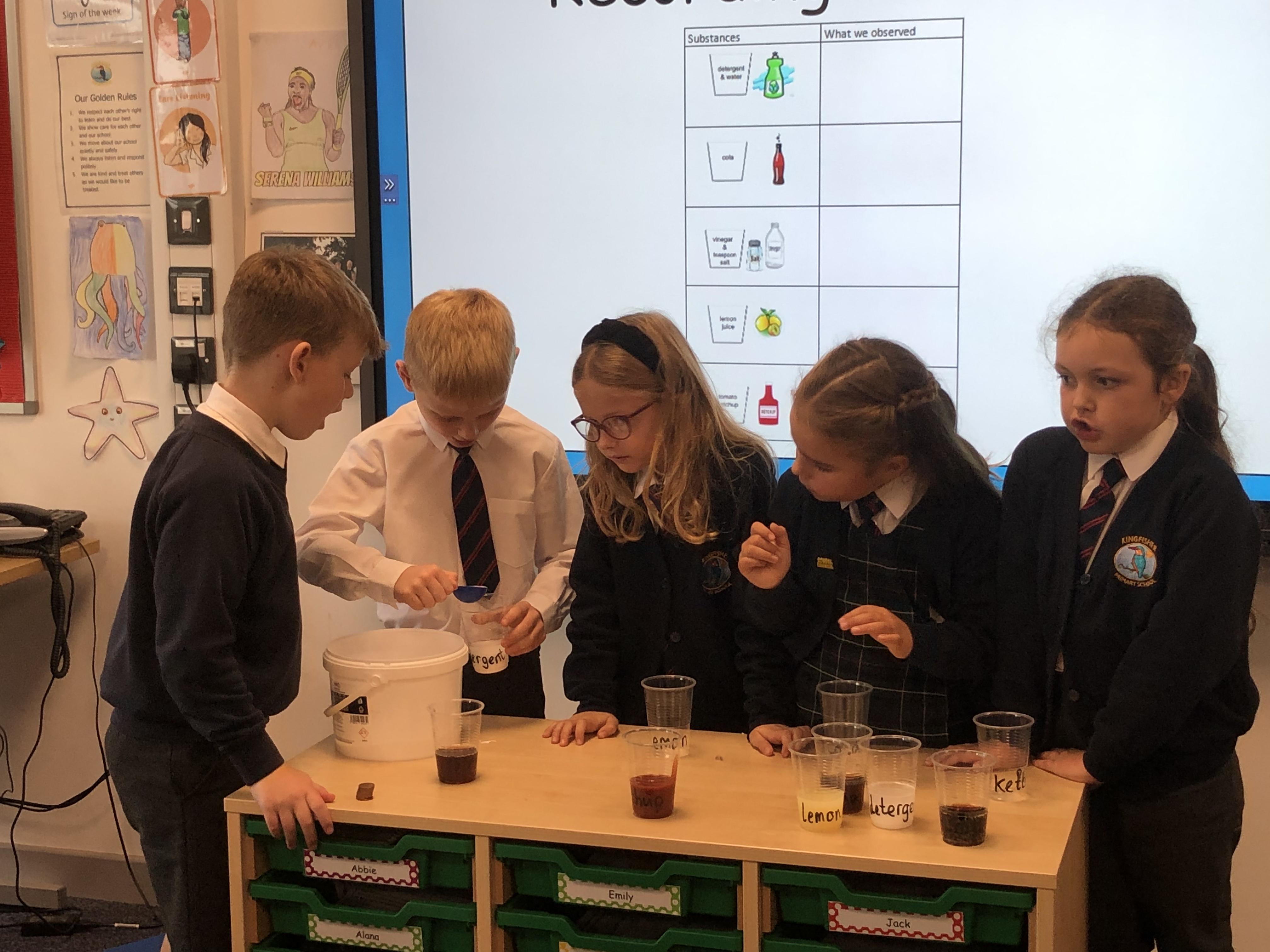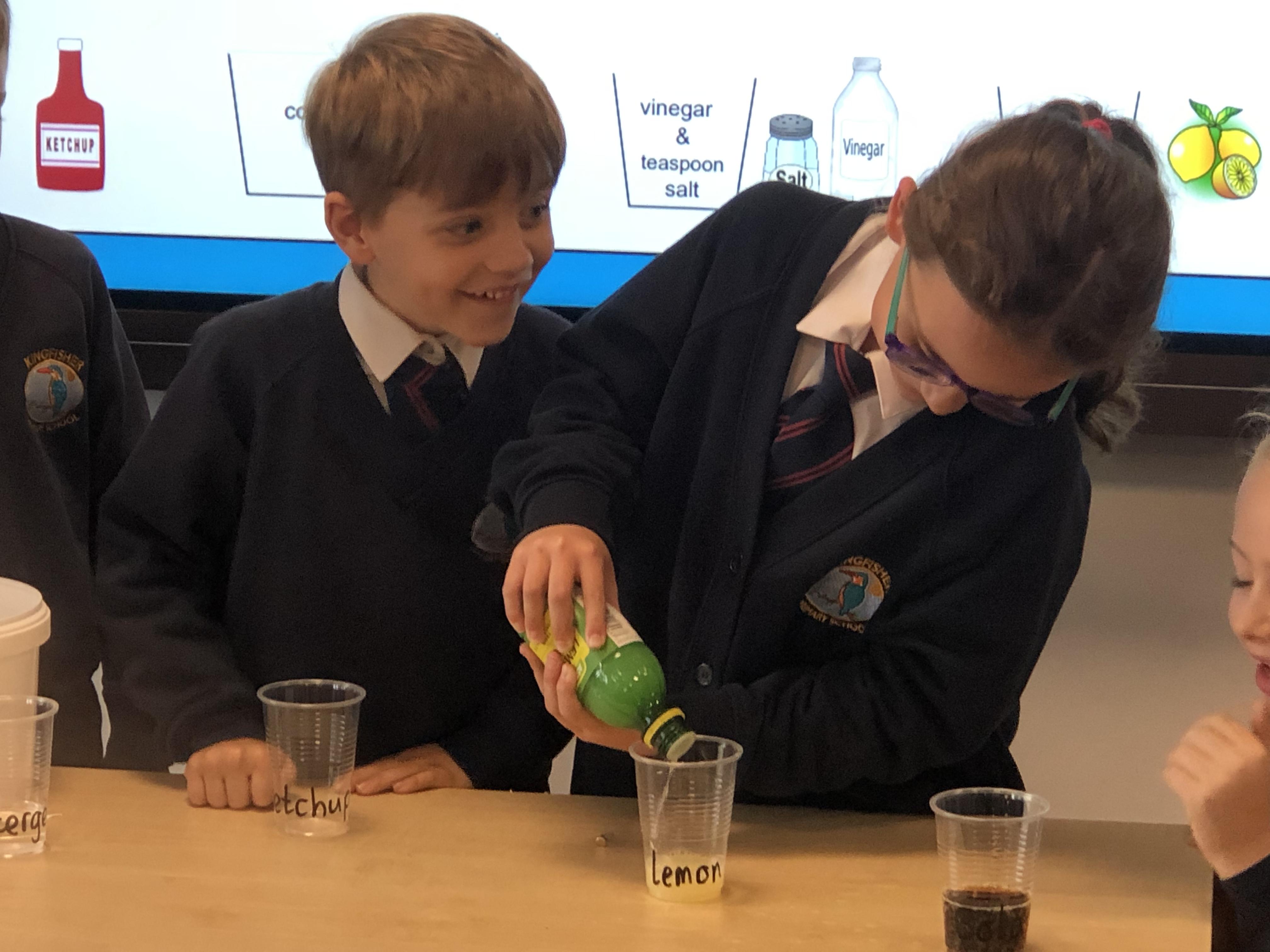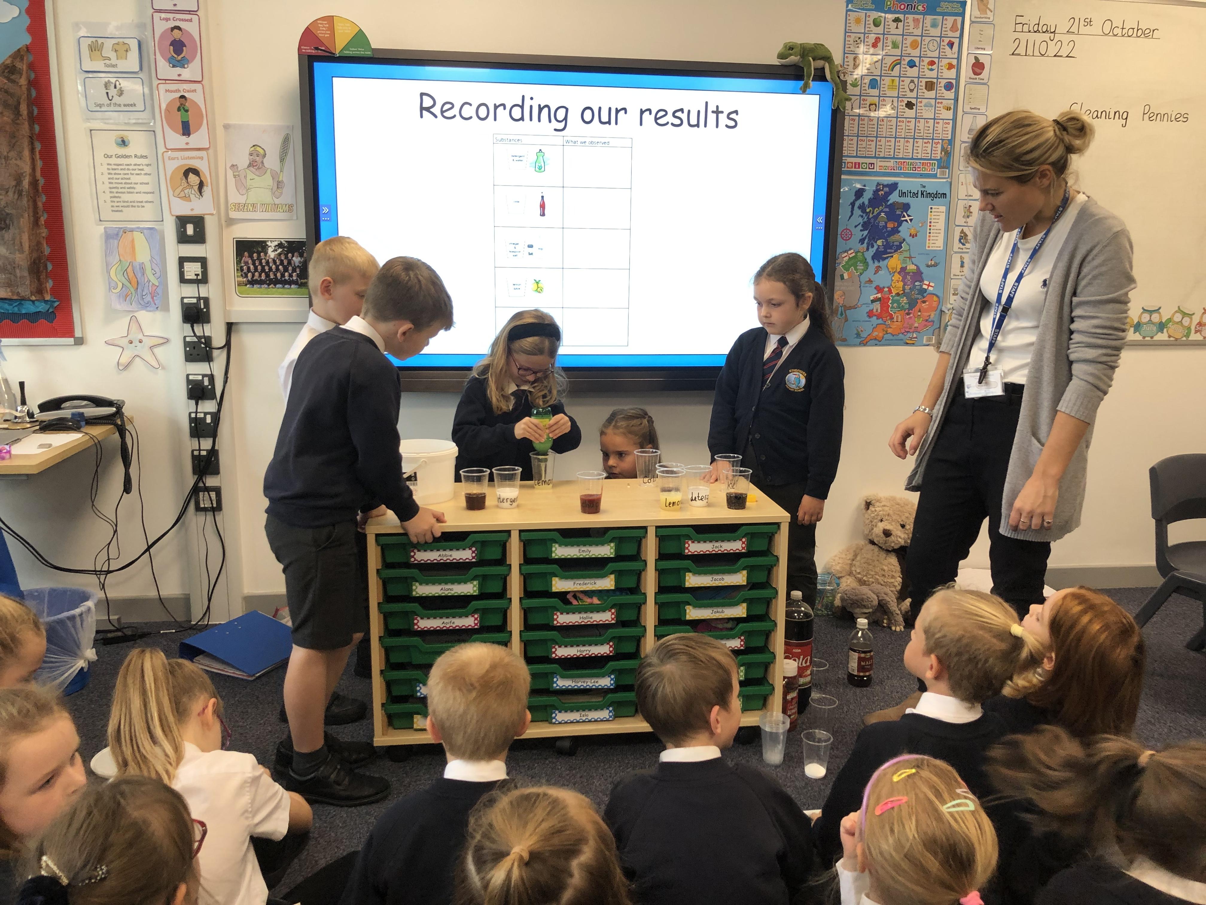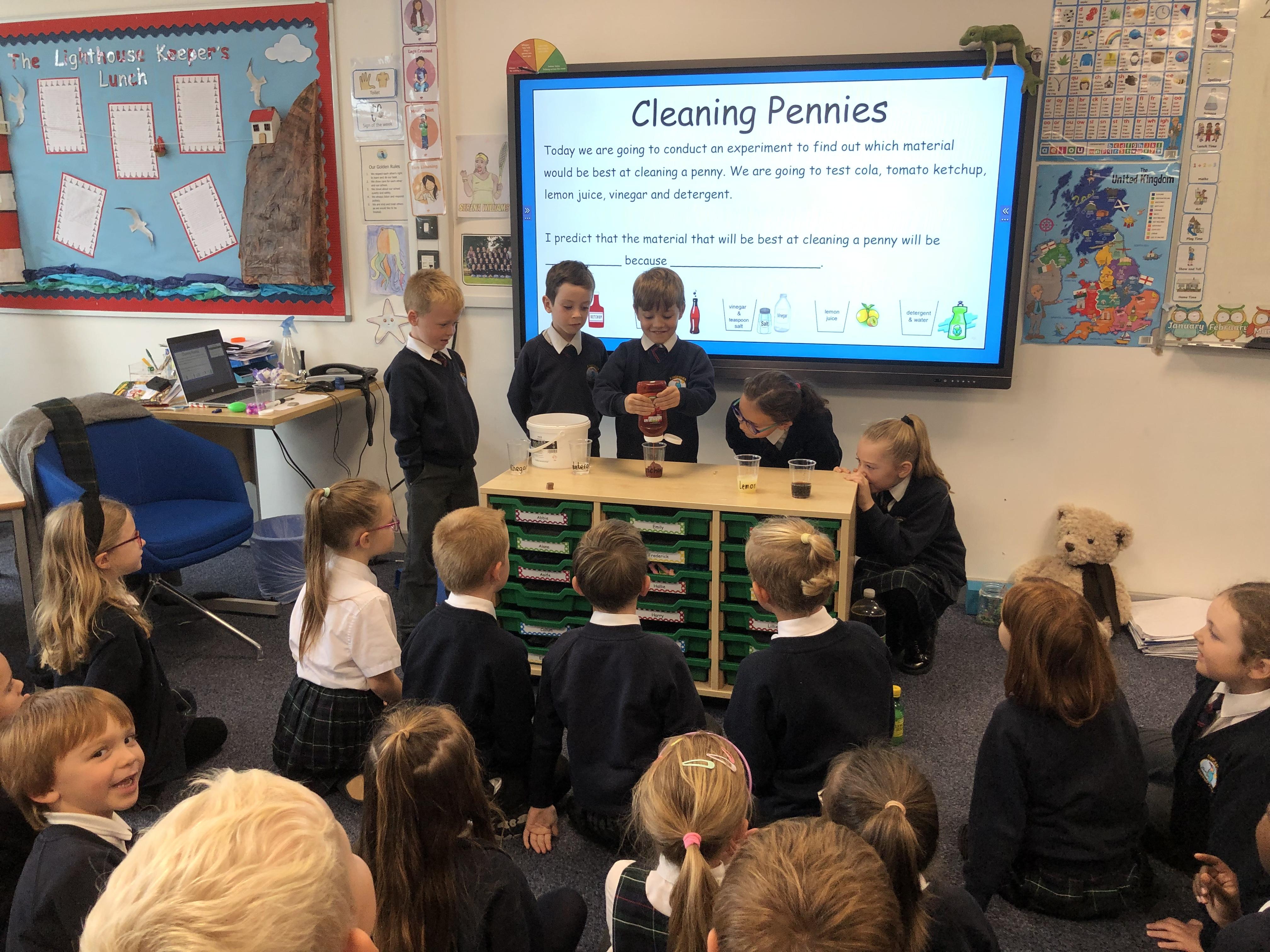 In Science today, the children conducted a test to find out which substance would be best for cleaning a penny. We tested vinegar with a pinch of salt, washing powder with water, lemon juice, cola and tomato ketchup. Before conducting the test the children made their predictions. To make sure it was a fair test, we distributed the different substances equally and left the pennies in each of the substances for the same amount of time. When we revealed the pennies, we were all very surprised by the results. The majority of the class felt that the washing powder would be the most effective at cleaning a penny because it is used for cleaning but the results showed that actually tomato ketchup was the best at cleaning a penny. We concluded that tomato ketchup was the best because of its acidity.