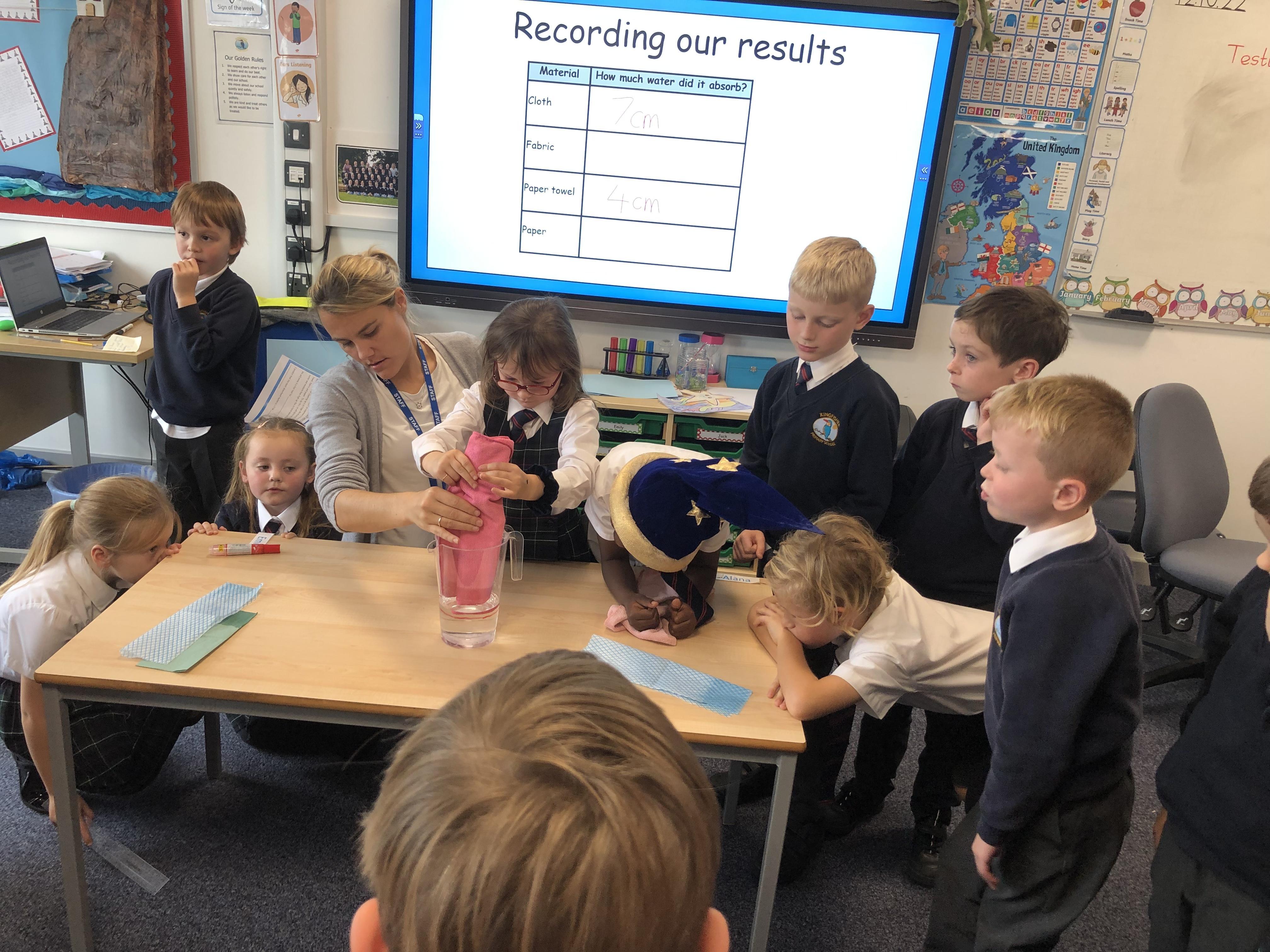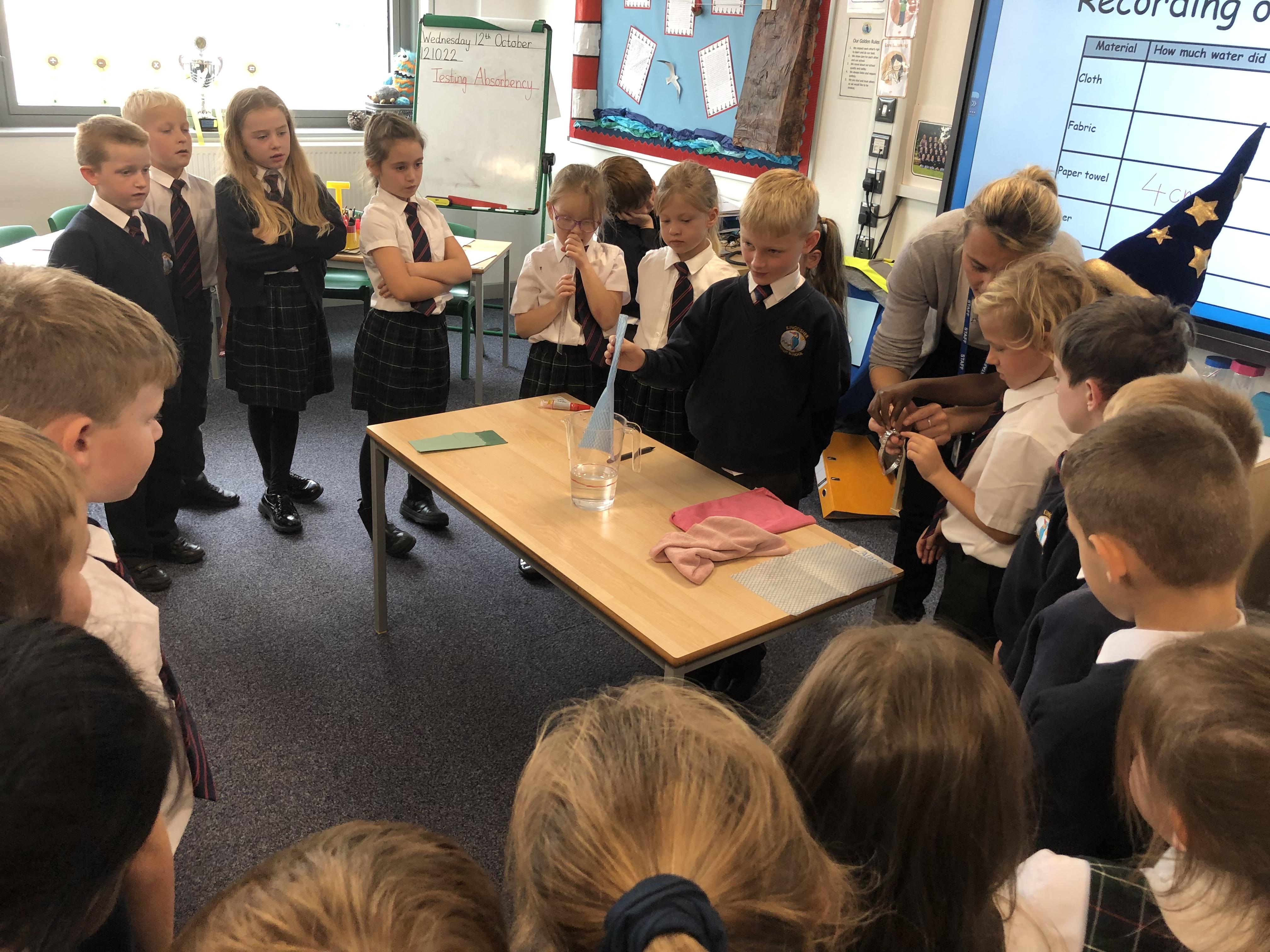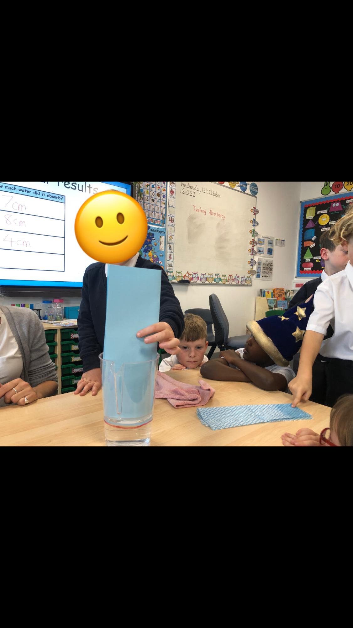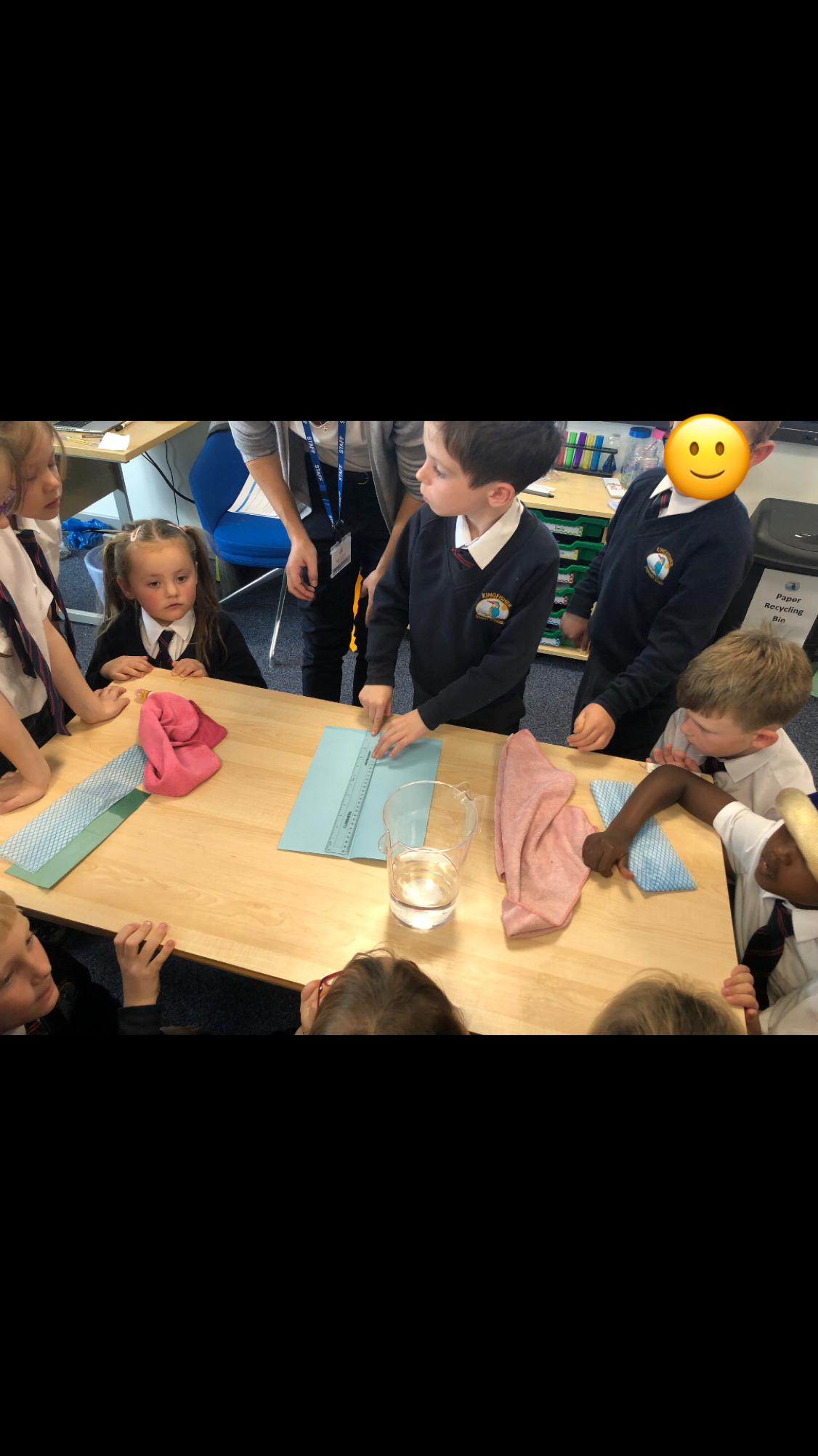 In Science today, we were testing the absorbency of a range of materials to find out which material would be best to clean up a spillage. We tested paper, fabric, paper towels and cloth. Before conducting out test the children made their predictions. We spoke about the importance of a fair test and only changing one thing. In this instance, we changed the material we were testing and kept everything else the same. To test the absorbency of the materials we dipped each material in a jug of water for 1 minute. We then measured how high up the water was absorbed on each material using a ruler. We found out that the most absorbent material was the fabric.