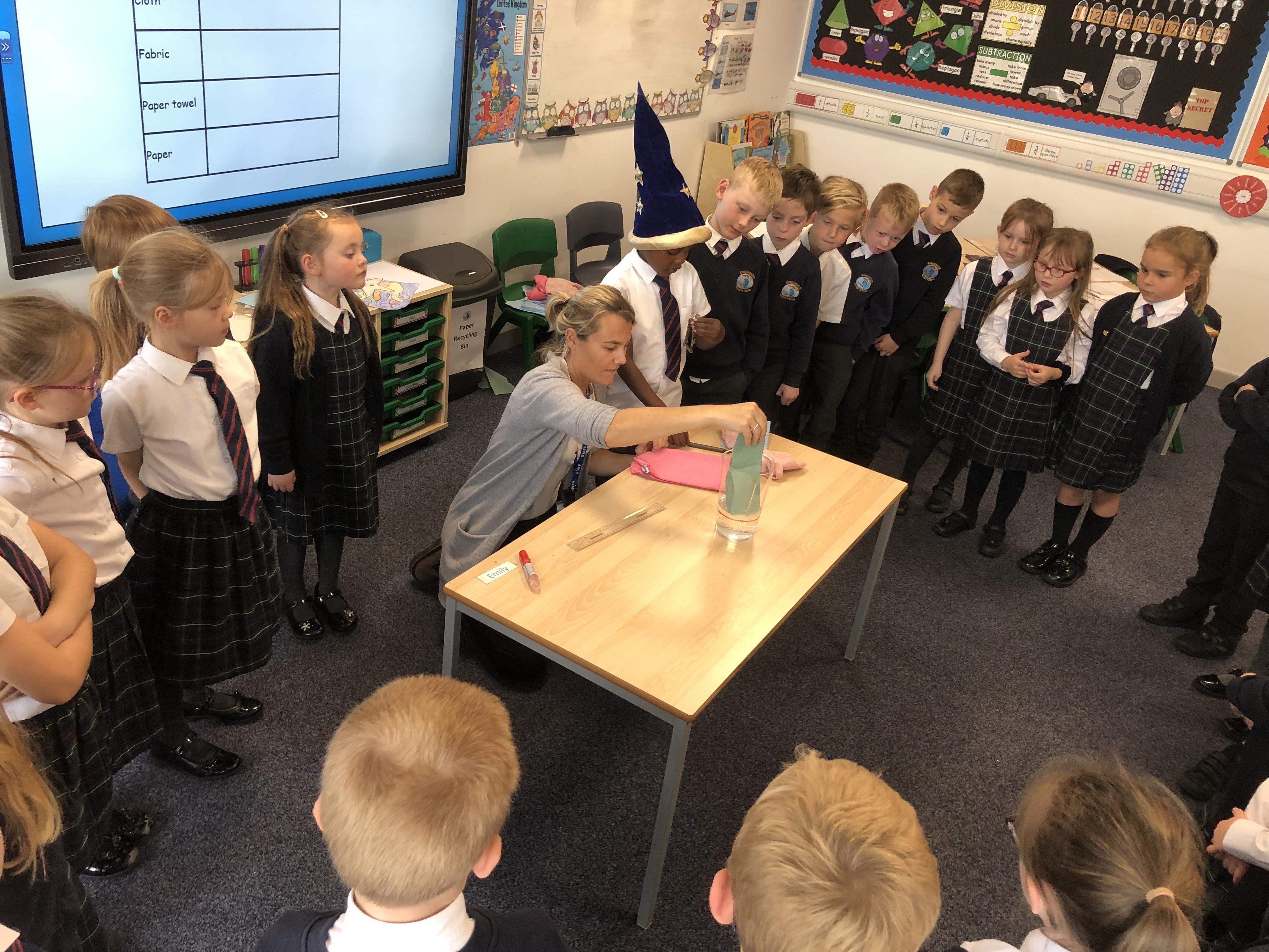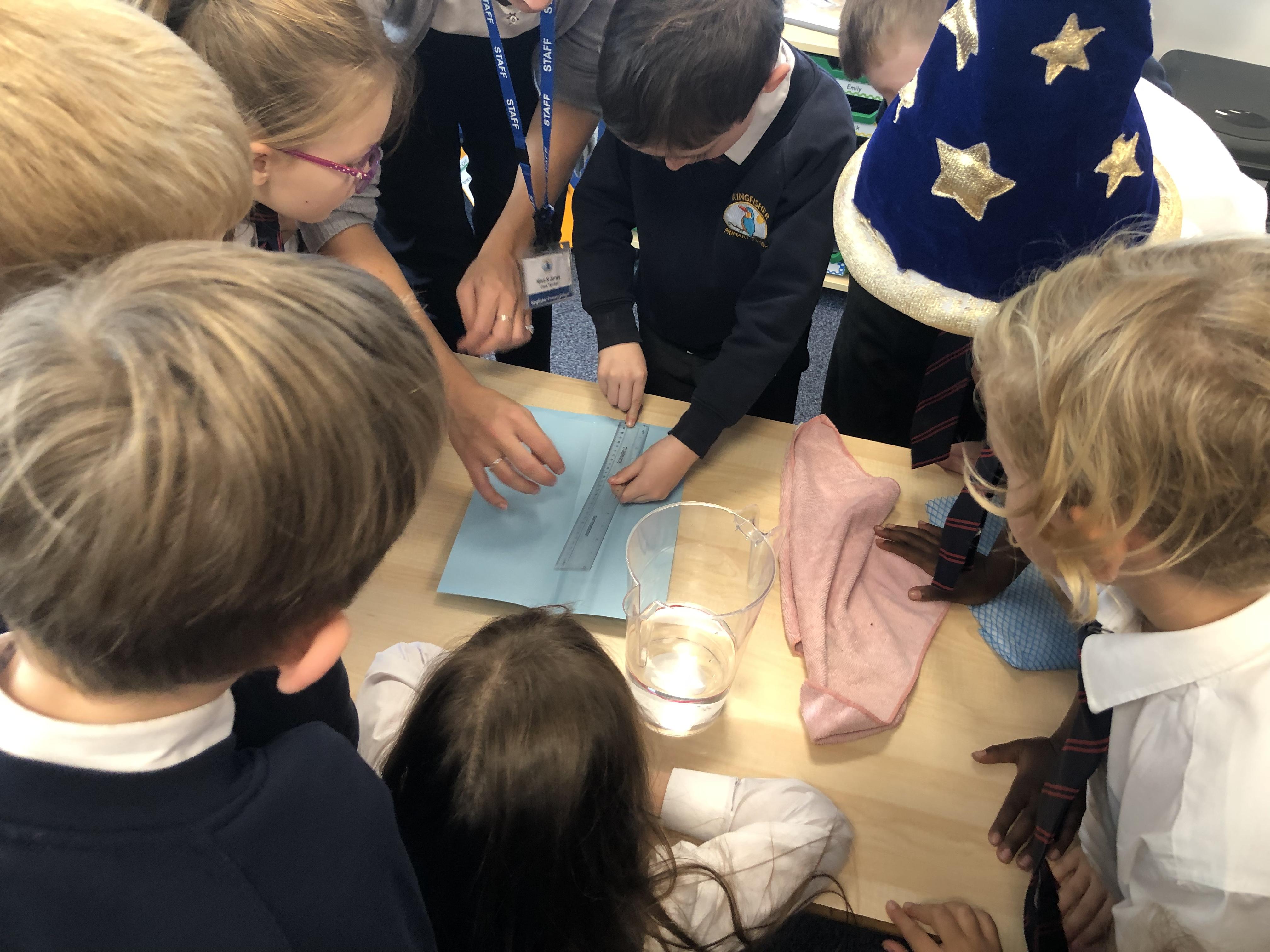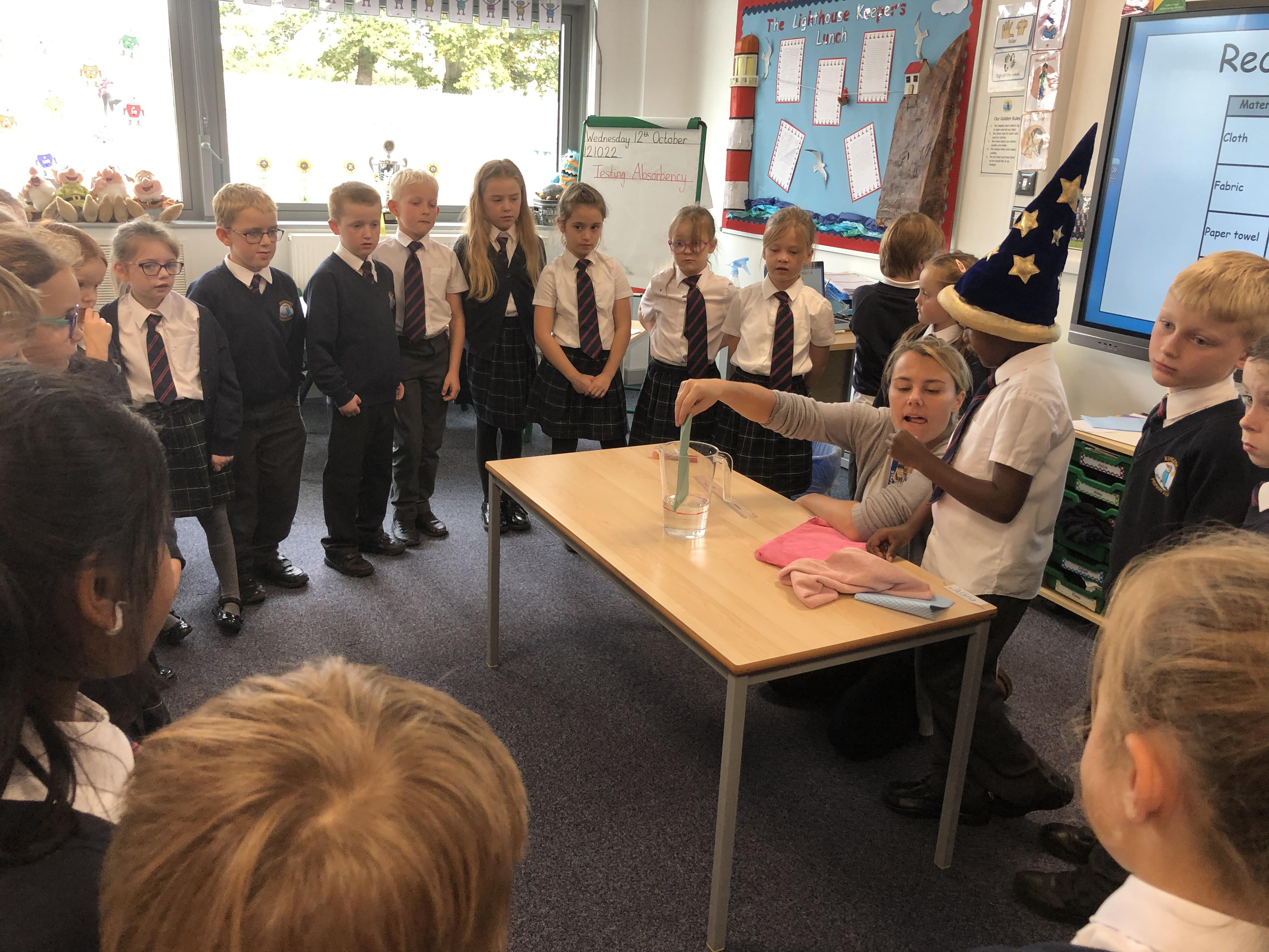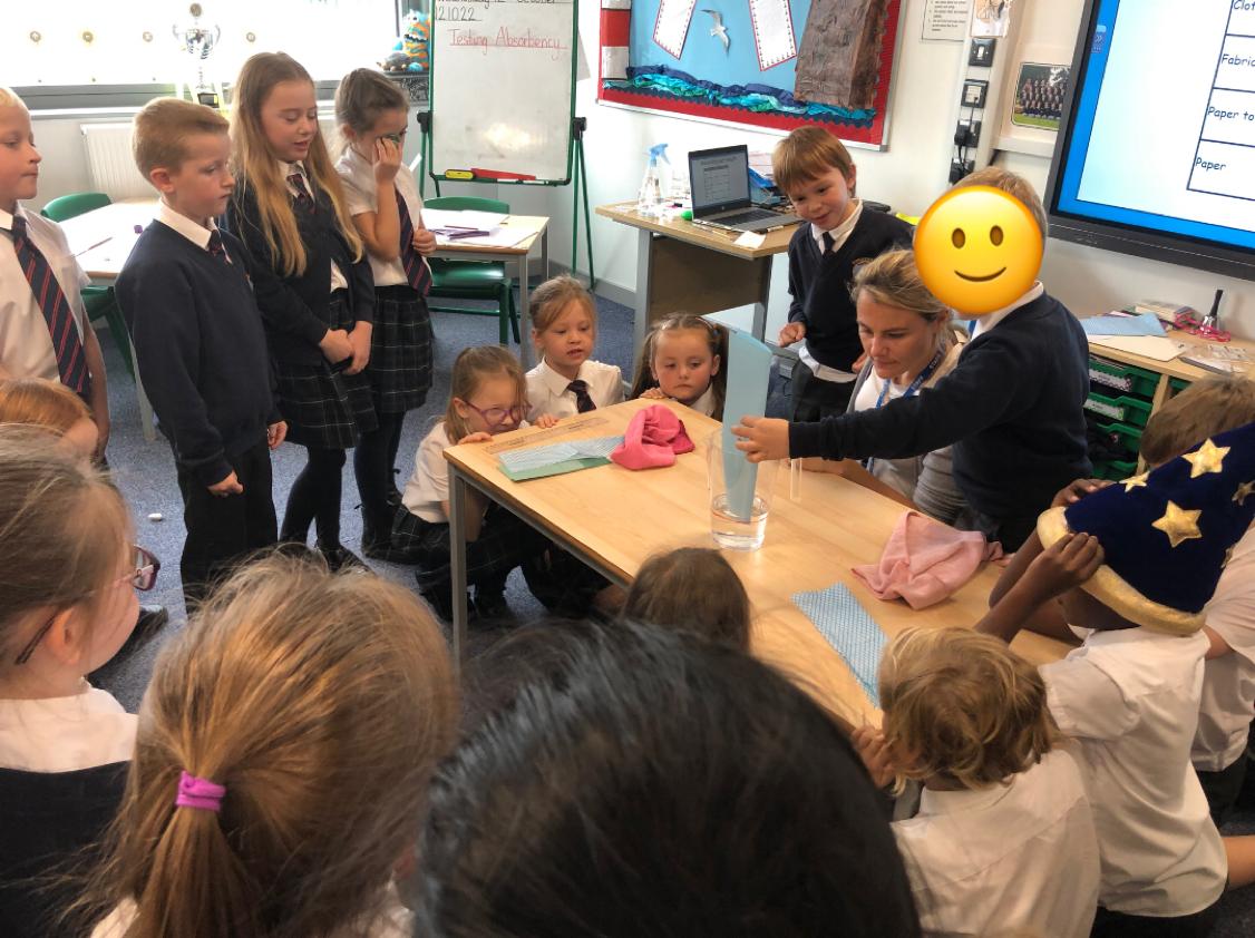 In Science today, we were testing the absorbency of a range of materials to find out which material would be best to clean up a spillage. We tested paper, fabric, paper towels and cloth. Before conducting out test the children made their predictions. We spoke about the importance of a fair test and only changing one thing. In this instance, we changed the material we were testing and kept everything else the same. To test the absorbency of the materials we dipped each material in a jug of water for 1 minute. We then measured how high up the water was absorbed on each material using a ruler. We found out that the most absorbent material was the fabric.