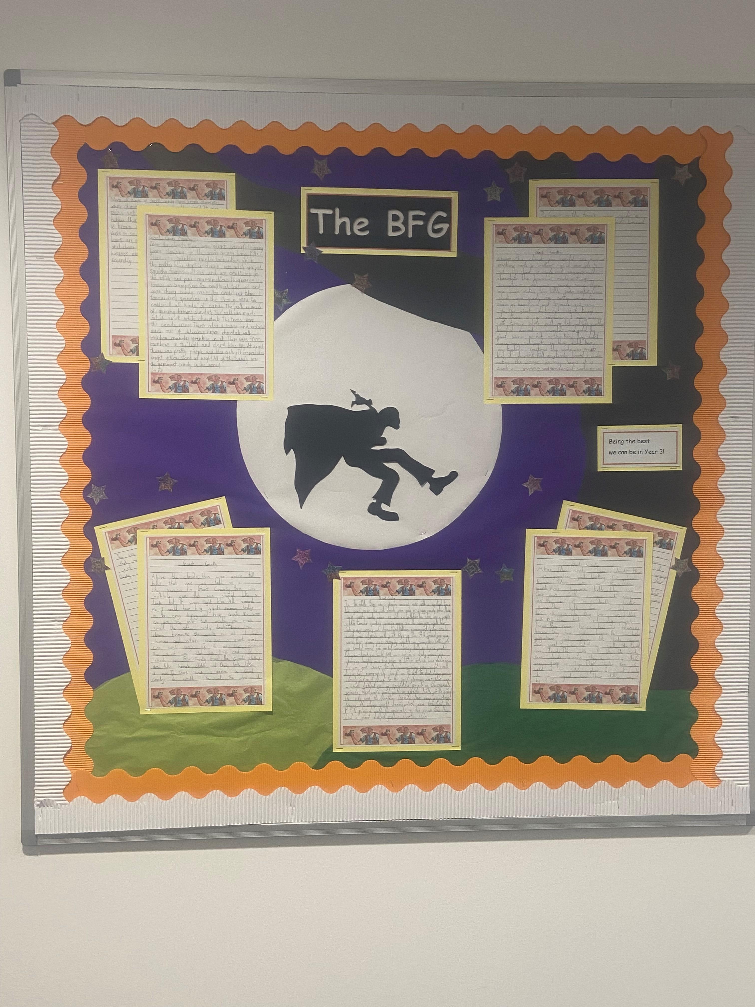 Otter Class have worked incredibly hard with their narrative writing this term and have been working hard to create their own setting descriptions based on the wonderful work by Roald Dahl's BFG. The children have loved learning about Roald Dahl so far this year and have enjoyed exploring his different texts, including designing and creating their own chocolate bars inspired by Willy Wonka and looking at some of his poetry when looking at The Pig poem. The children loved practising their beautiful handwriting and worked incredibly hard when publishing their final pieces onto bordered paper to create these amazing displays. Thank you to Miss Wolny for her talented BFG template for this display in the corridor too! Amazing work done by all.