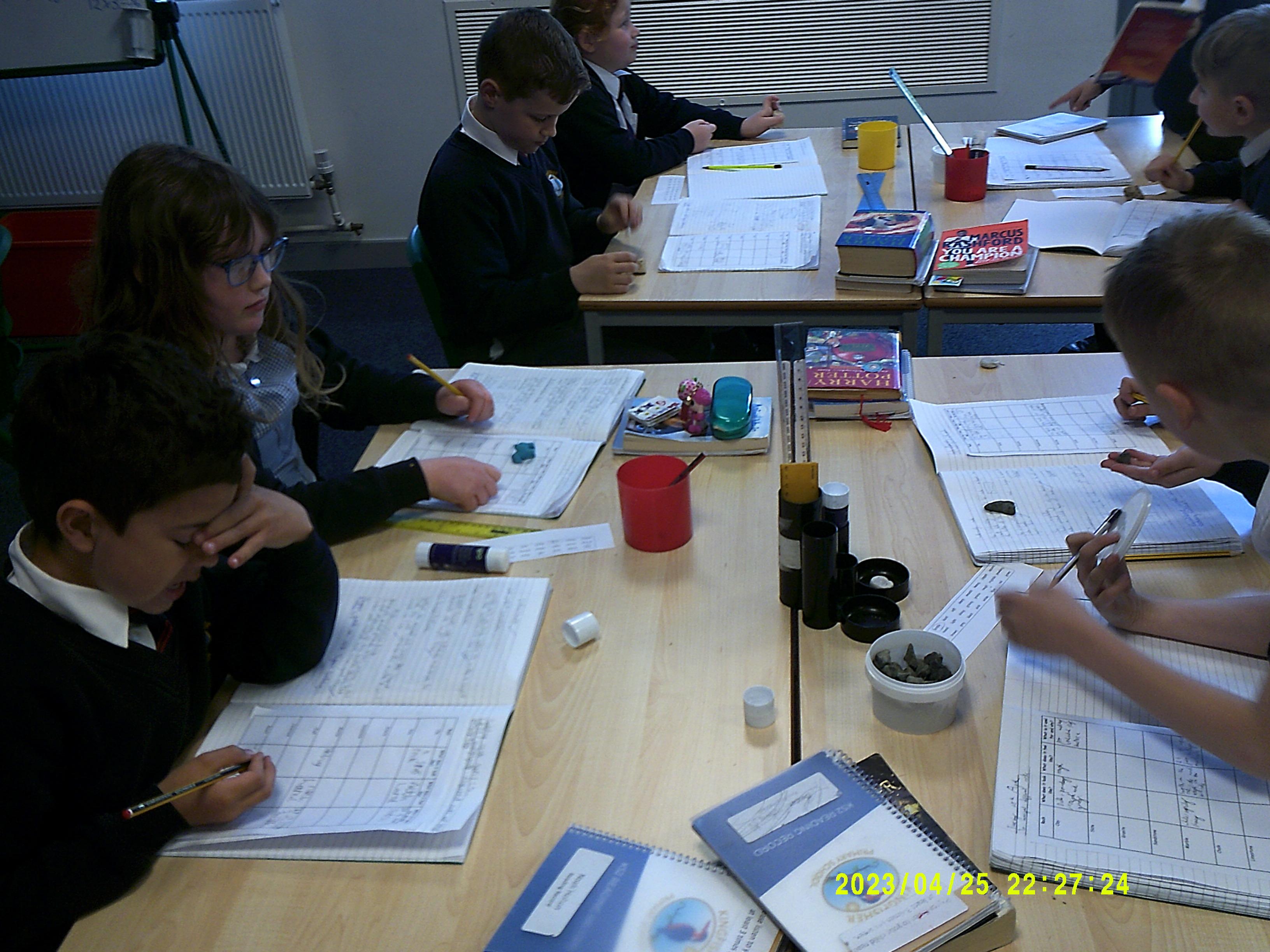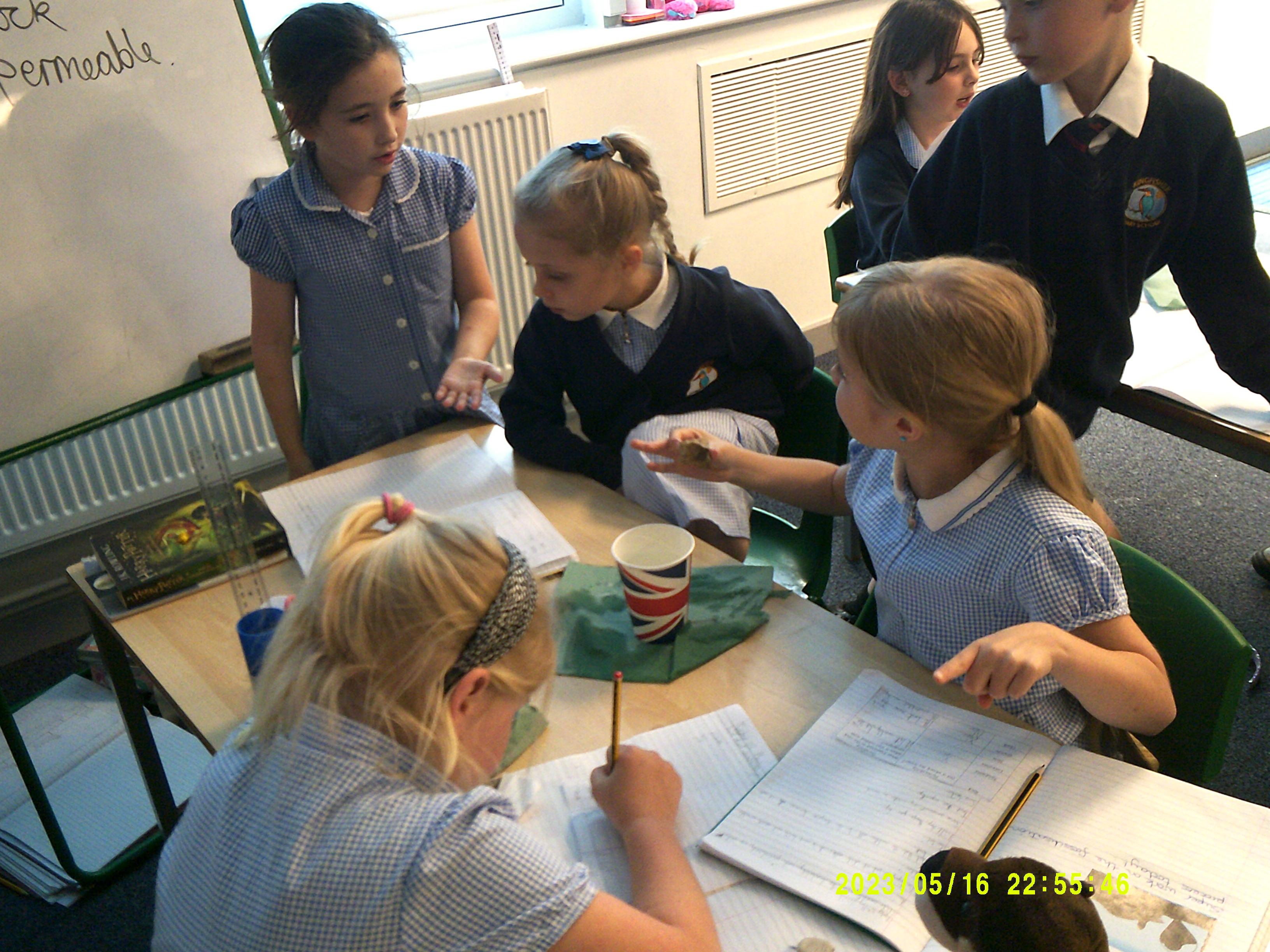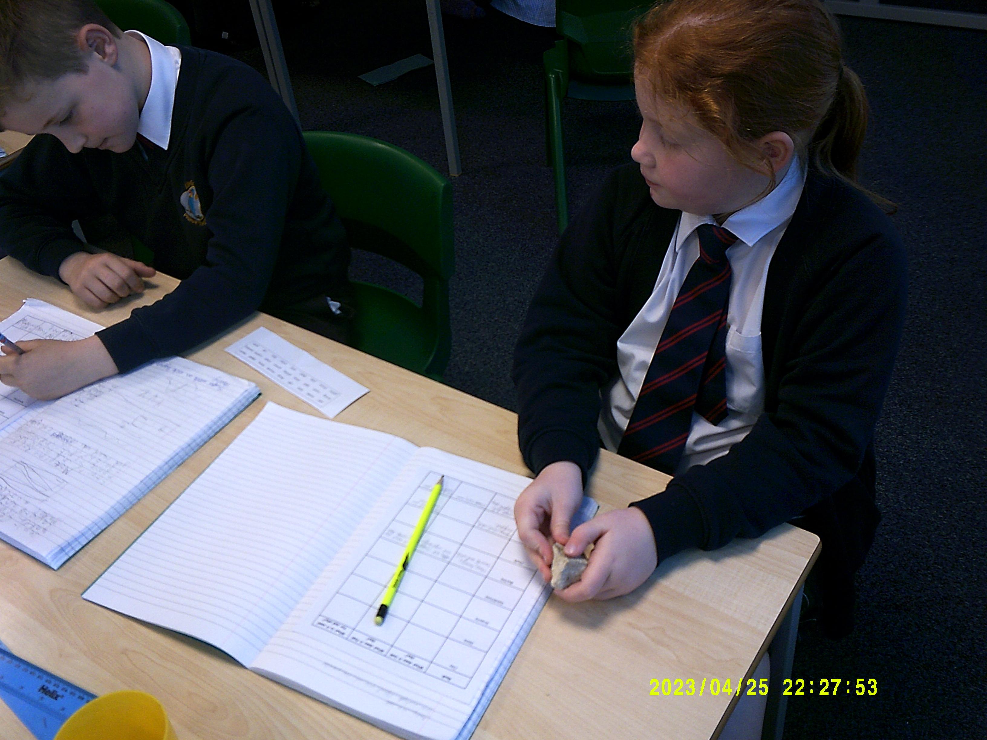 Today, we spent some more time investigating our different rocks. We worked in small groups to test the durability and permeability of the different rocks. The children showed great maturity when investigating and found that the slate and granite were the most durable with chalk as the least but chalk was the most permeable and absorbed the most water in.