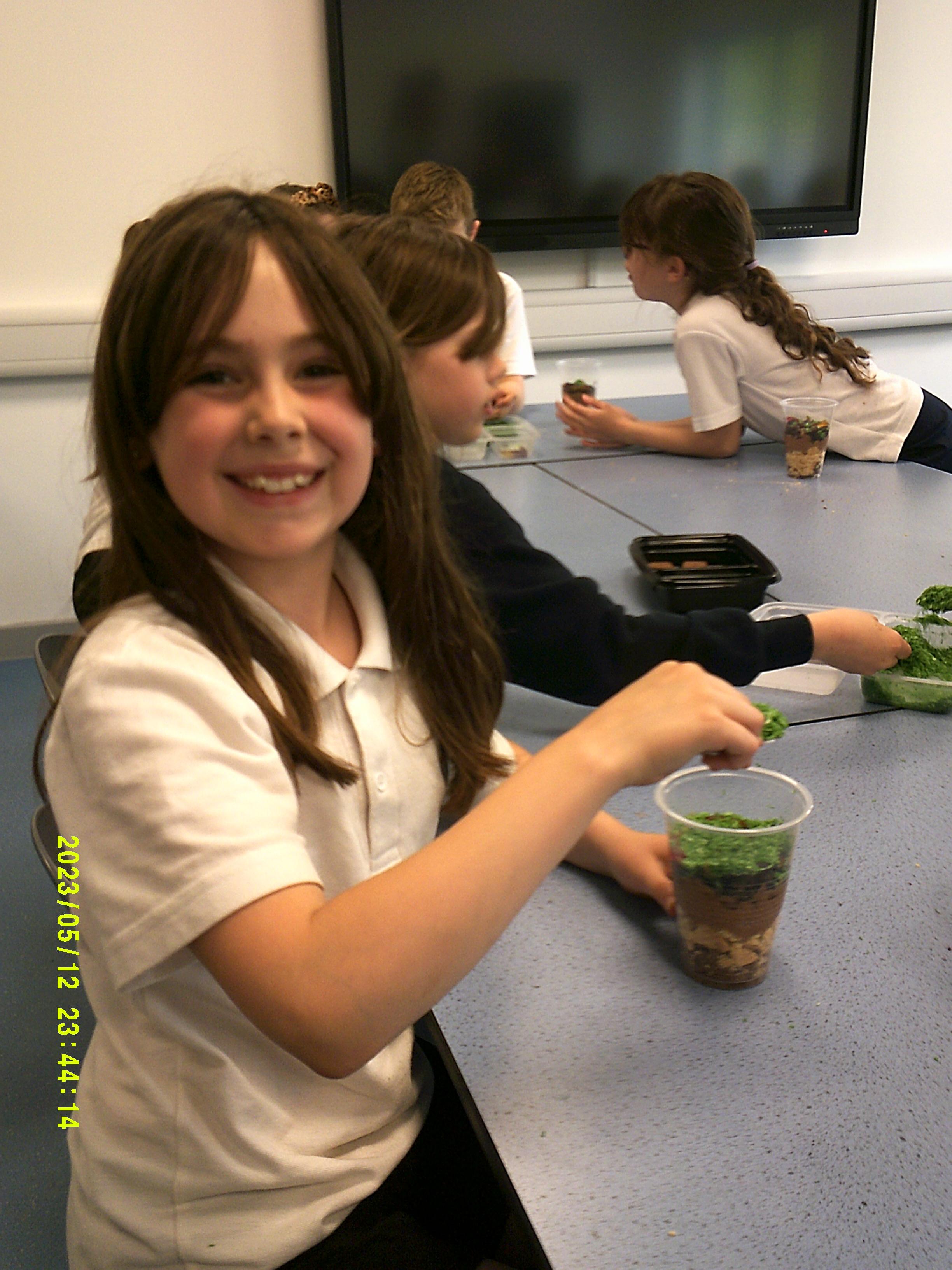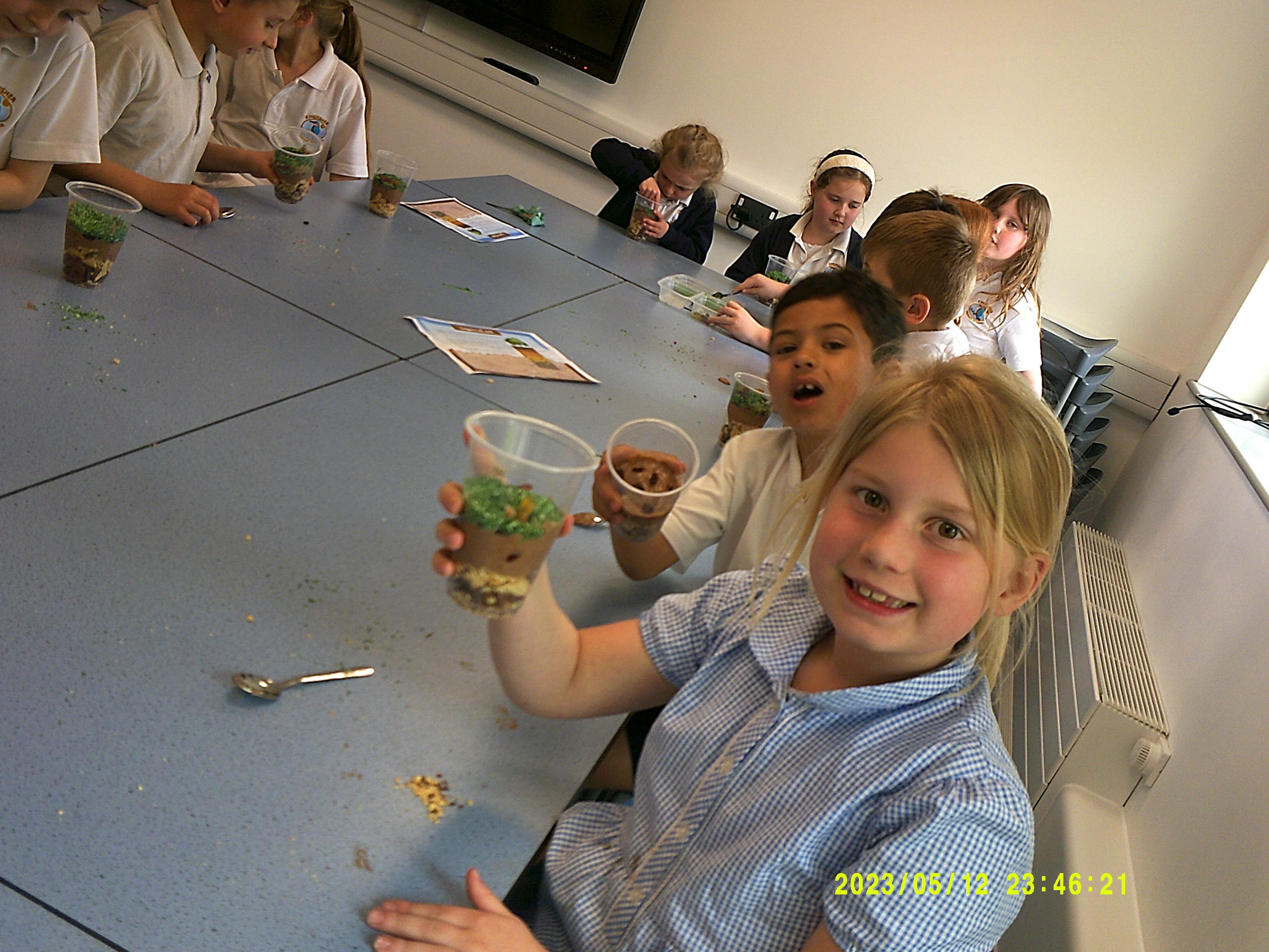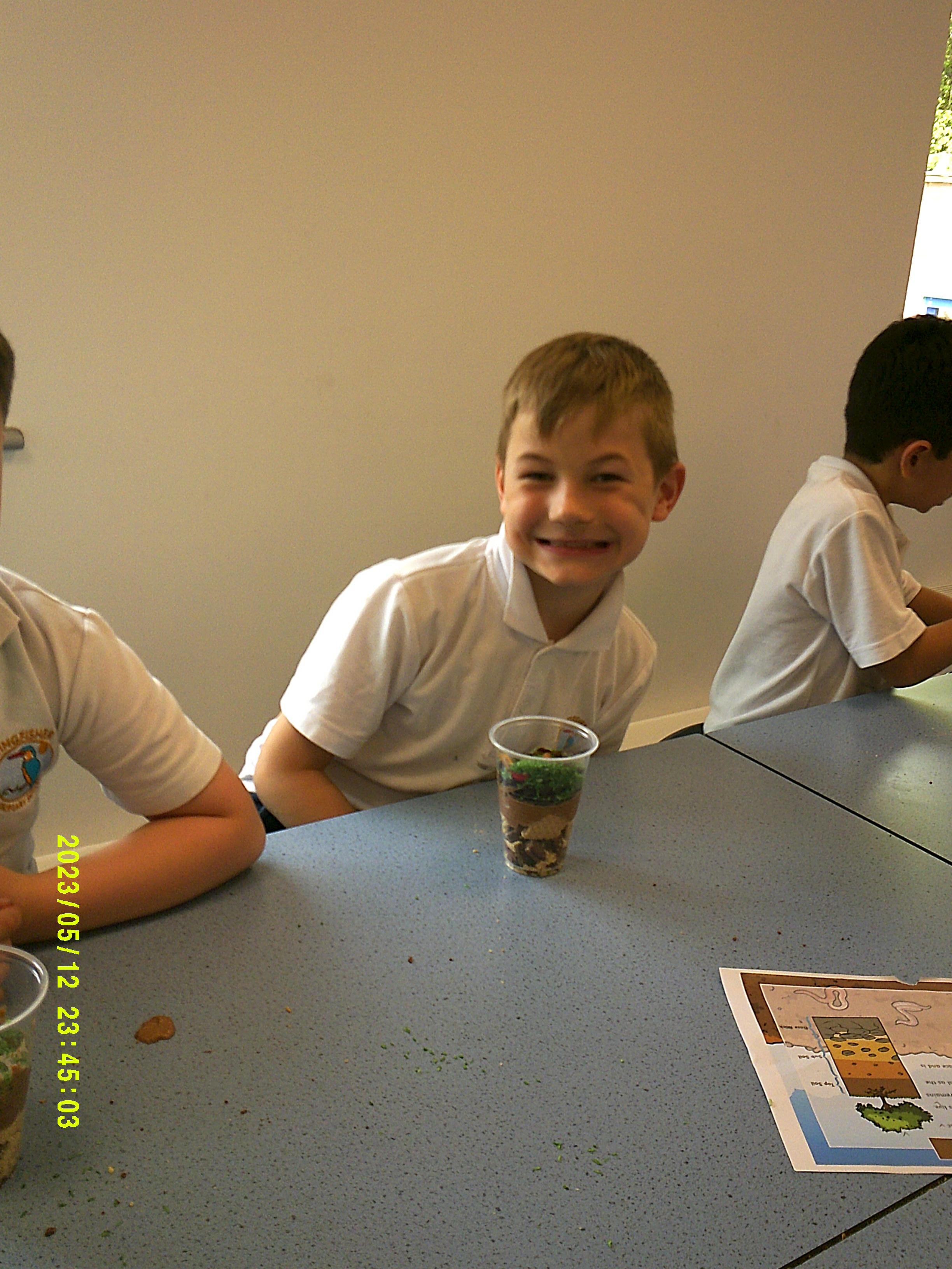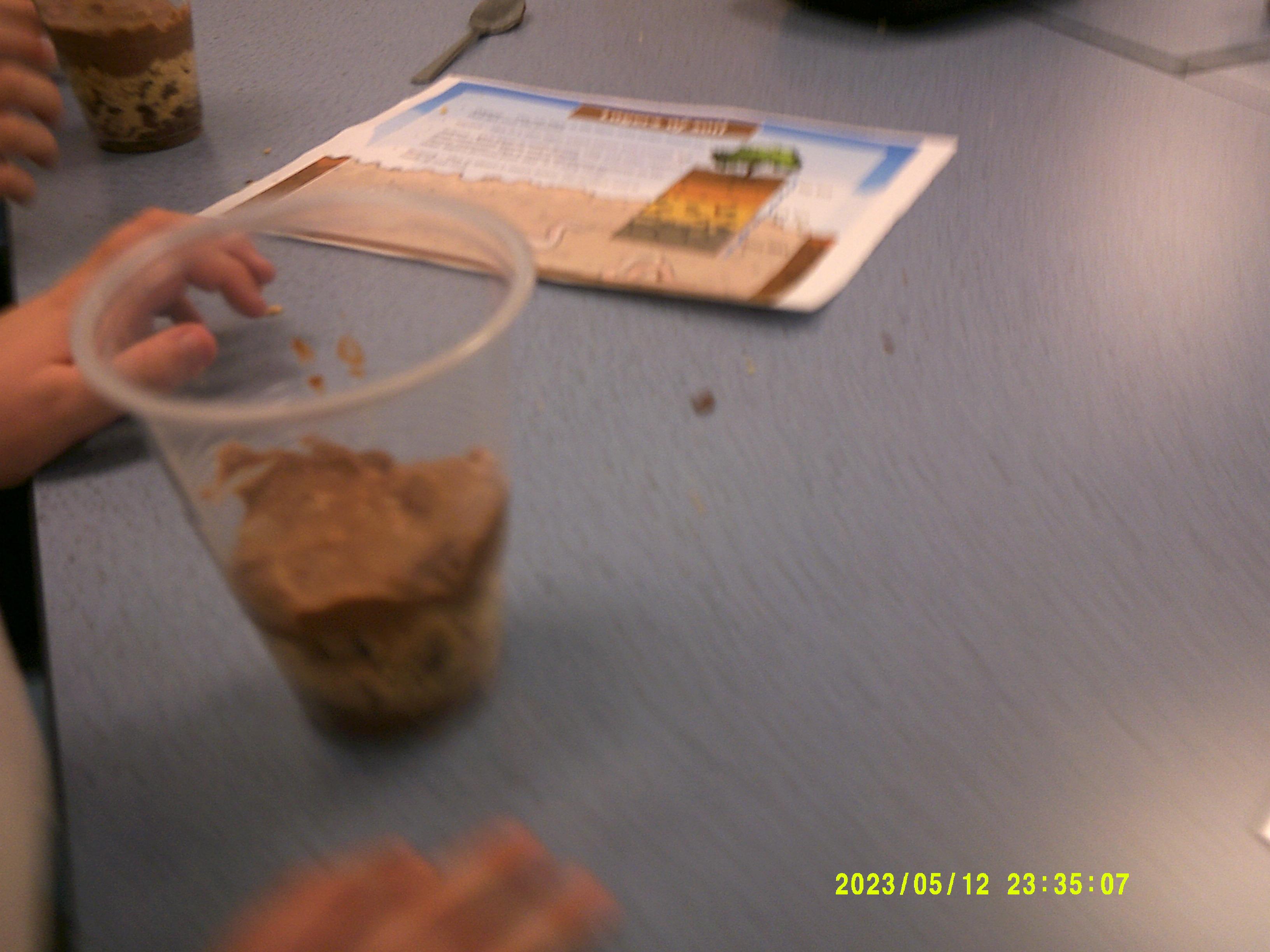 Today, we had a great time making edible layers of soil as part of our rocks and soils topic. The children loved adding Bedrock (bourbons), the parent material (the parents' favourite digestives) , adding sticky sub soil (chocolate angel whip), then top soil (in the form of raisins) was put on top before adding our wriggly gummy worms who lived there and finally adding the organic material (green coloured coconut)! Great fun was had by all! Well done, Otter Class.