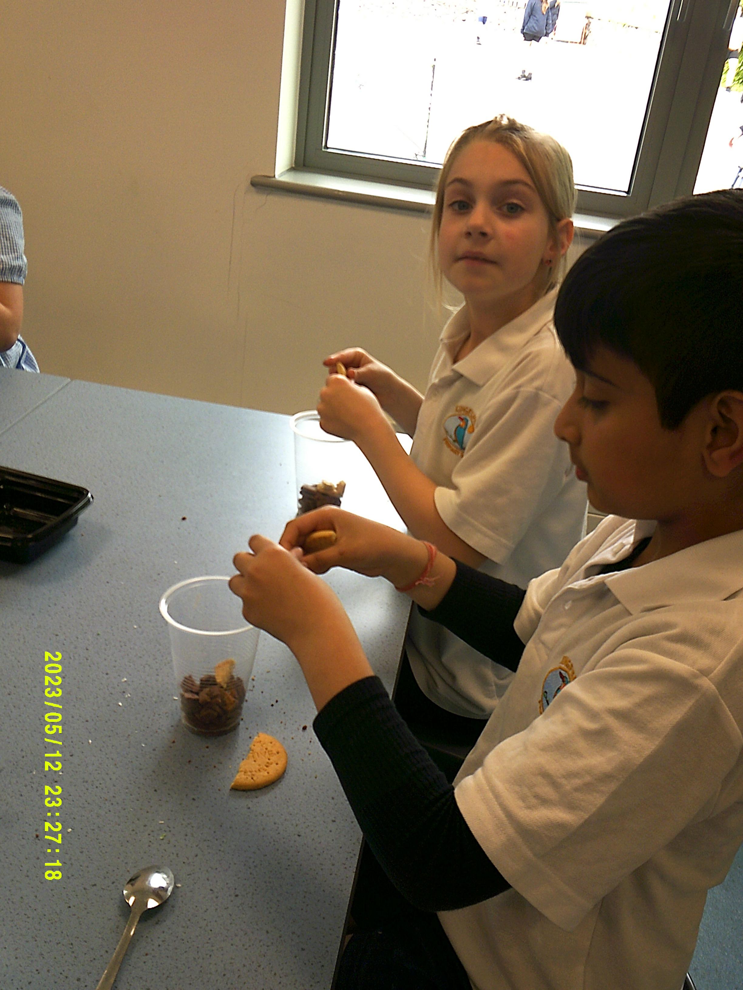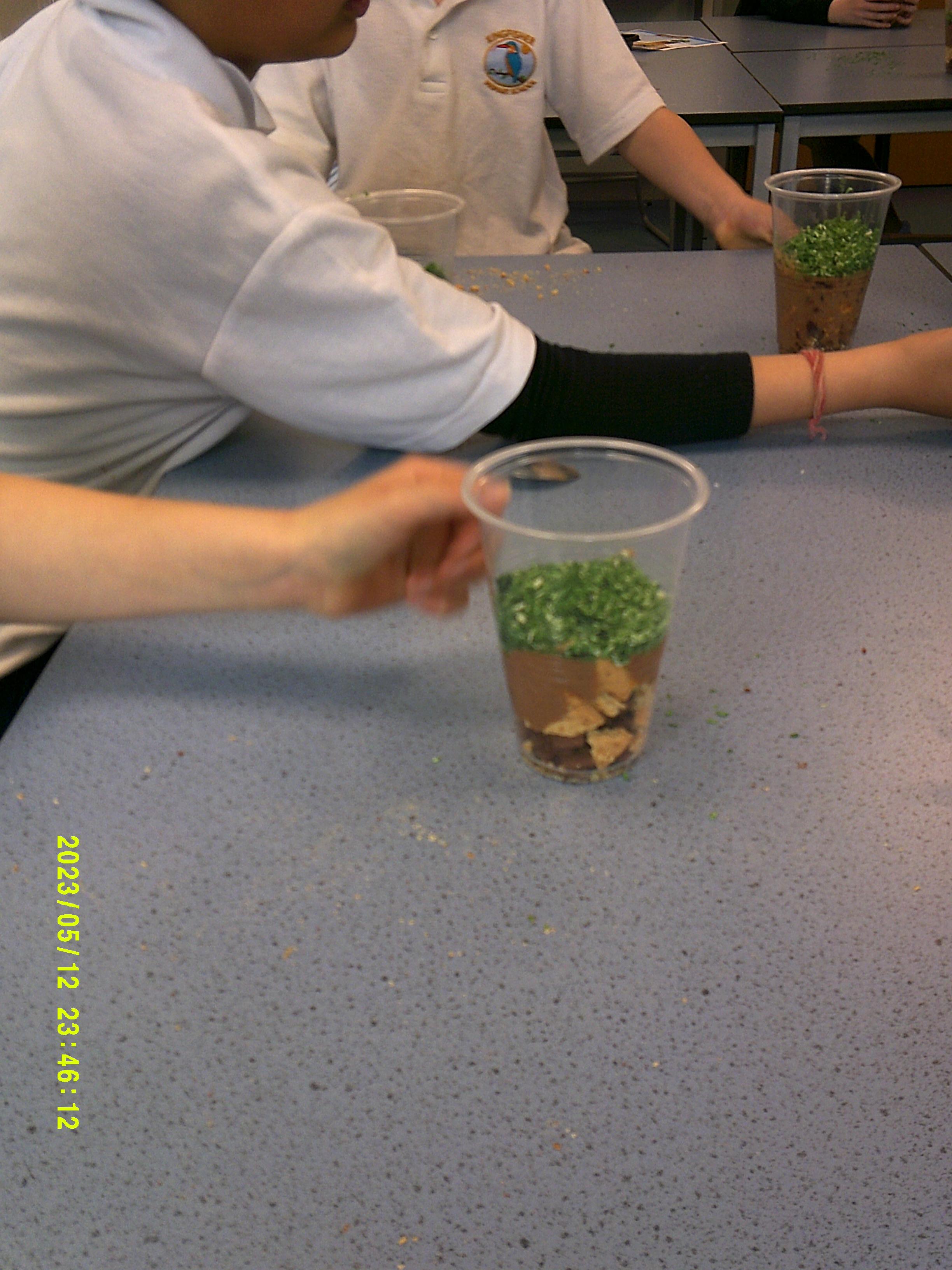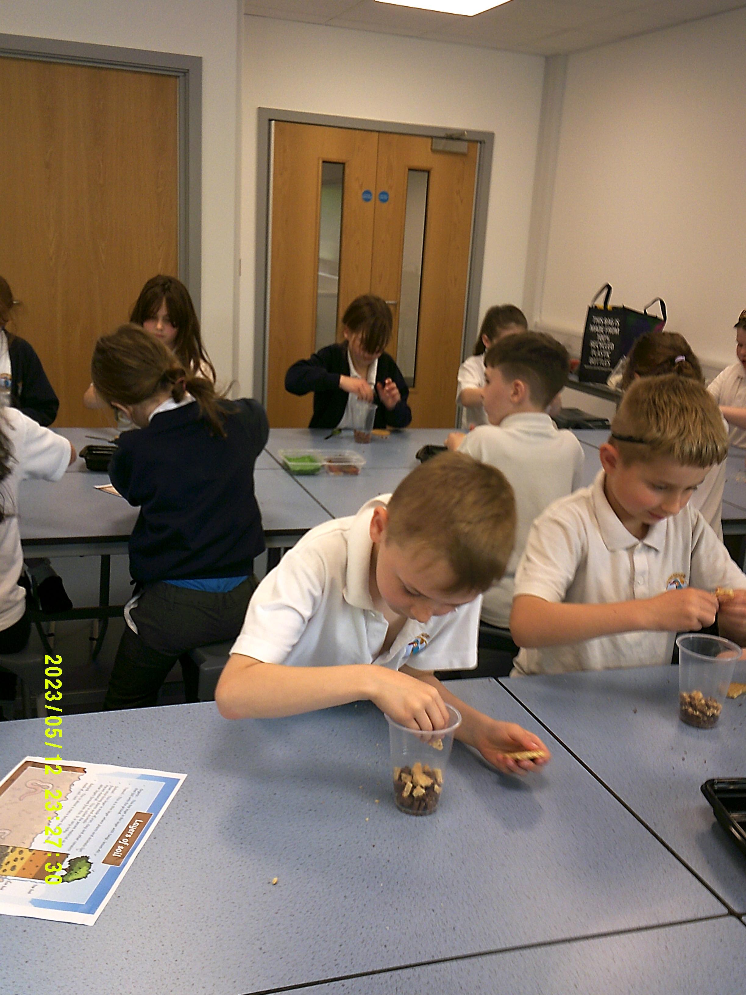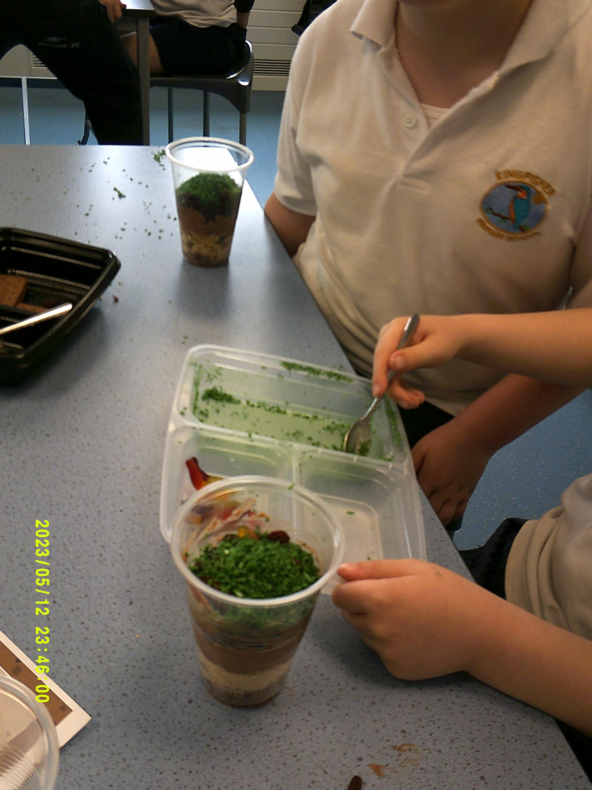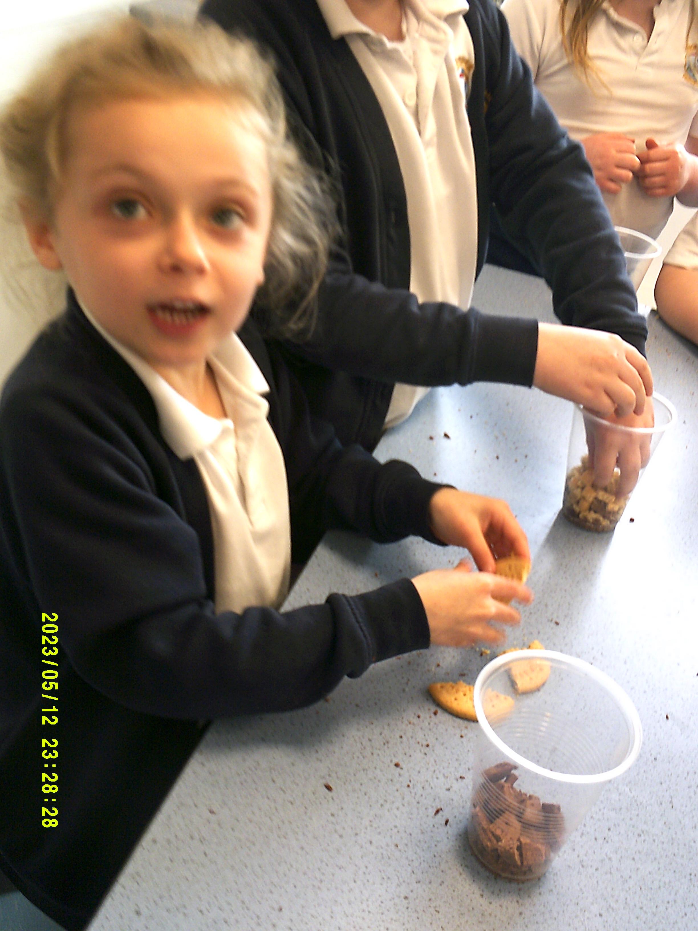 Today, we had a great time making edible layers of soil as part of our rocks and soils topic. The children loved adding Bedrock (bourbons), the parent material (the parents' favourite digestives) , adding sticky sub soil (chocolate angel whip), then top soil (in the form of raisins) was put on top before adding our wriggly gummy worms who lived there and finally adding the organic material (green coloured coconut)! Great fun was had by all! Well done, Otter Class.