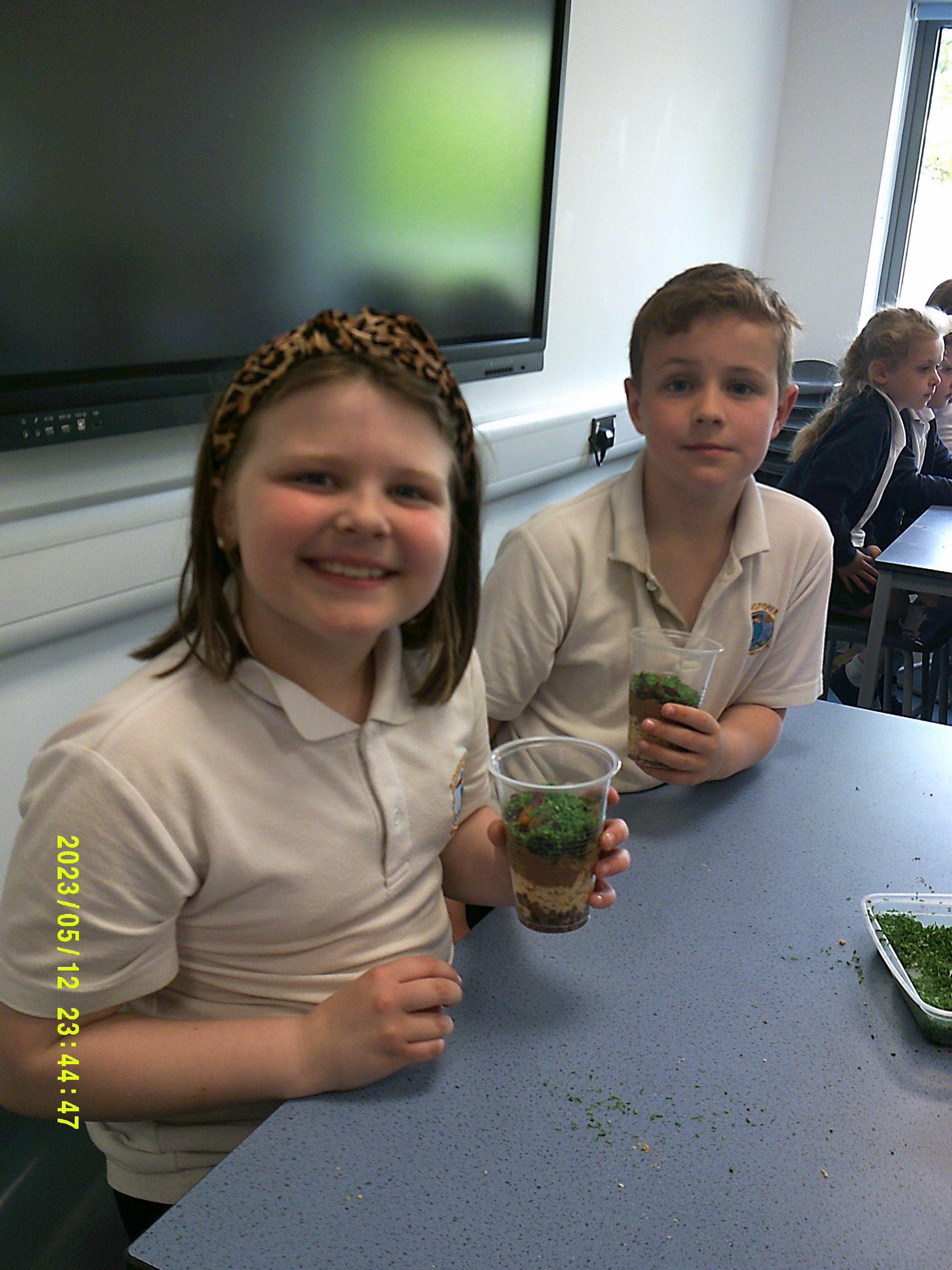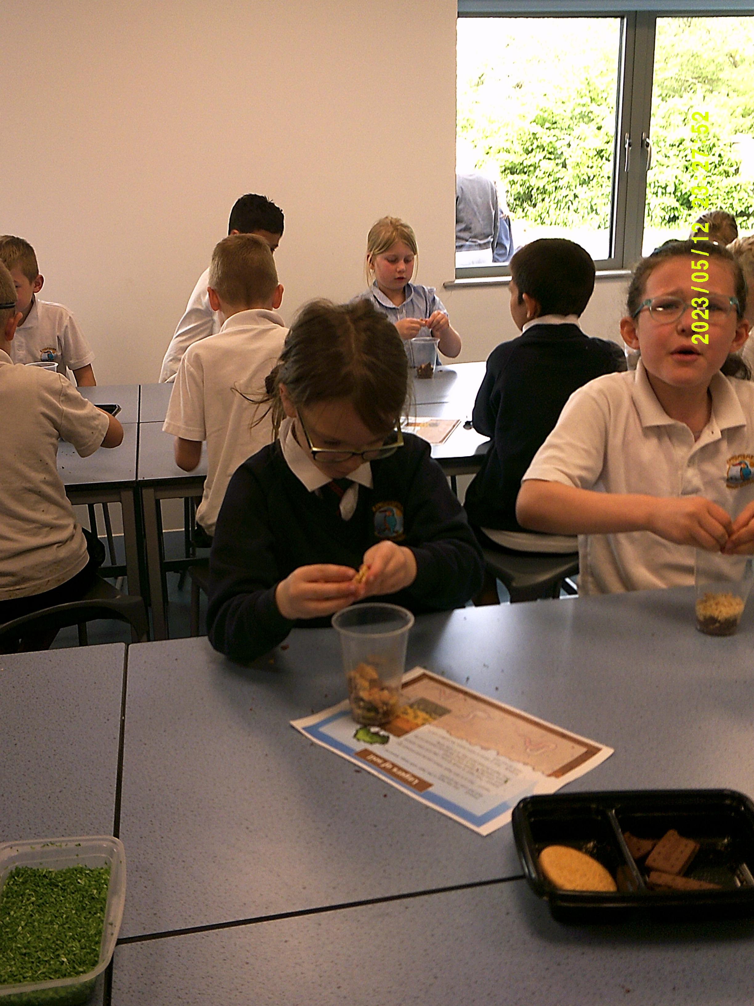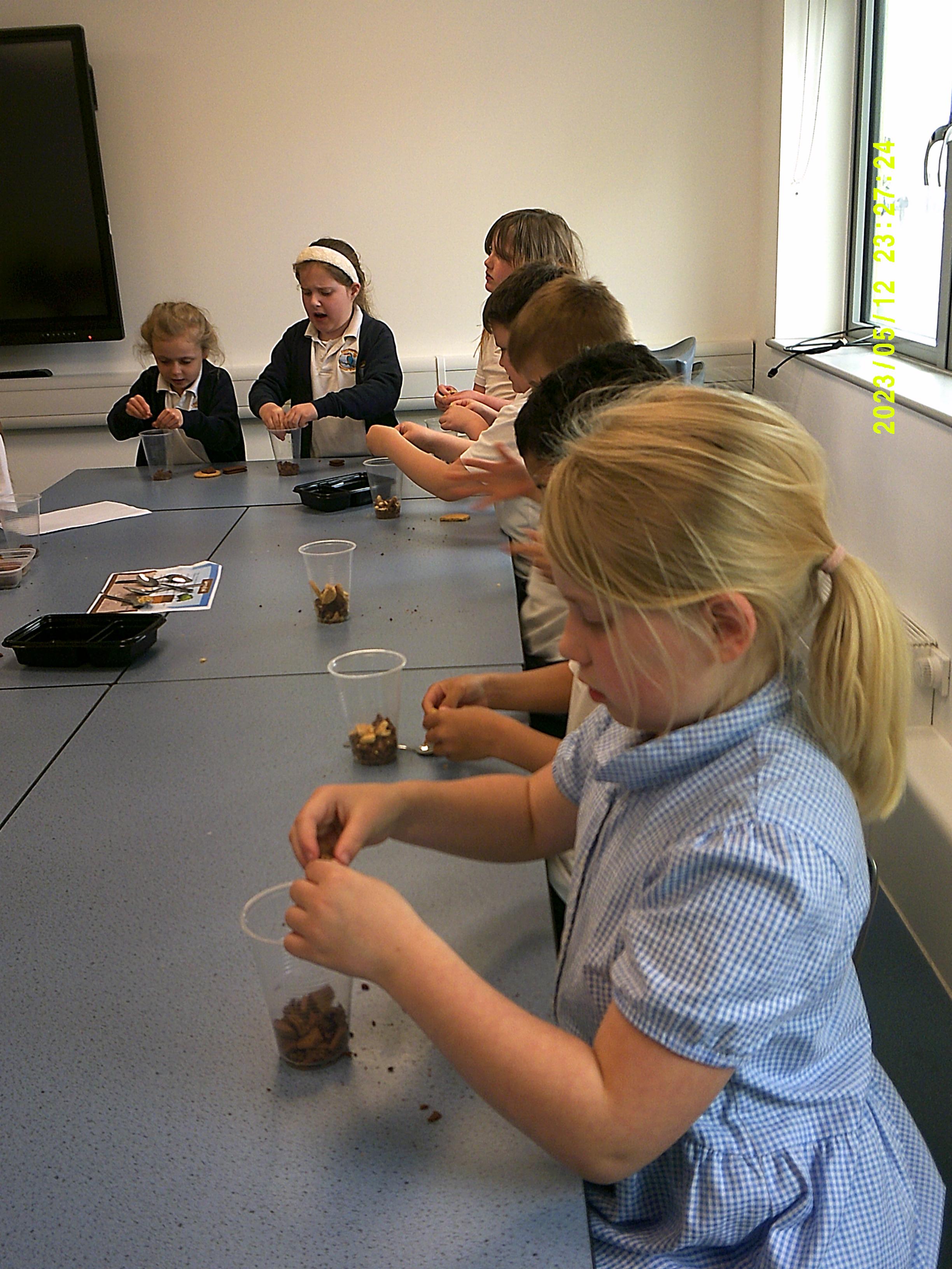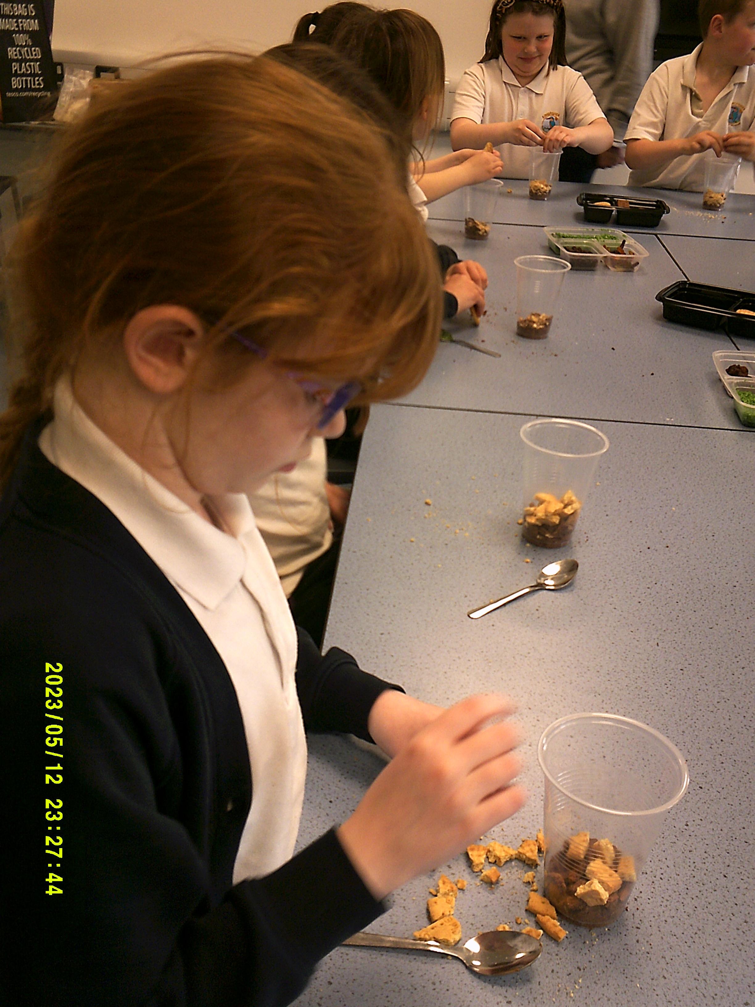 Today, we had a great time making edible layers of soil as part of our rocks and soils topic. The children loved adding Bedrock (bourbons), the parent material (the parents' favourite digestives) , adding sticky sub soil (chocolate angel whip), then top soil (in the form of raisins) was put on top before adding our wriggly gummy worms who lived there and finally adding the organic material (green coloured coconut)! Great fun was had by all! Well done, Otter Class.