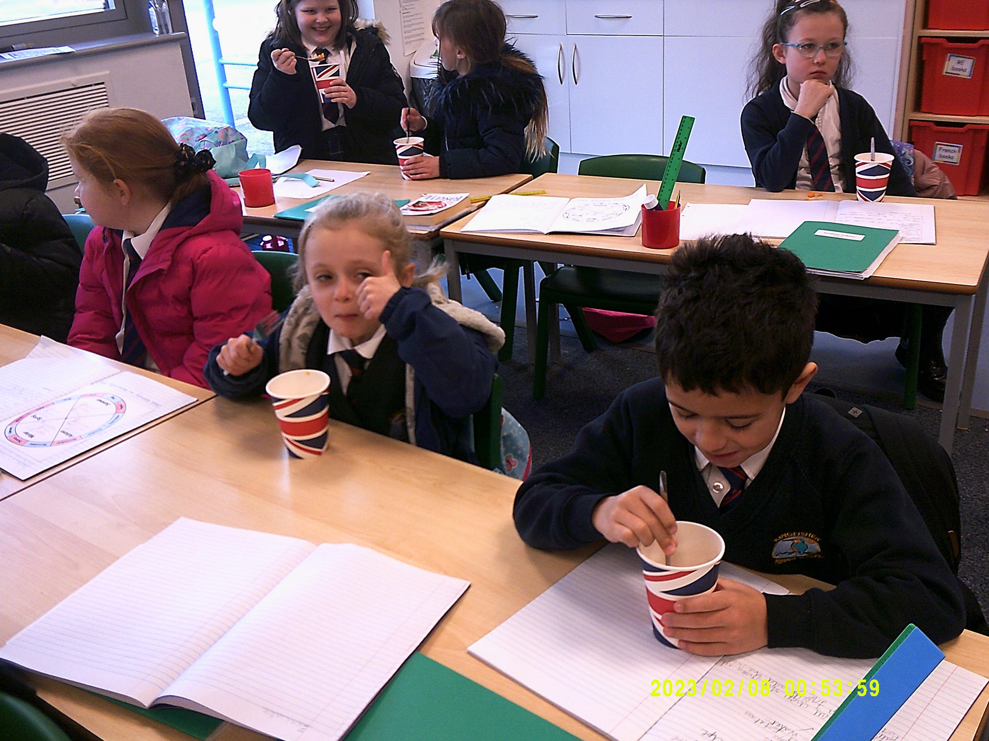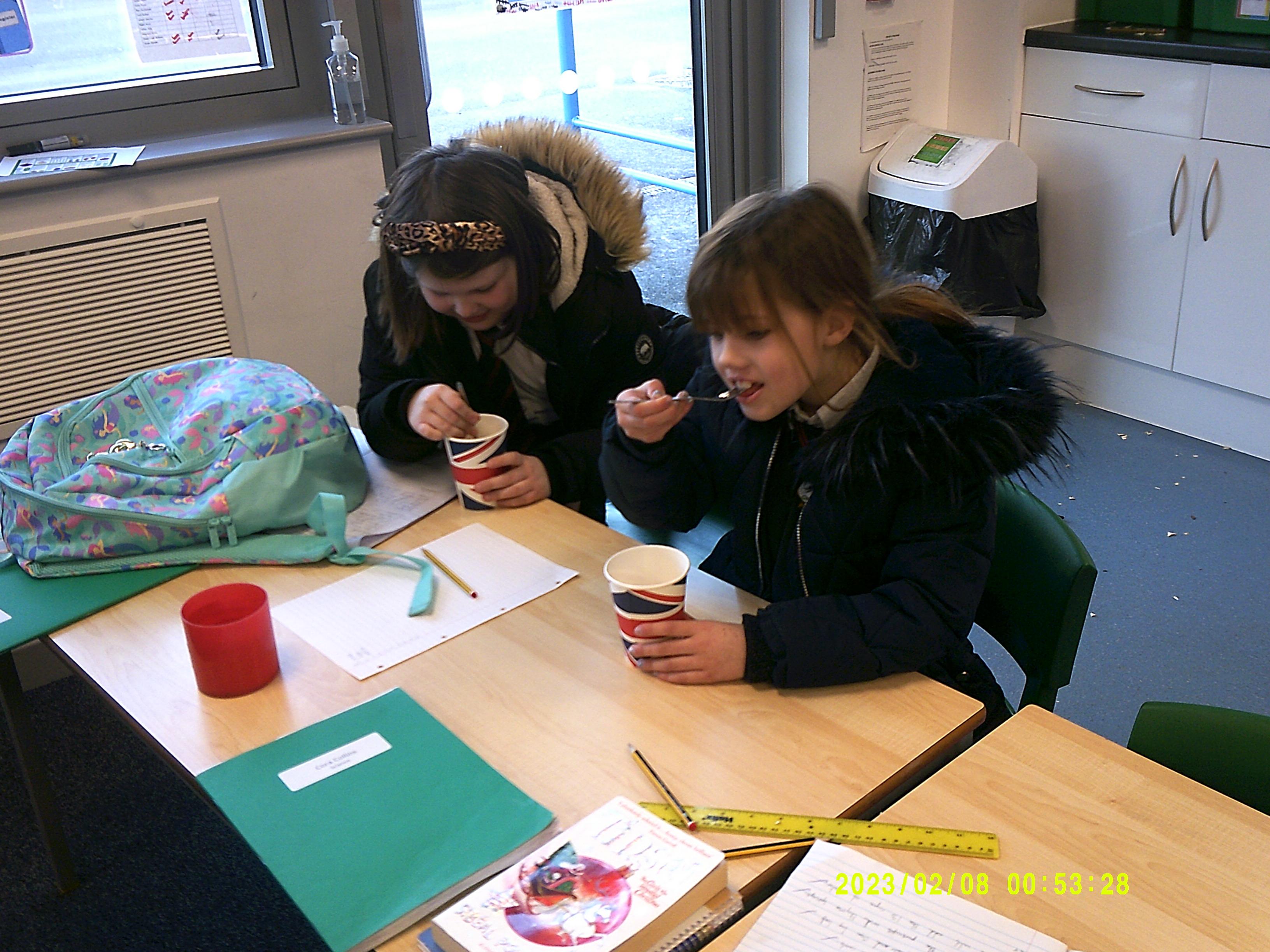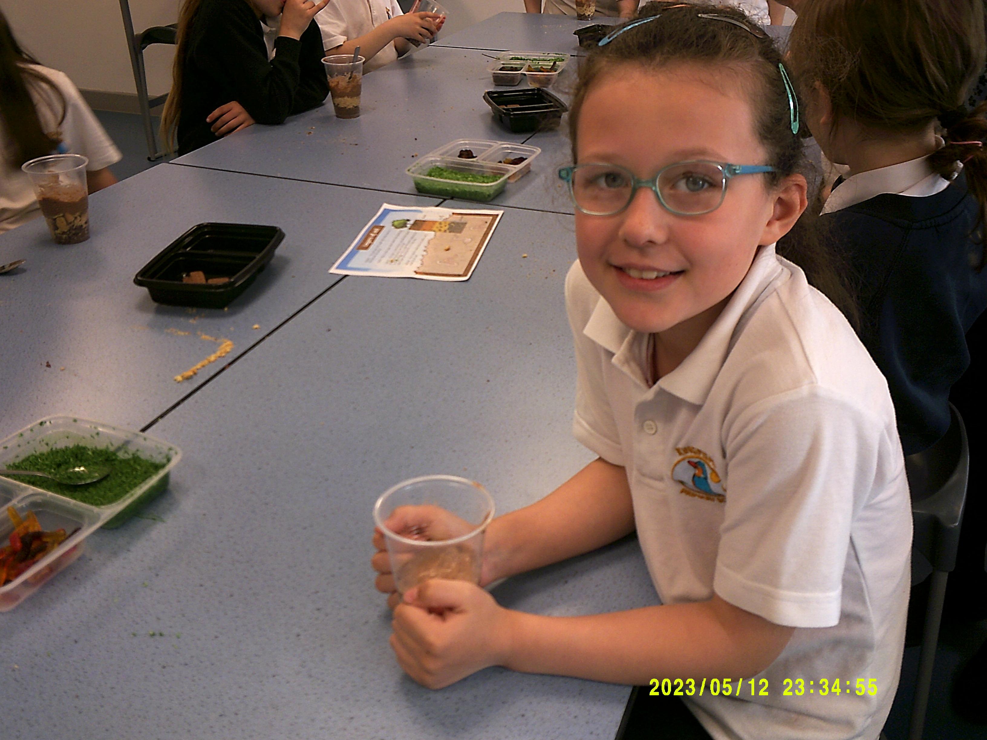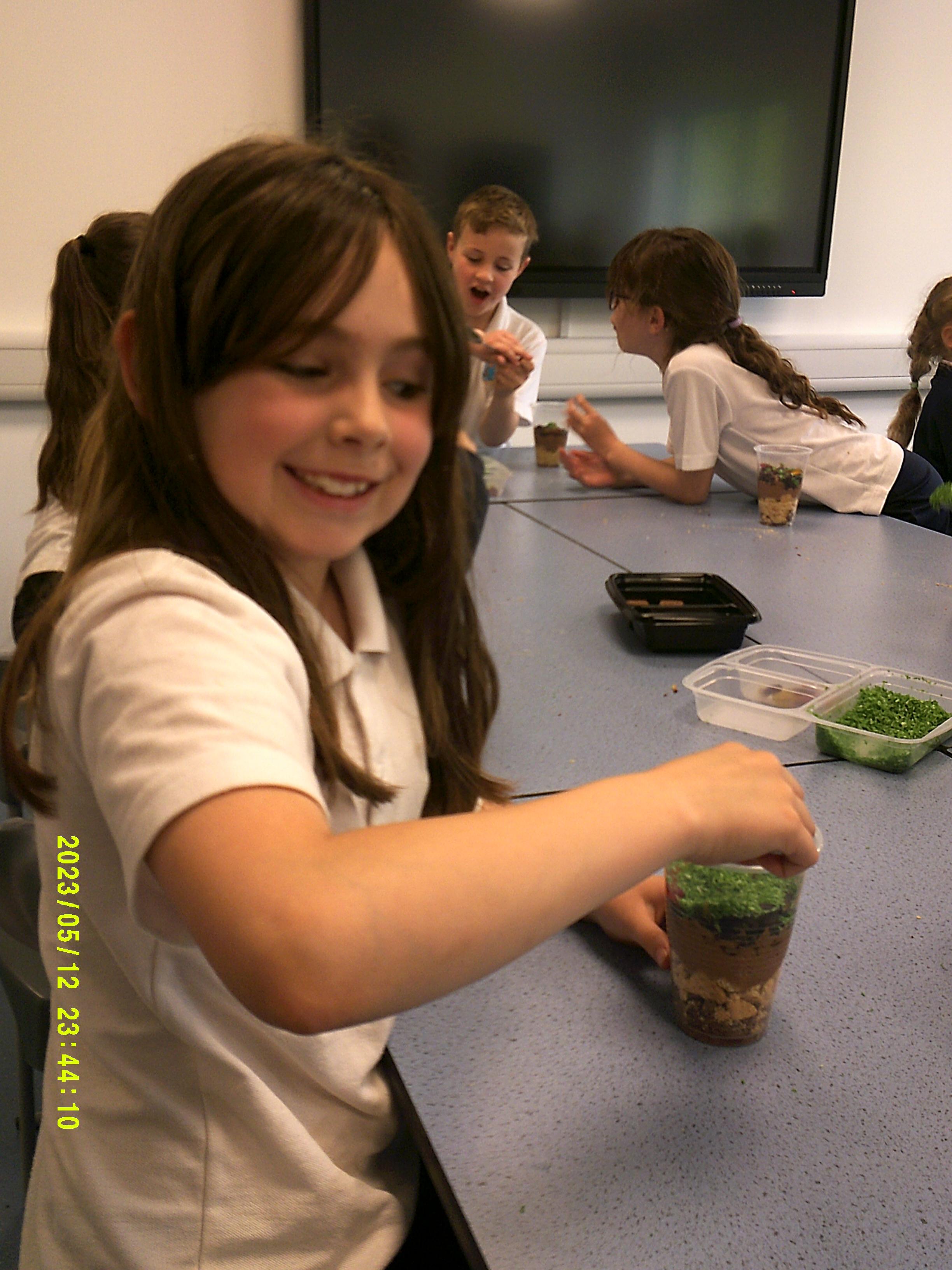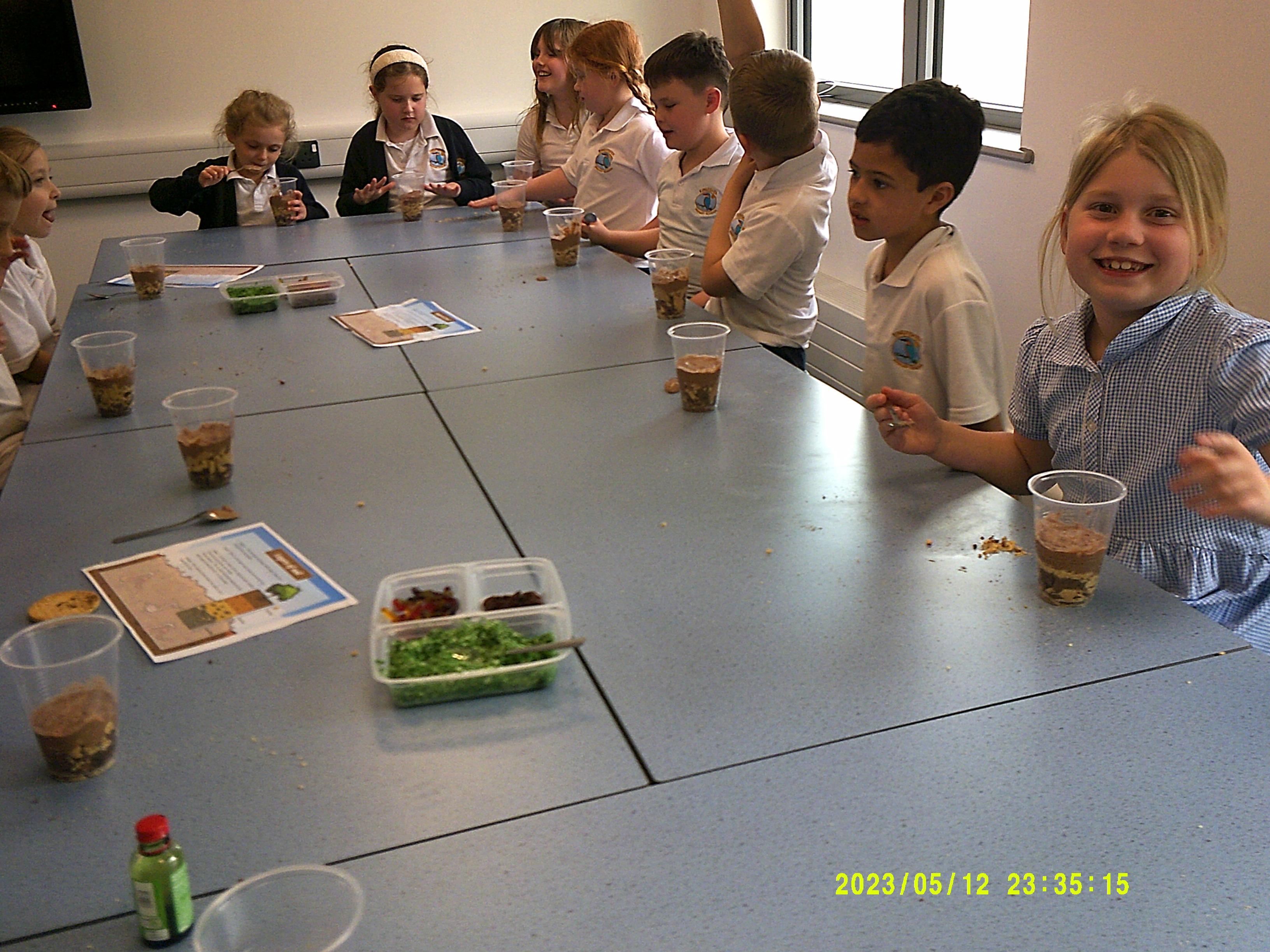 Today, we had a great time making edible layers of soil as part of our rocks and soils topic. The children loved adding Bedrock (bourbons), the parent material (the parents' favourite digestives) , adding sticky sub soil (chocolate angel whip), then top soil (in the form of raisins) was put on top before adding our wriggly gummy worms who lived there and finally adding the organic material (green coloured coconut)! Great fun was had by all! Well done, Otter Class.