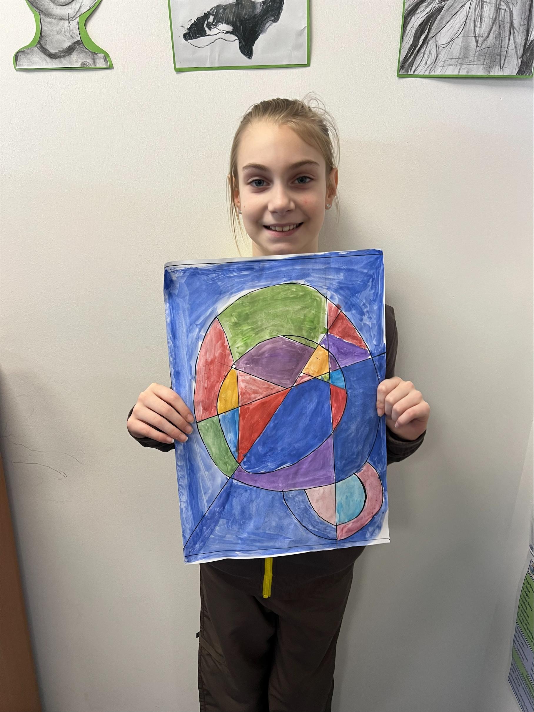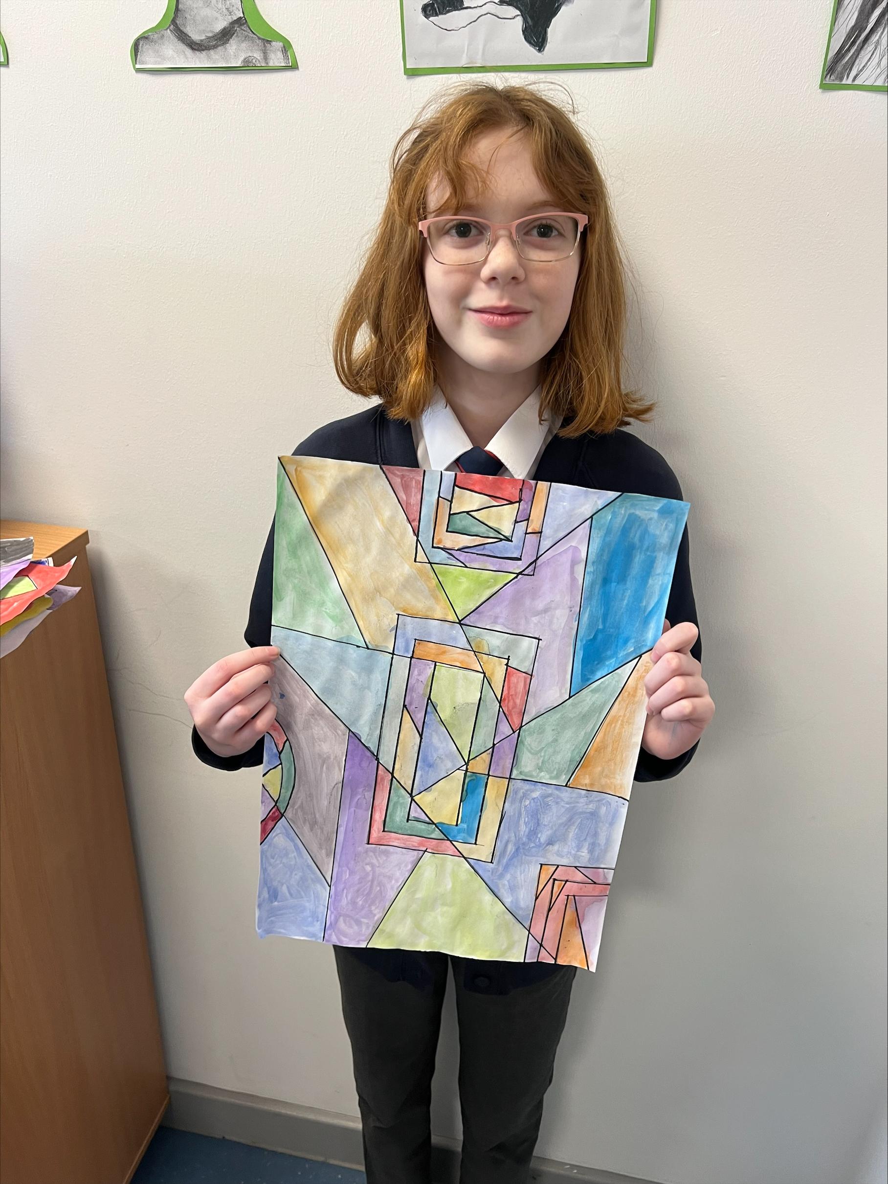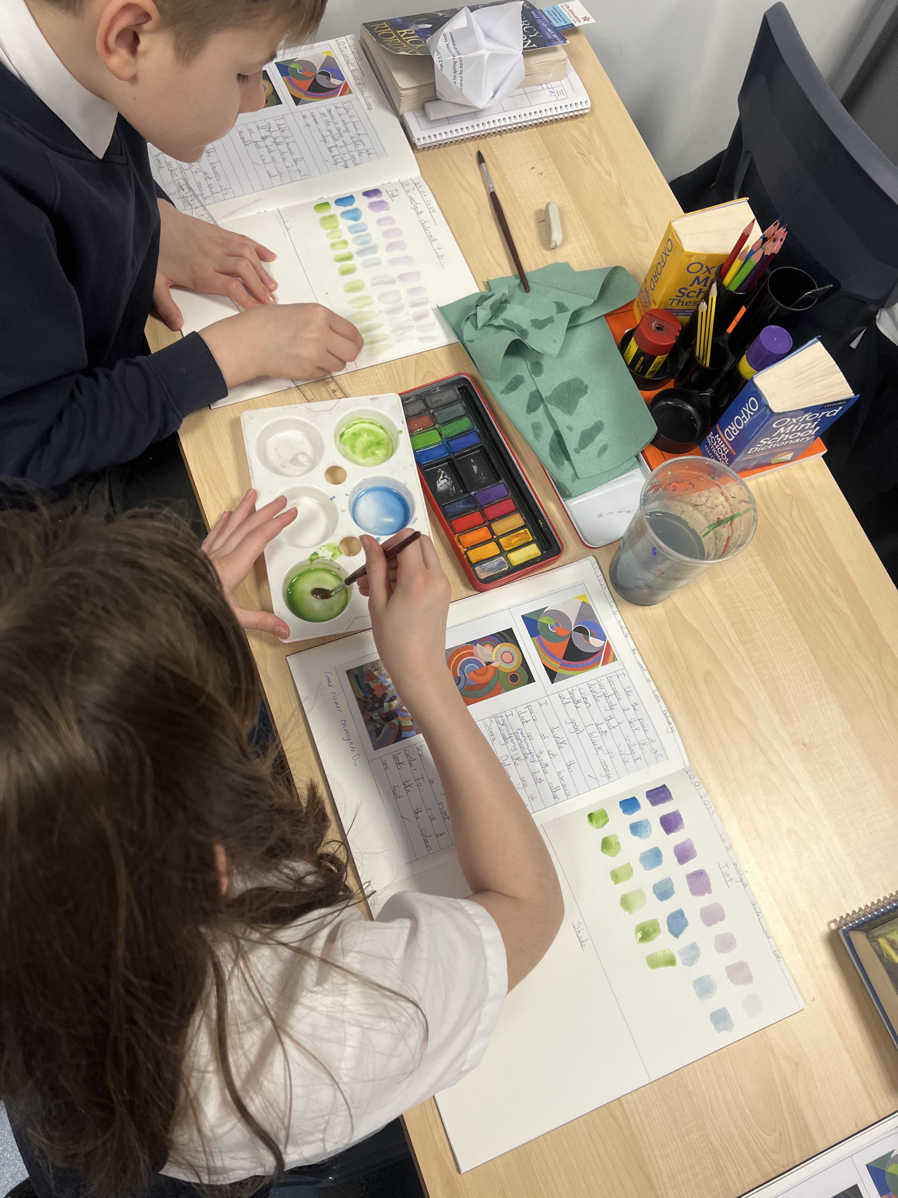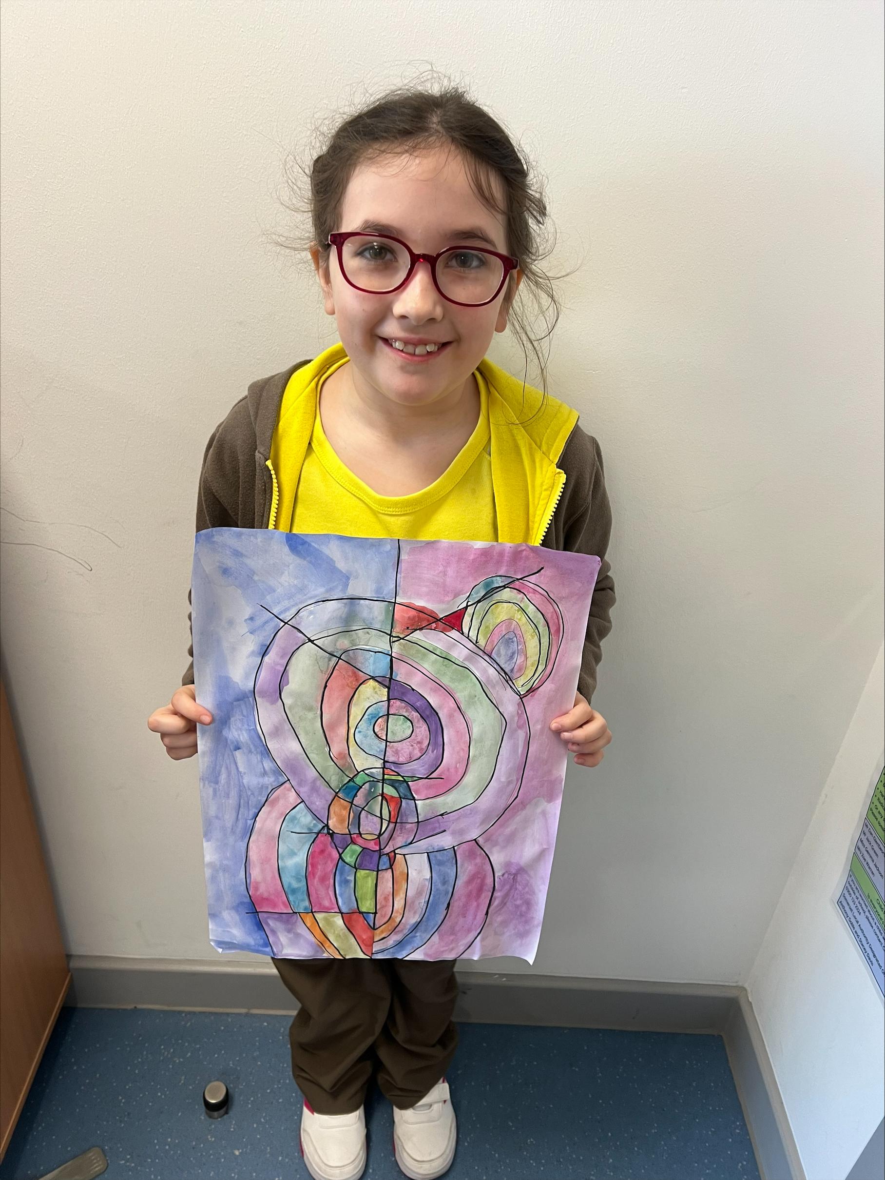 We have worked hard to create abstract art pieces inspired by Sonia Delaunay's style. We researched her Orphism art style and different media types that she used. Using our knowledge of watercolours we adjusted the tint and shade of colours alongside using geometric shapes to create our final pieces.