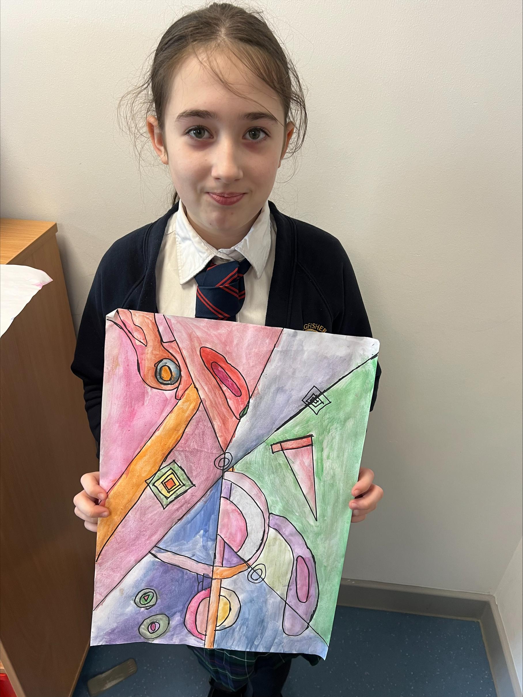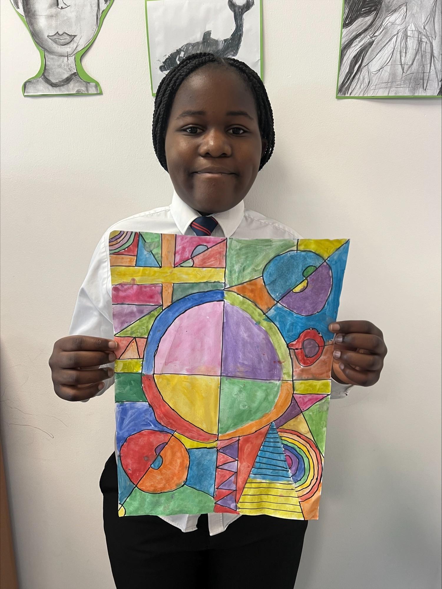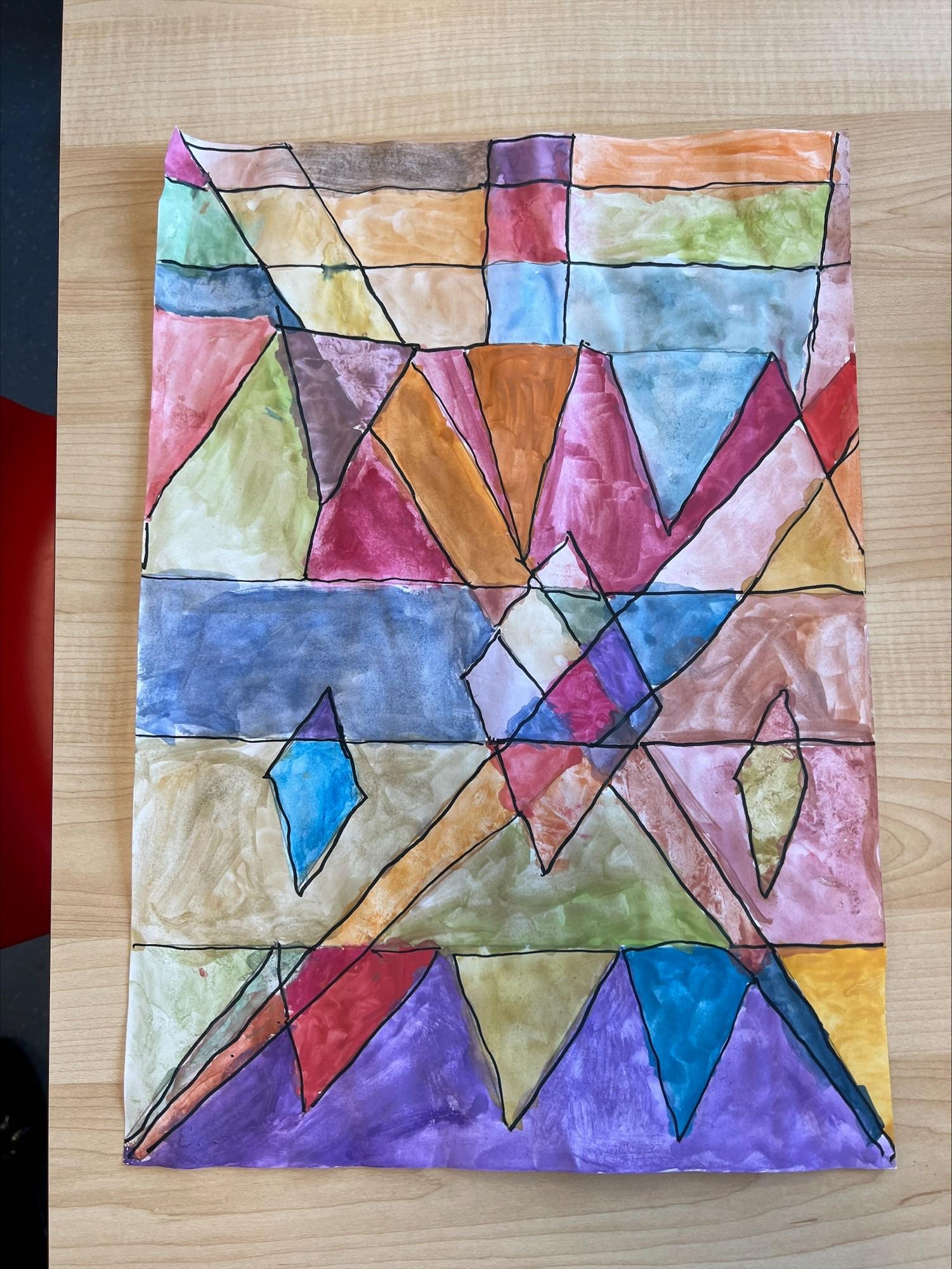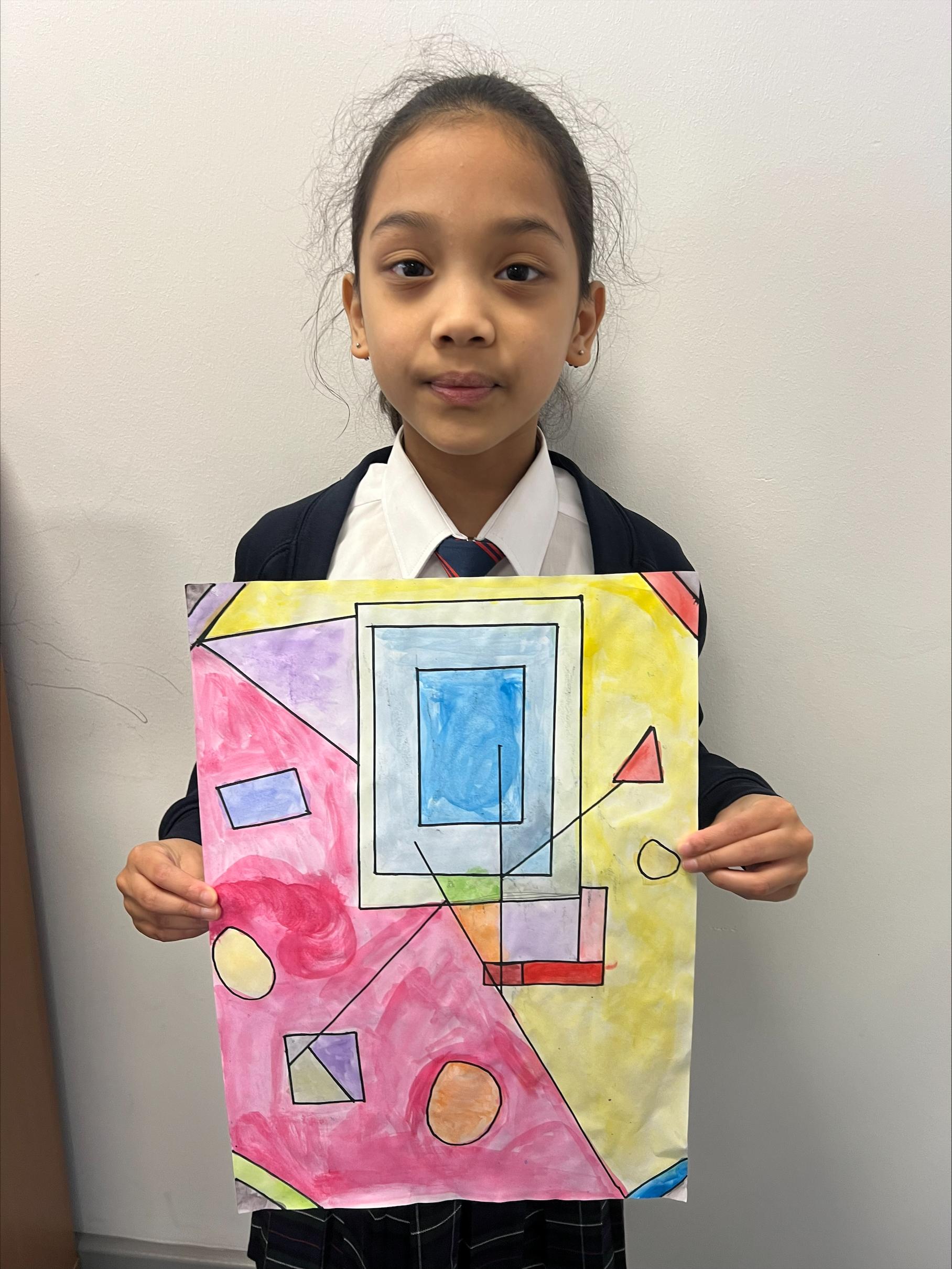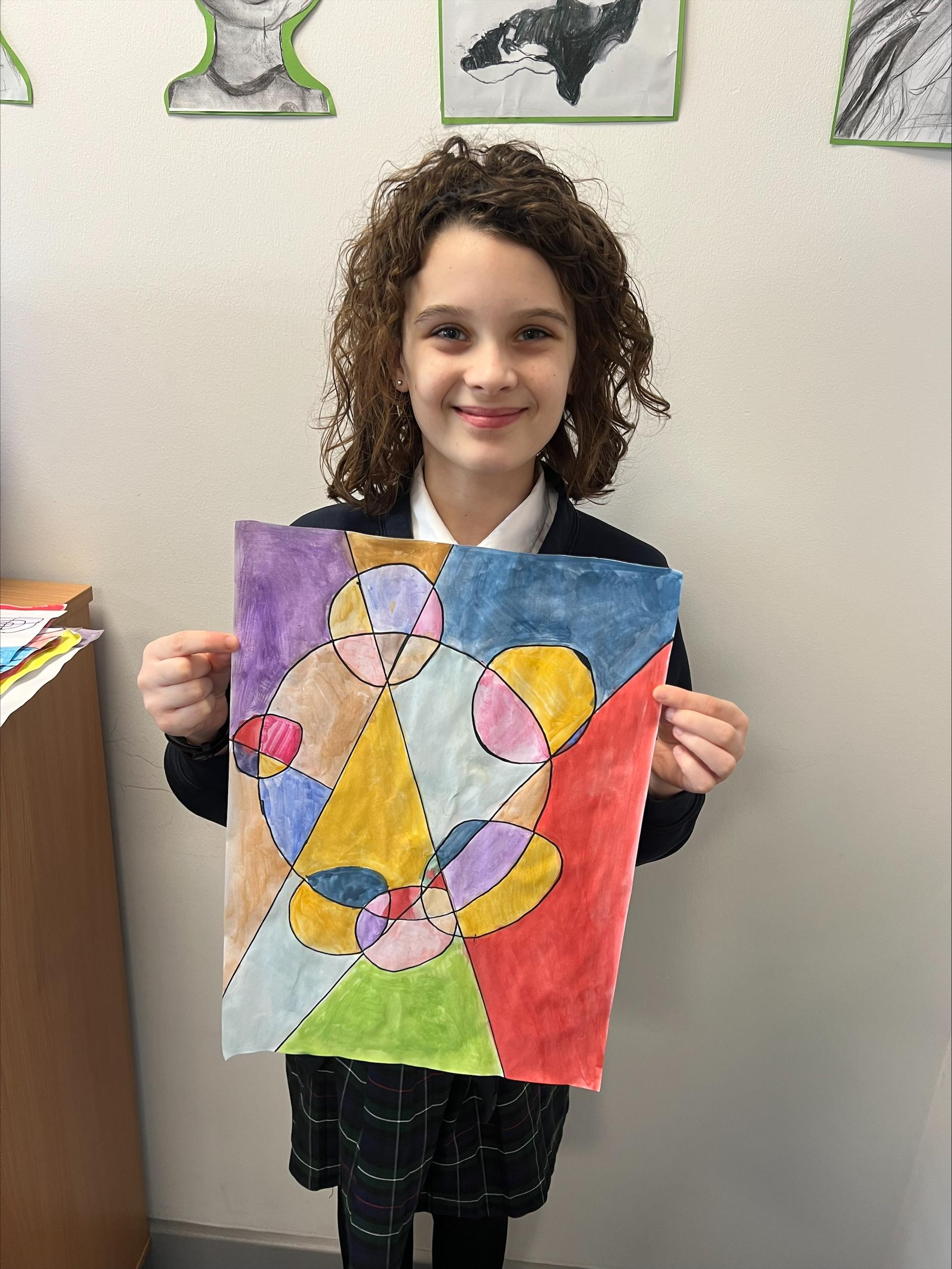 We have worked hard to create abstract art pieces inspired by Sonia Delaunay's style. We researched her Orphism art style and different media types that she used. Using our knowledge of watercolours we adjusted the tint and shade of colours alongside using geometric shapes to create our final pieces.