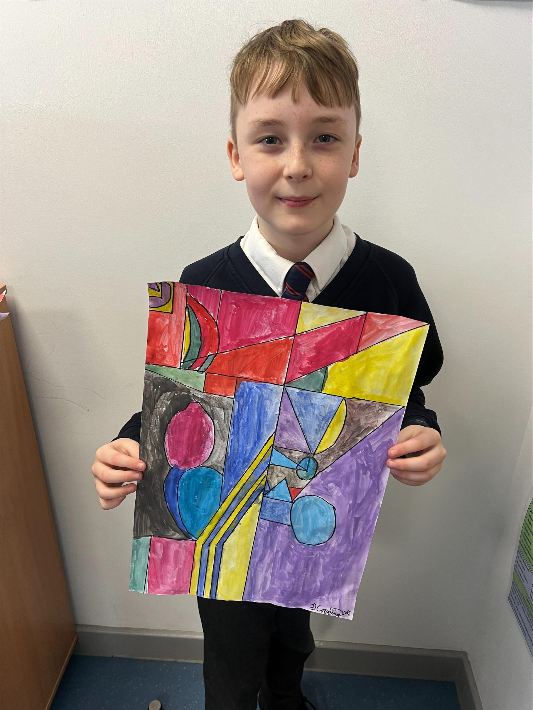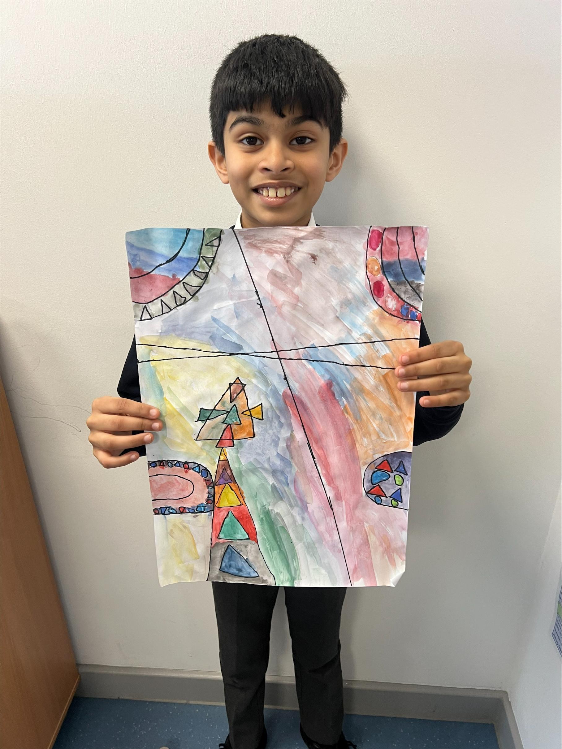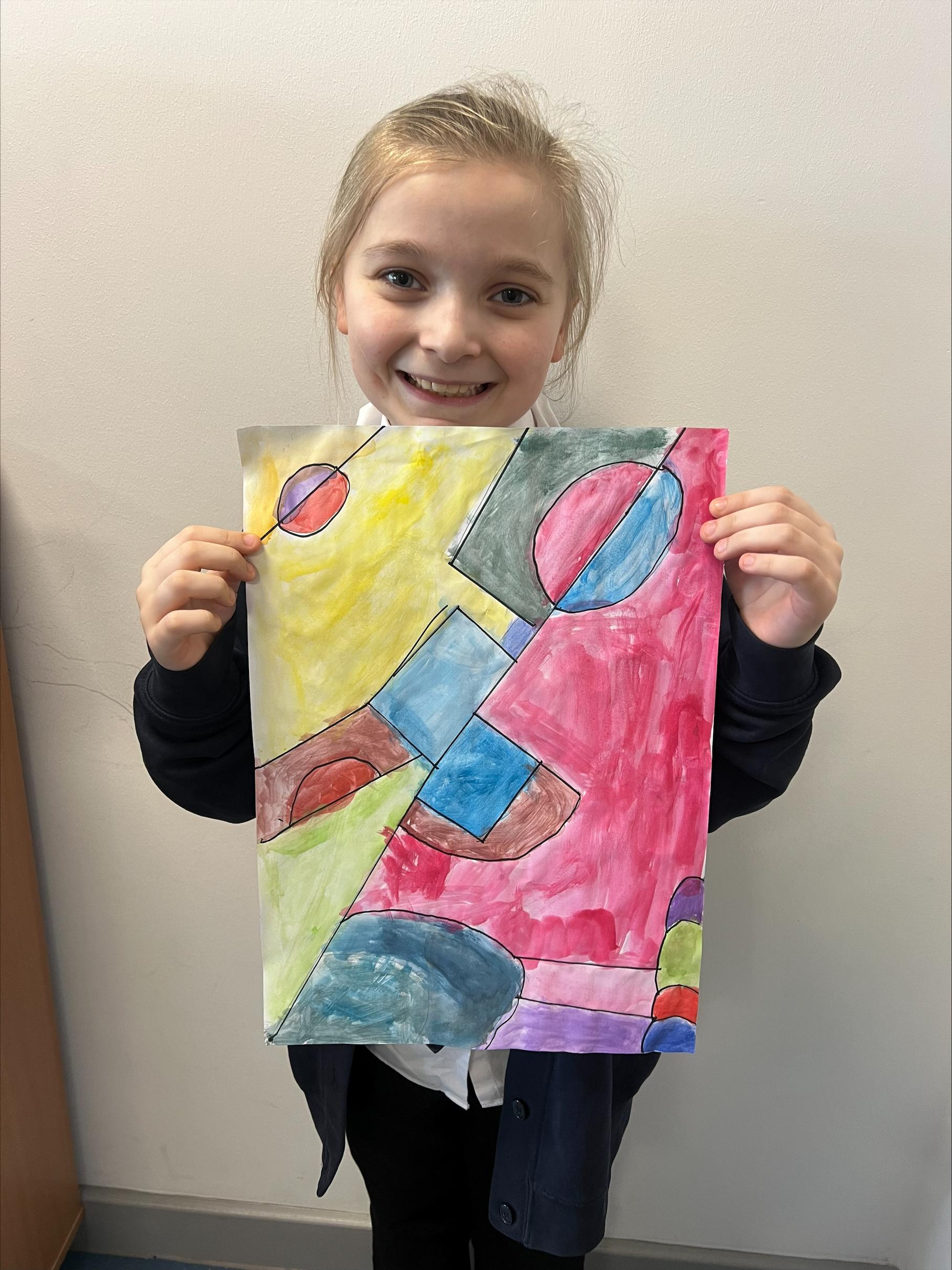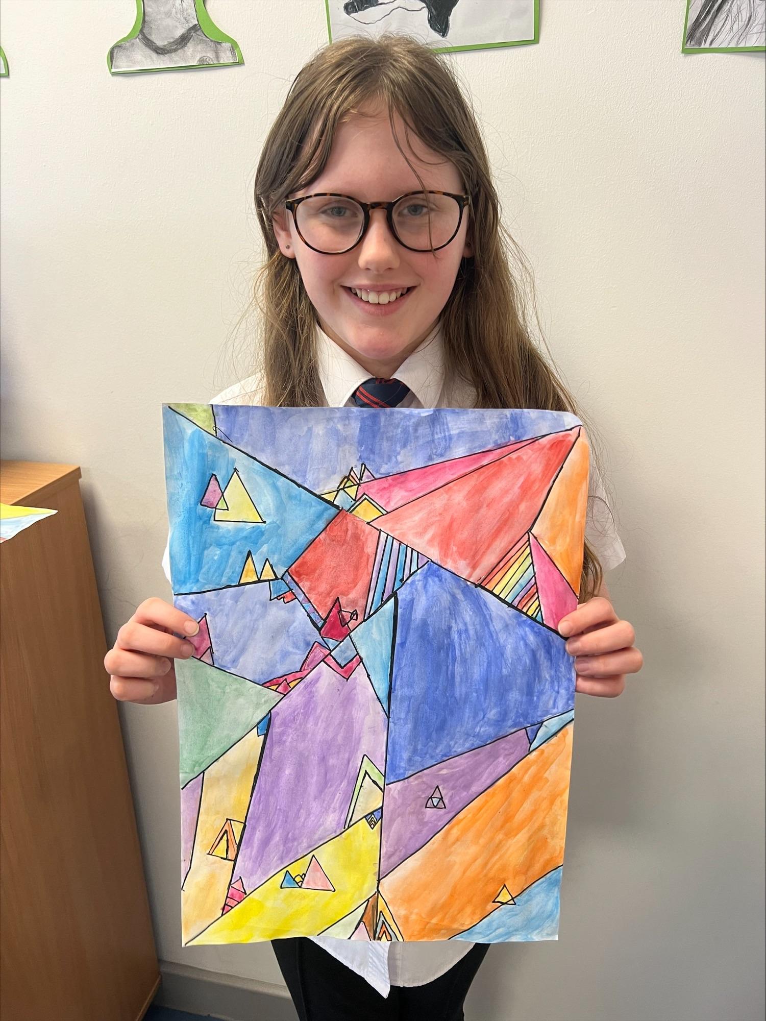 We have worked hard to create abstract art pieces inspired by Sonia Delaunay's style. We researched her Orphism art style and different media types that she used. Using our knowledge of watercolours we adjusted the tint and shade of colours alongside using geometric shapes to create our final pieces.