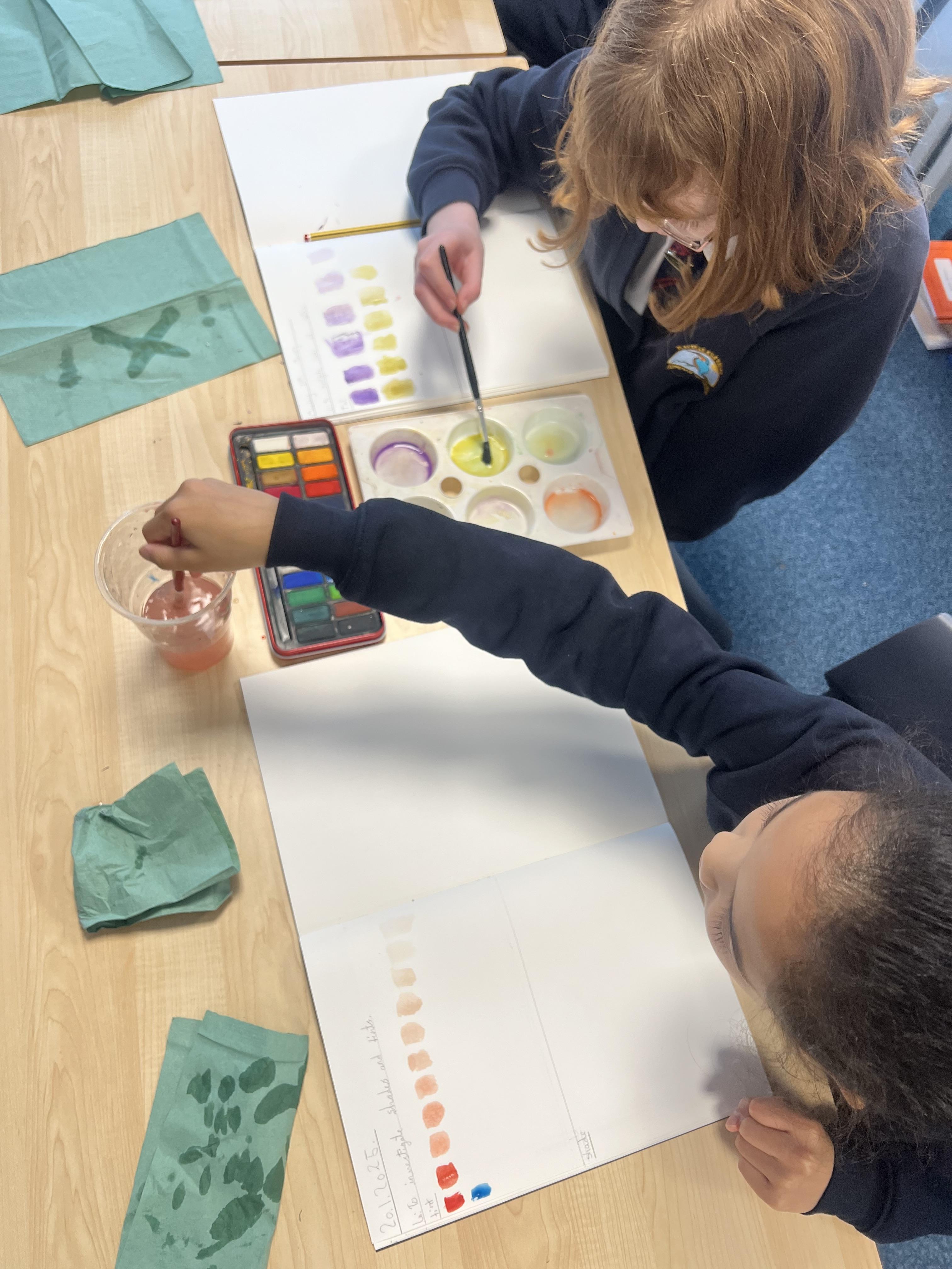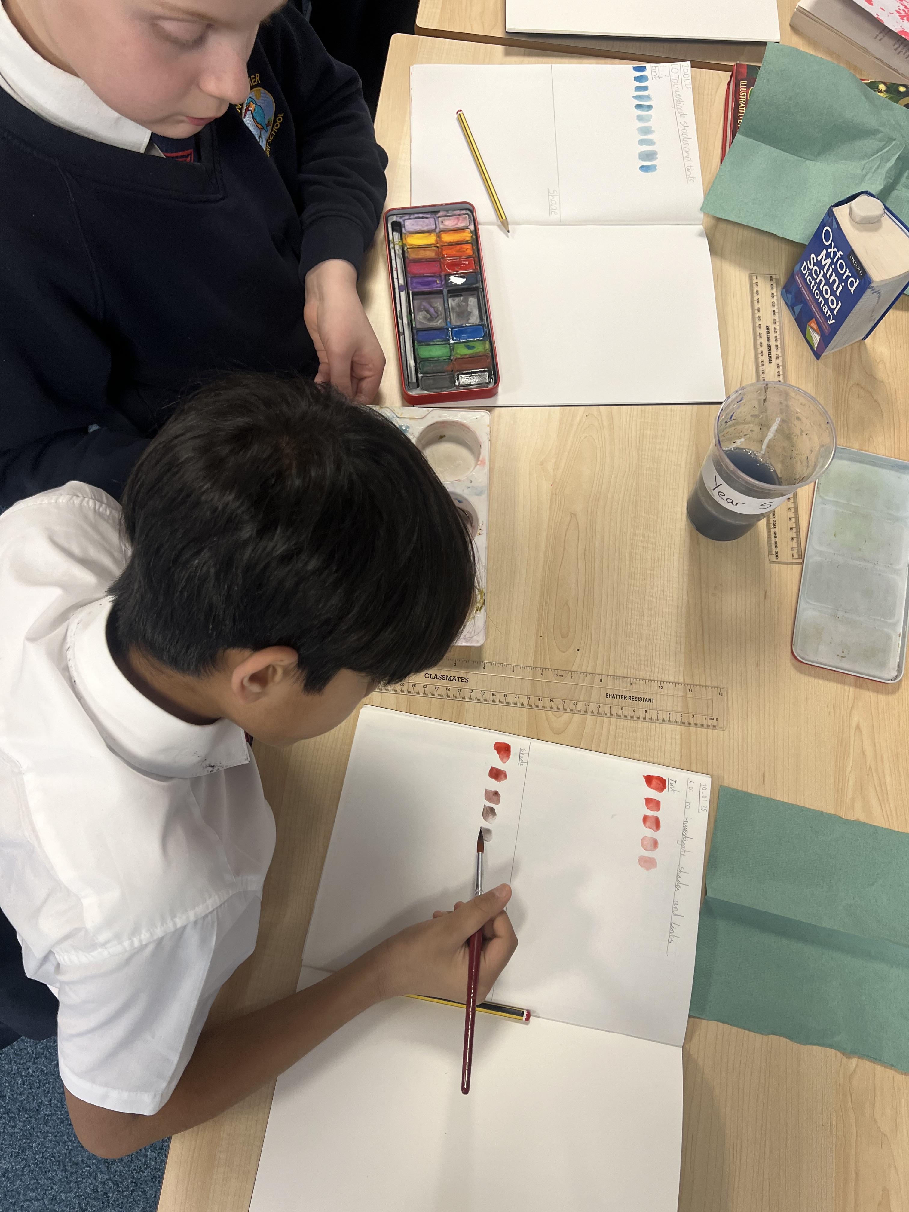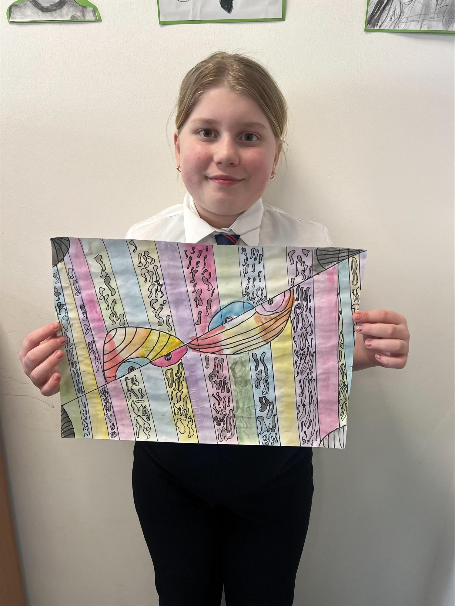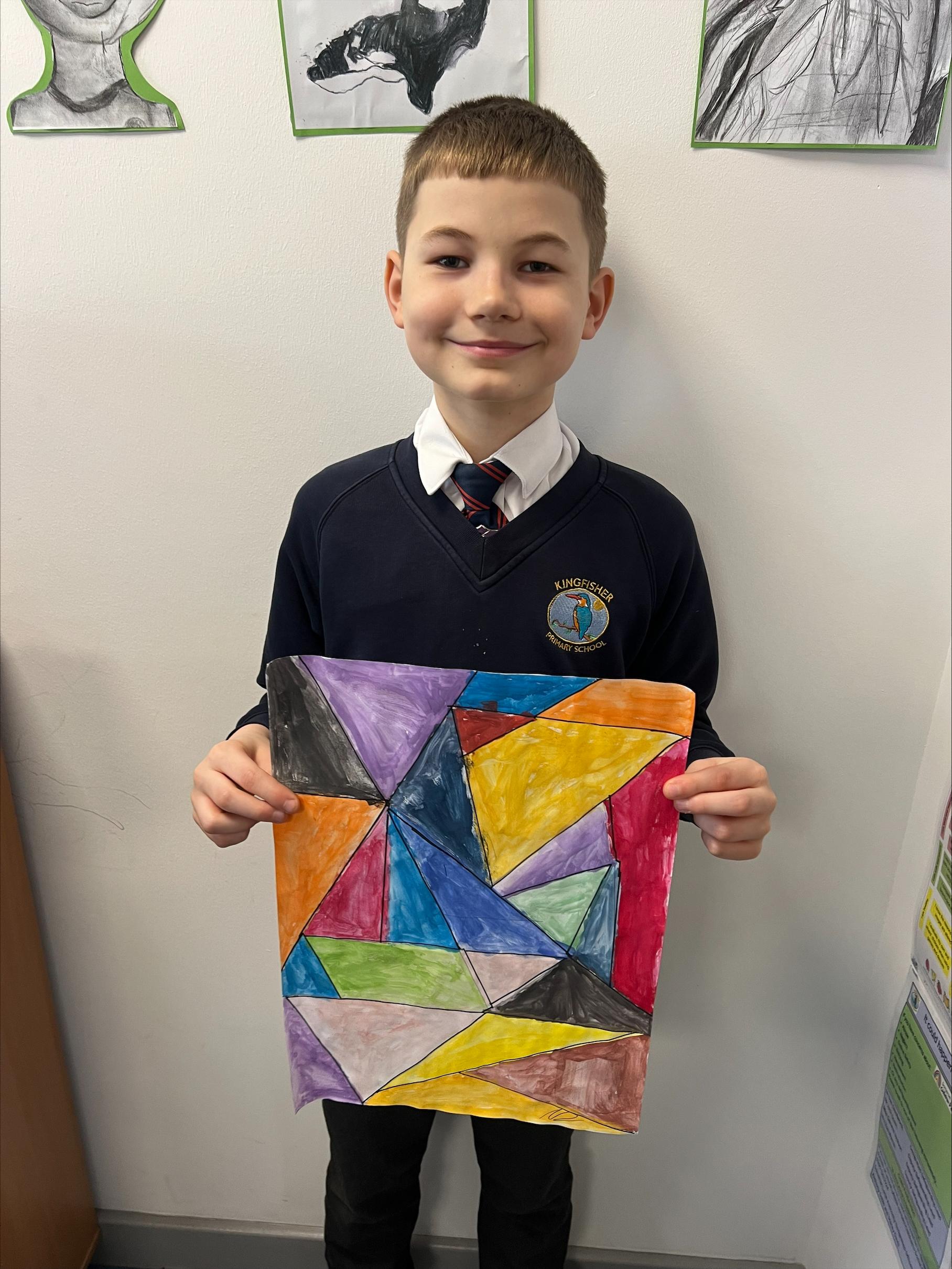 We have worked hard to create abstract art pieces inspired by Sonia Delaunay's style. We researched her Orphism art style and different media types that she used. Using our knowledge of watercolours we adjusted the tint and shade of colours alongside using geometric shapes to create our final pieces.