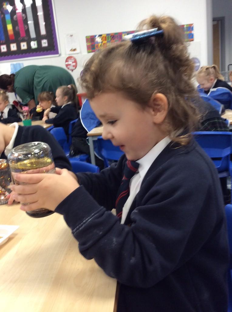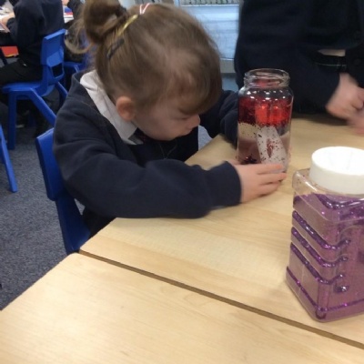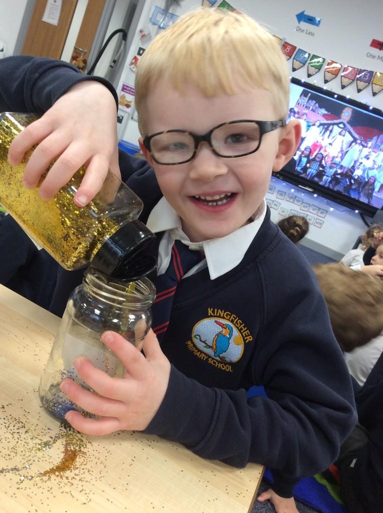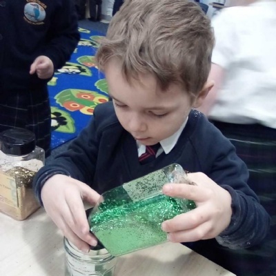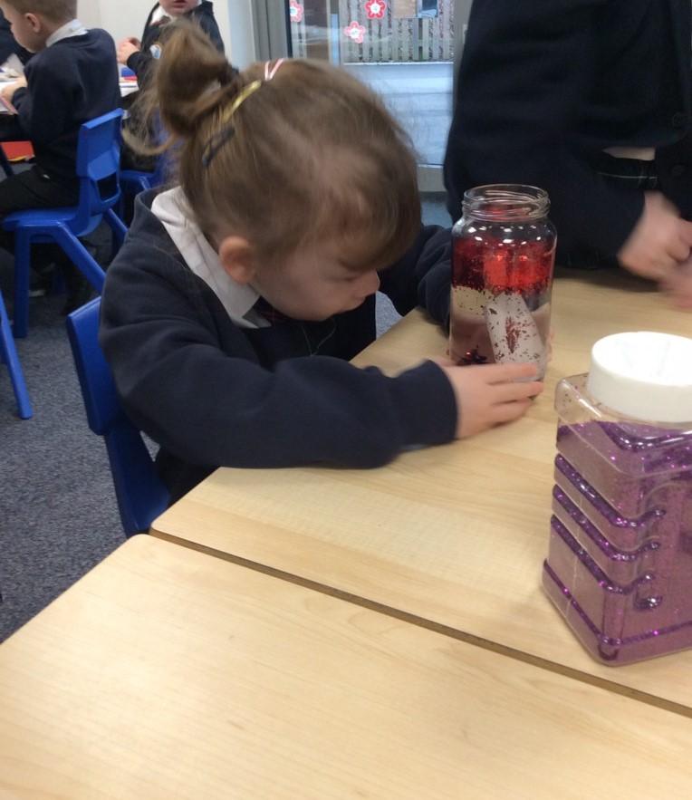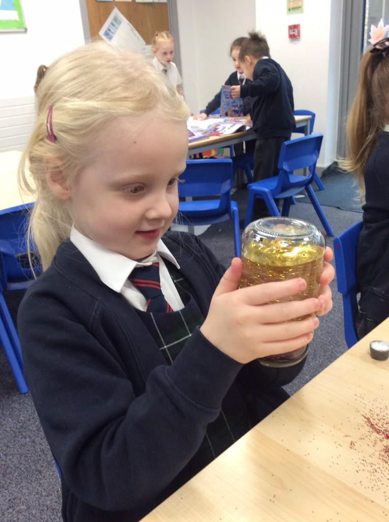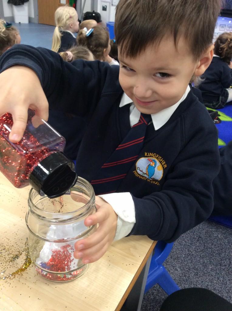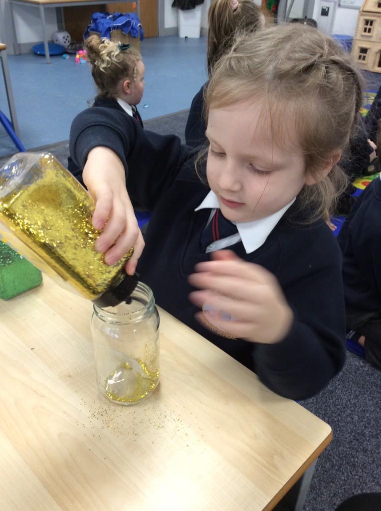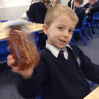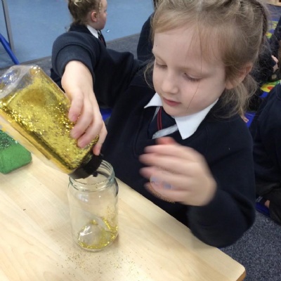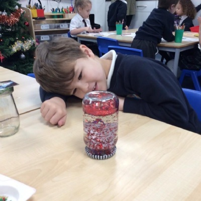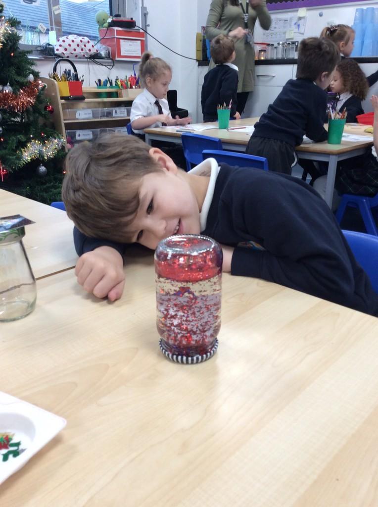 We used our Nativity pictures to create some great personalised snow globes. Minnow Class chose their favorite colours, cut out their Nativity pictures, poured the water and glitter into the jars and then put the lids on and added some ribbon to decorate them.