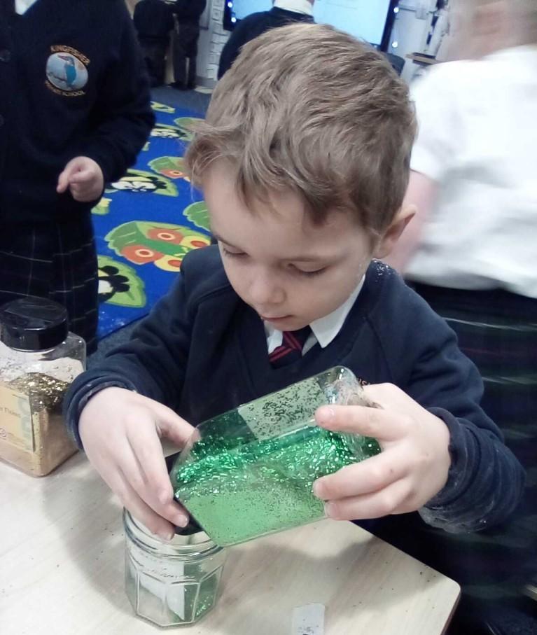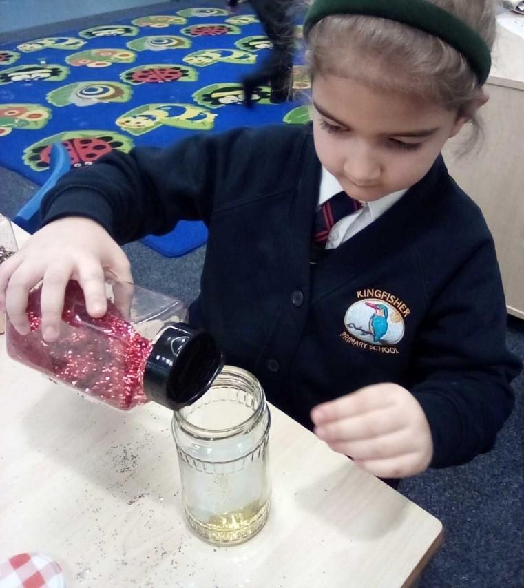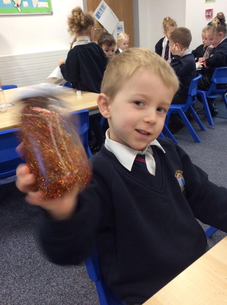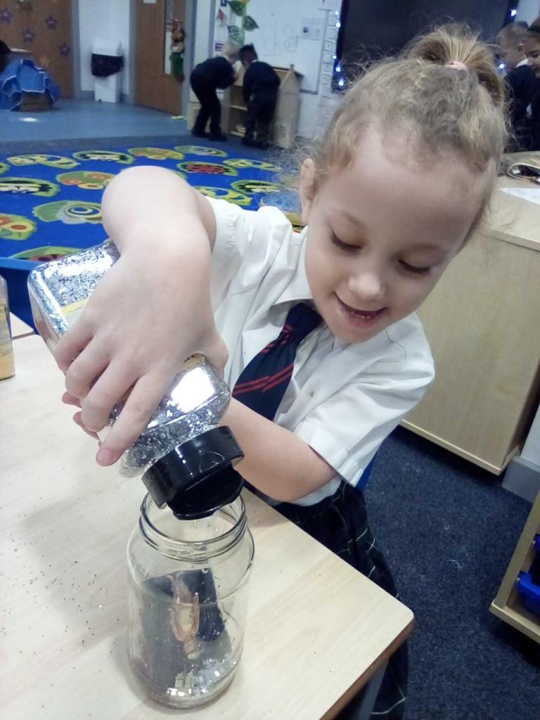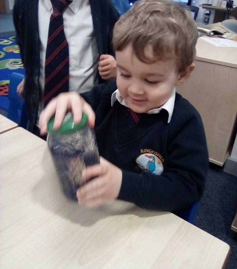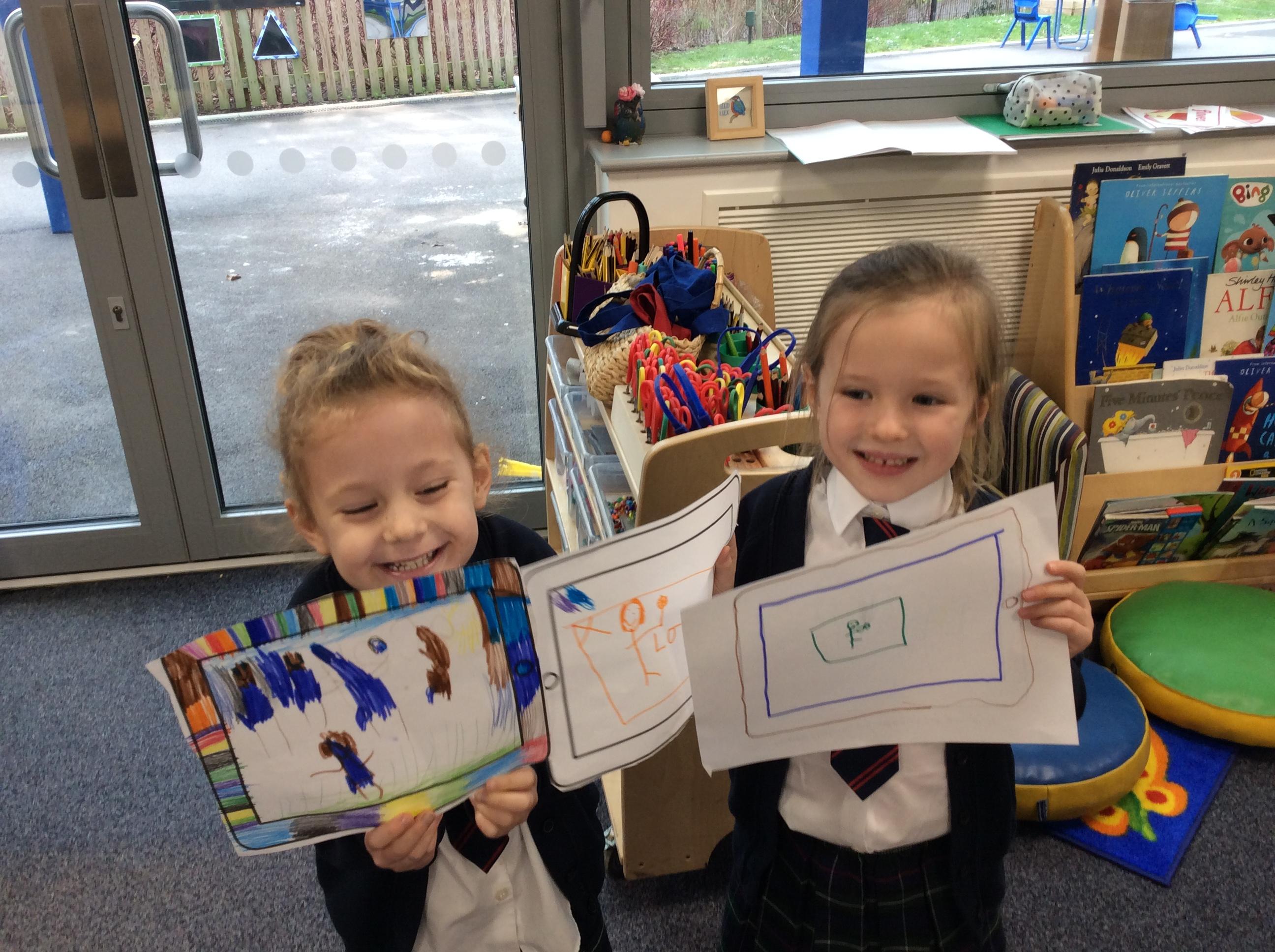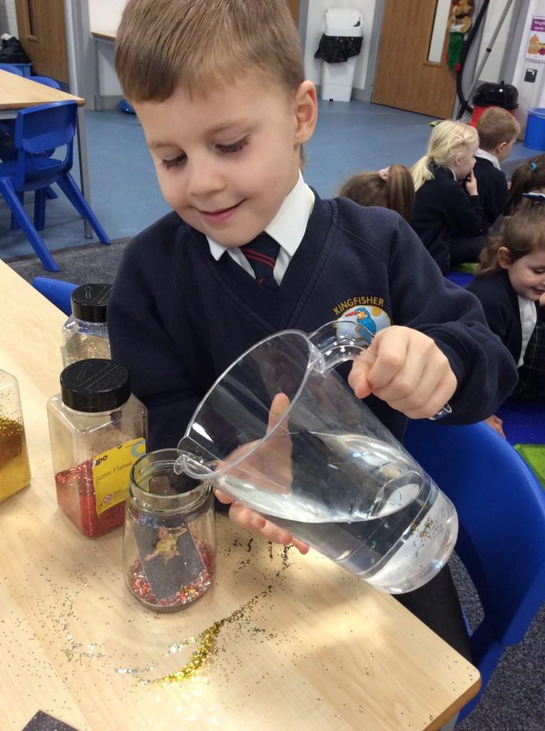 We used our Nativity pictures to create some great personalised snow globes. Minnow Class chose their favorite colours, cut out their Nativity pictures, poured the water and glitter into the jars and then put the lids on and added some ribbon to decorate them.