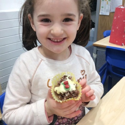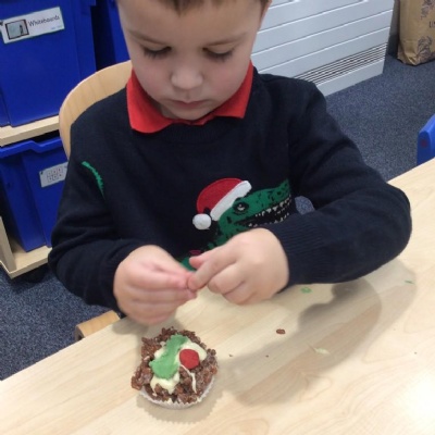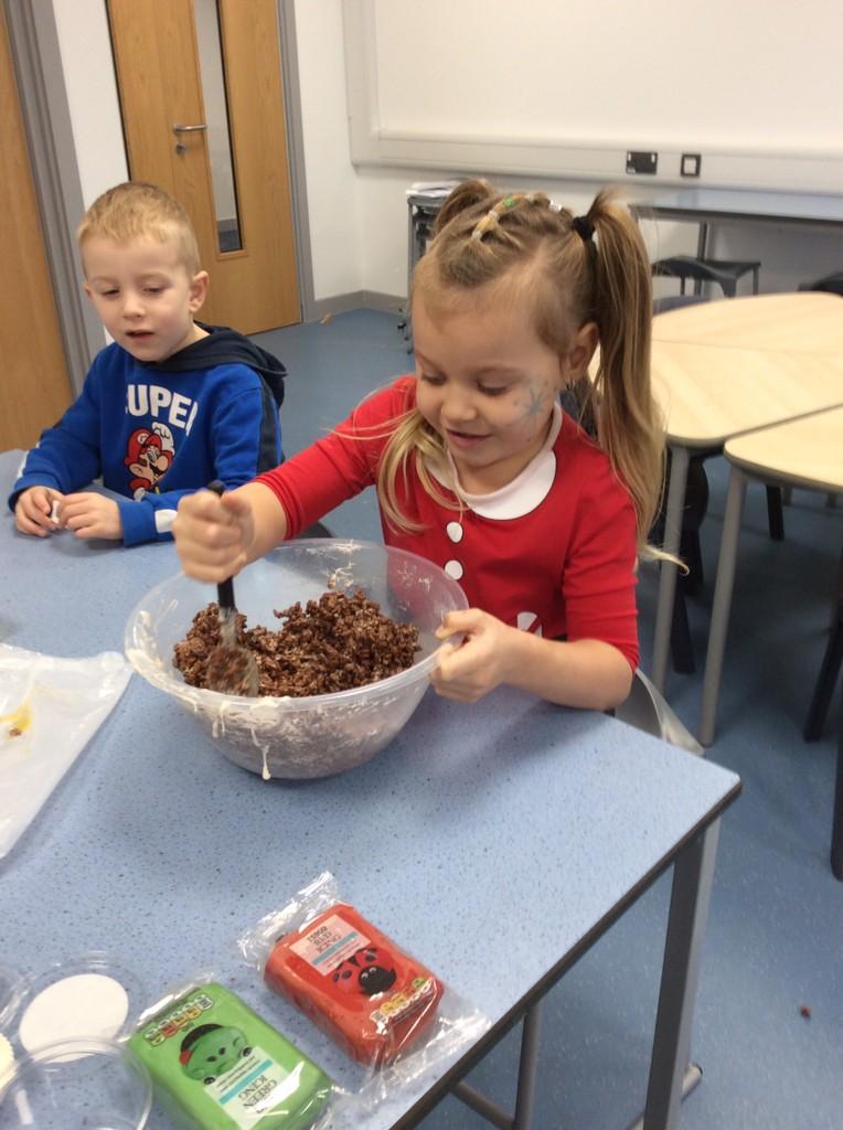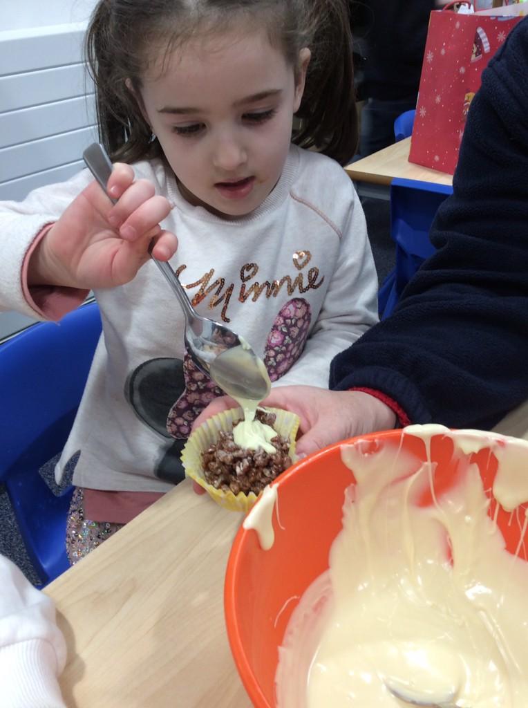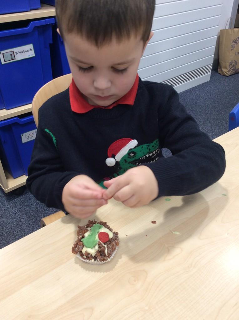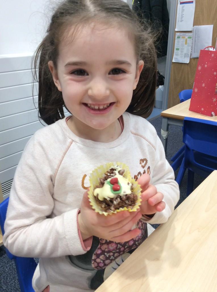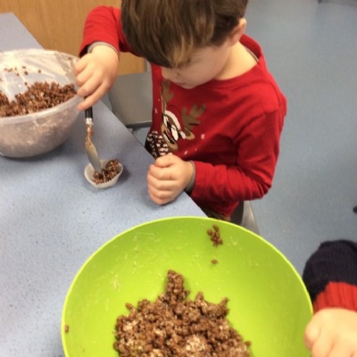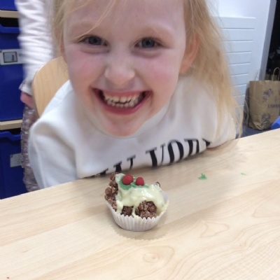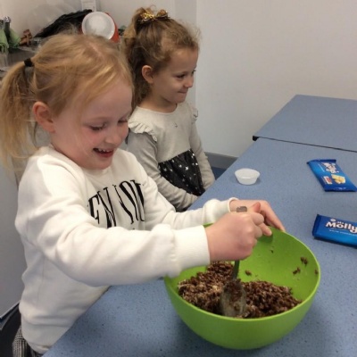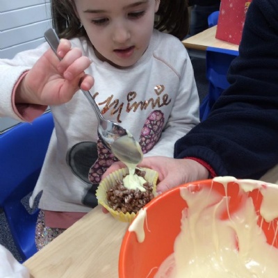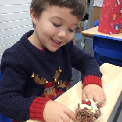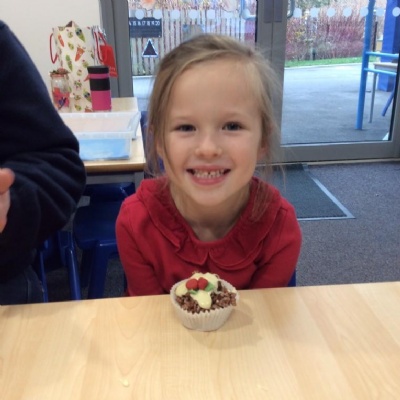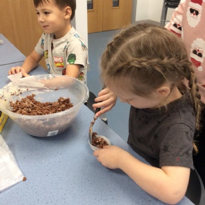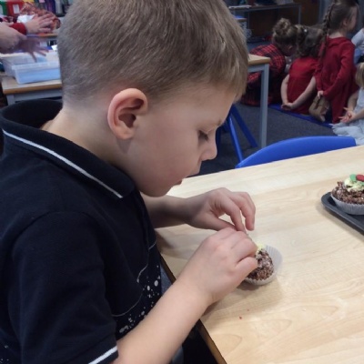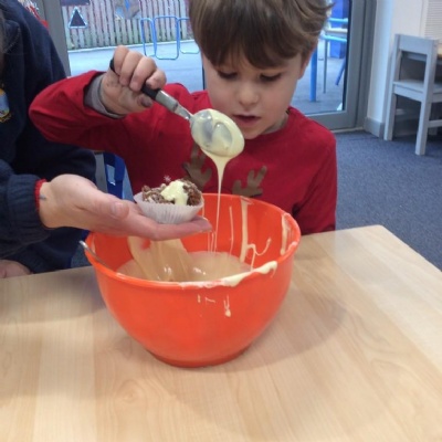 For Christmas, we created some Christmas Puddings using Rice Krispies. The children mixed together the melted marshmallows, chocolate, butter and Rice Krispies. They then shaped them into a sphere (one of our 3D shapes we had learnt about), adding white chocolate on the top and then finishing them off by rolling and shaping icing to make them look like holly and red berries.