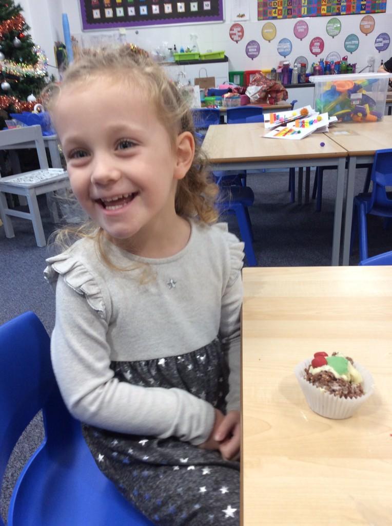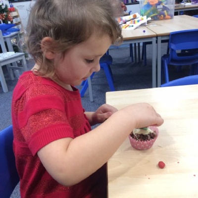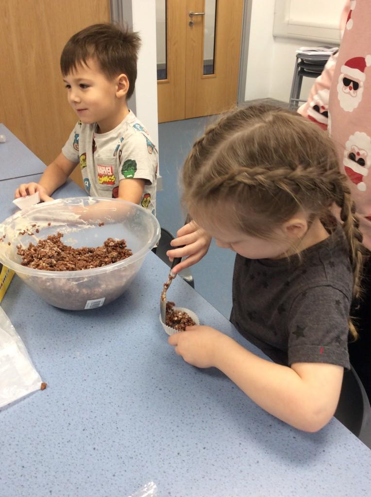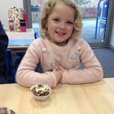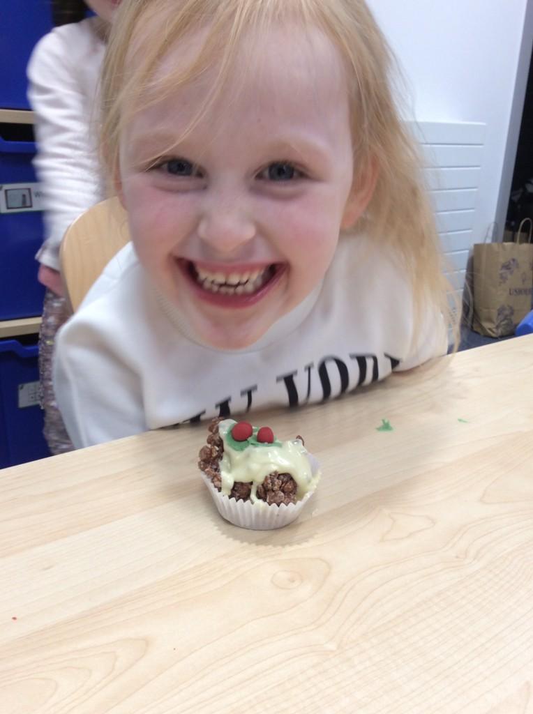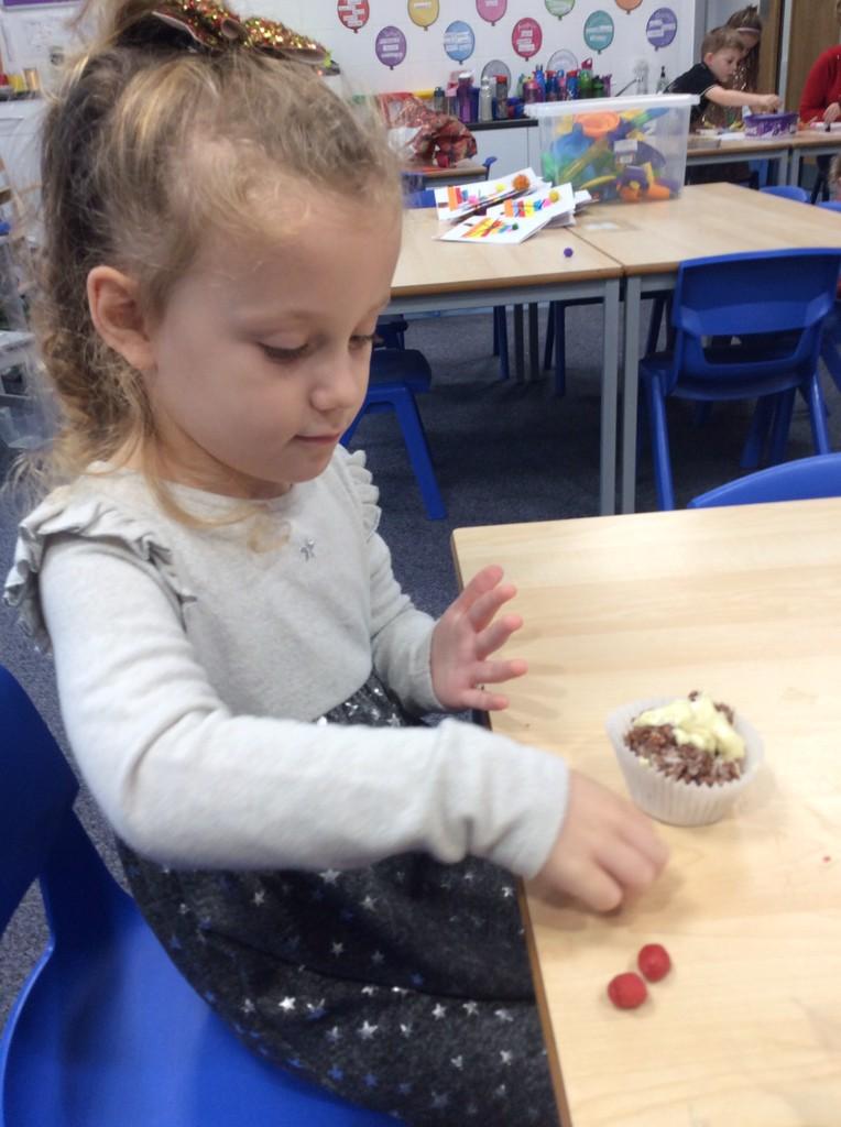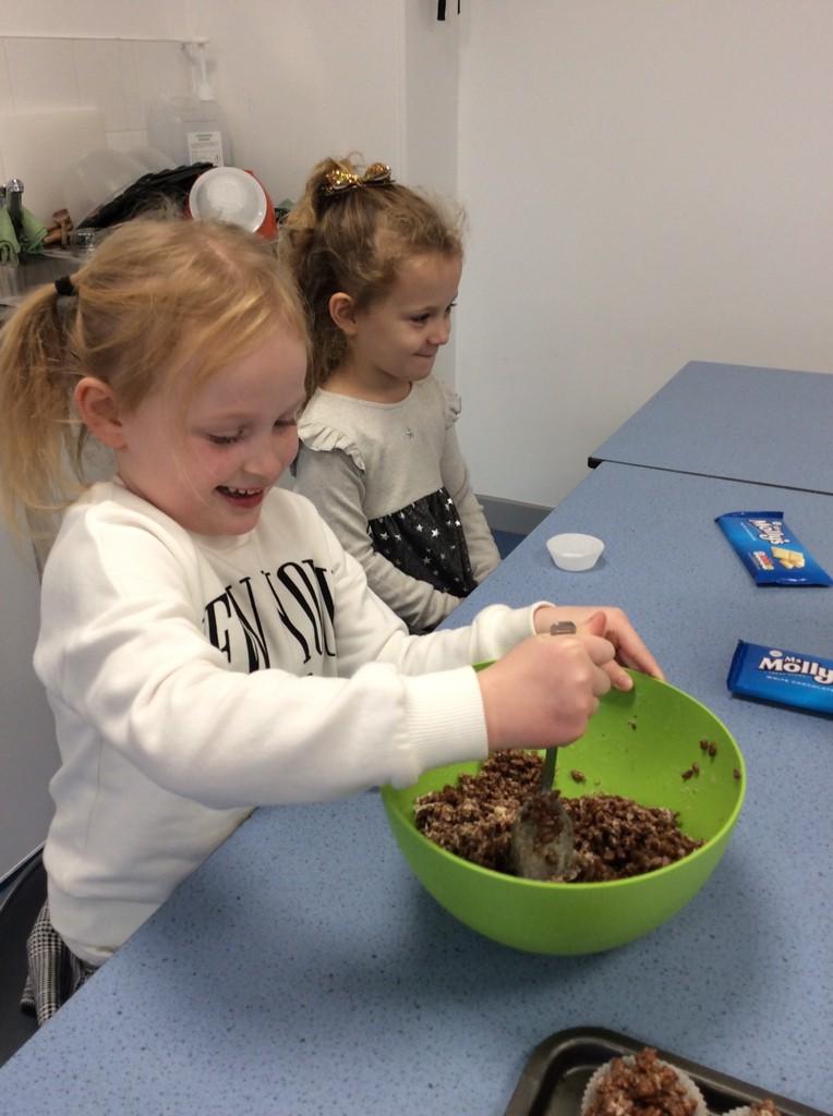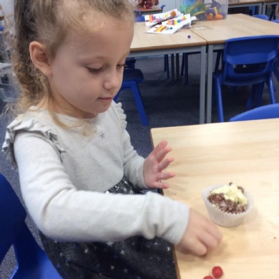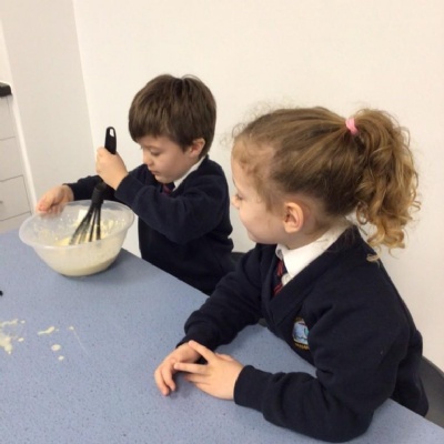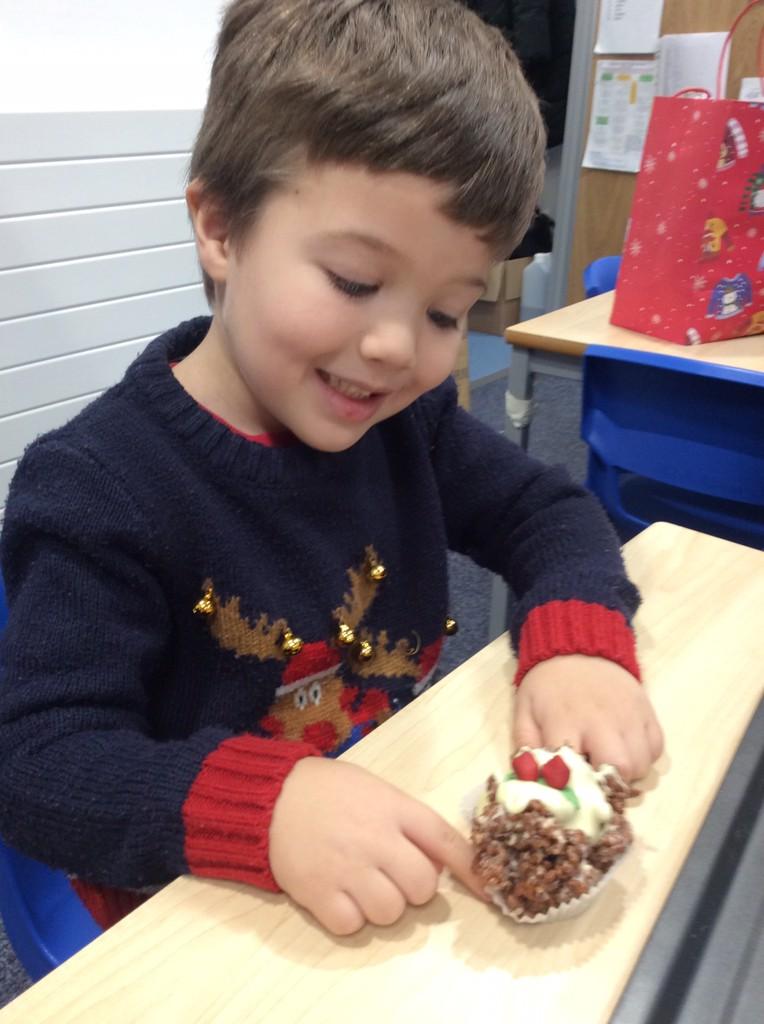 For Christmas, we created some Christmas Puddings using Rice Krispies. The children mixed together the melted marshmallows, chocolate, butter and Rice Krispies. They then shaped them into a sphere (one of our 3D shapes we had learnt about), adding white chocolate on the top and then finishing them off by rolling and shaping icing to make them look like holly and red berries.