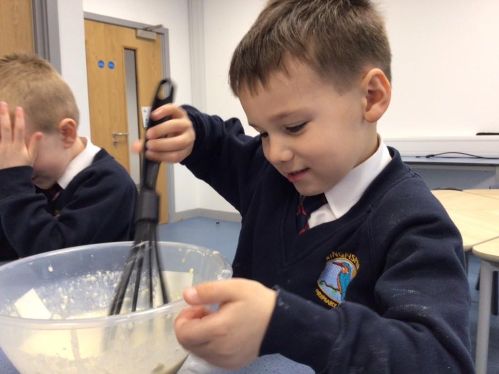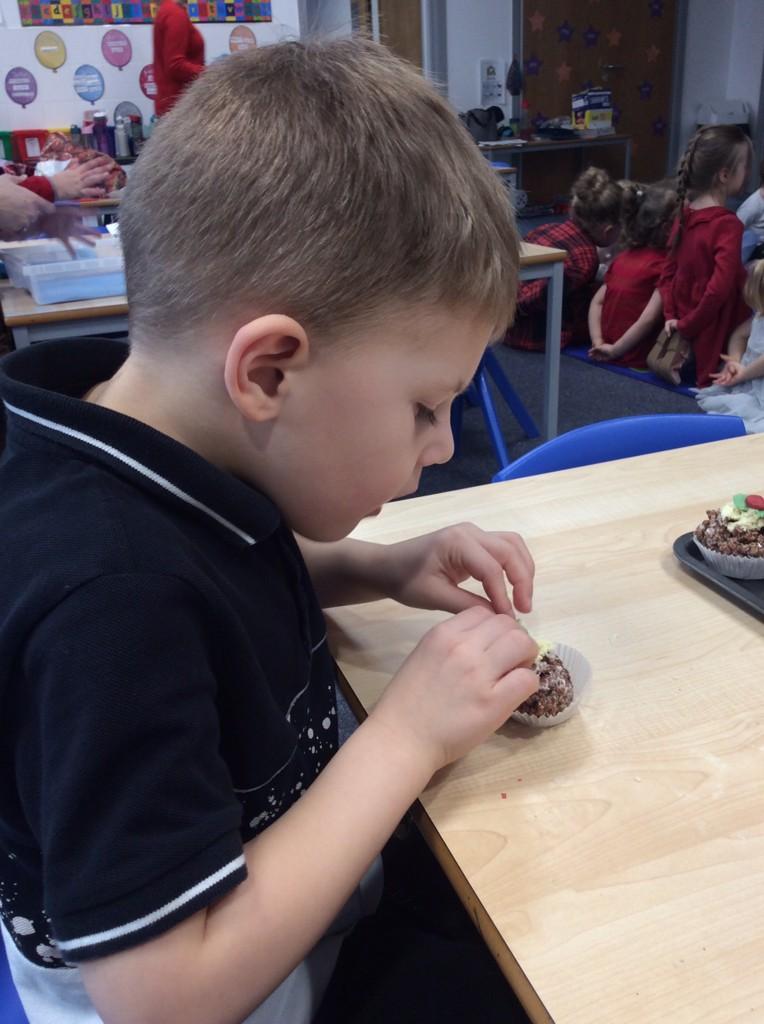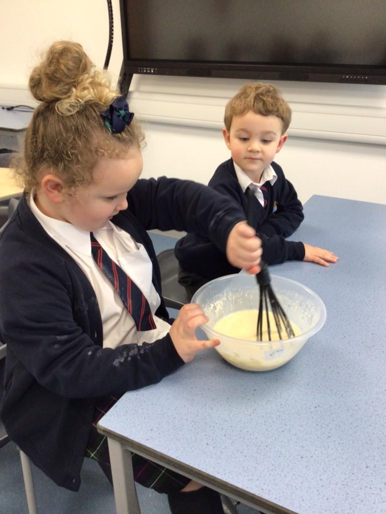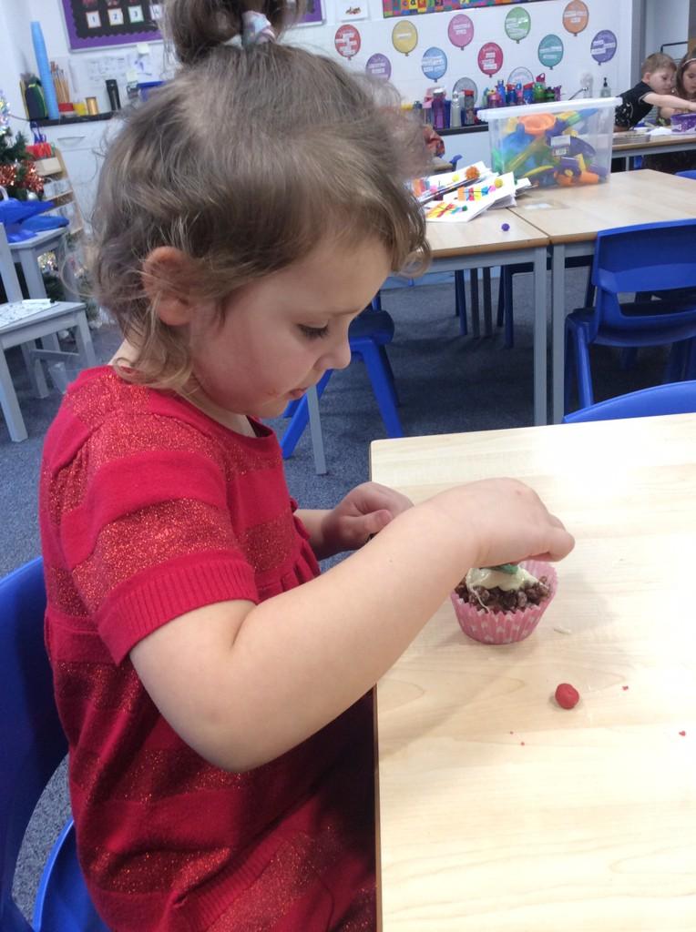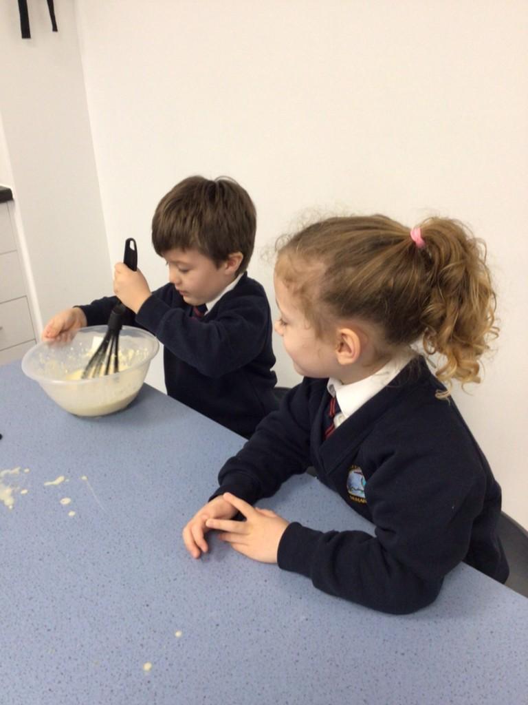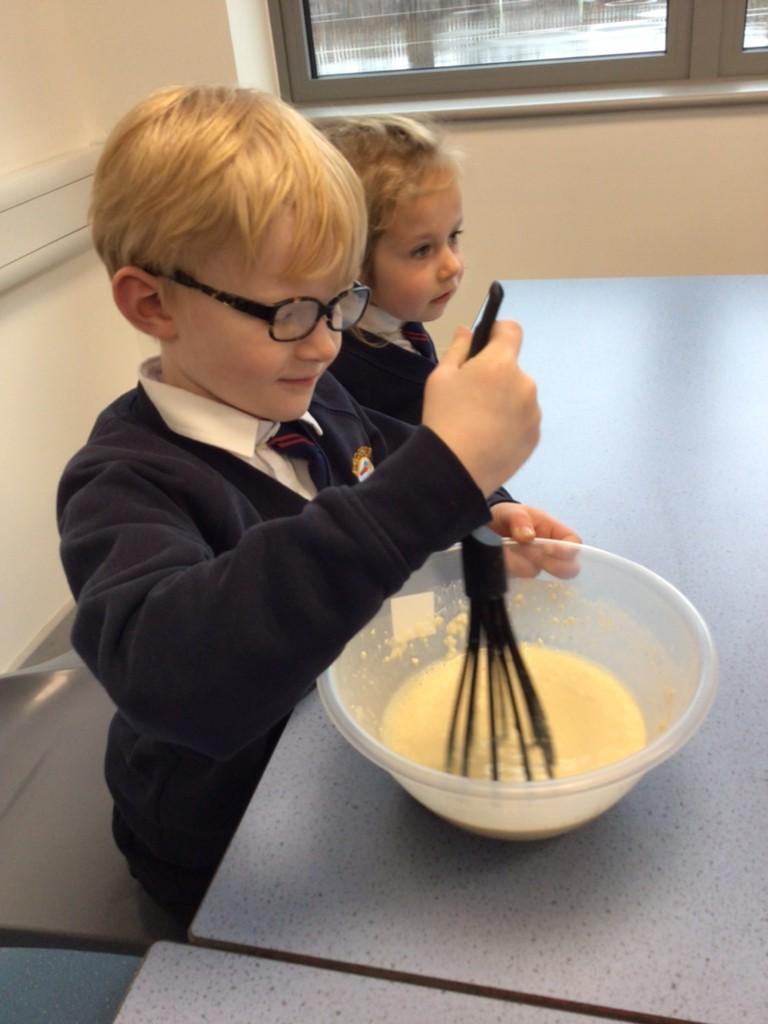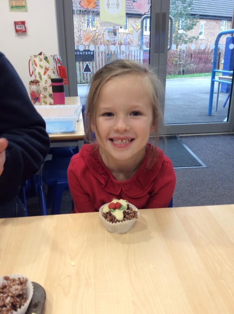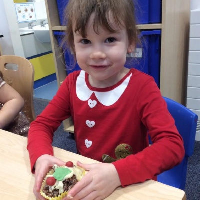 For Christmas, we created some Christmas Puddings using Rice Krispies. The children mixed together the melted marshmallows, chocolate, butter and Rice Krispies. They then shaped them into a sphere (one of our 3D shapes we had learnt about), adding white chocolate on the top and then finishing them off by rolling and shaping icing to make them look like holly and red berries.