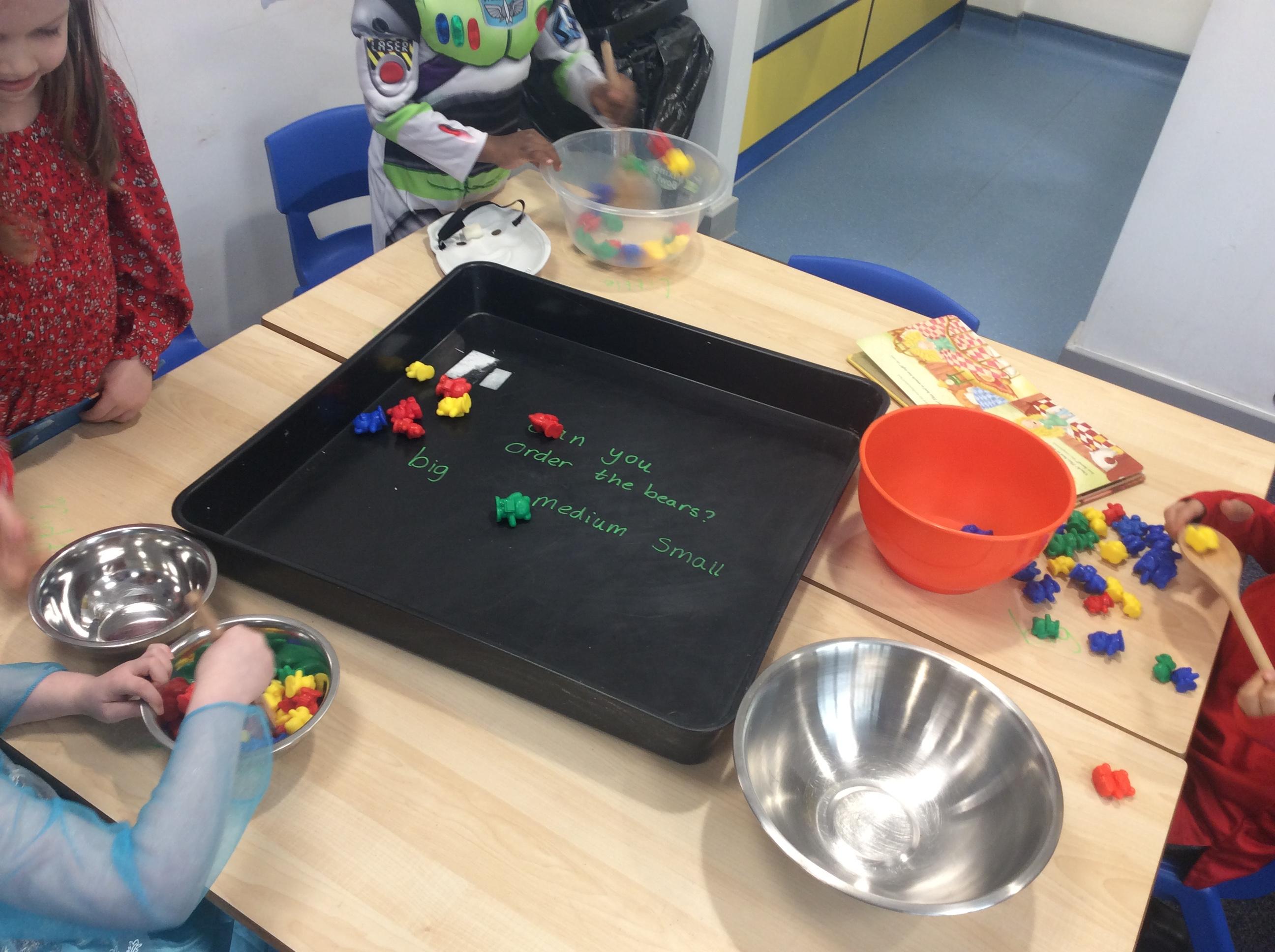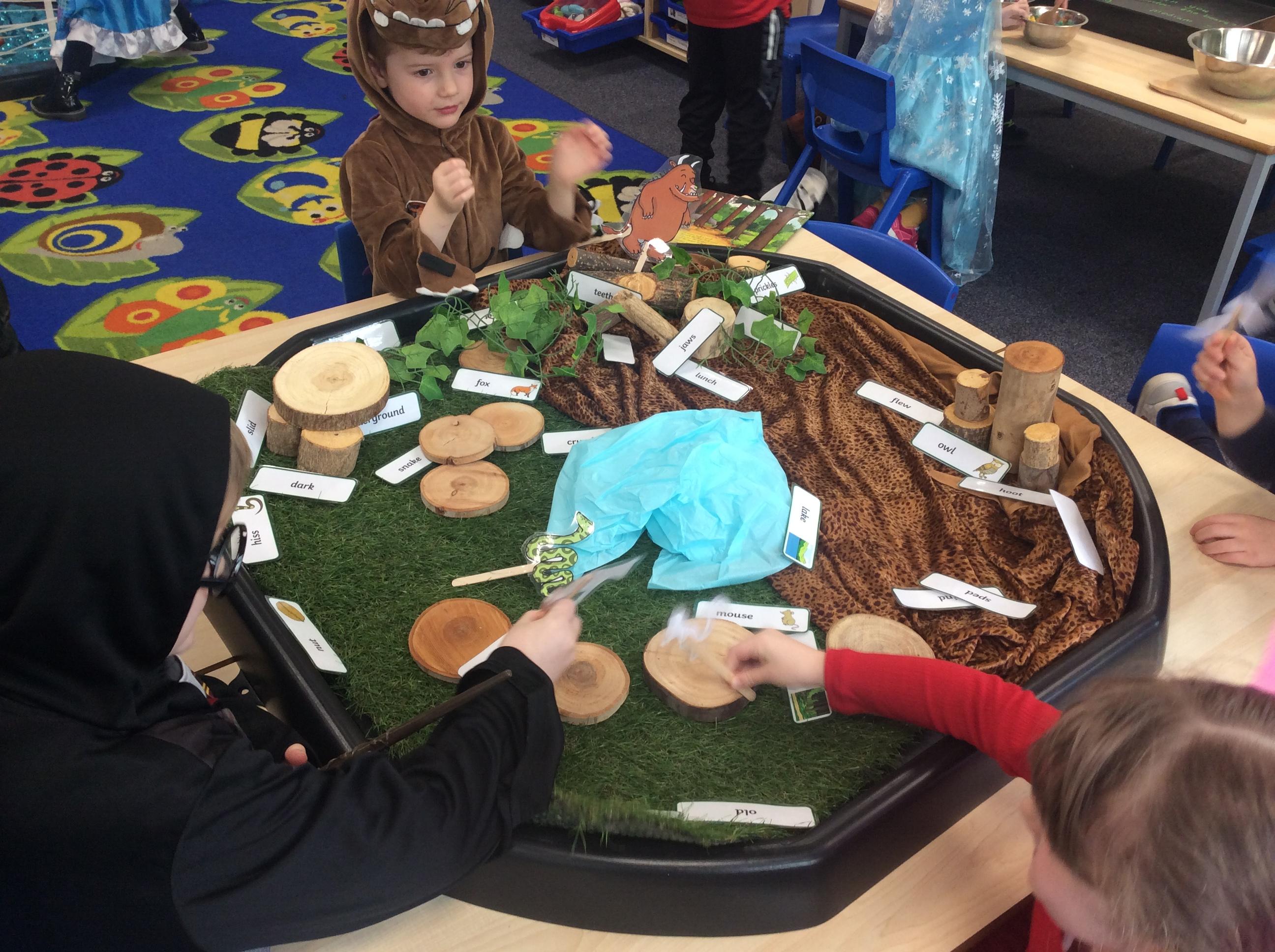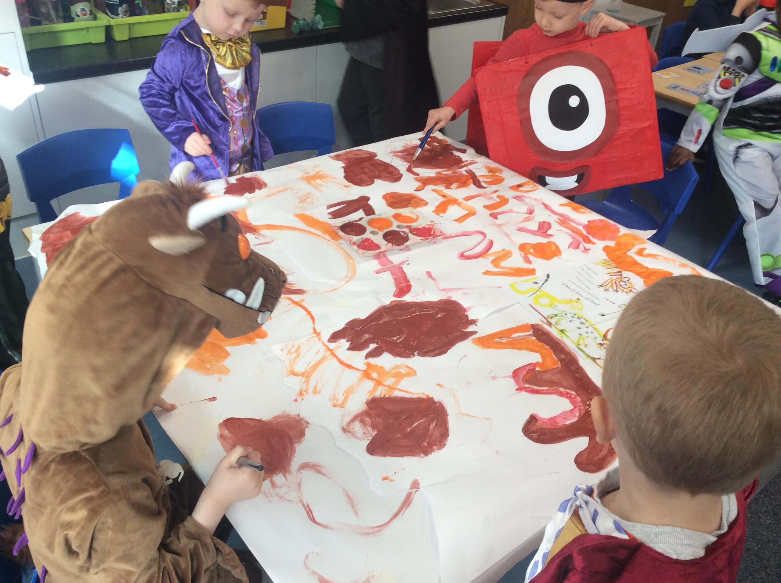 World Book Day in Minnows was a day full of fun! I was really impressed with all the effort that everyone put in with their costumes, they all looked amazing. We had a great day doing lots of different activities, each one themed around a different book. We were retelling the story of The Gruffalo, cave painting like in Cave Baby, hunting for the minibeasts from Mad About Minibeasts, rescuing the fish from Tiddler and sorting the bears from Goldilocks.