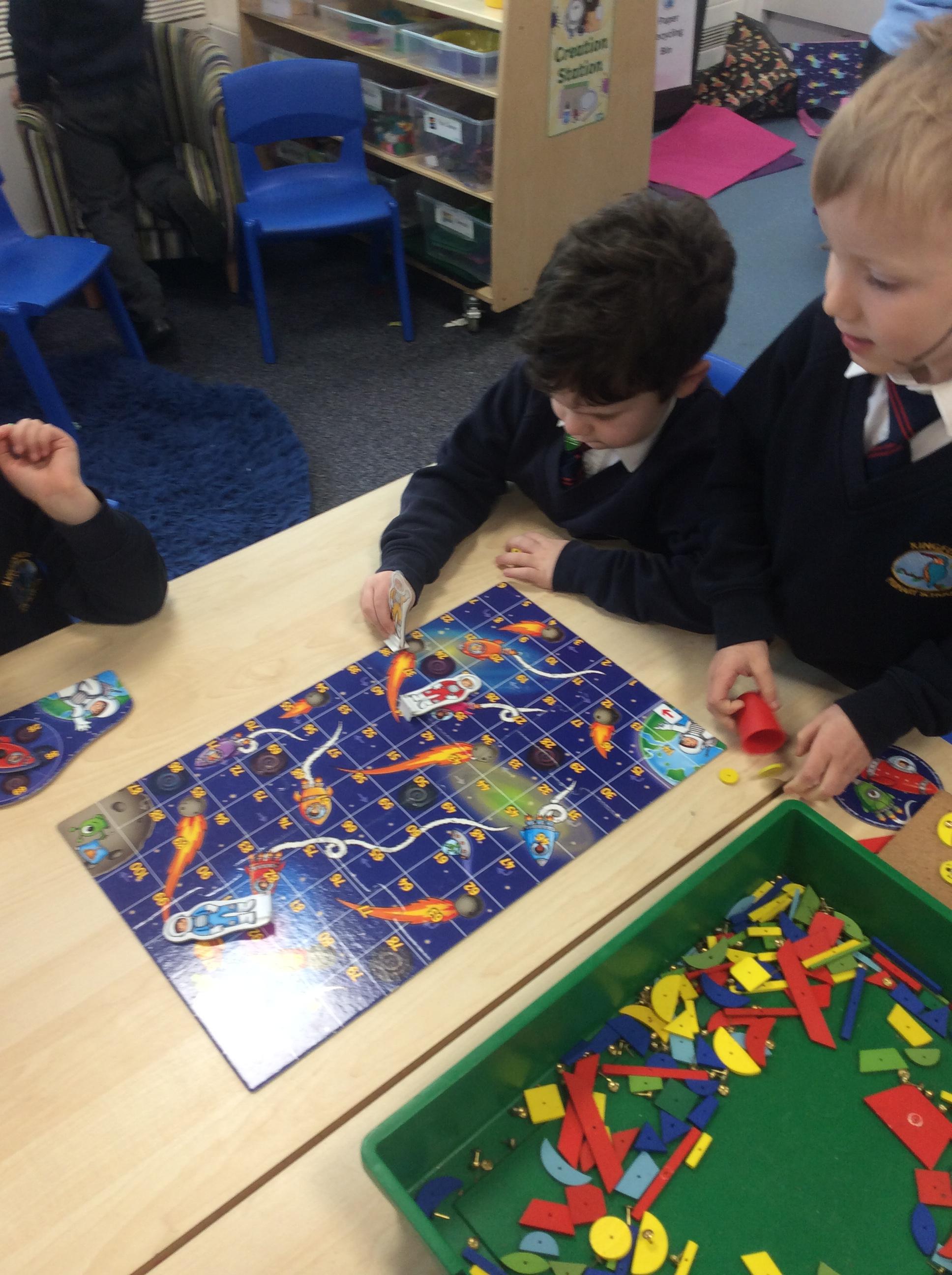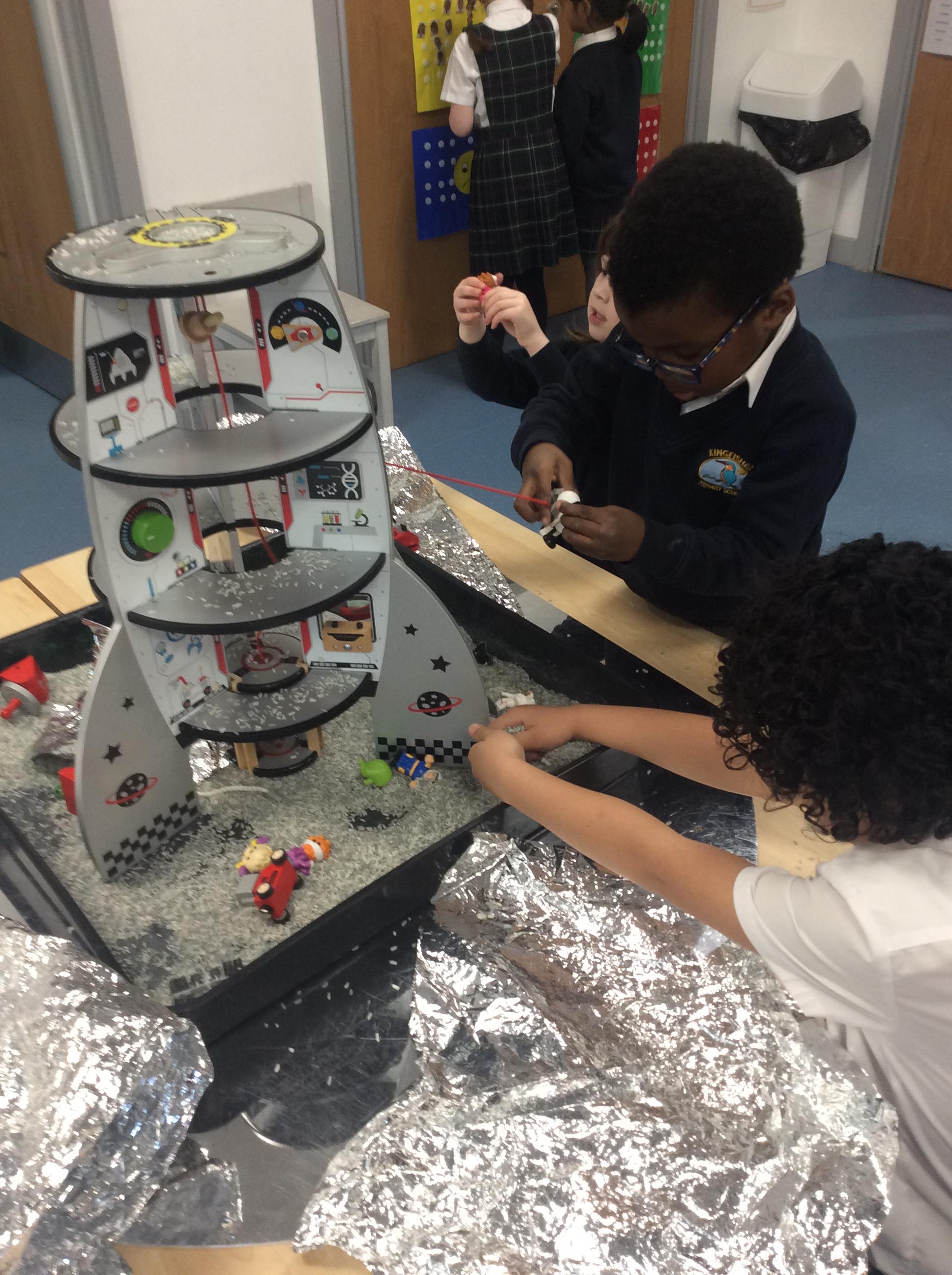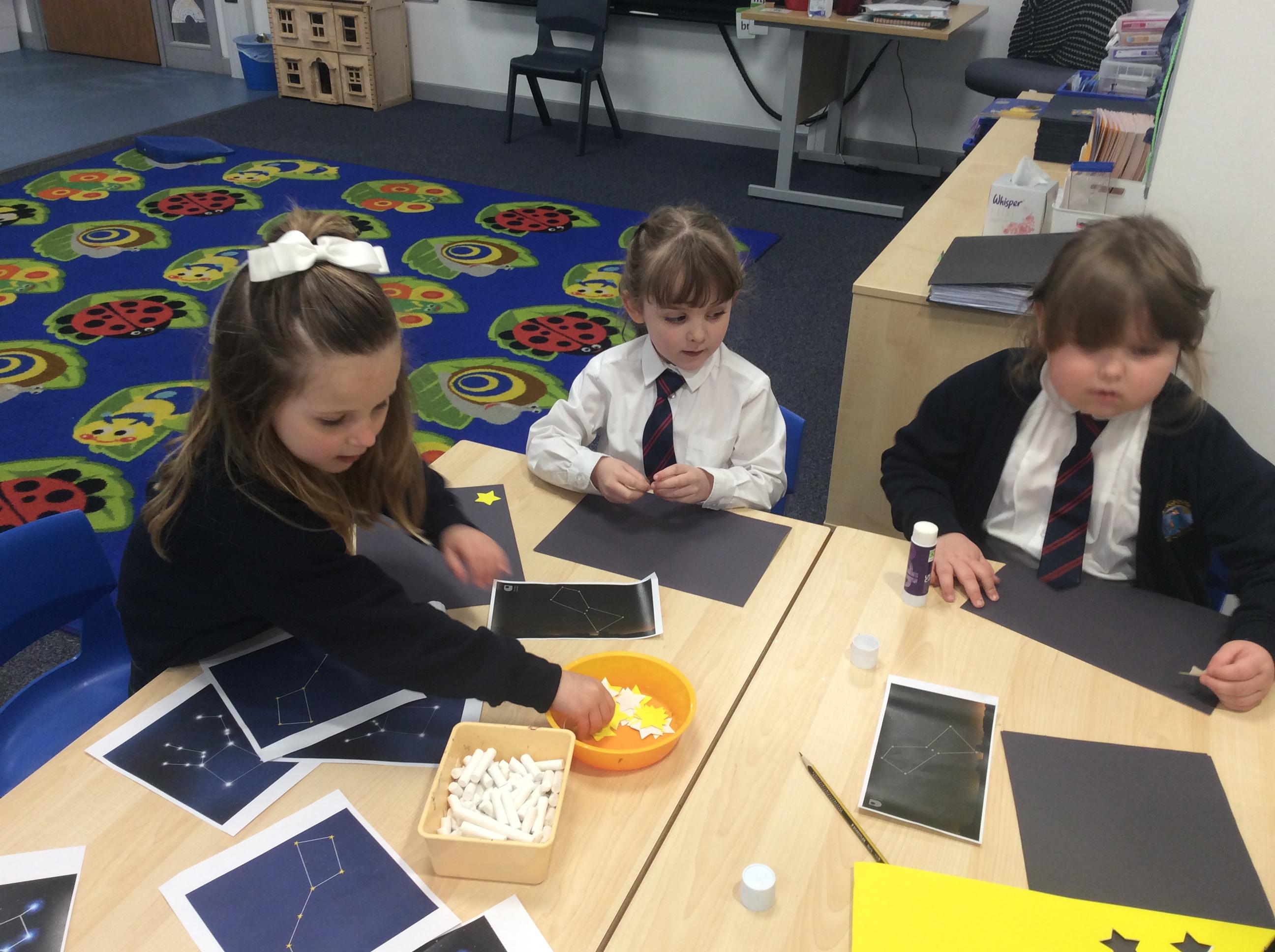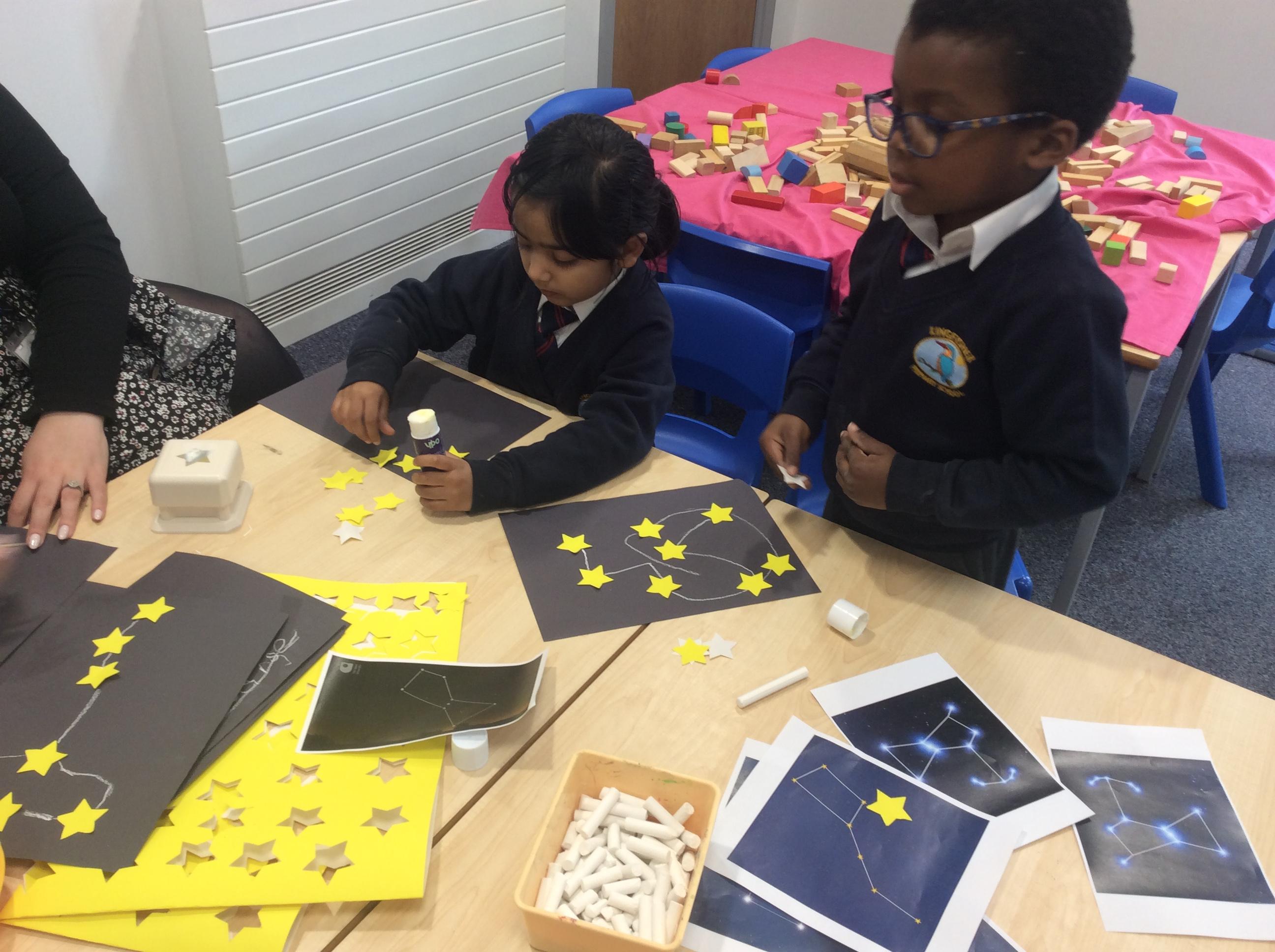 This week we have been learning about space. We learnt all about how people live in space and we watched some videos of Tim Peake in the International Space Station. We talked lots about how there is no gravity in space and how astronauts need to strap themselves in to stop themselves from floating away. We read the story 'Whatever Next' and based a lot of our activities around space including junk modelling rockets, space small world play and constellation pictures.